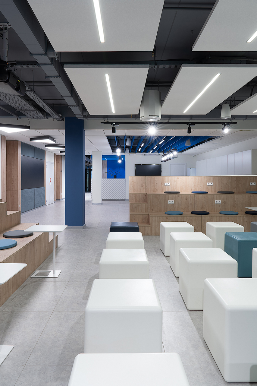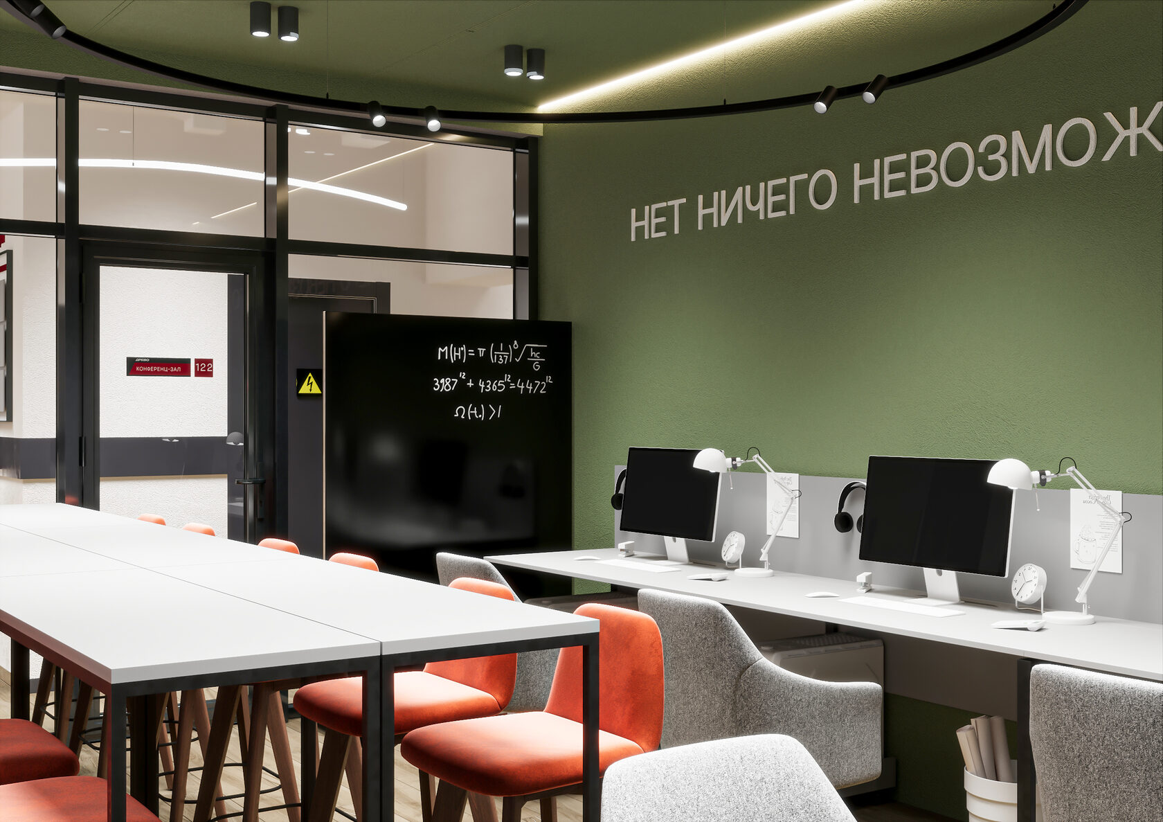 Концепция и планировка Пространство разработано для удобства как индивидуальной, так и коллективной работы. Гибкая планировка и разнообразие зон позволяют студентам адаптировать пространство под свои задачи.