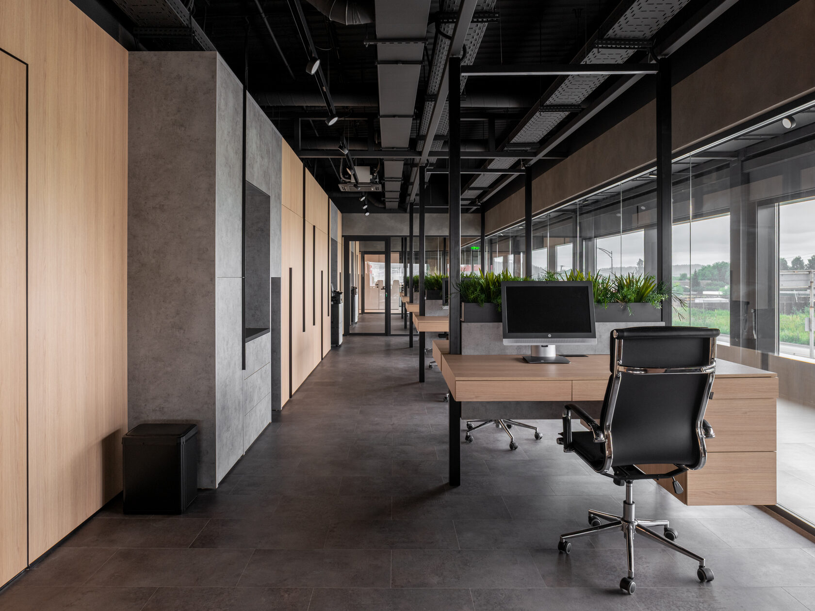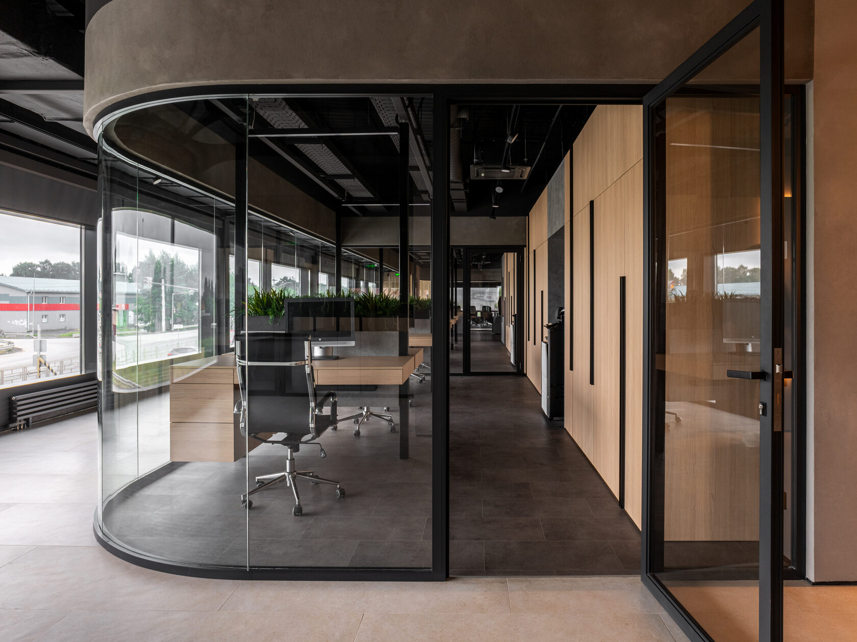 Концепция Визуальный стиль офиса строится на принципах лофта, что позволило подчеркнуть архитектурные особенности здания: сводчатые потолки, бетонные конструкции и несущие балки стали активными участниками оформления. Черные потолки, открытая проводка и износостойкий линолеум с выразительными швами образуют графичную, насыщенную базу. Лофт здесь не выглядит холодным: интерьер смягчен тёплыми текстурами дерева, фанеры и акцентами мебели.