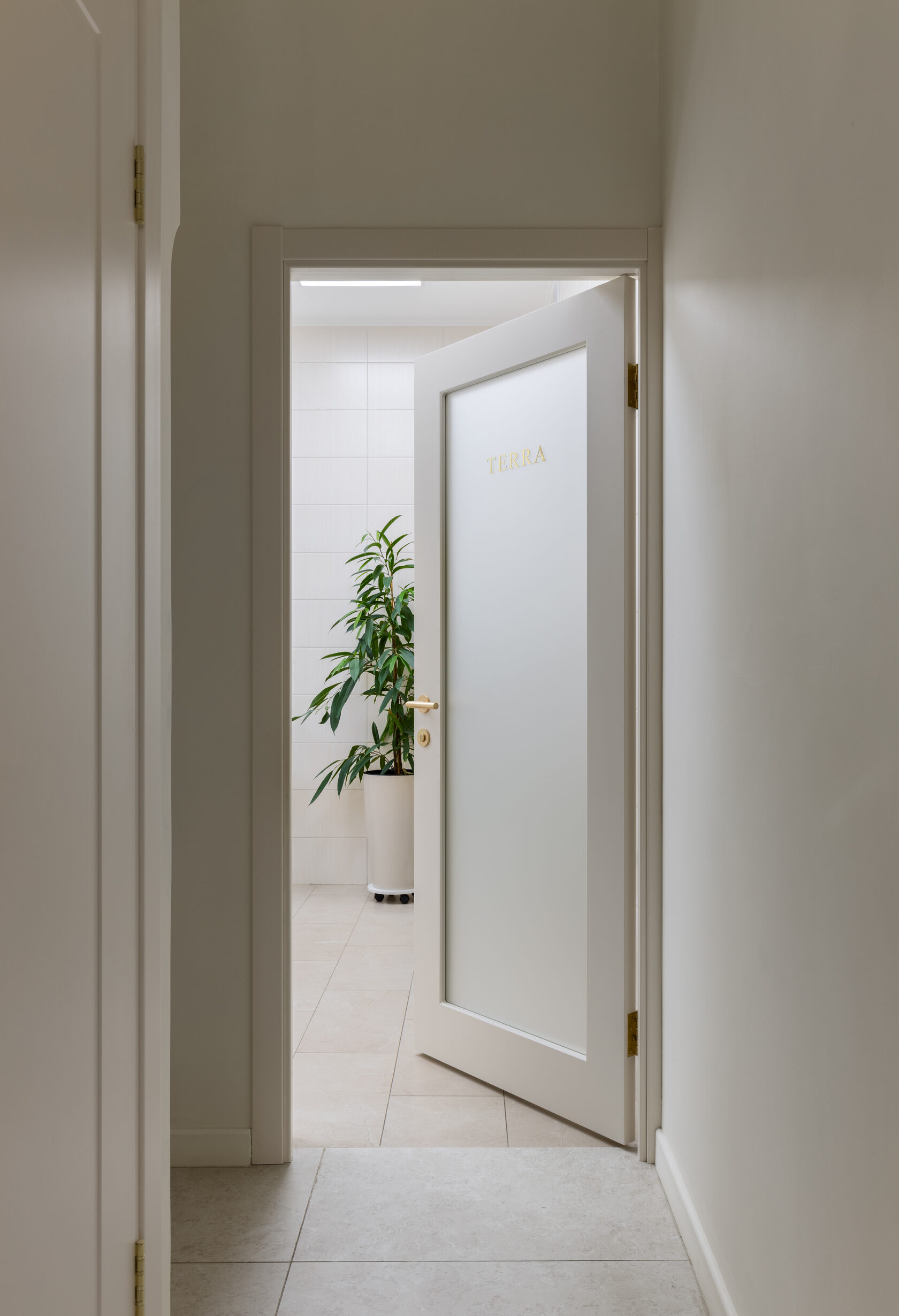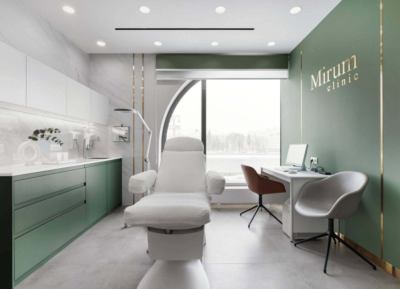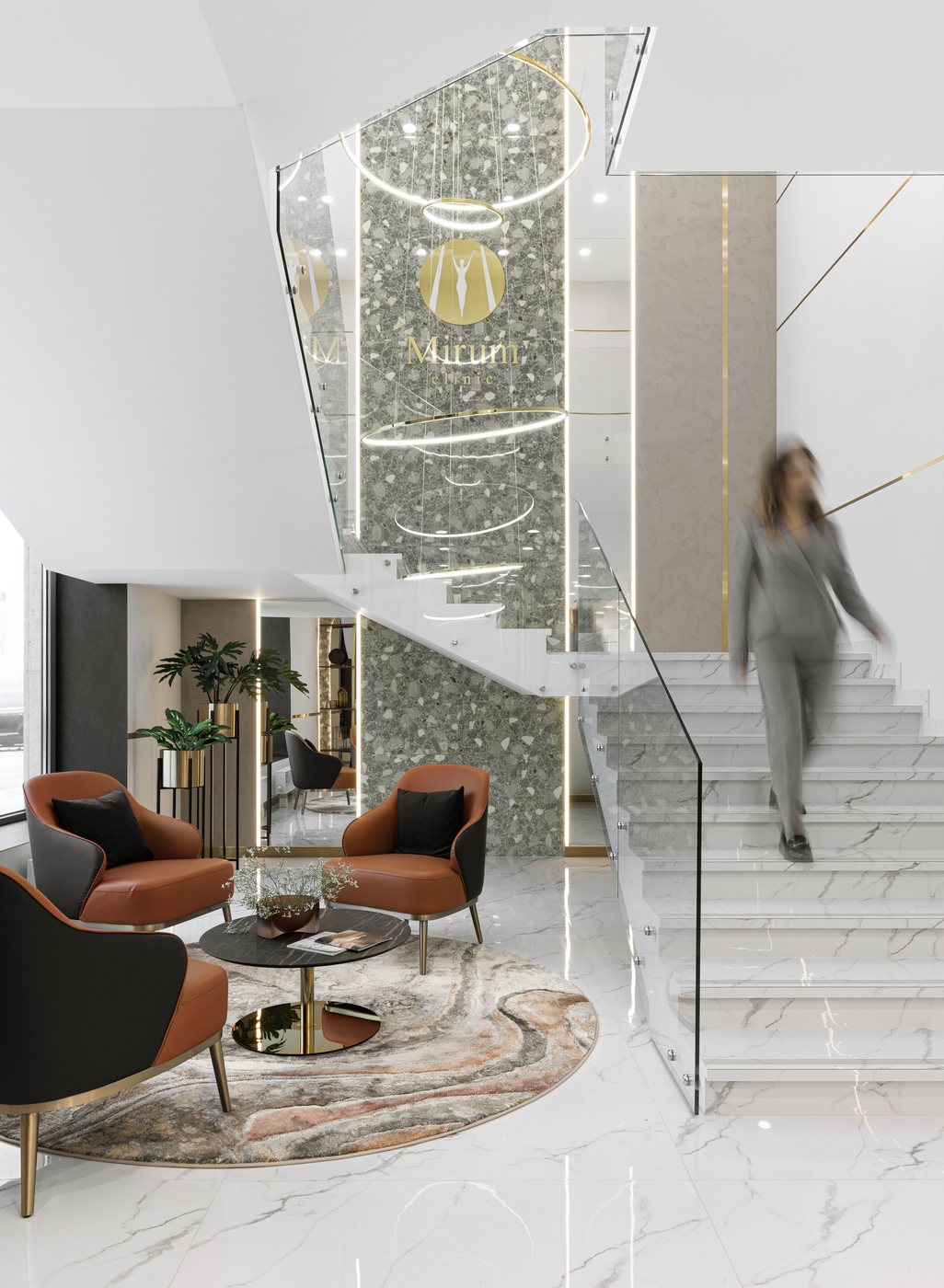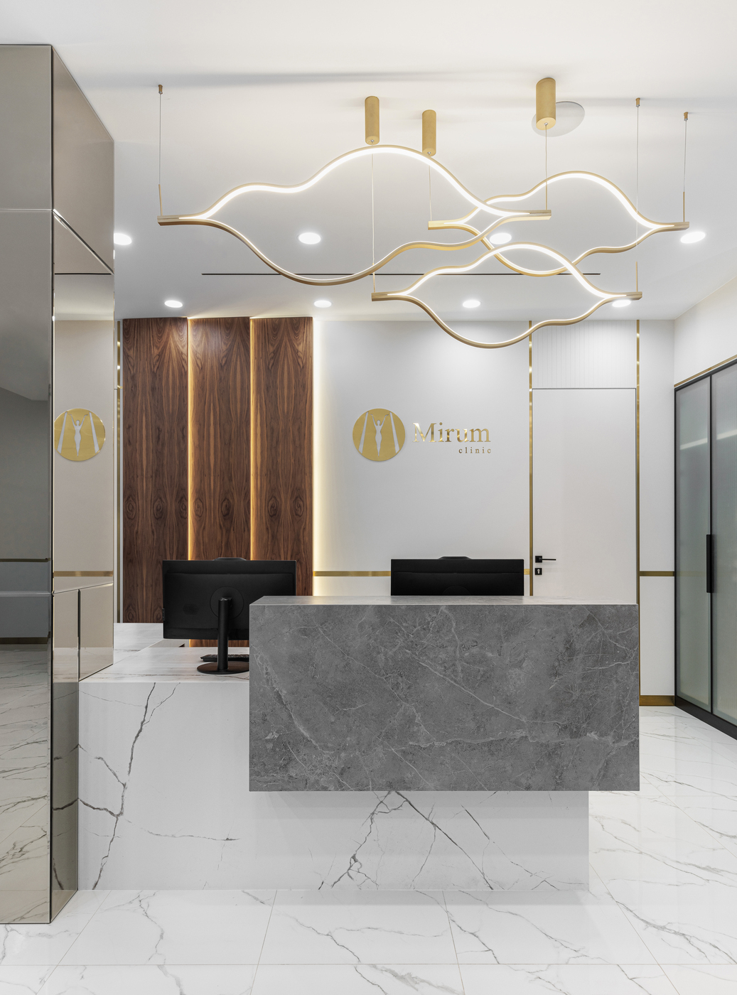 Клиника расположена на Котельнической набережной в двухуровневом пространстве общей площадью 374 кв. м, с видом на Кремль. Интерьер выдержан в современном минималистичном стиле с использованием мрамора, дерева и латуни. Пространство получилось светлым, уютным и атмосферным, при этом соответствует всем требованиям медицинского учреждения.