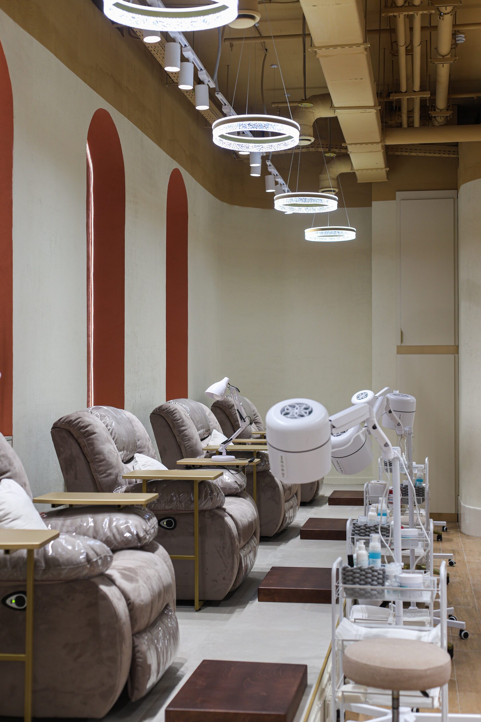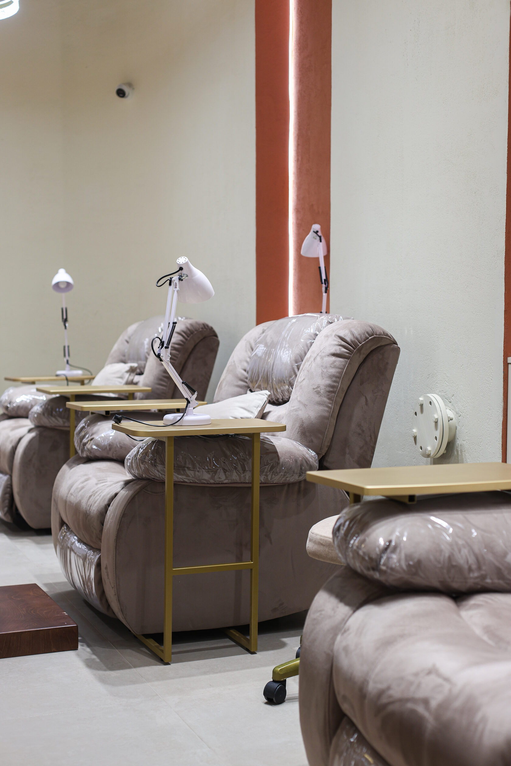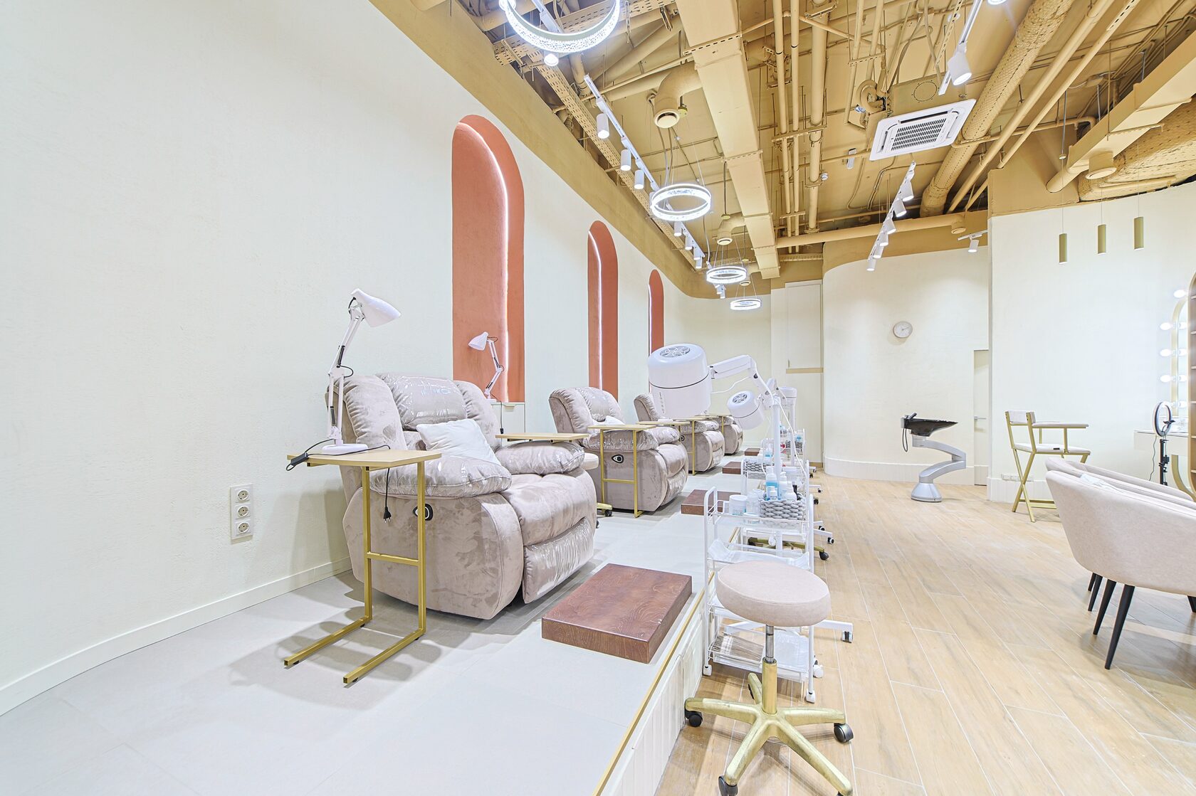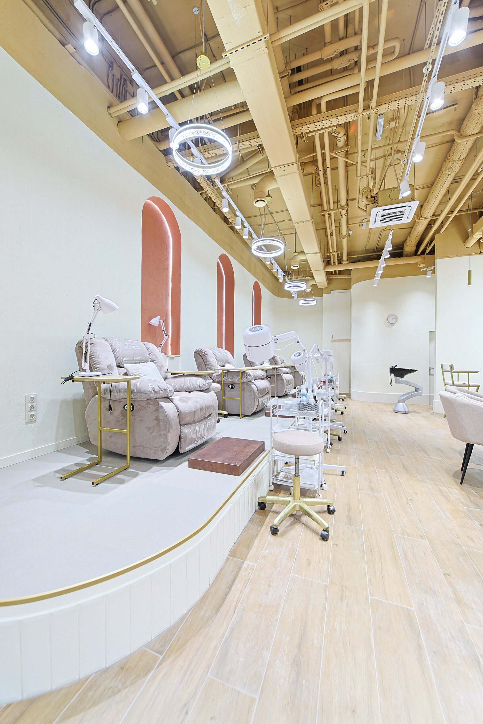 Дизайн и организация пространства: Салон спроектирован так, чтобы каждый клиент чувствовал комфорт и уединение. Зоны разделены полупрозрачными ширмами с плавными линиями, создавая баланс между приватностью и воздушностью пространства. Мягкая мебель с приятными фактурами — удобные кресла, кушетки и диваны — способствуют расслаблению и ощущению заботы.