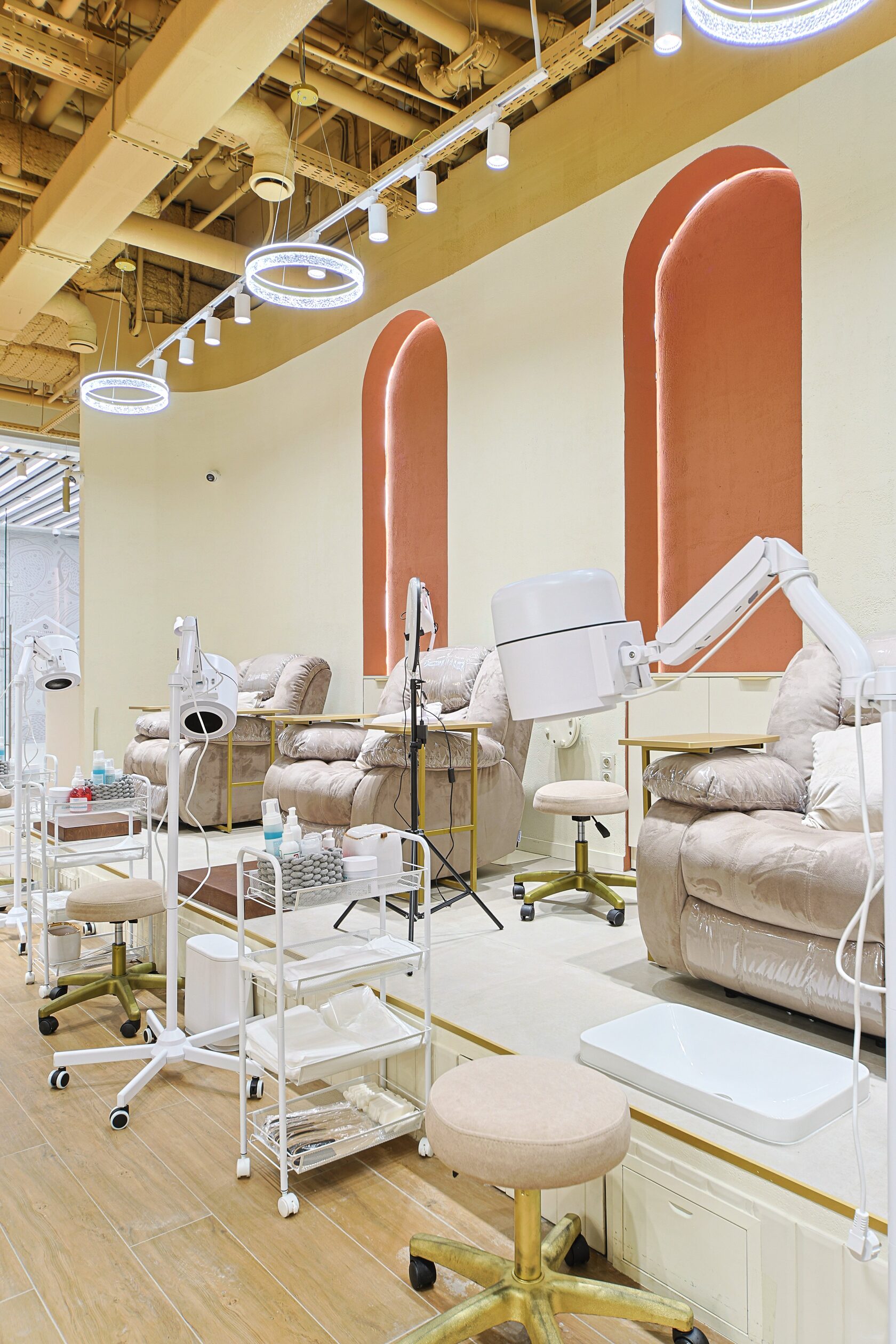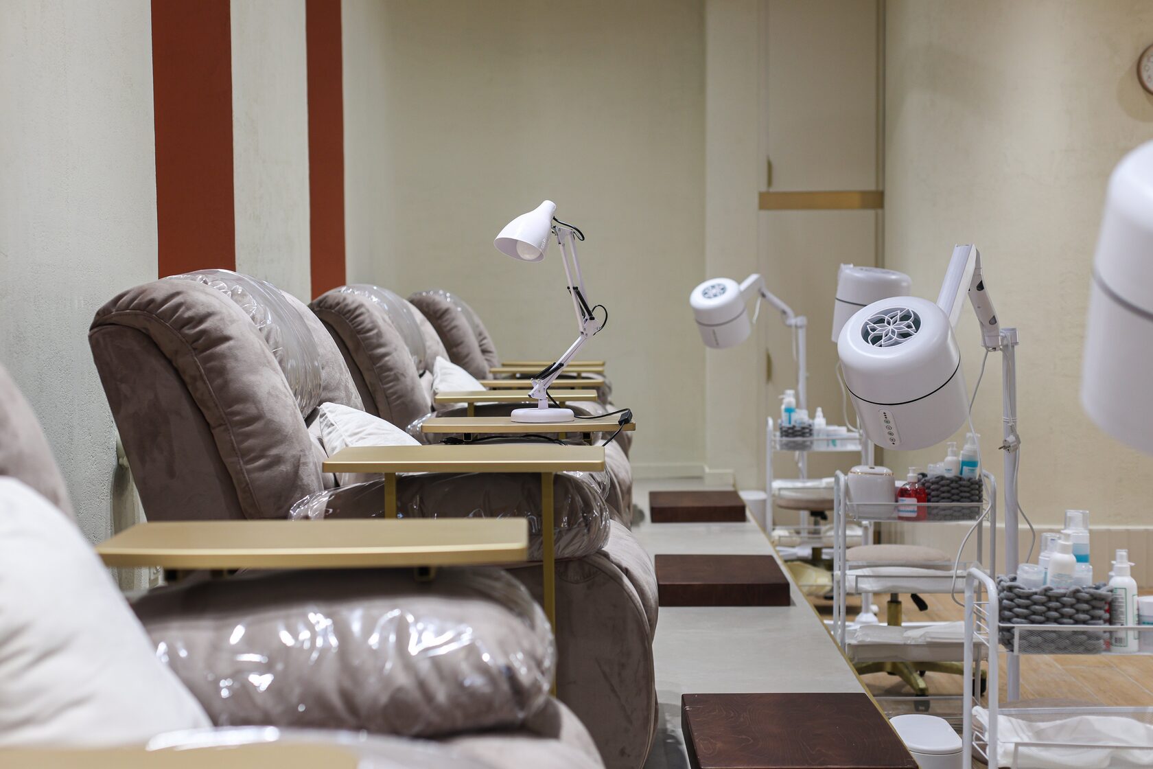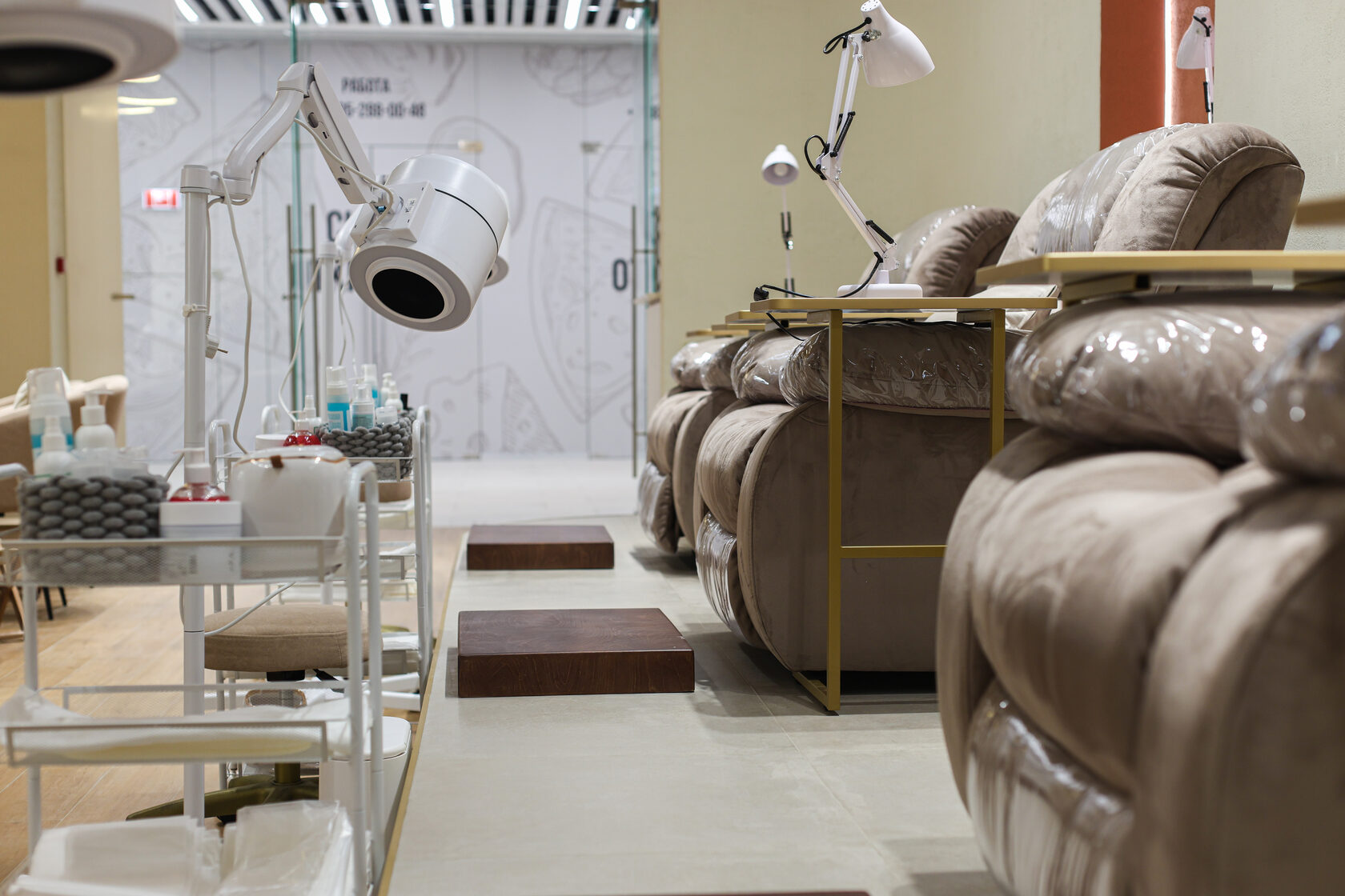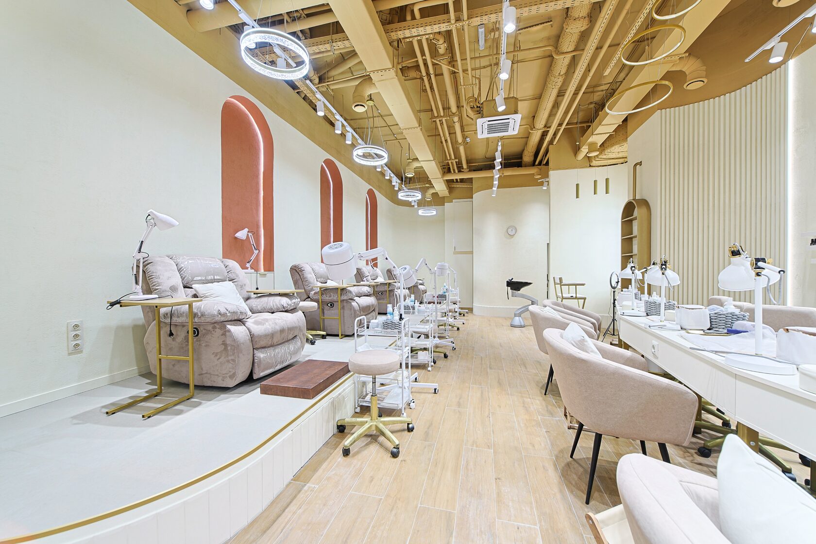 Дизайн и организация пространства: Салон спроектирован так, чтобы каждый клиент чувствовал комфорт и уединение. Зоны разделены полупрозрачными ширмами с плавными линиями, создавая баланс между приватностью и воздушностью пространства. Мягкая мебель с приятными фактурами — удобные кресла, кушетки и диваны — способствуют расслаблению и ощущению заботы.