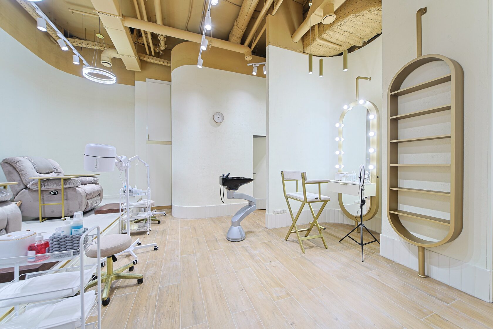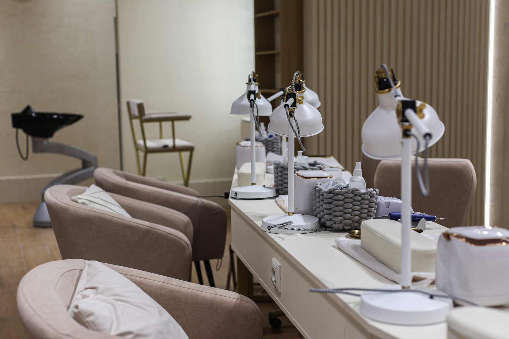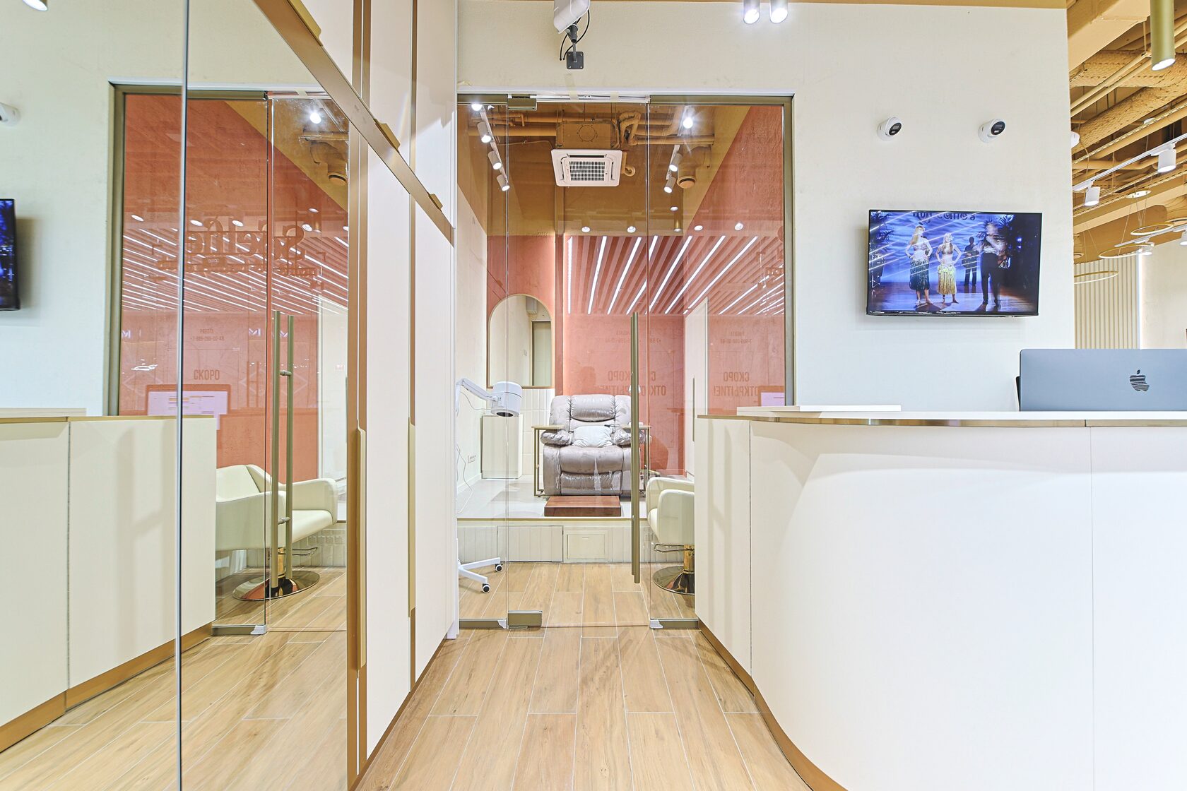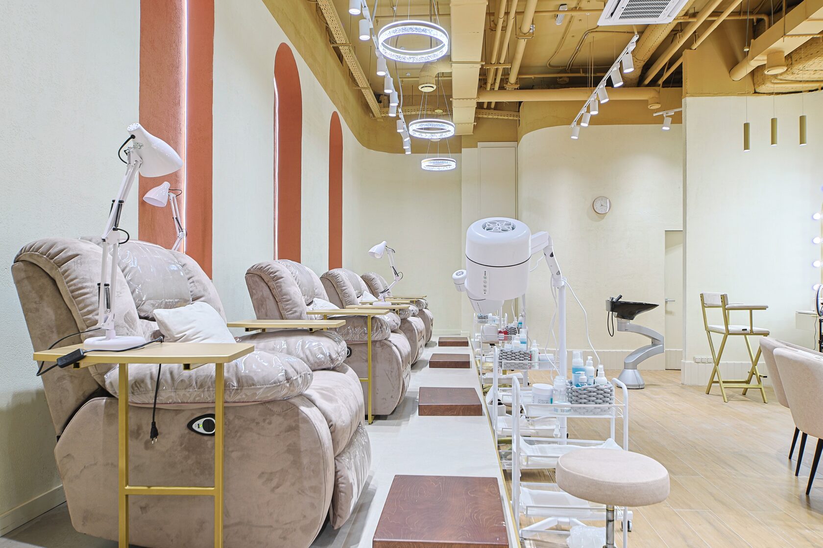 Дизайн и организация пространства: Салон спроектирован так, чтобы каждый клиент чувствовал комфорт и уединение. Зоны разделены полупрозрачными ширмами с плавными линиями, создавая баланс между приватностью и воздушностью пространства. Мягкая мебель с приятными фактурами — удобные кресла, кушетки и диваны — способствуют расслаблению и ощущению заботы.