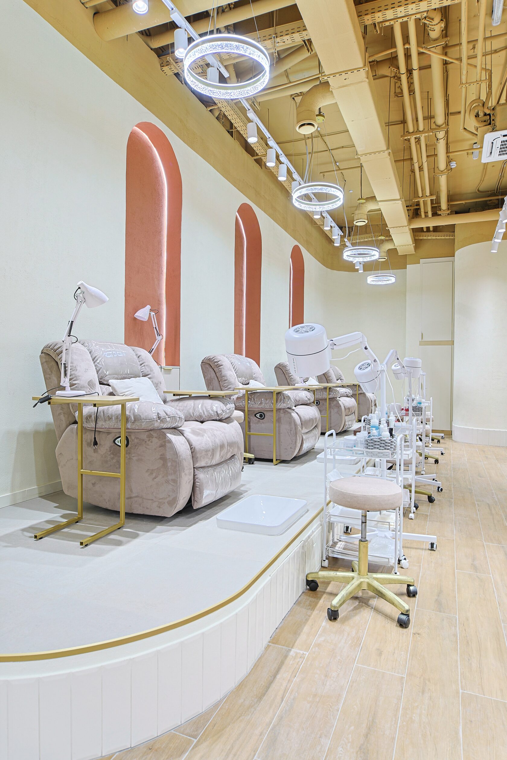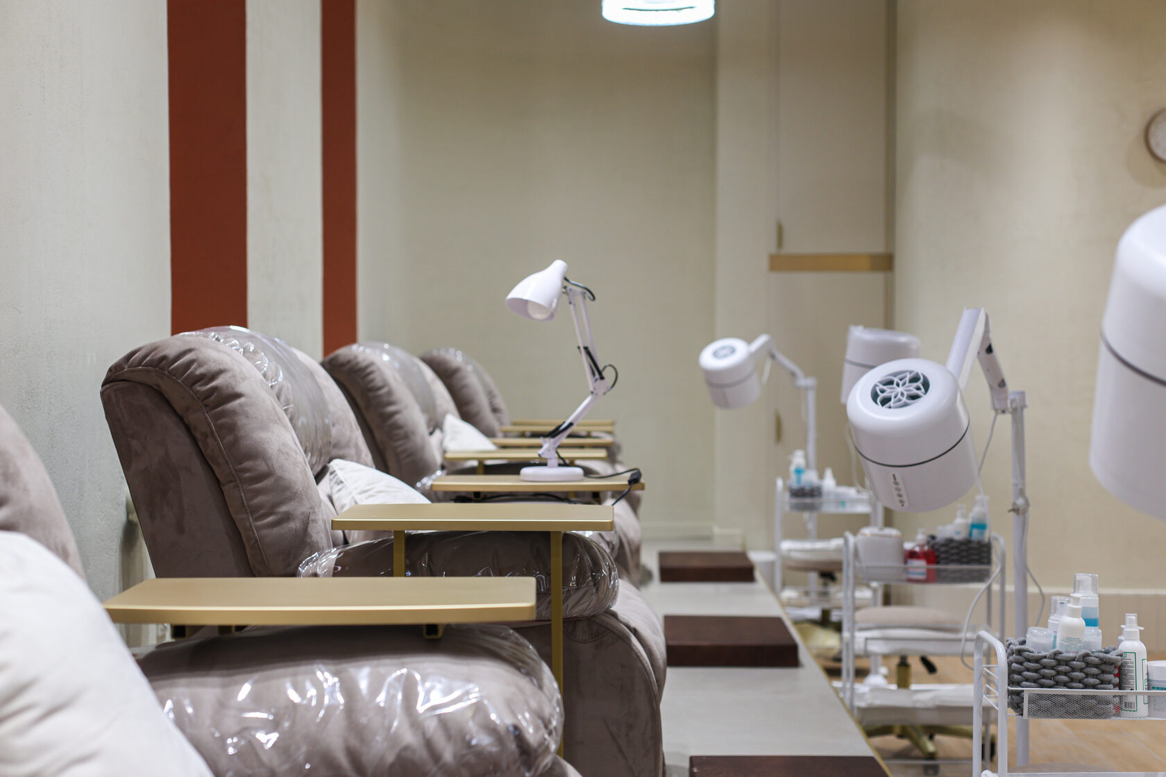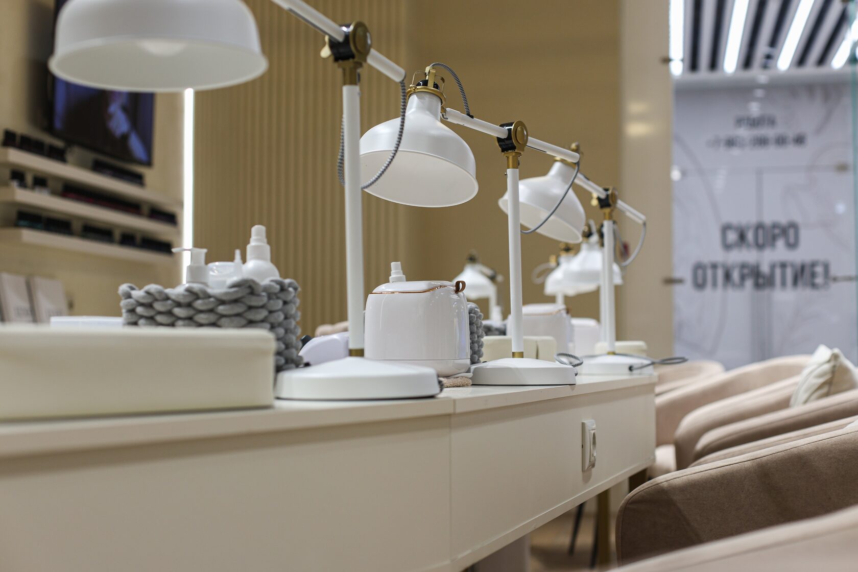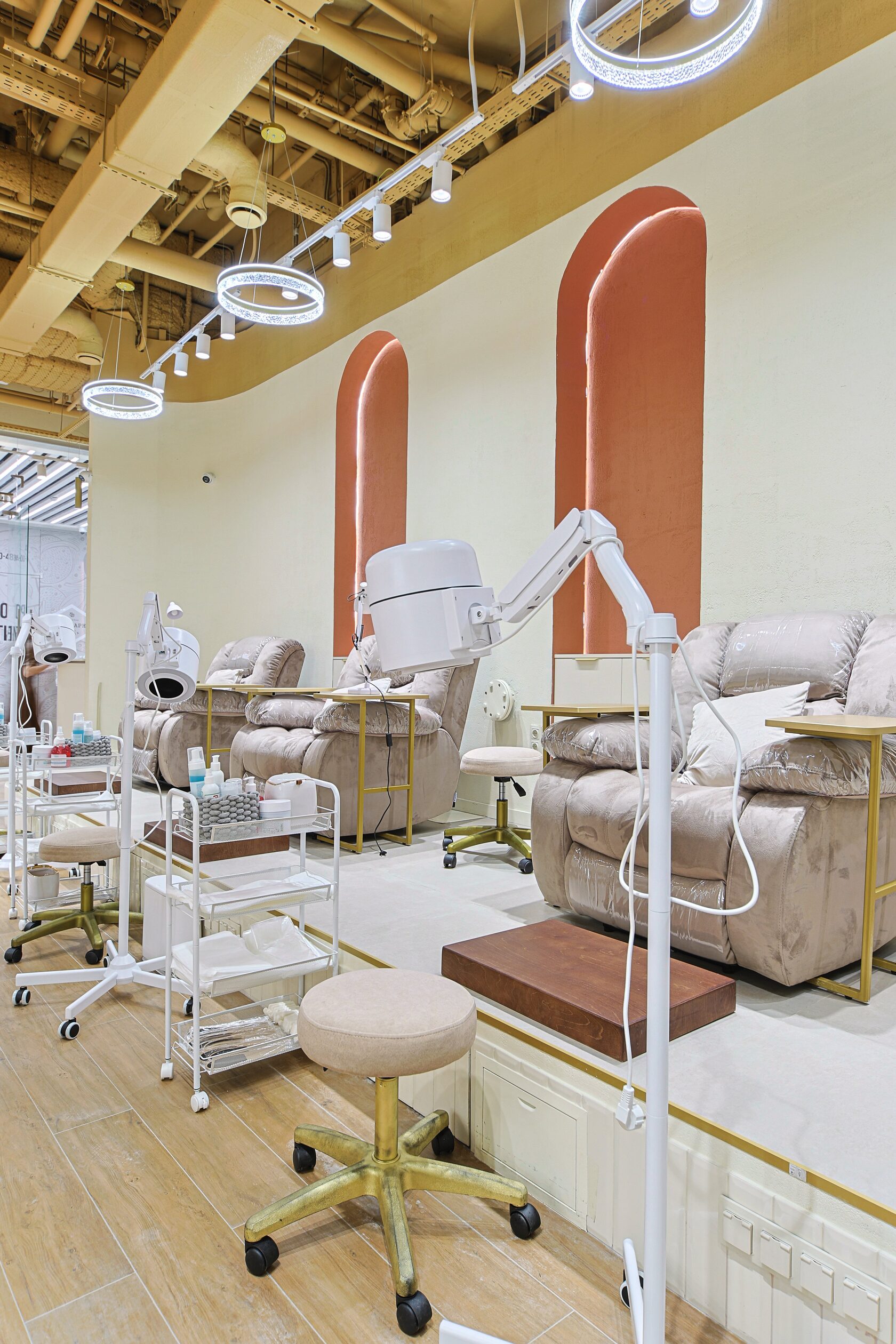 Дизайн и организация пространства: Салон спроектирован так, чтобы каждый клиент чувствовал комфорт и уединение. Зоны разделены полупрозрачными ширмами с плавными линиями, создавая баланс между приватностью и воздушностью пространства. Мягкая мебель с приятными фактурами — удобные кресла, кушетки и диваны — способствуют расслаблению и ощущению заботы.