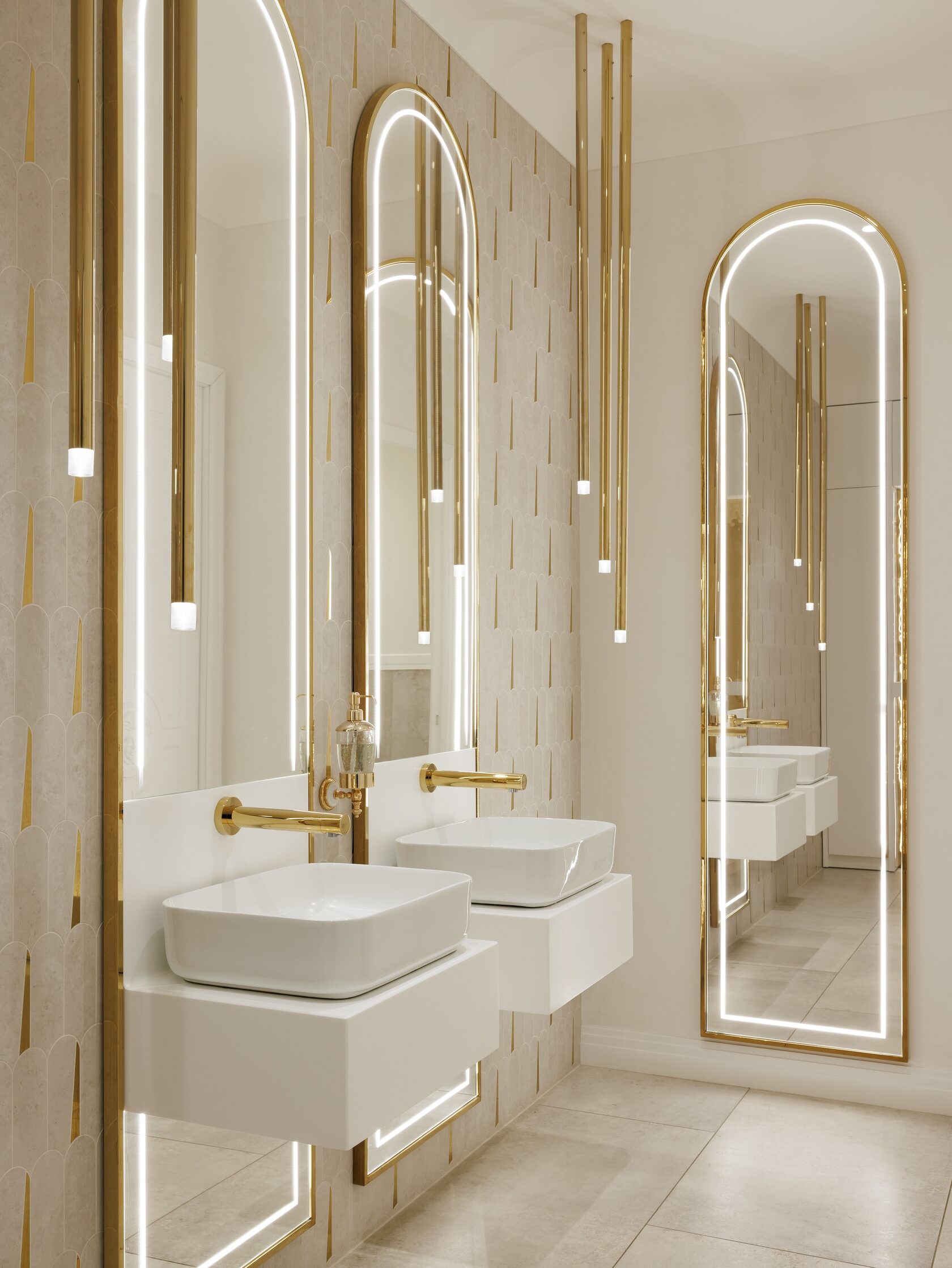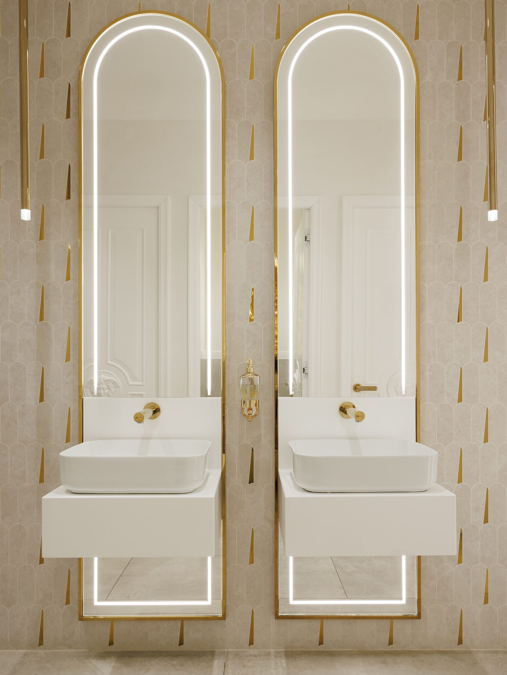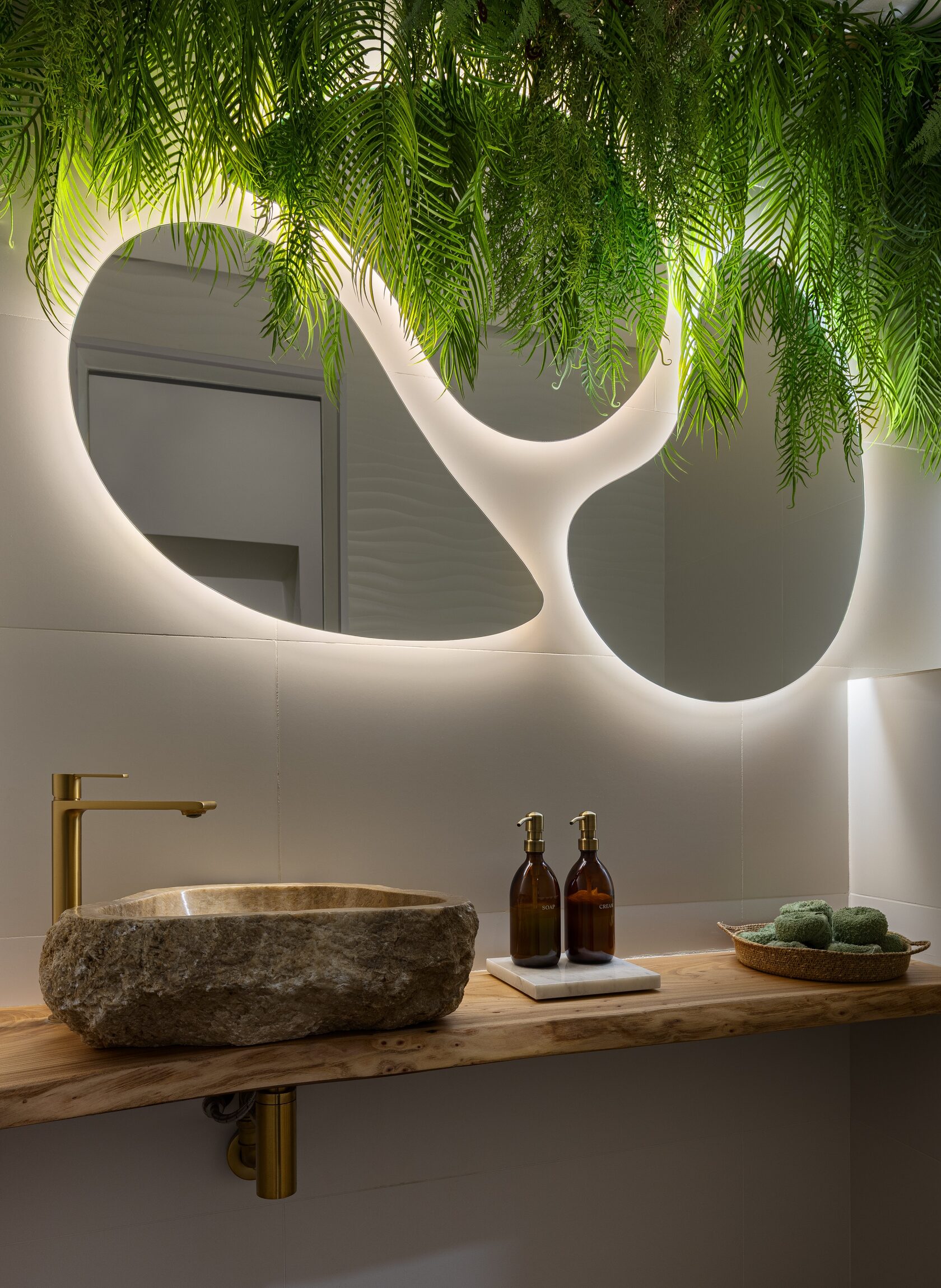 Детали и освещение: Зеркала с мягкой подсветкой, золотистые элементы декора и живые растения подчеркивают натуральность и экологичность оформления. Округлые формы мебели и зеркал создают ощущение гармонии и комфорта. Освещение продумано до мелочей: теплый рассеянный свет наполняет пространство уютом и способствует релаксации.