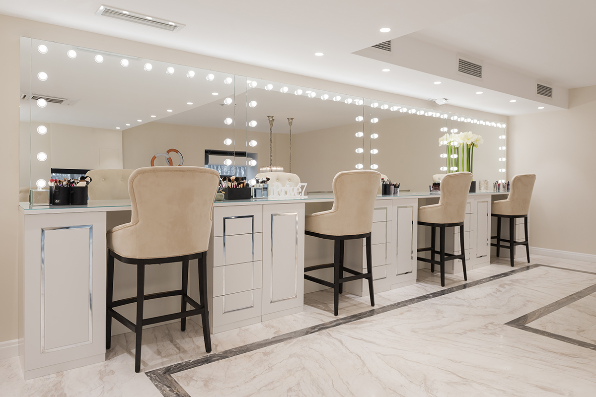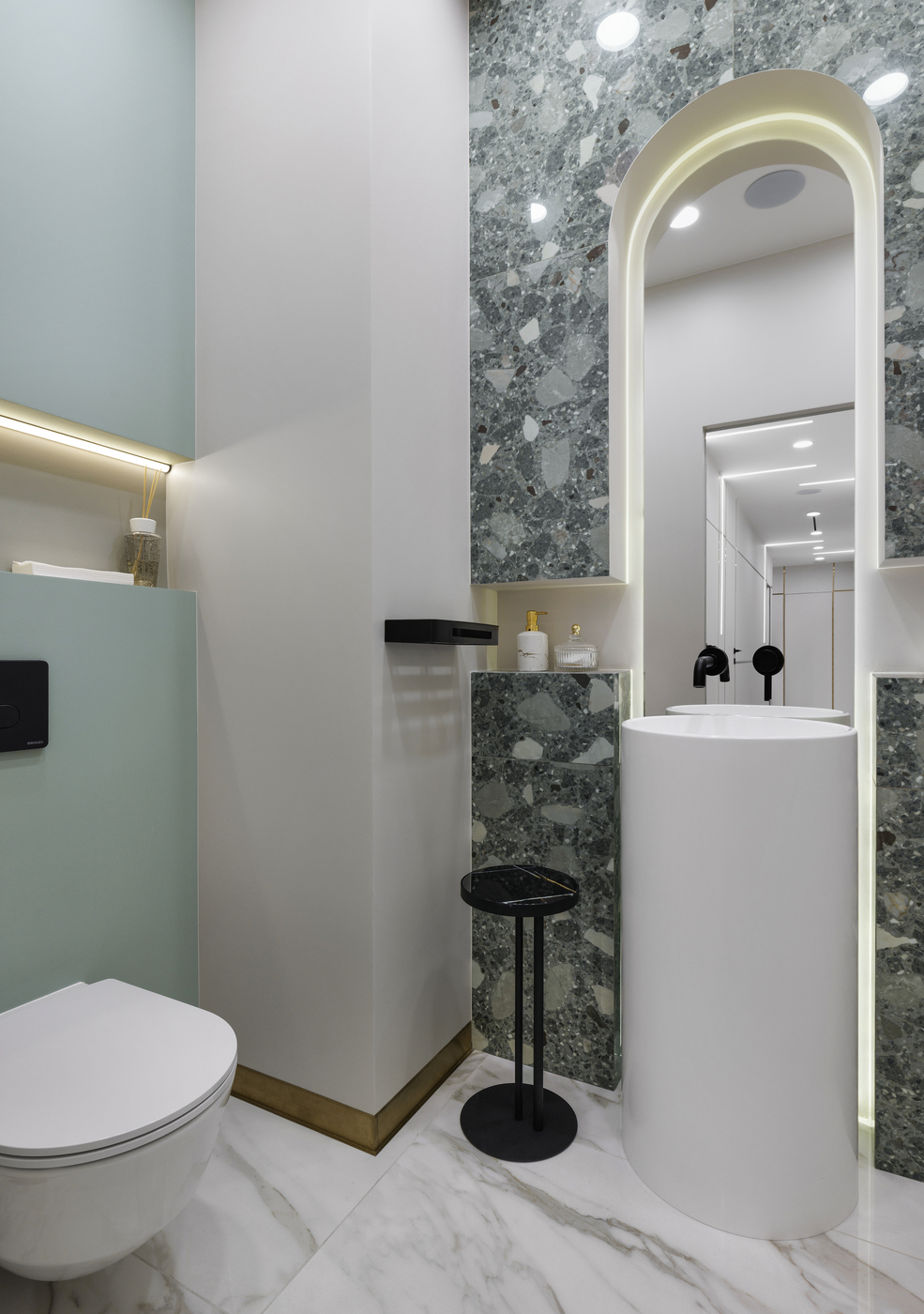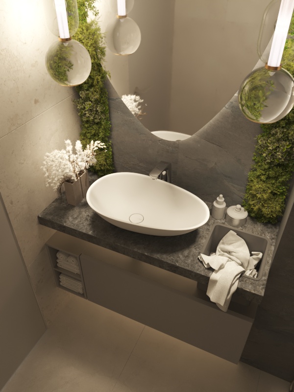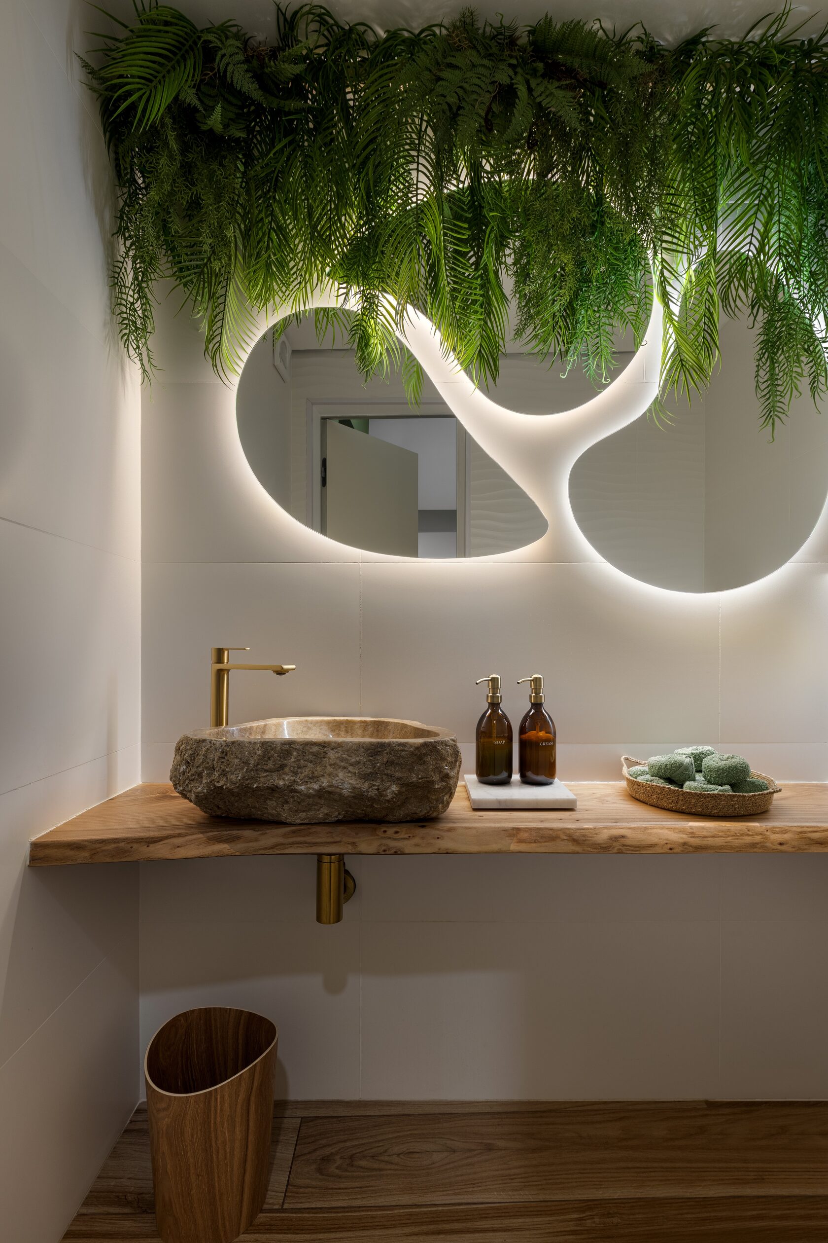 Детали и освещение: Зеркала с мягкой подсветкой, золотистые элементы декора и живые растения подчеркивают натуральность и экологичность оформления. Округлые формы мебели и зеркал создают ощущение гармонии и комфорта. Освещение продумано до мелочей: теплый рассеянный свет наполняет пространство уютом и способствует релаксации.