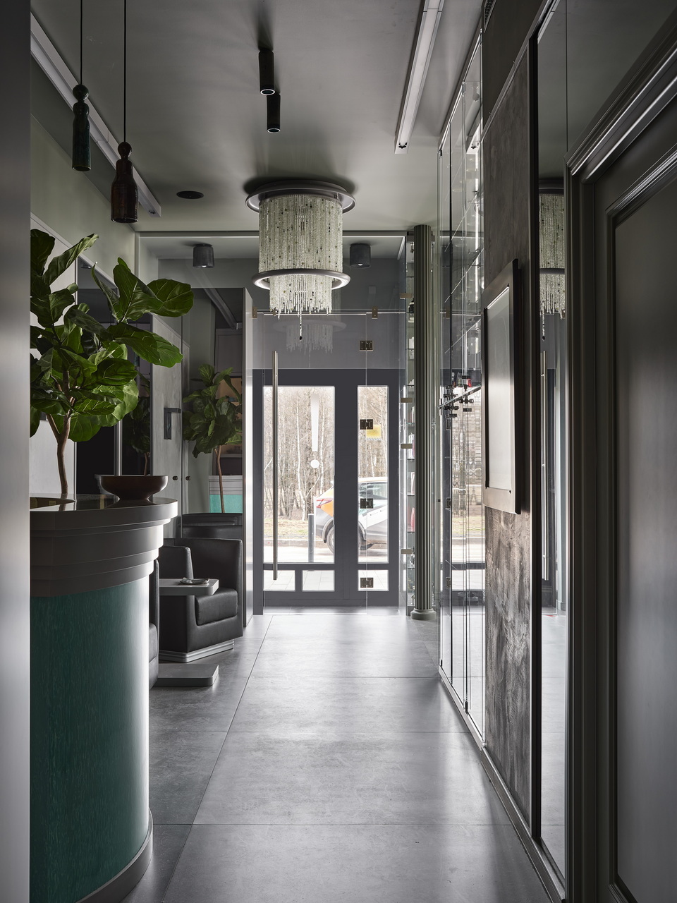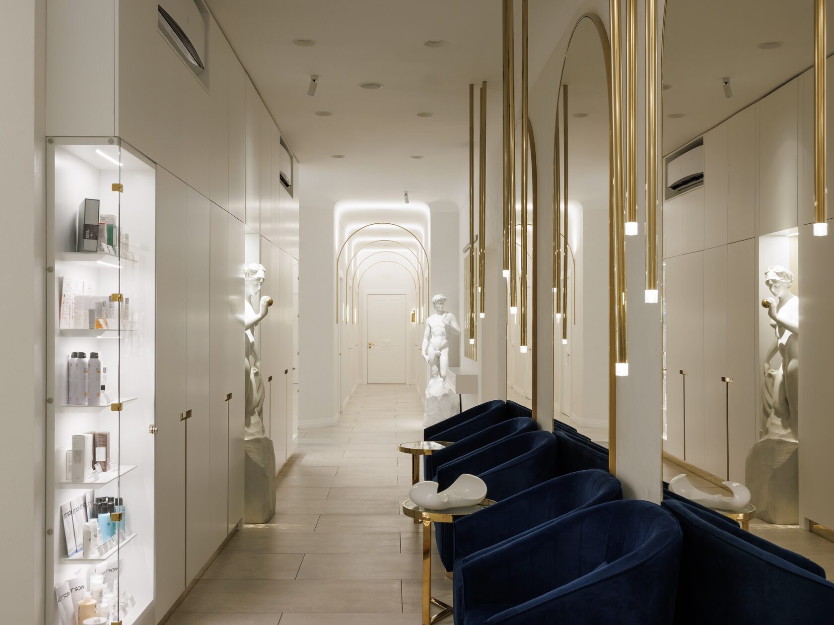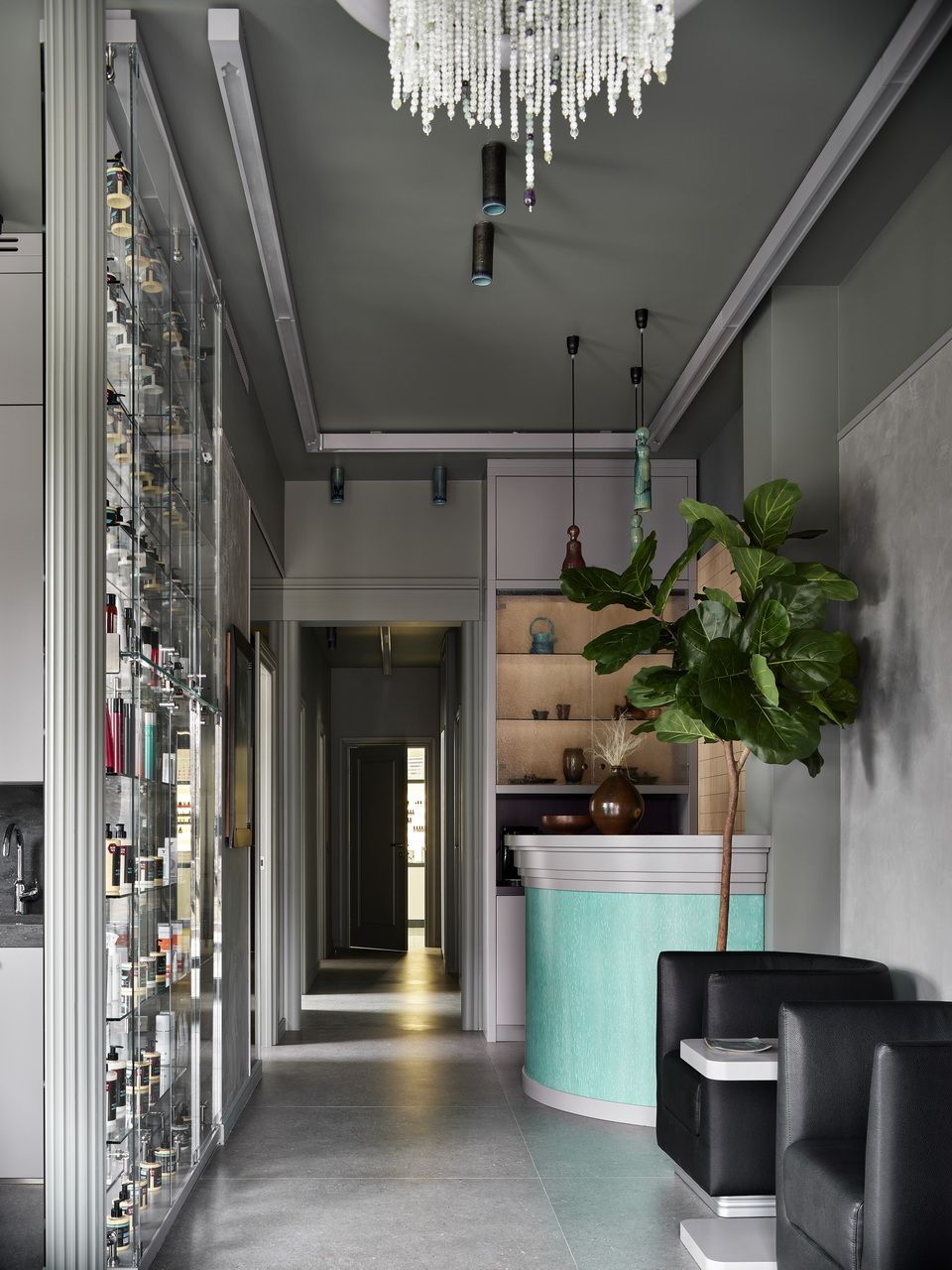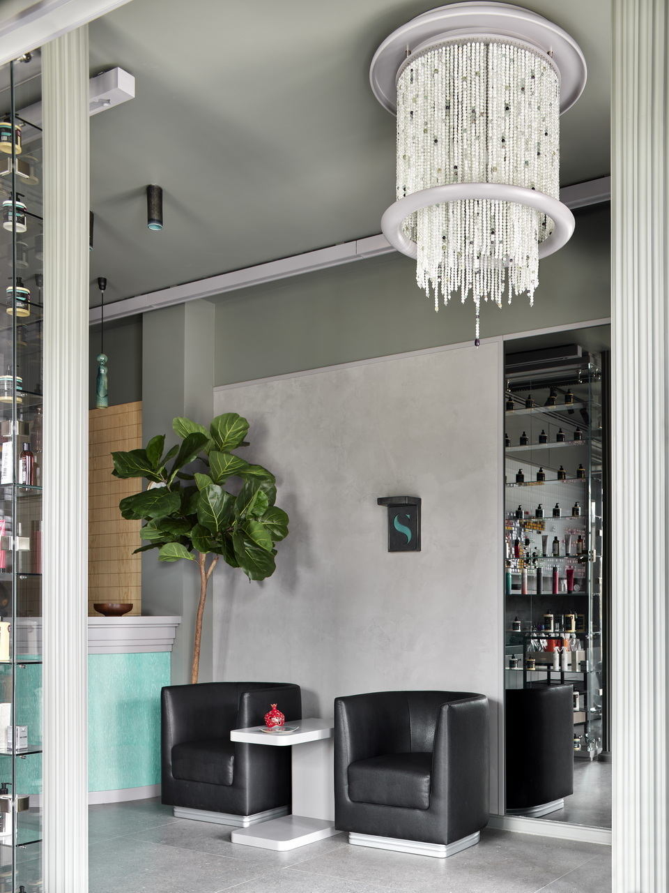 Проект представляет собой салон красоты, где каждая деталь продумана с точки зрения комфорта, эргономики и эстетики. Интерьер выполнен в смешанном стиле, объединяющем традиции и инновации. Планировка тщательно выверена, все зоны — лаборатории, рецепшн, клиентские зоны — функциональны и удобны. Использованы высококачественные материалы: стекло, металл, керамика, бетон, гипсовая лепнина, искусственный камень, создавая многослойное пространство с микромиром мизансцен, акцентов и доминант.