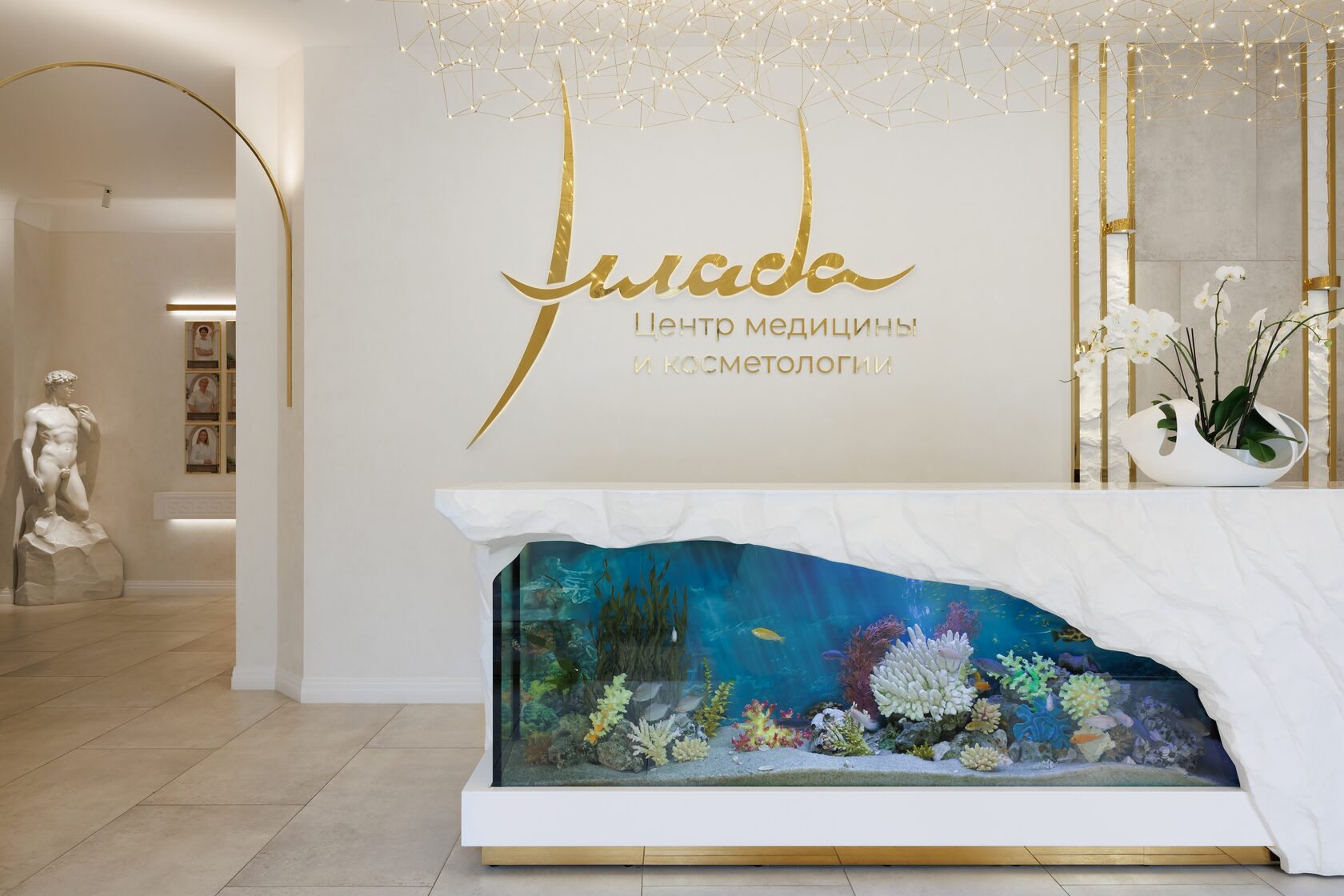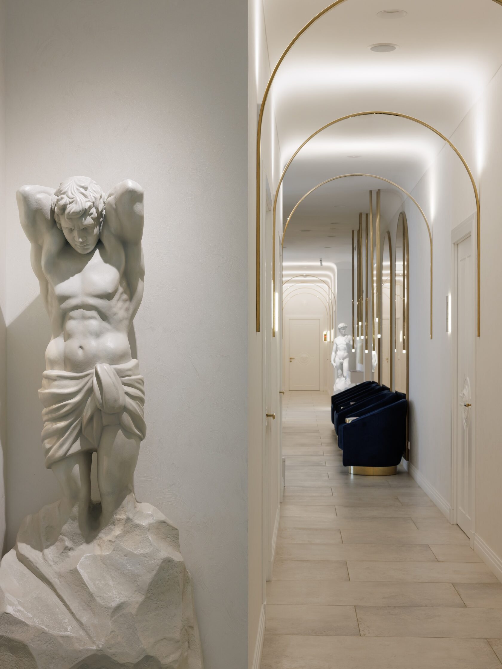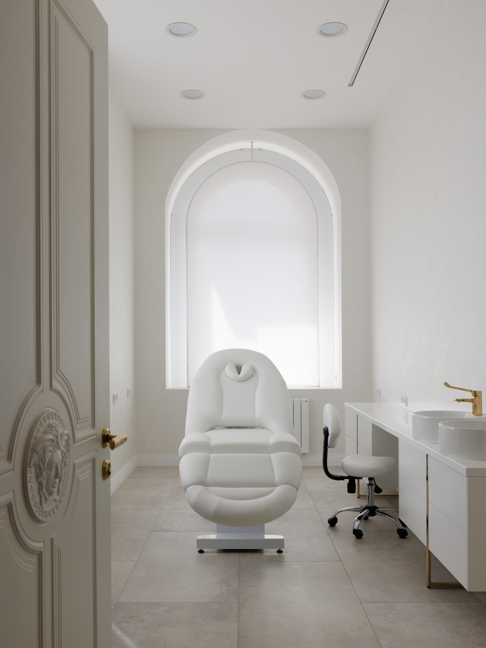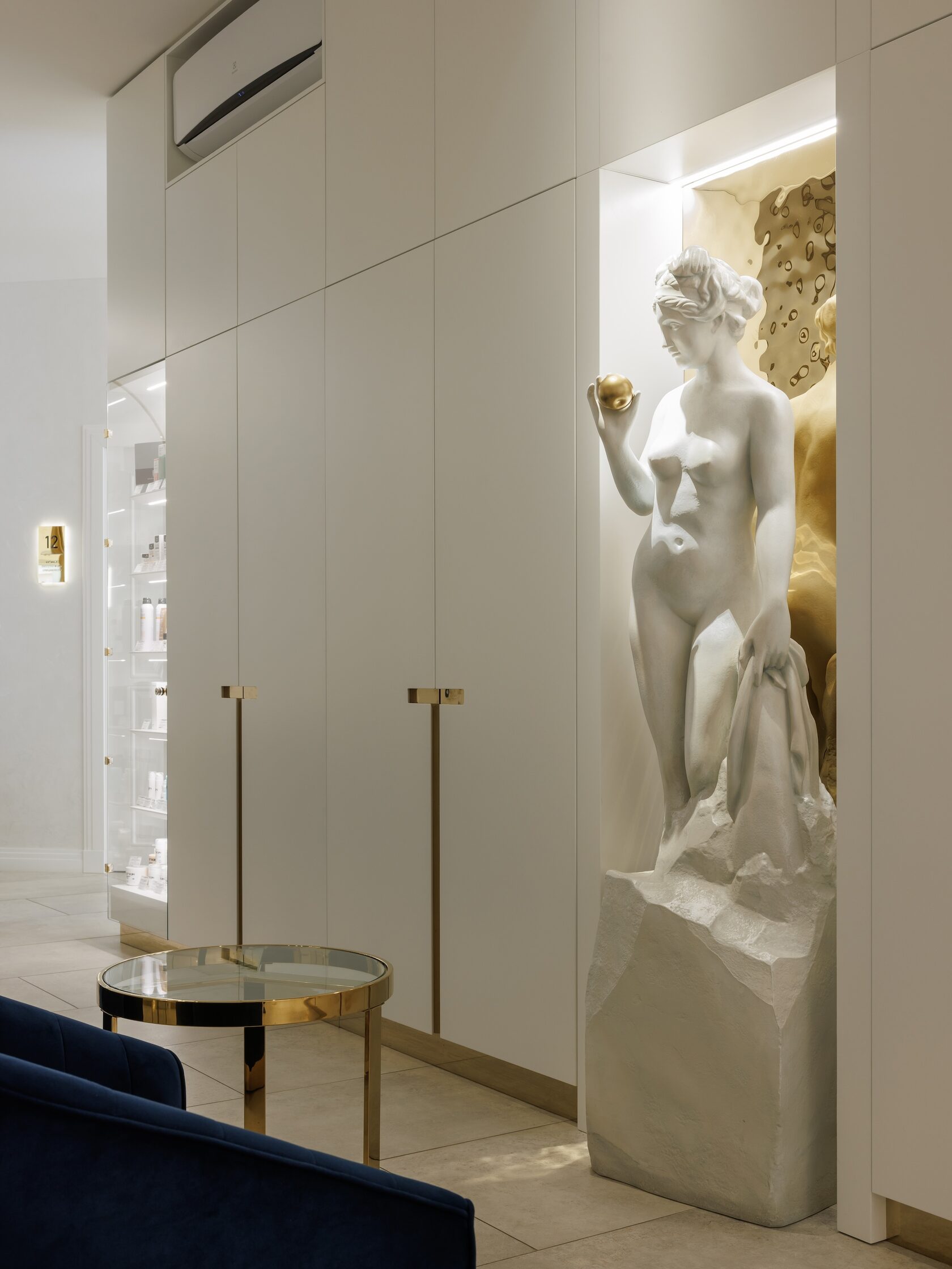 Проект площадью 600 м² расположен в историческом здании, созданном Иваном Чарушиным, и учитывает ограниченные архитектурные условия. Интерьер отражает идеалы Древней Греции: совершенство форм, красоту тела и эстетику античного искусства. Светлые тона, золотые детали, элементы средиземноморского грота и встроенный аквариум создают атмосферу спокойствия, доверия и эстетического удовольствия для пациентов. Каждое помещение, включая процедурные и косметологические кабинеты, продумано с точки зрения инженерии, дизайна и комфорта. Кабинет для спа-процедур оформлен в тёмно-шоколадных тонах с золотыми акцентами. Гармония цвета и деталей поддерживается во всём пространстве: от логотипа на входе до люстр на потолке.
