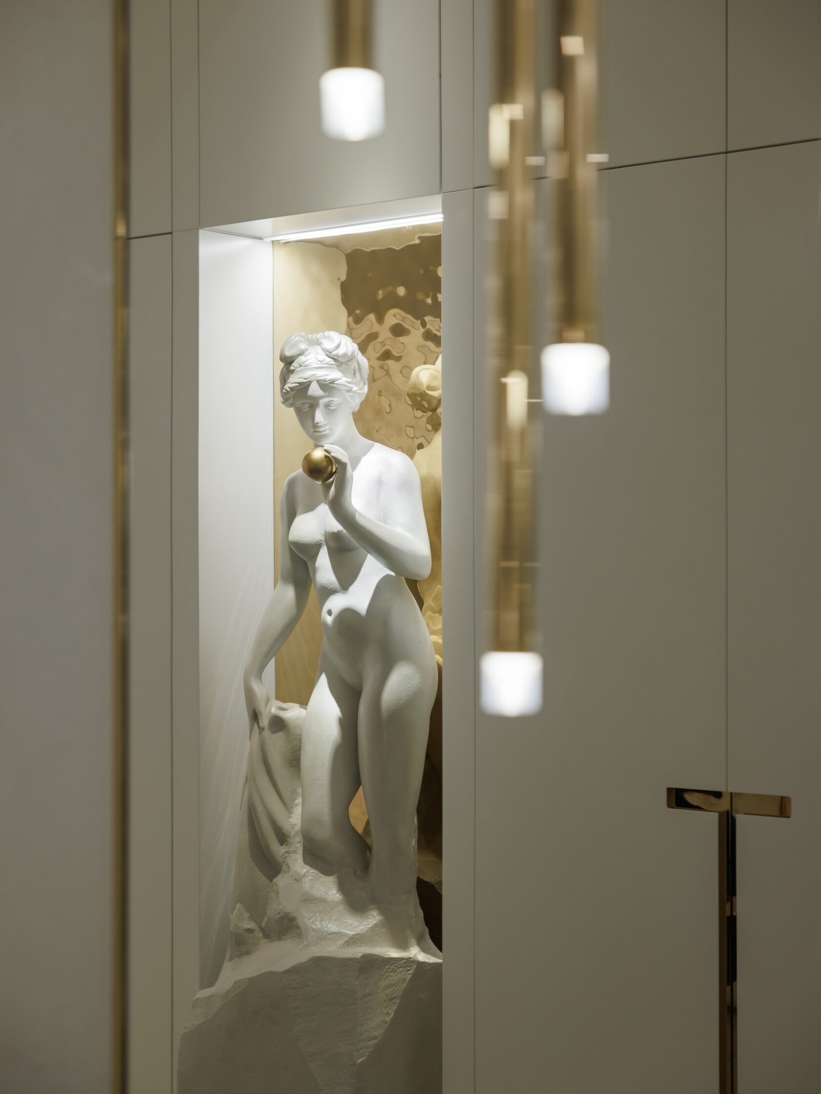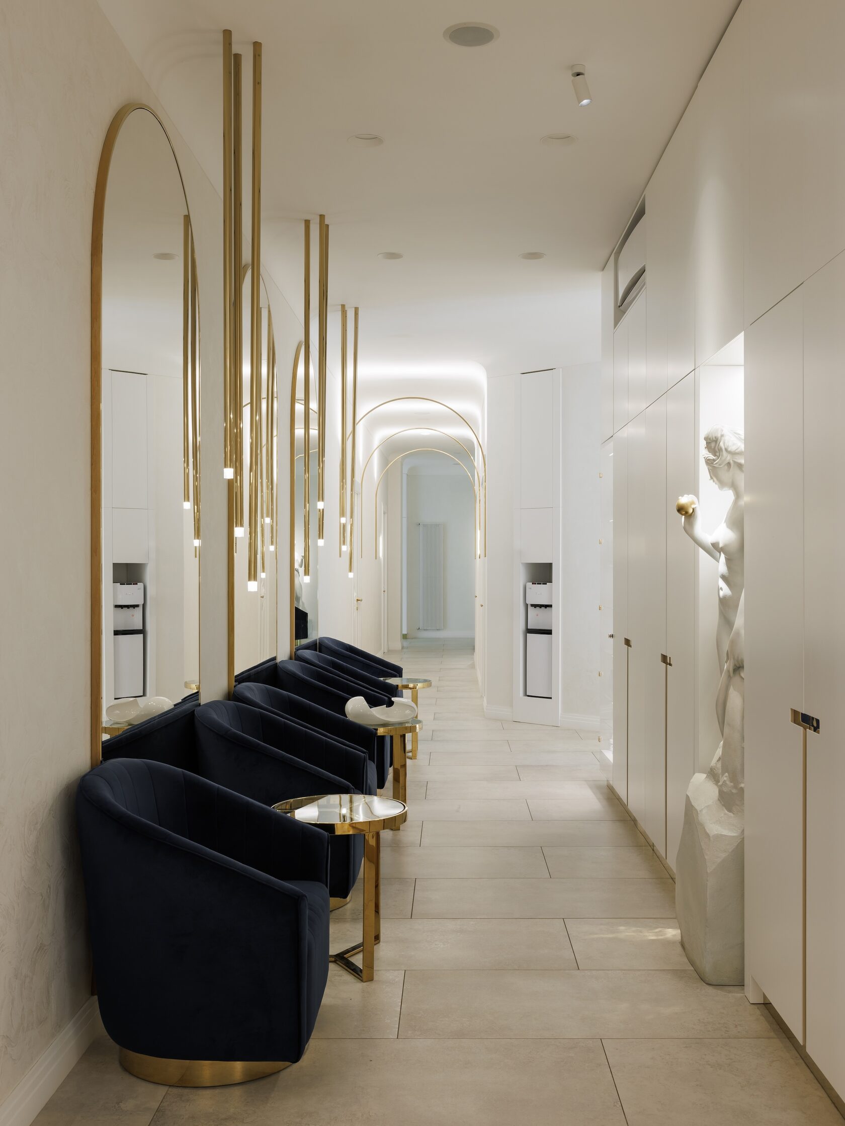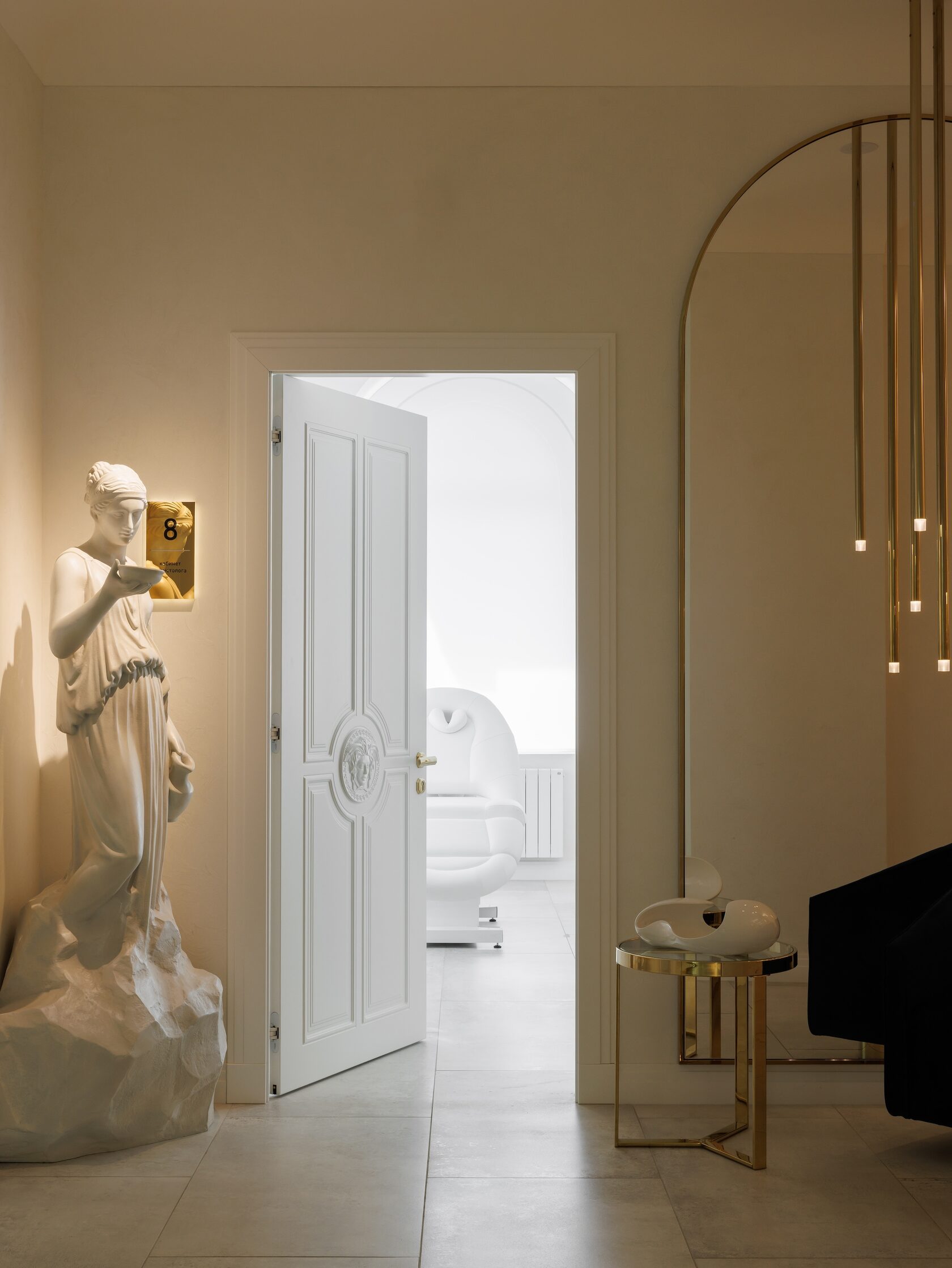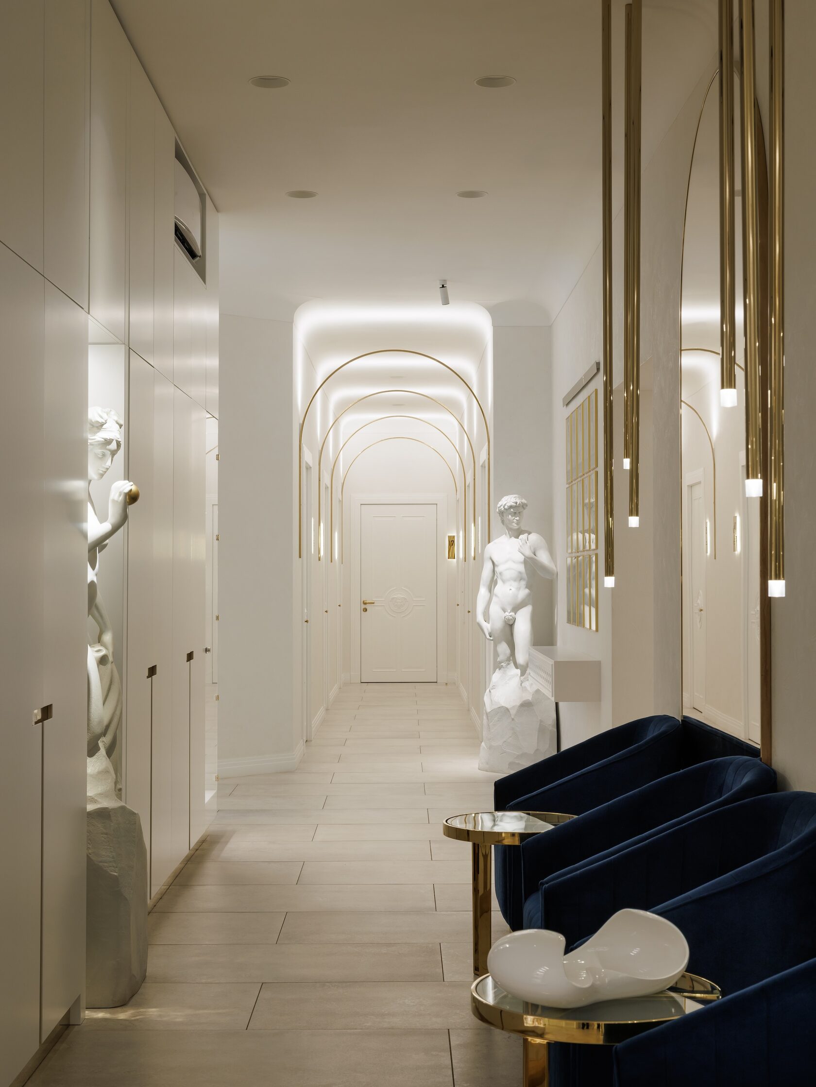 Проект площадью 600 м² расположен в историческом здании, созданном Иваном Чарушиным, и учитывает ограниченные архитектурные условия. Интерьер отражает идеалы Древней Греции: совершенство форм, красоту тела и эстетику античного искусства. Светлые тона, золотые детали, элементы средиземноморского грота и встроенный аквариум создают атмосферу спокойствия, доверия и эстетического удовольствия для пациентов. Каждое помещение, включая процедурные и косметологические кабинеты, продумано с точки зрения инженерии, дизайна и комфорта. Кабинет для спа-процедур оформлен в тёмно-шоколадных тонах с золотыми акцентами. Гармония цвета и деталей поддерживается во всём пространстве: от логотипа на входе до люстр на потолке.