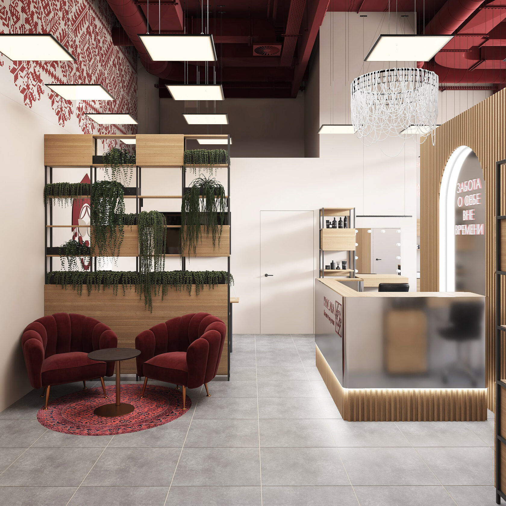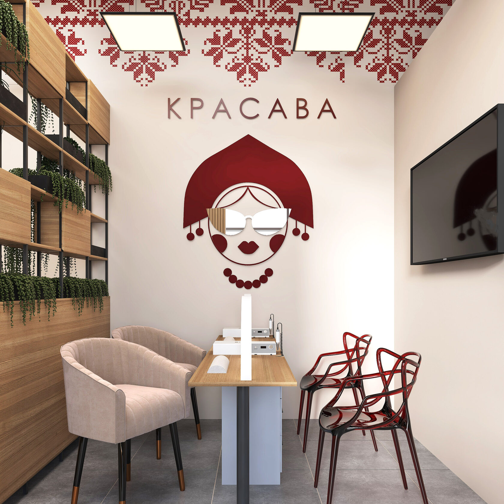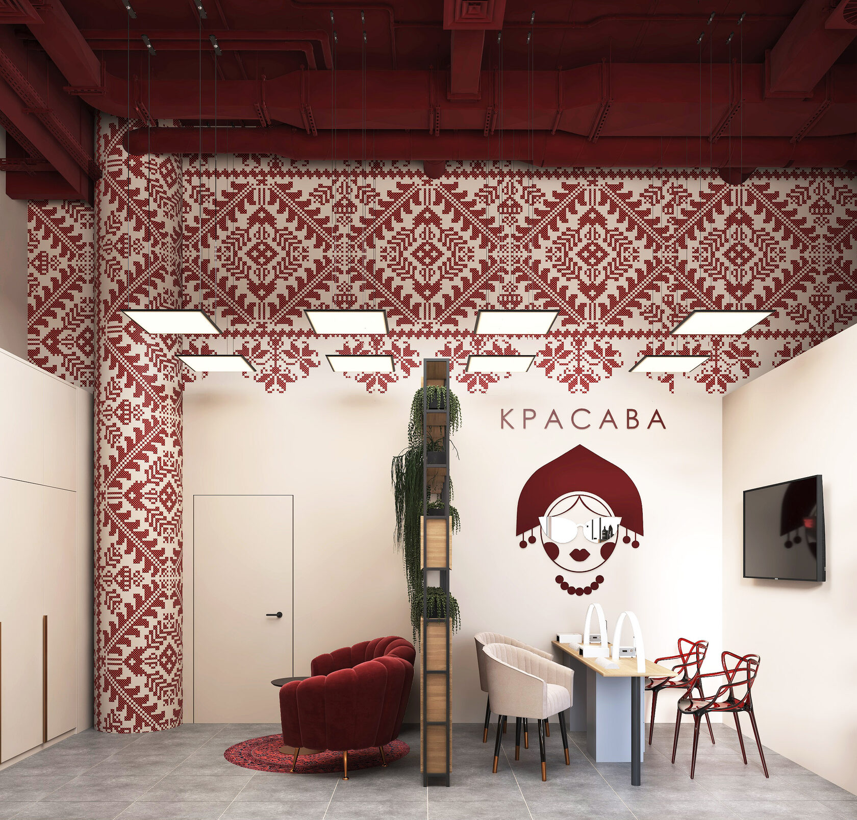 Концепция: Философия «Красавы» утверждает, что настоящая красота рождается на стыке традиции и современности. Проект вдохновлен богатством русской культуры, её символами, переосмысленными сквозь призму сегодняшнего дня. Интерьер подчеркивает идею диалога прошлого и будущего, сочетая наследие и инновации. Он создан как фон, который поддерживает, вдохновляет и раскрывает потенциал как мастеров, так и клиентов, уважая их индивидуальность. «Красава» — это современное культурное высказывание о женственности, самобытности и красоте, созданное на пересечении этнической памяти и актуального дизайна.