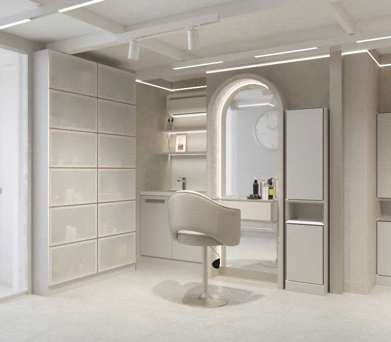 Итог: Итогом стал интерьер, где каждая деталь служит цели создания не просто салона, а места, где красота встречается с комфортом. Проект идеально балансирует между визуальной привлекательностью для клиентов и эргономичностью для специалистов, утверждая новый стандарт в дизайне салонов красоты, где функциональность и эстетика образуют единое целое.