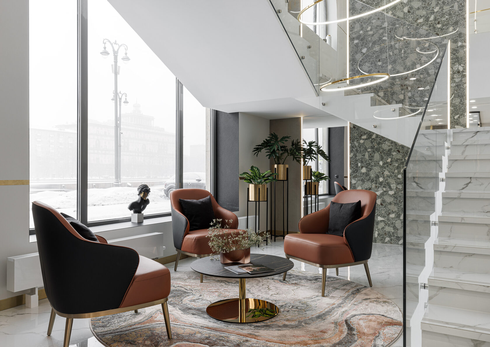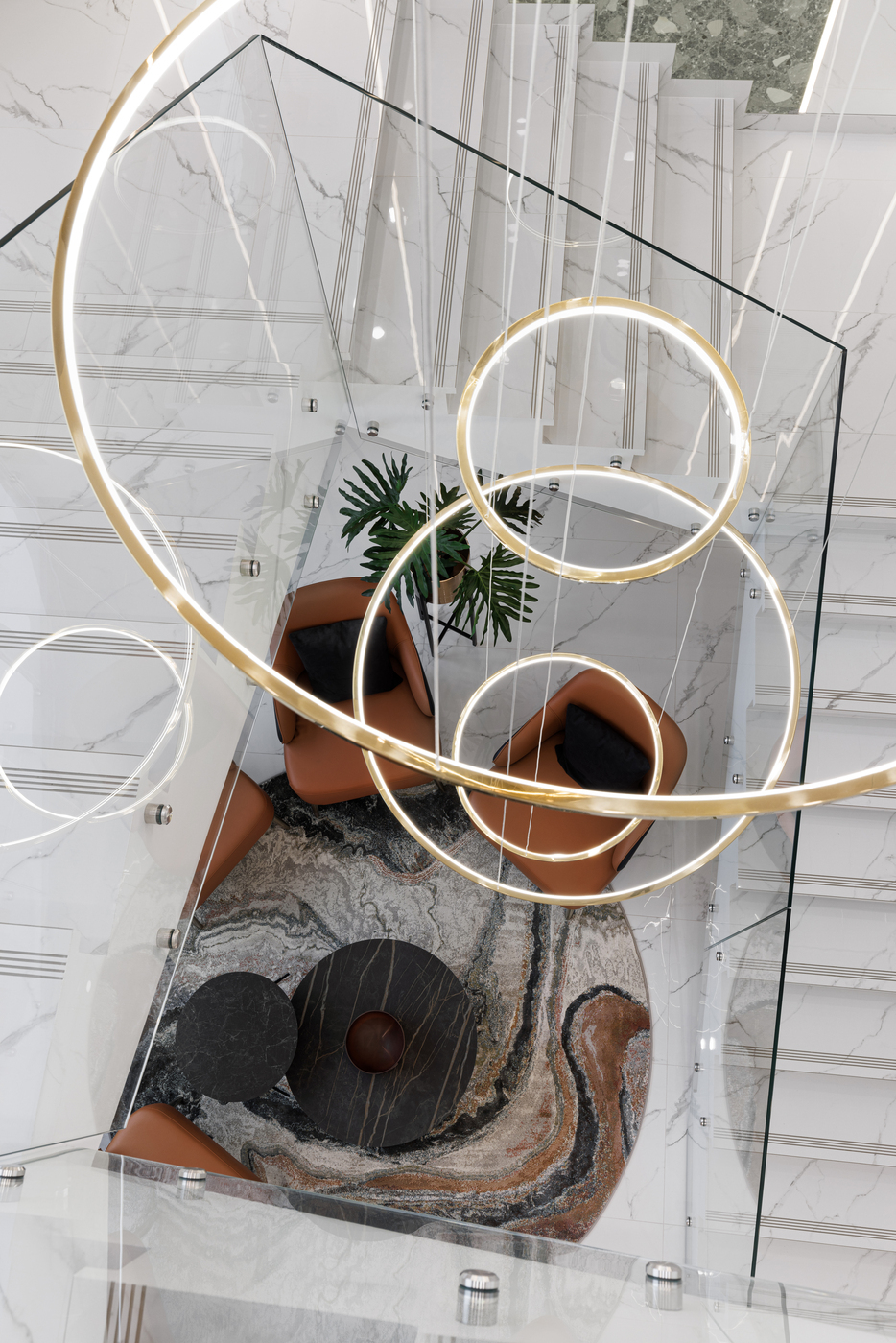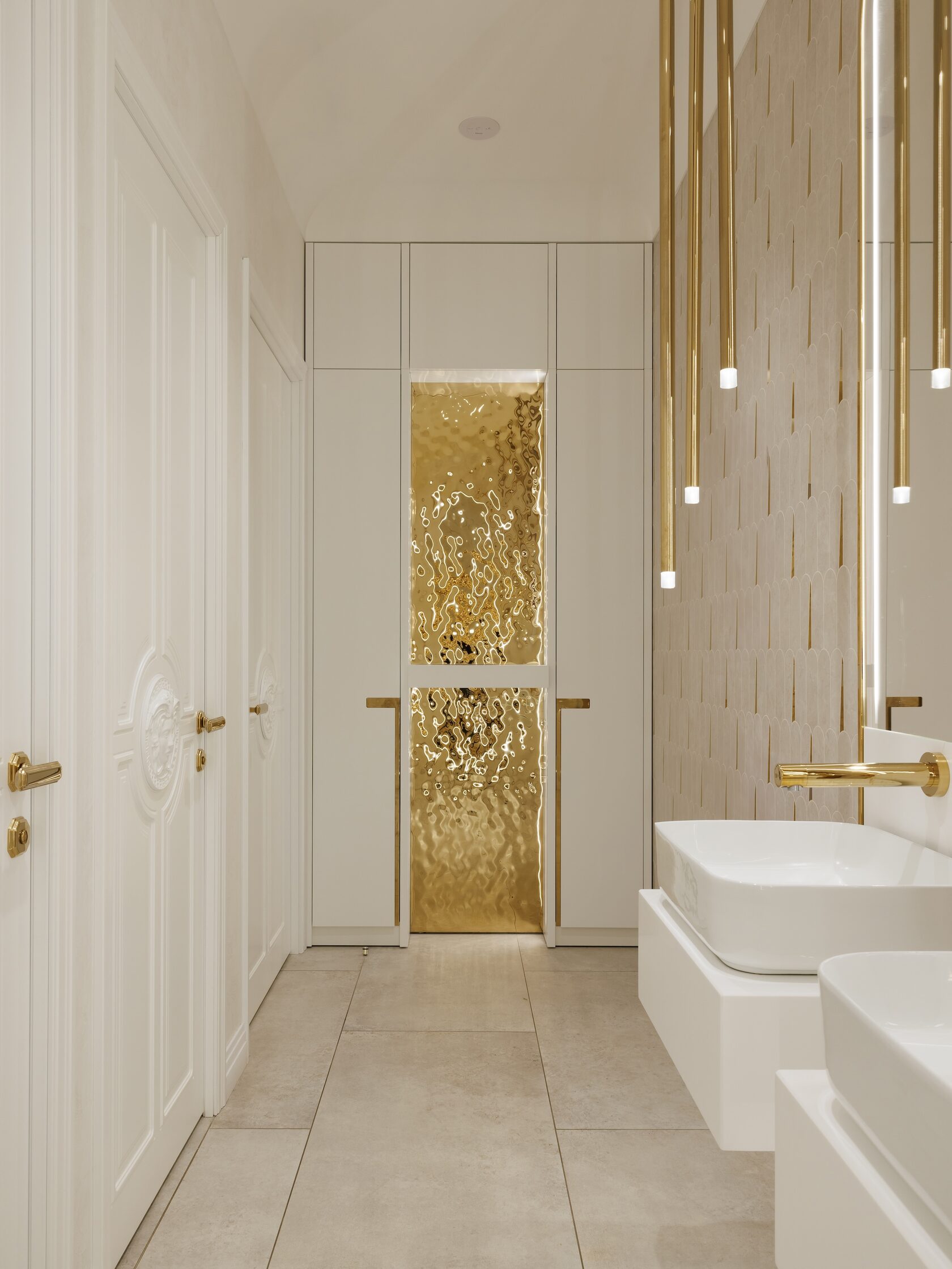 Концепция: Дизайн интерьера основан на использовании премиальных натуральных материалов, включая изысканный мрамор. Визуальная концепция строится на светлых, отражающих поверхностях, стекле и зеркалах, что создает ощущение простора и легкости. Цветовая палитра выдержана в сложных, светлых тонах, подчеркивающих элегантность и статус.