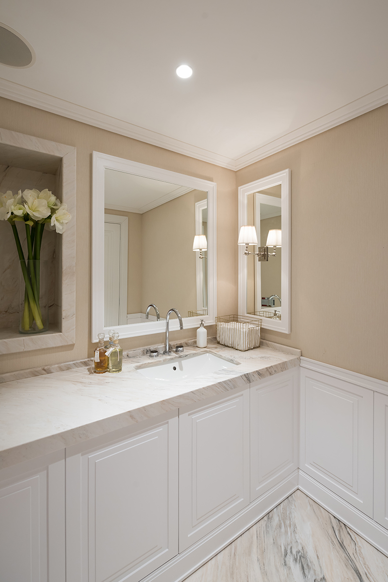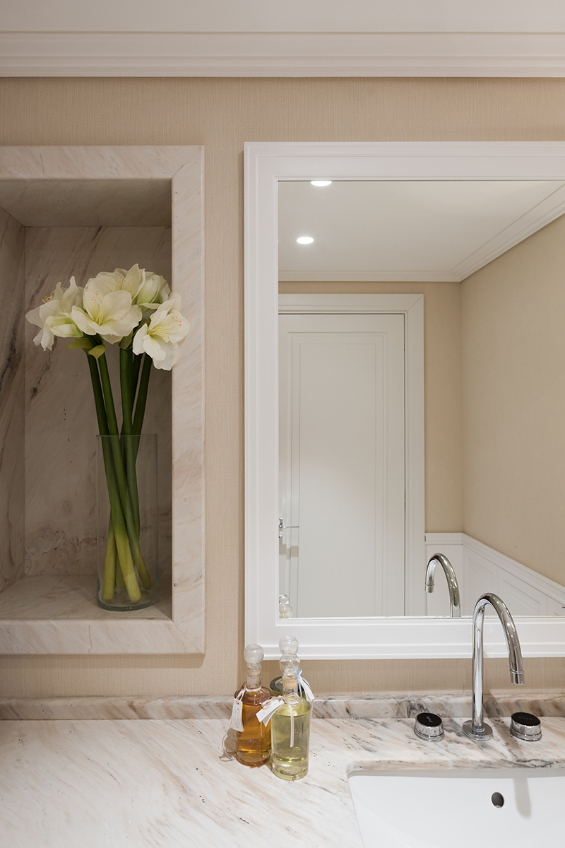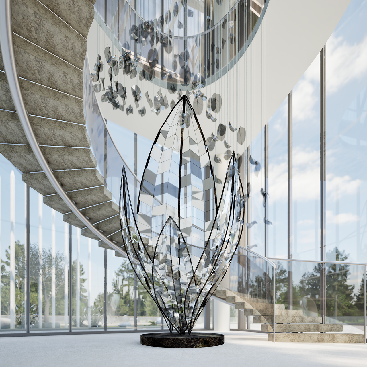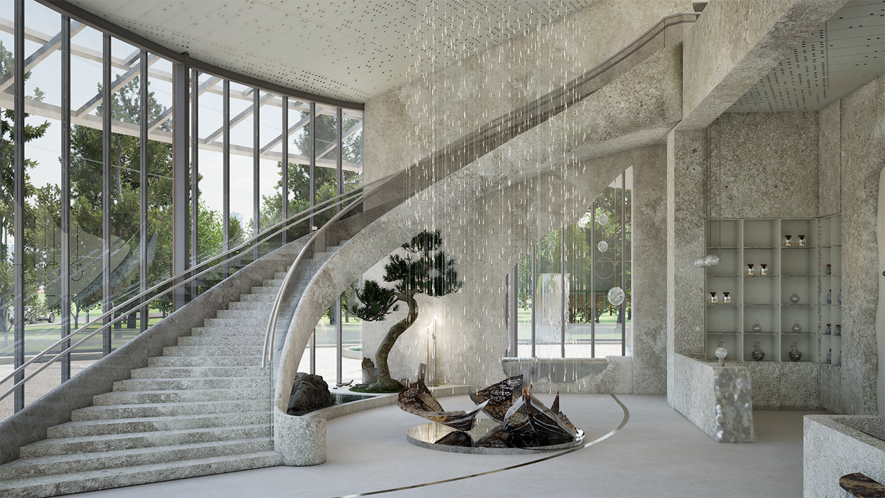 Концепция: Дизайн интерьера основан на использовании премиальных натуральных материалов, включая изысканный мрамор. Визуальная концепция строится на светлых, отражающих поверхностях, стекле и зеркалах, что создает ощущение простора и легкости. Цветовая палитра выдержана в сложных, светлых тонах, подчеркивающих элегантность и статус.