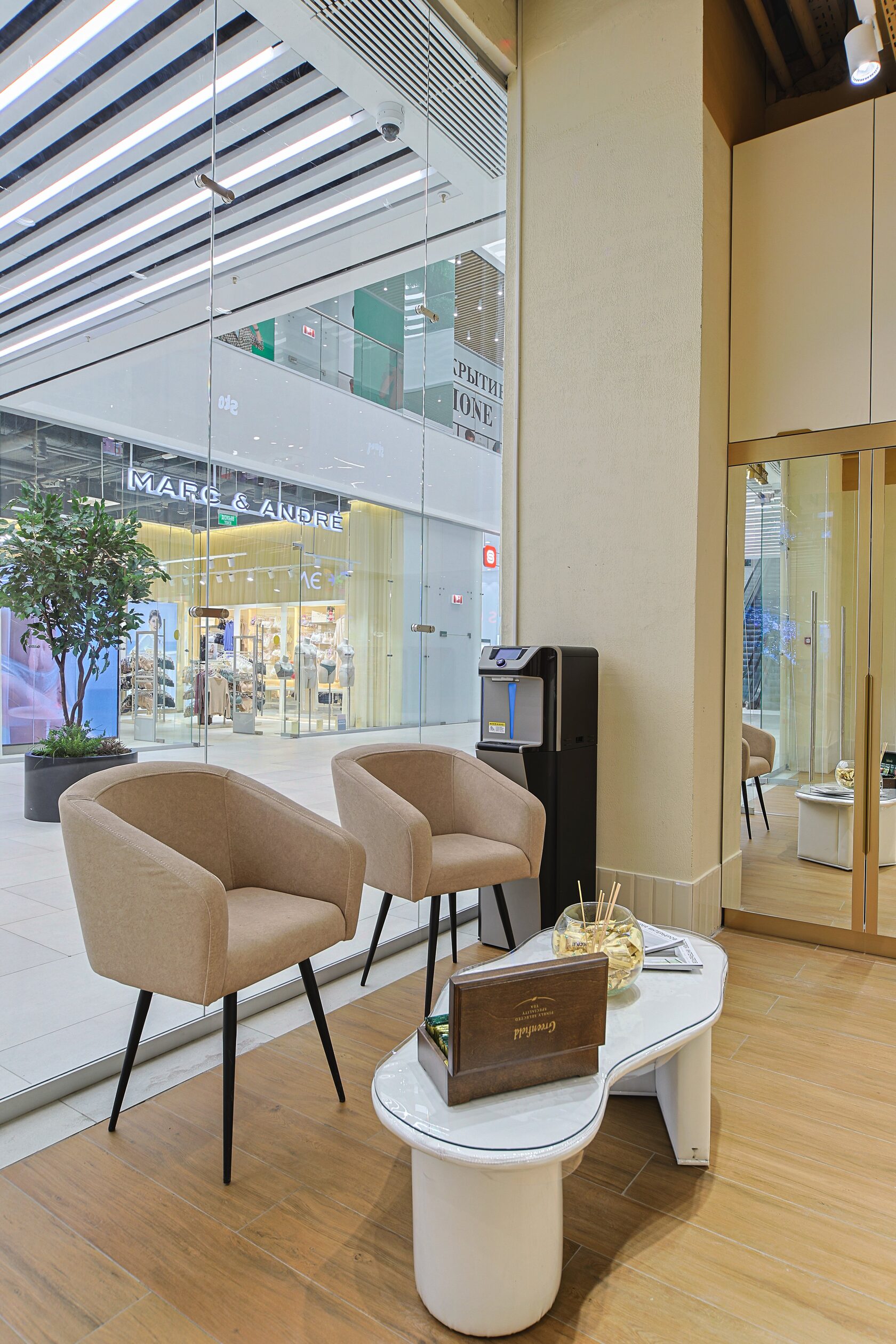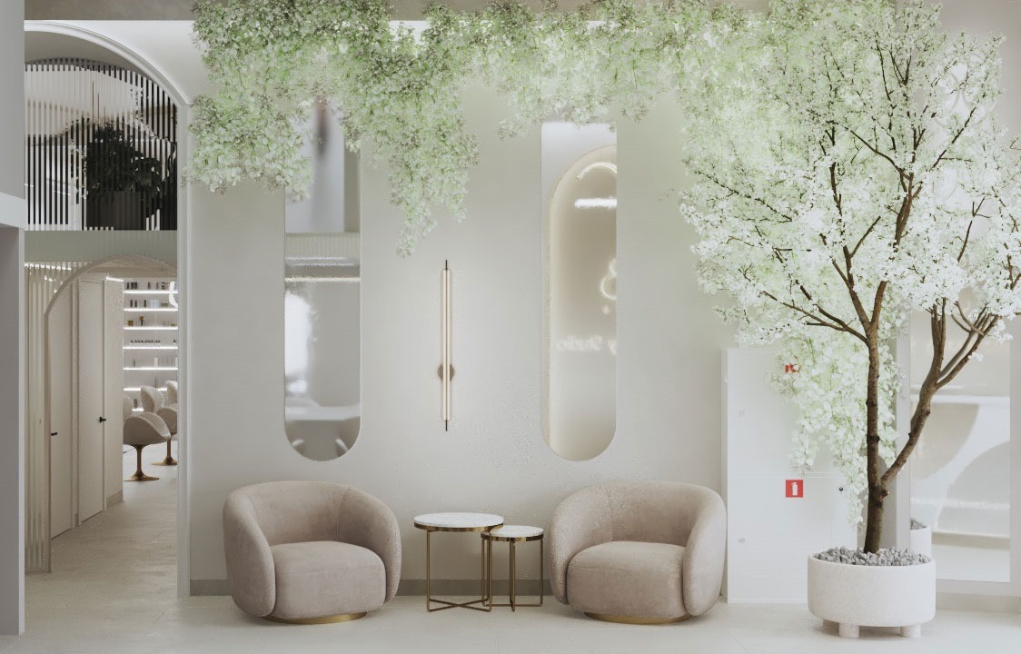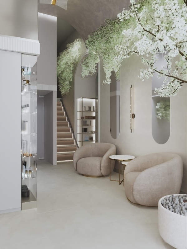 Дизайн второго салона получился самобытным, несмотря на общее направление. Цветочные мотивы сакуры — символ бренда — вновь нашли своё отражение, но на этот раз в более плавных, минималистичных формах. Пространство словно приблизилось к эстетике Japandi, сочетая природную сдержанность с лёгкими нотами роскоши. Каждая деталь была тщательно выверена: от цветовой палитры до текстур, от освещения до функциональных решений.