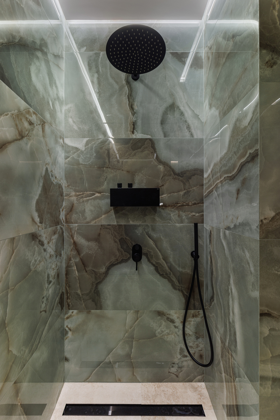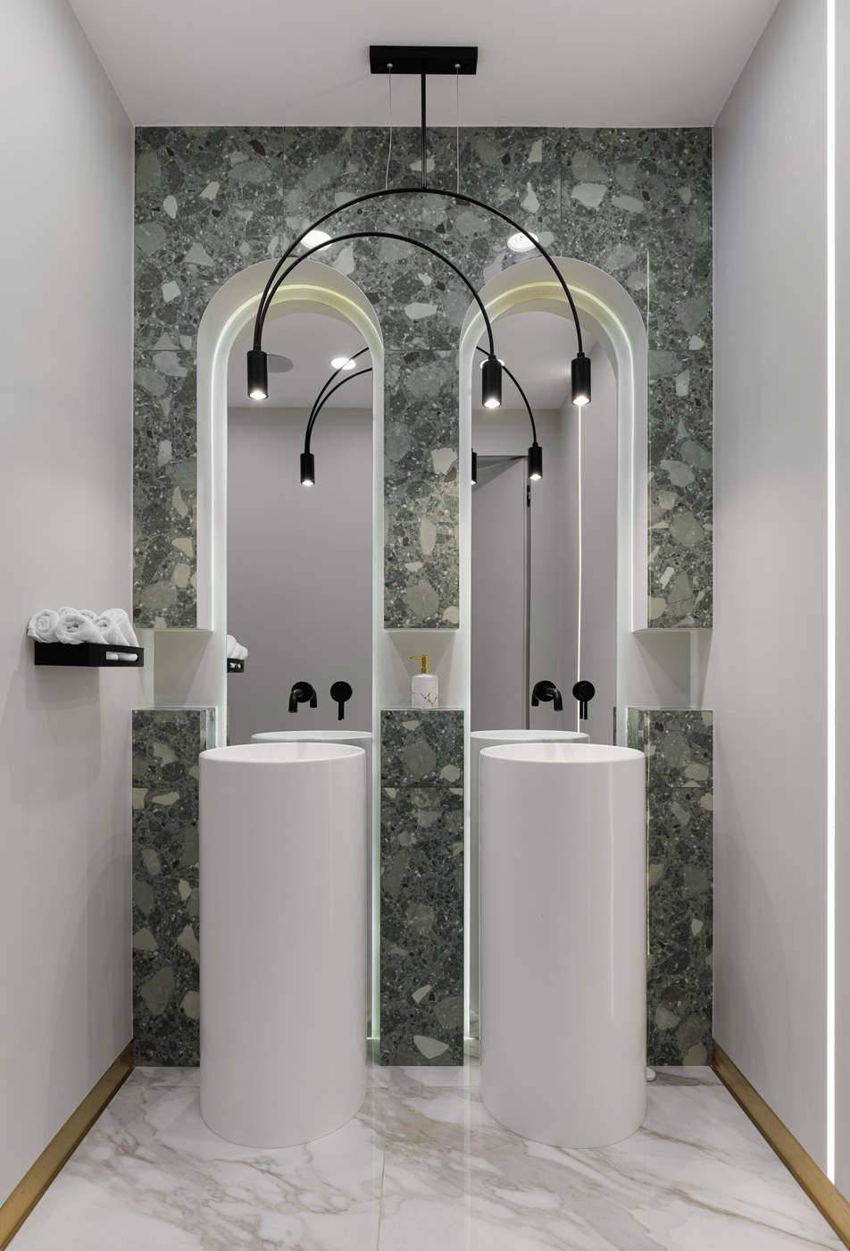 Концепция: Задачей проекта стало соединение исторической атмосферы центра Москвы с эстетикой современного интерьера. Светлые материалы, латунные детали и декоративные элементы, повторяющие арочные окна, формируют цельный и изысканный образ. Особое внимание уделено SPA-зоне: черный мрамор, мягкий теплый свет, благородные текстуры и ароматы масел создают ощущение роскоши и способствуют глубокой релаксации.