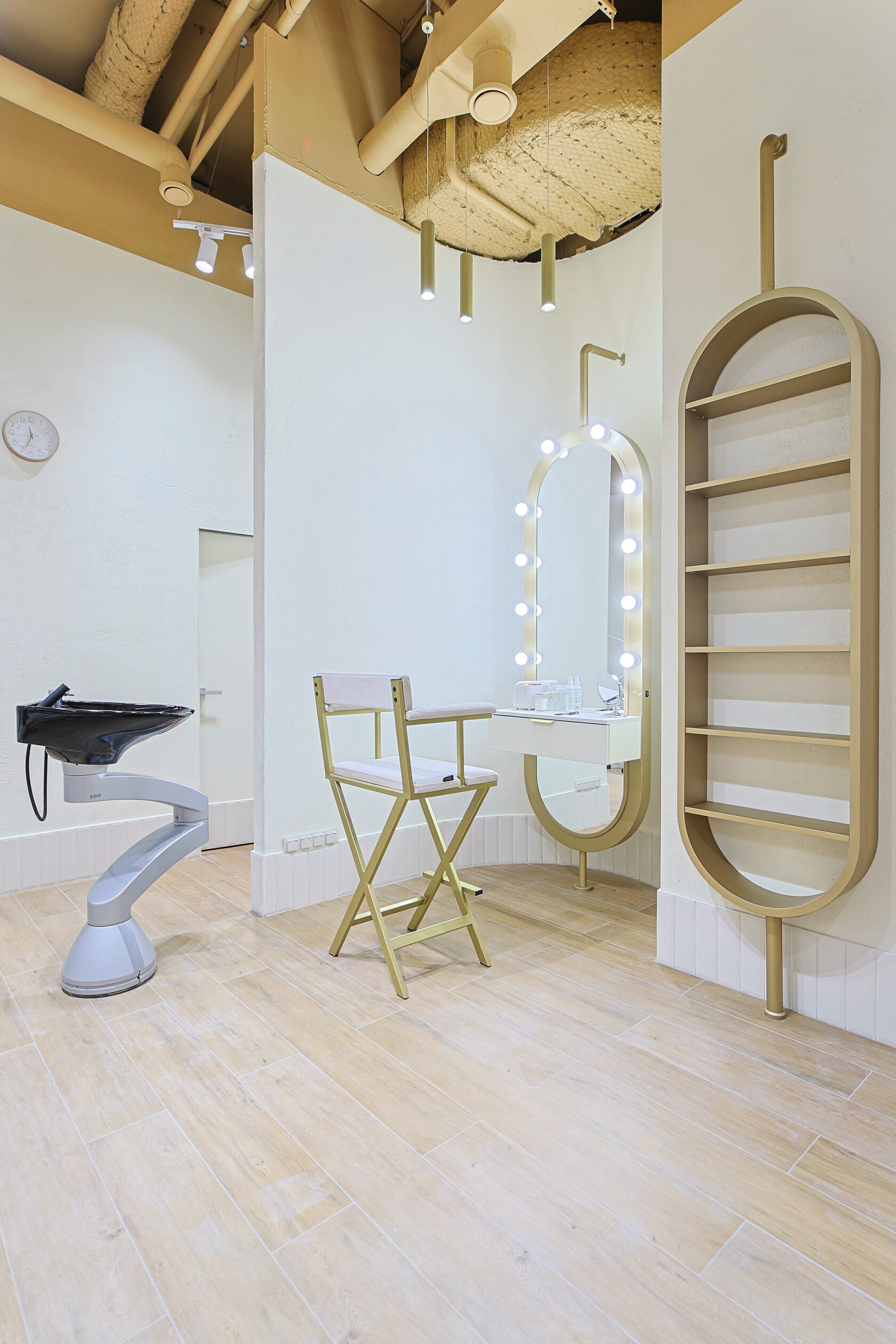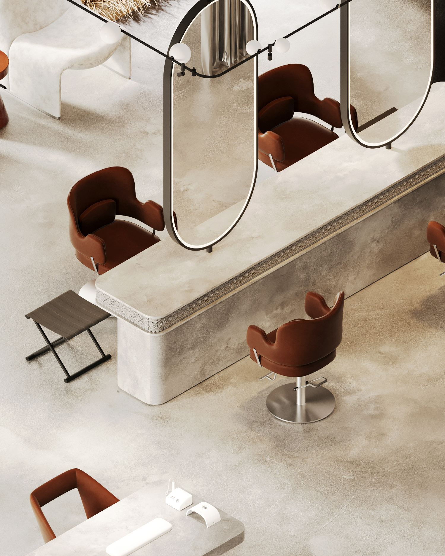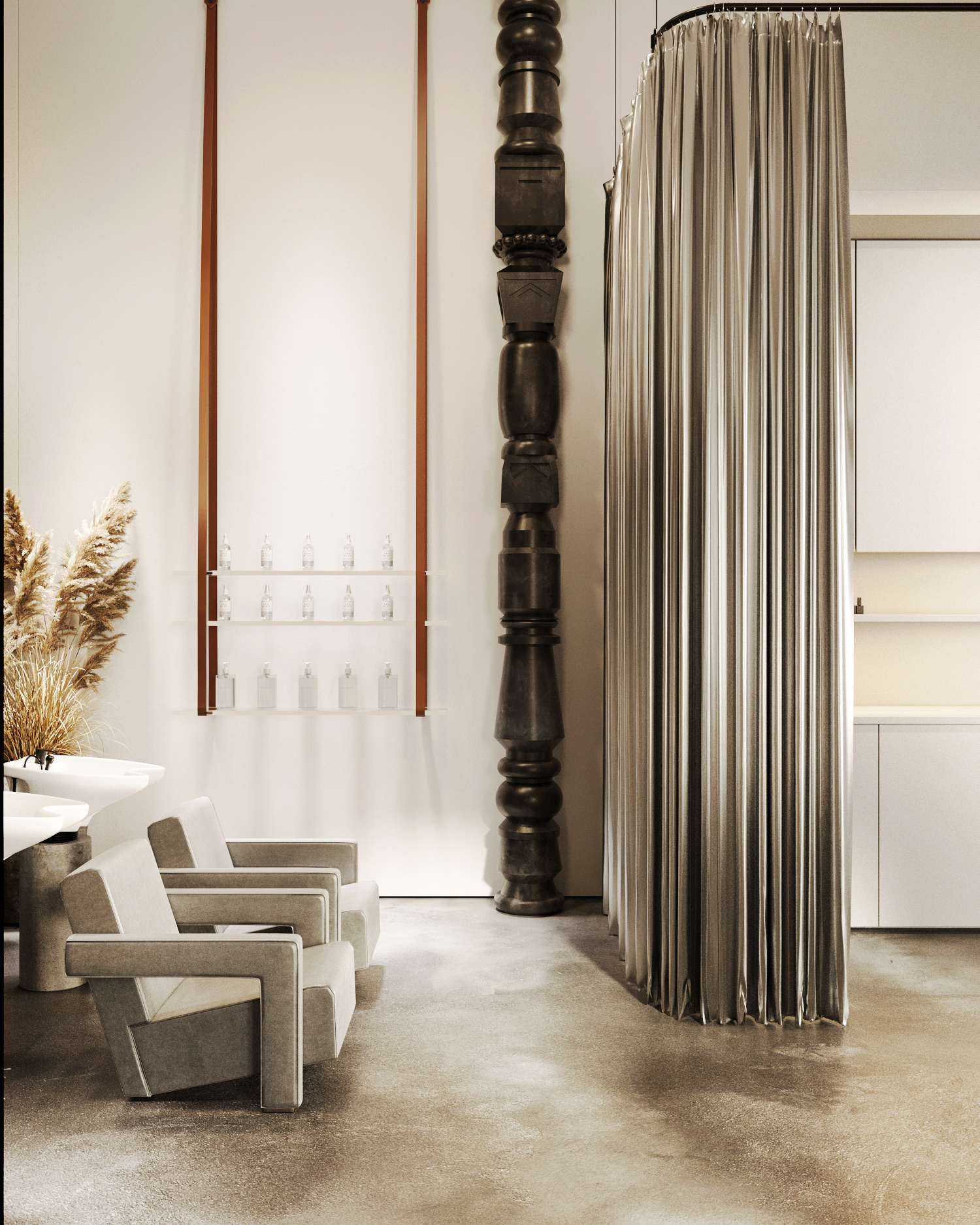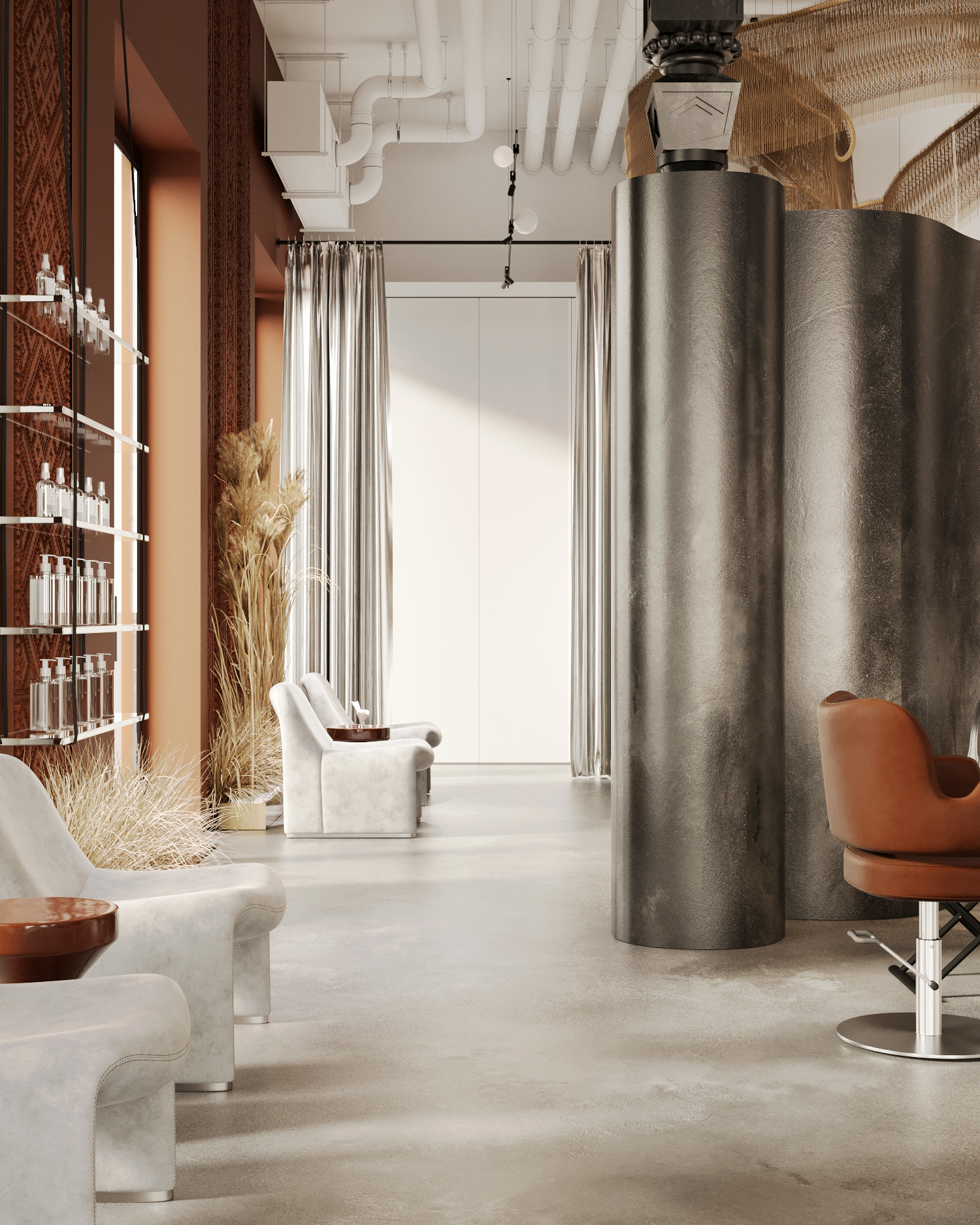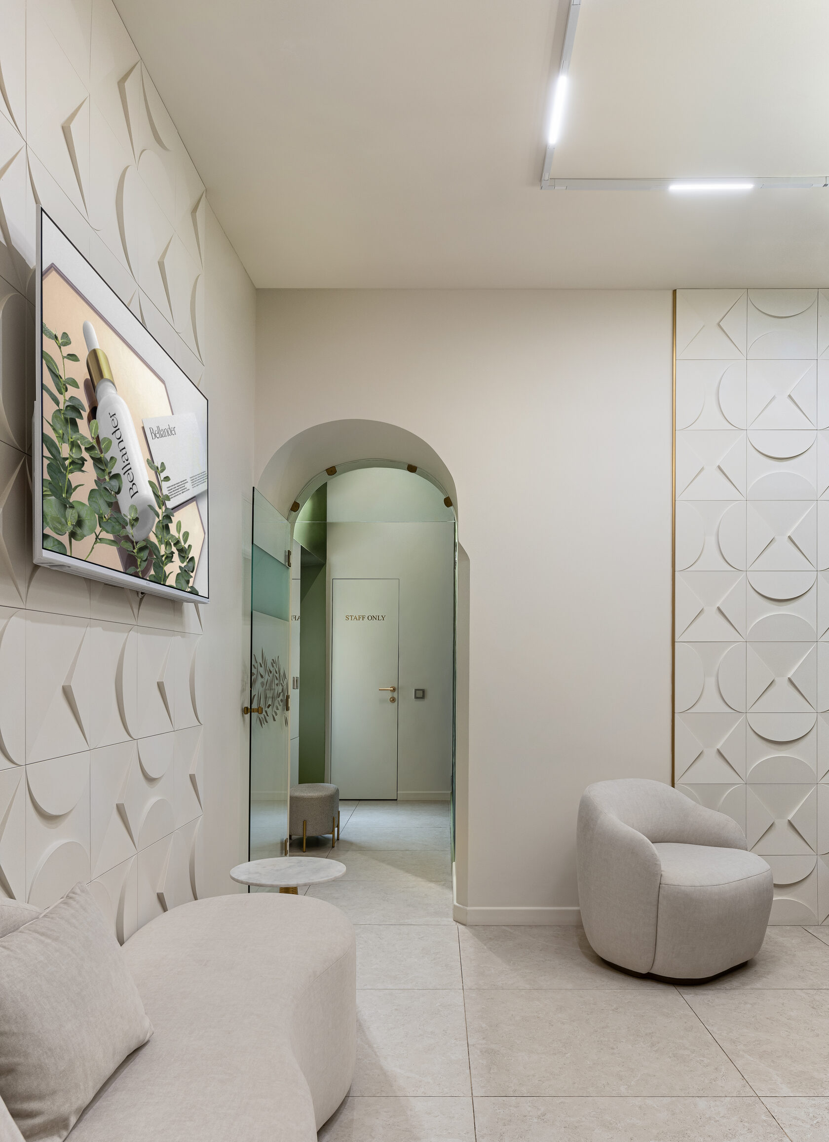 Концепция: Ключевой задачей было создание интерьера, сочетающего узнаваемый стиль сети с уникальной индивидуальностью. В основу концепции легли мягкие радиусные линии, пастельная палитра природных оттенков и изысканные акценты латуни/золота, что придает пространству ощущение легкости и премиальности. Особое внимание уделено функциональному зонированию, обеспечивающему максимальный комфорт: от продуманного шкафа-ресепшена до индивидуальной подводки воды к каждой рабочей зоне. Вызовом стал низкий уровень коммуникаций на потолке, решенный посредством окрашивания в теплый песочно-охровый оттенок, что стало органичным элементом дизайна. Акцентные терракотовые арки с подсветкой и фактурные стены VIP-кабинета создают выразительные визуальные доминанты, подчеркивая современный и гостеприимный характер салона.