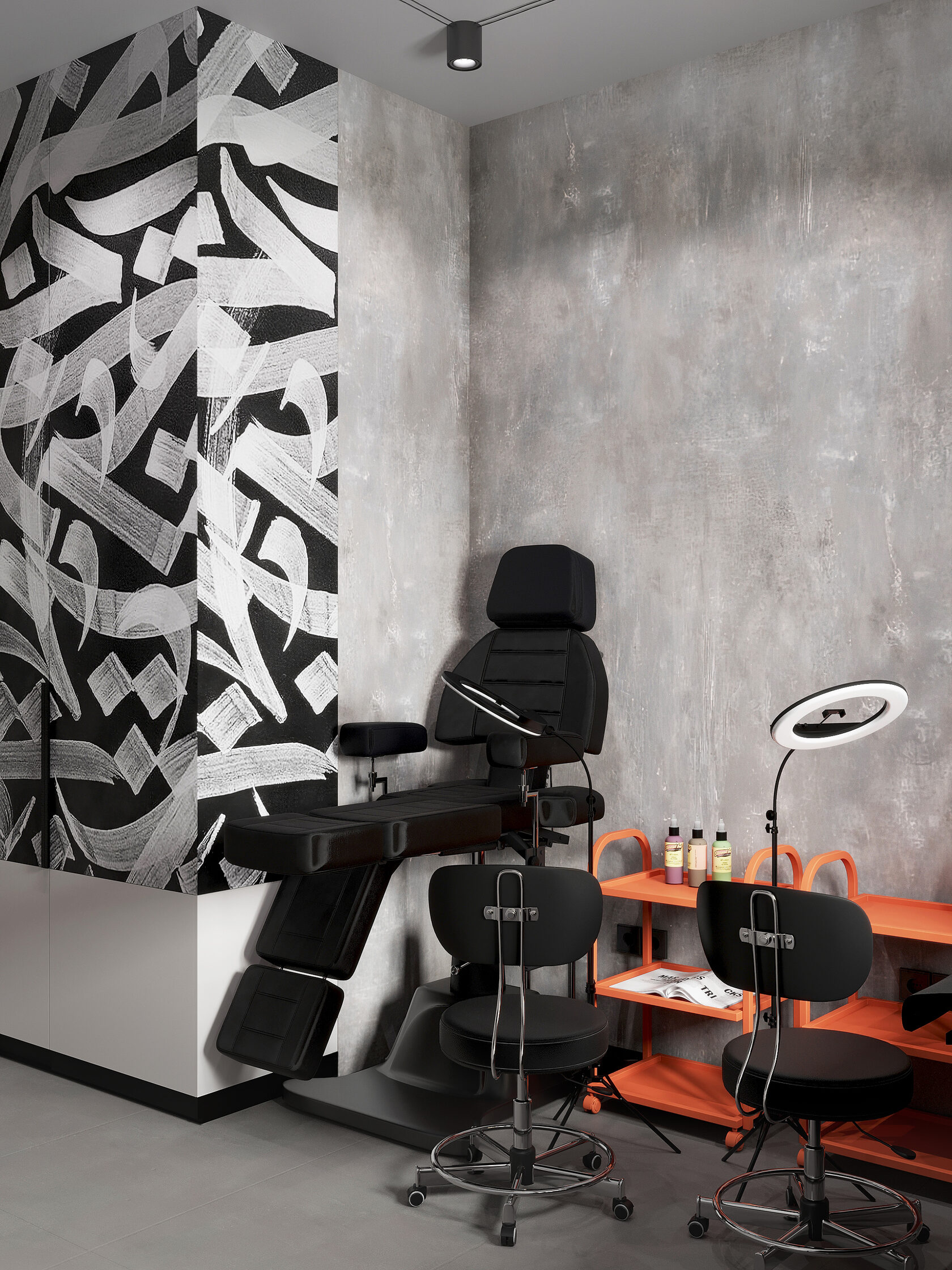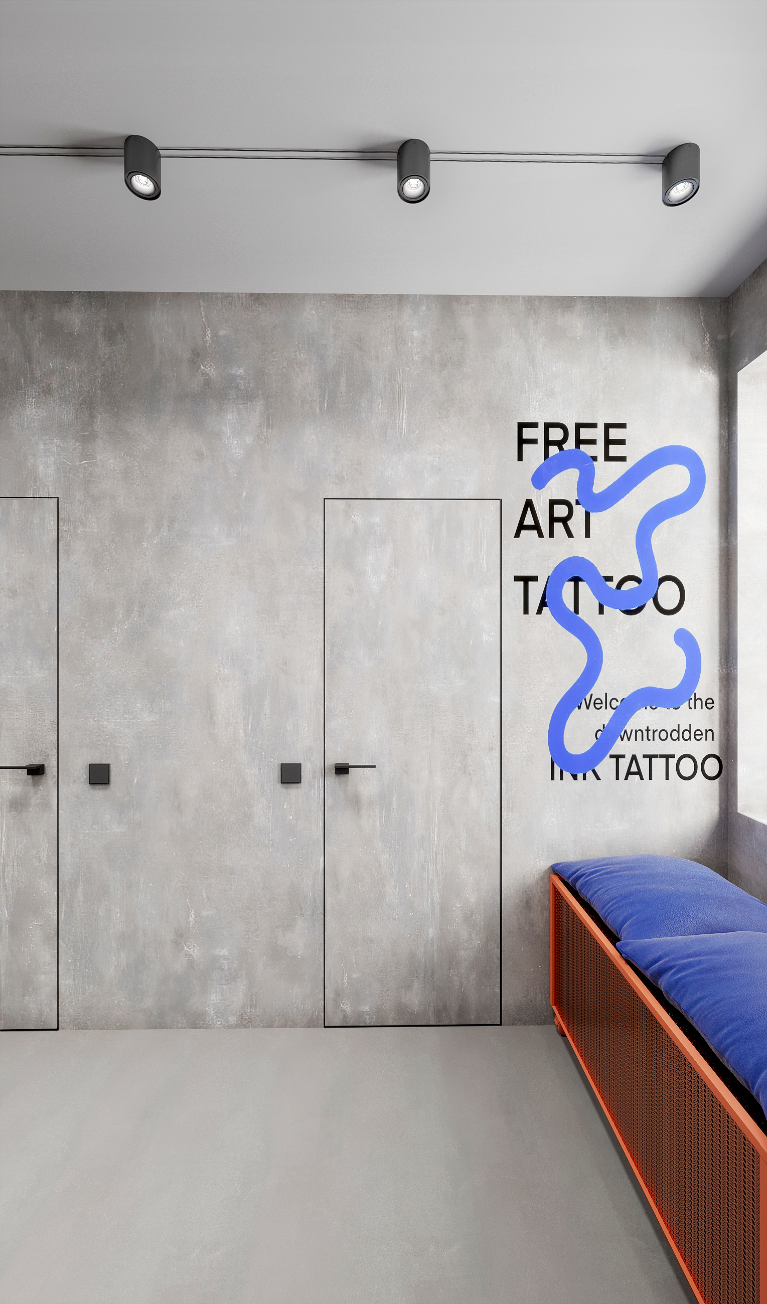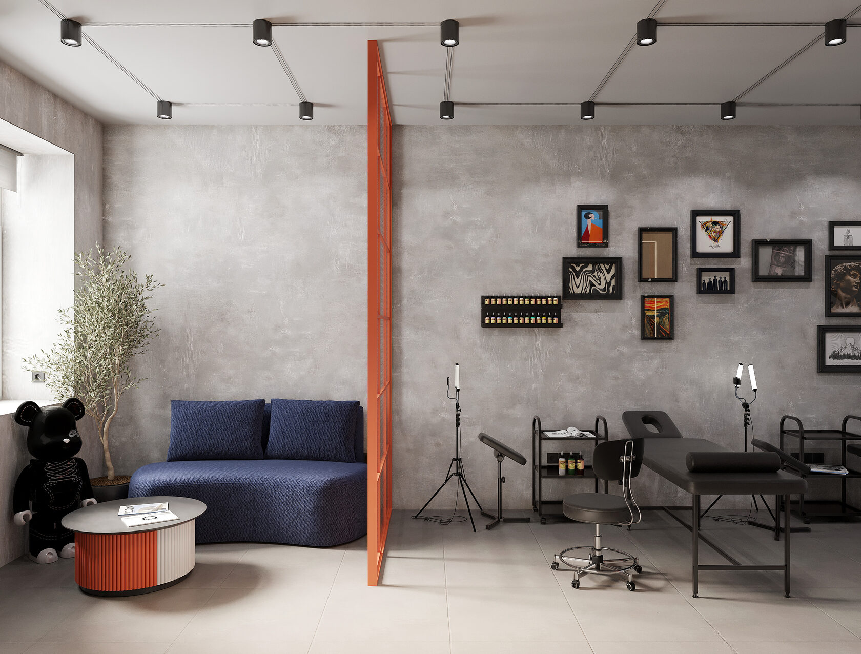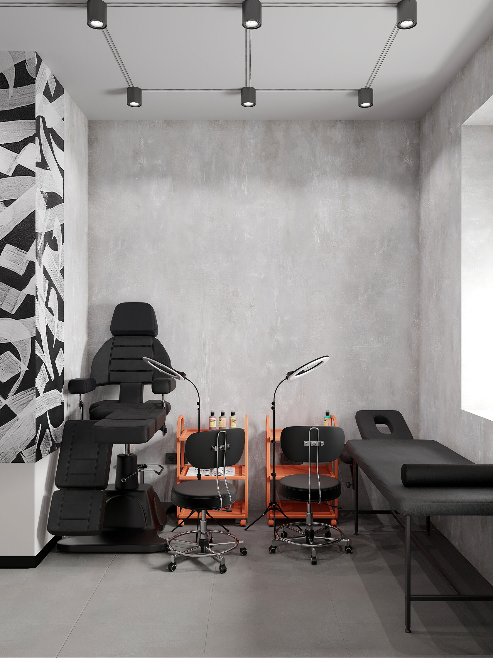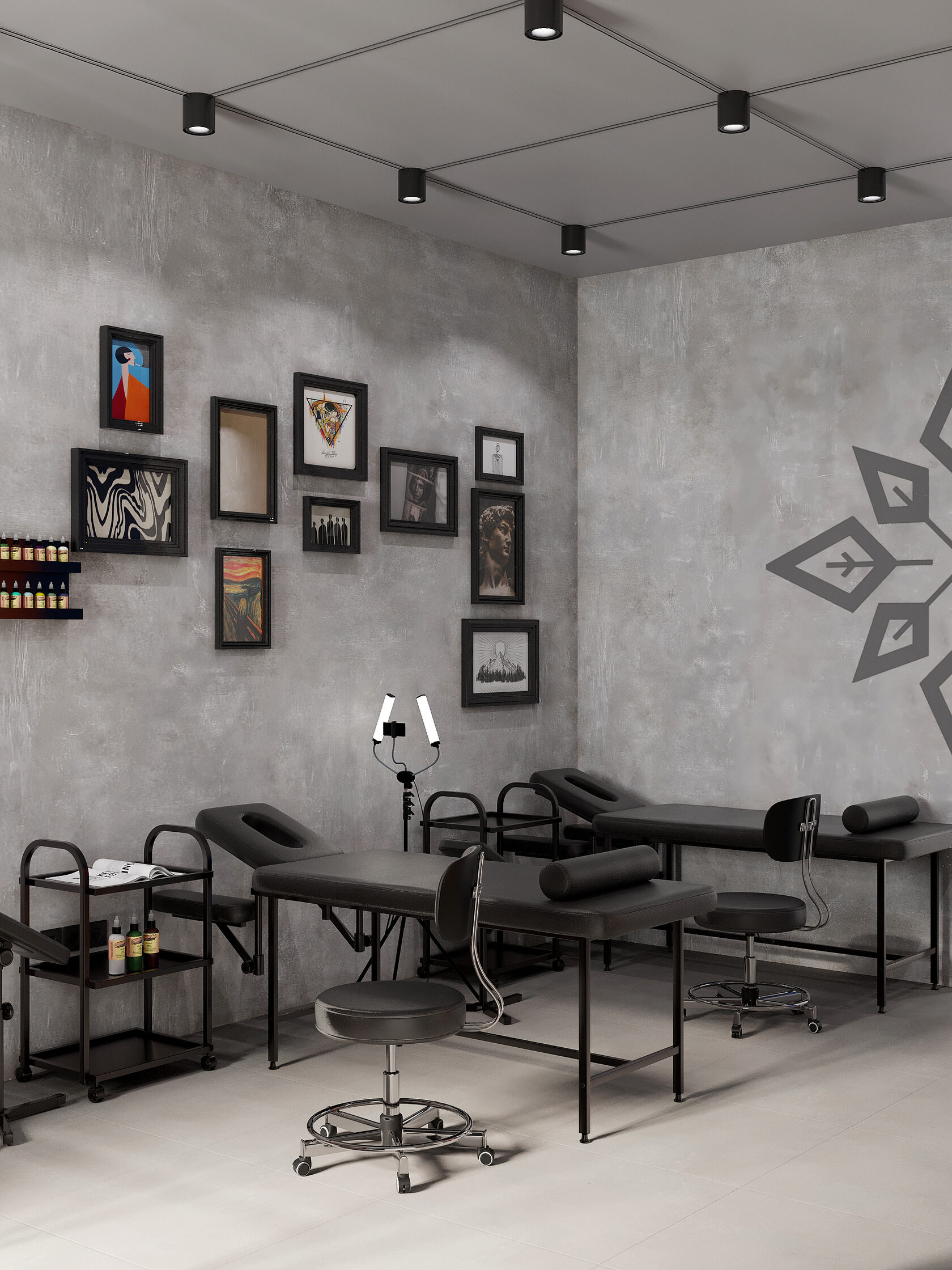 Концепция: В основе дизайн-концепции лежит глубокое понимание потребностей каждого специалиста, что позволило создать интуитивно понятные и эргономичные рабочие зоны: два места для тату-мастеров и индивидуальный кабинет для пирсинга. В палитре интерьера доминируют спокойные серые оттенки, формирующие атмосферу умиротворения и уюта, контрастирующие с яркими акцентами и деталями, которые придают пространству динамизм и неповторимую индивидуальность. Проект включает проработанные зоны: эффектный ресепшн, комфортабельную зону ожидания, специализированные рабочие станции, профессиональную фотозону, а также удобные бытовые помещения для персонала – кухню и санузел.