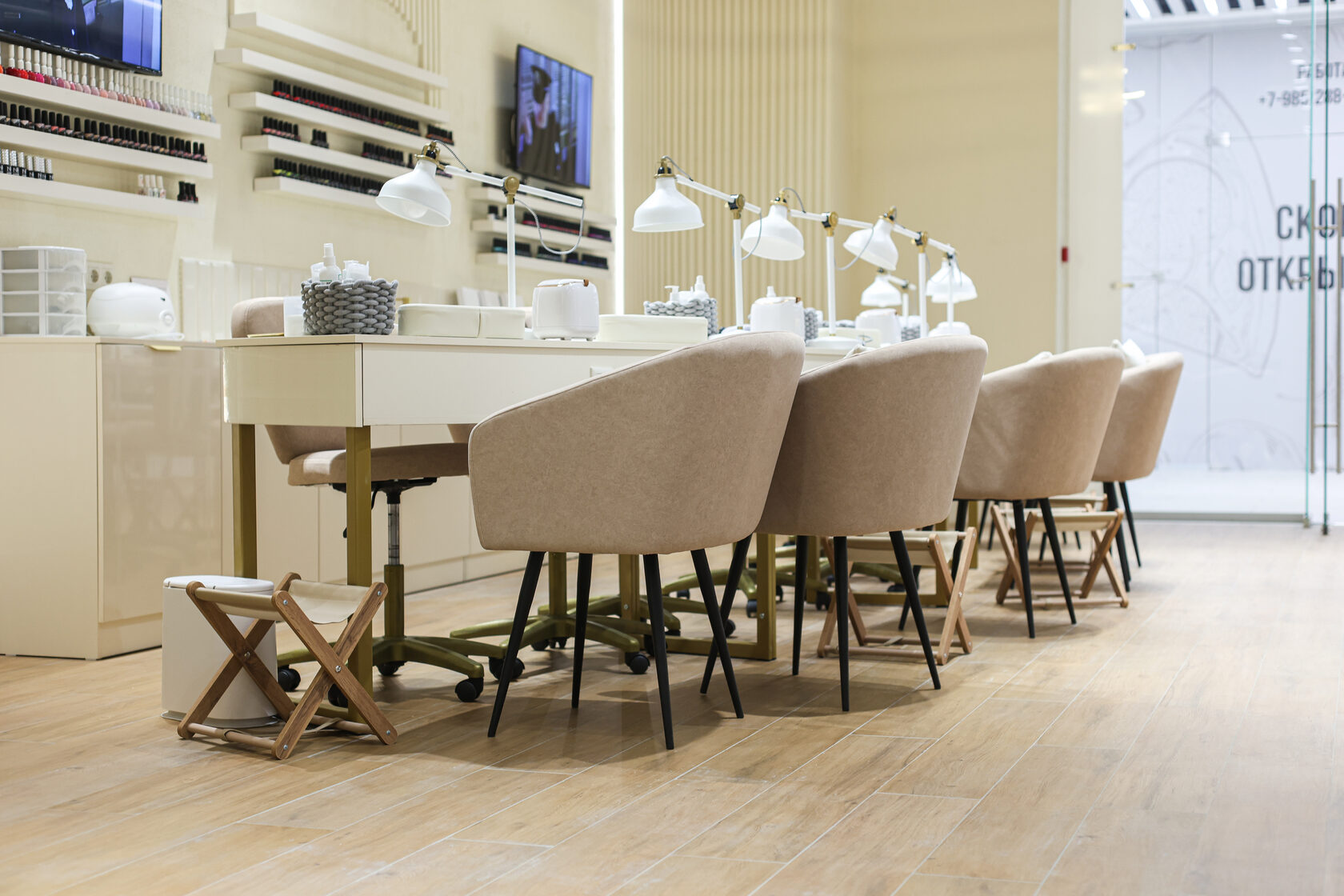Интерьер салона красоты SEVI выполнен в современном стиле с акцентом на естественные и теплые оттенки. Бежево-коричневая палитра в сочетании с деревянными панелями создает уютную и гармоничную атмосферу.
