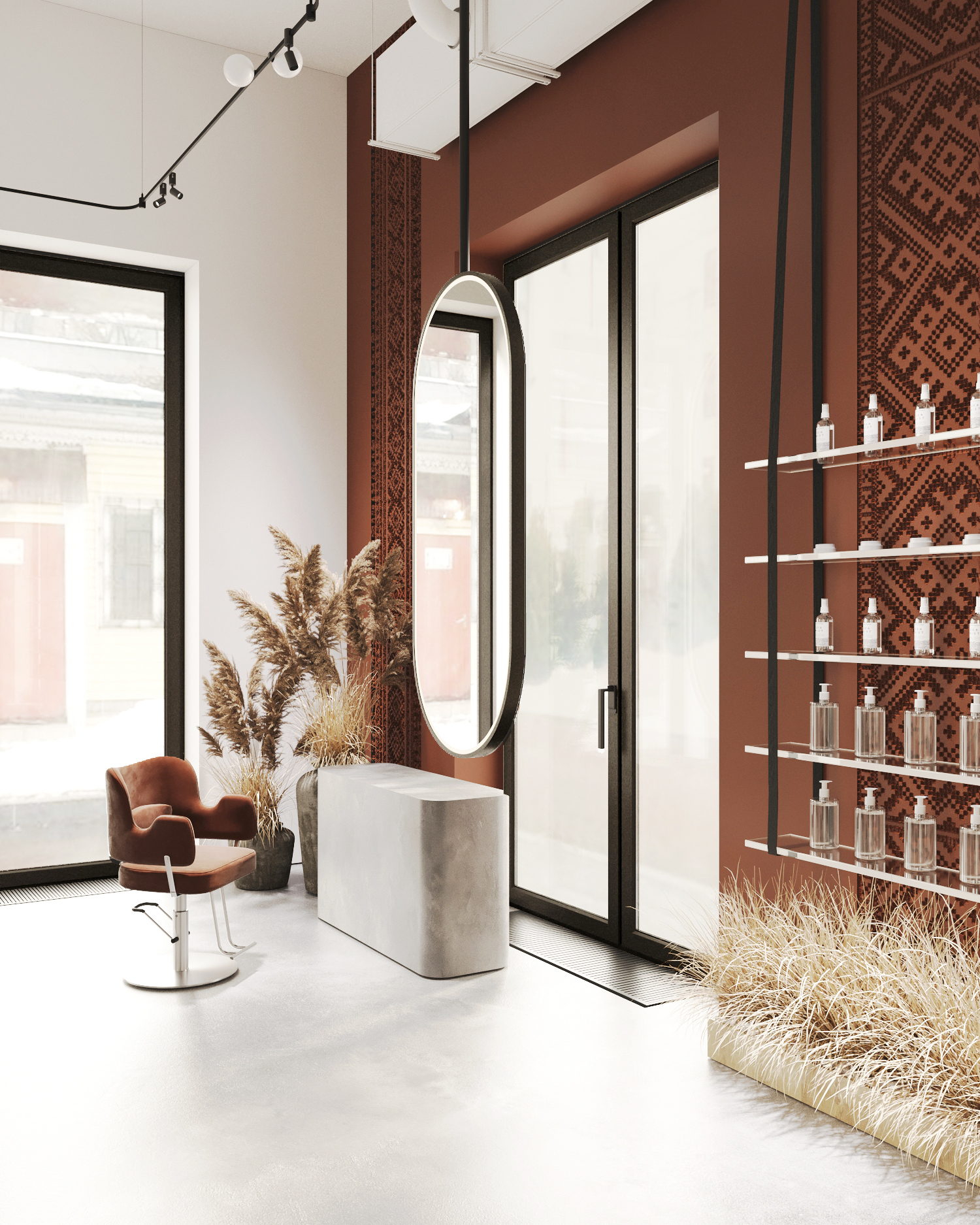 - Брутальный бетонный пол под лаком. - Яркие акцентные стены терракотового цвета, с элементами орнаментов русской культуры, которые создаются трафаретом в штукатурке. - Ровную покраску потолка и вентиляционных коммуникаций. - Яркую глянцевую ткань для штор и стеклоблоки, чтобы добавить контраста матовым поверхностям. - Необычную люстру ручной работы из агавы, которая повторяет плавные изгибы зонирующей перегородки. - Витрины решили оформить полками из оргстекла, которые крепятся к длинным ремням. - Добавили сухоцветы и колосья. - Декоративные элементы из шерстяных нитей, напоминающие косы.