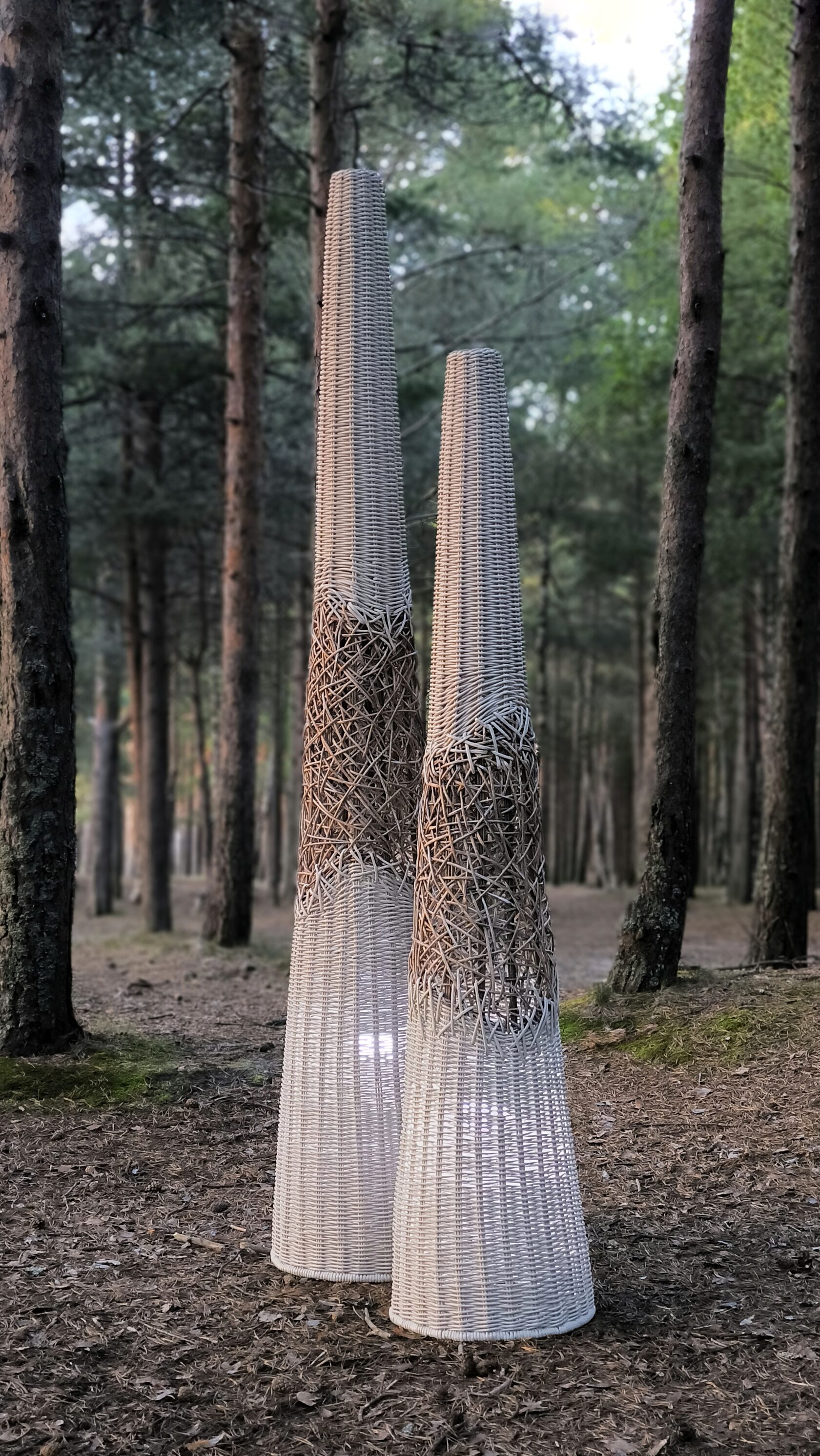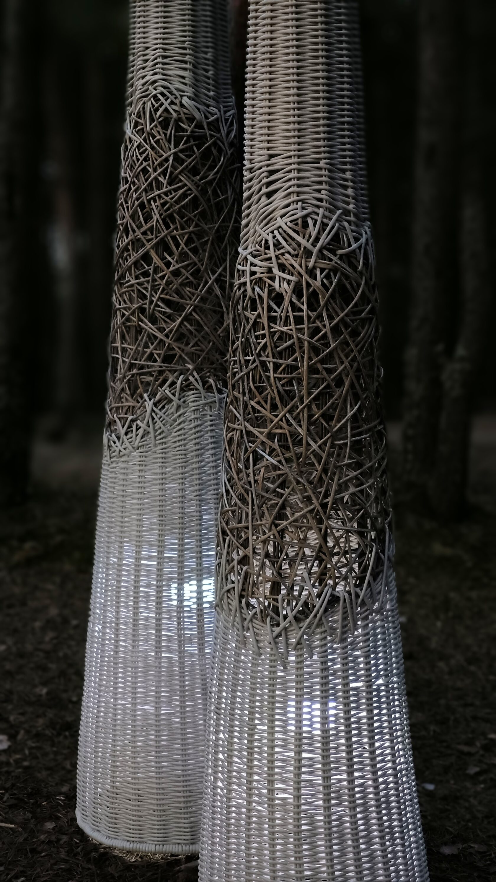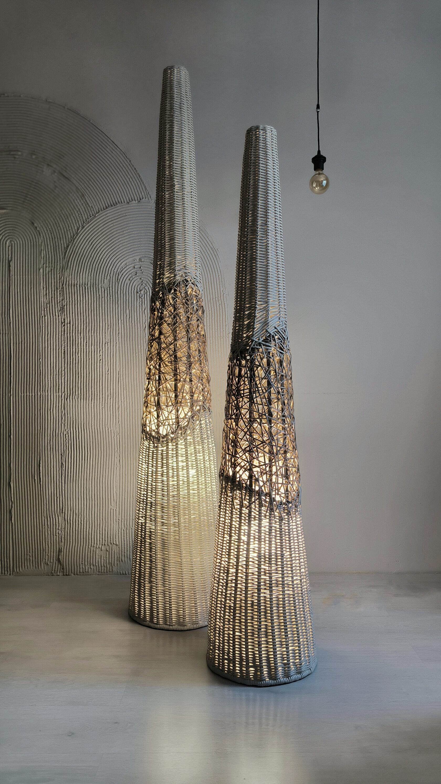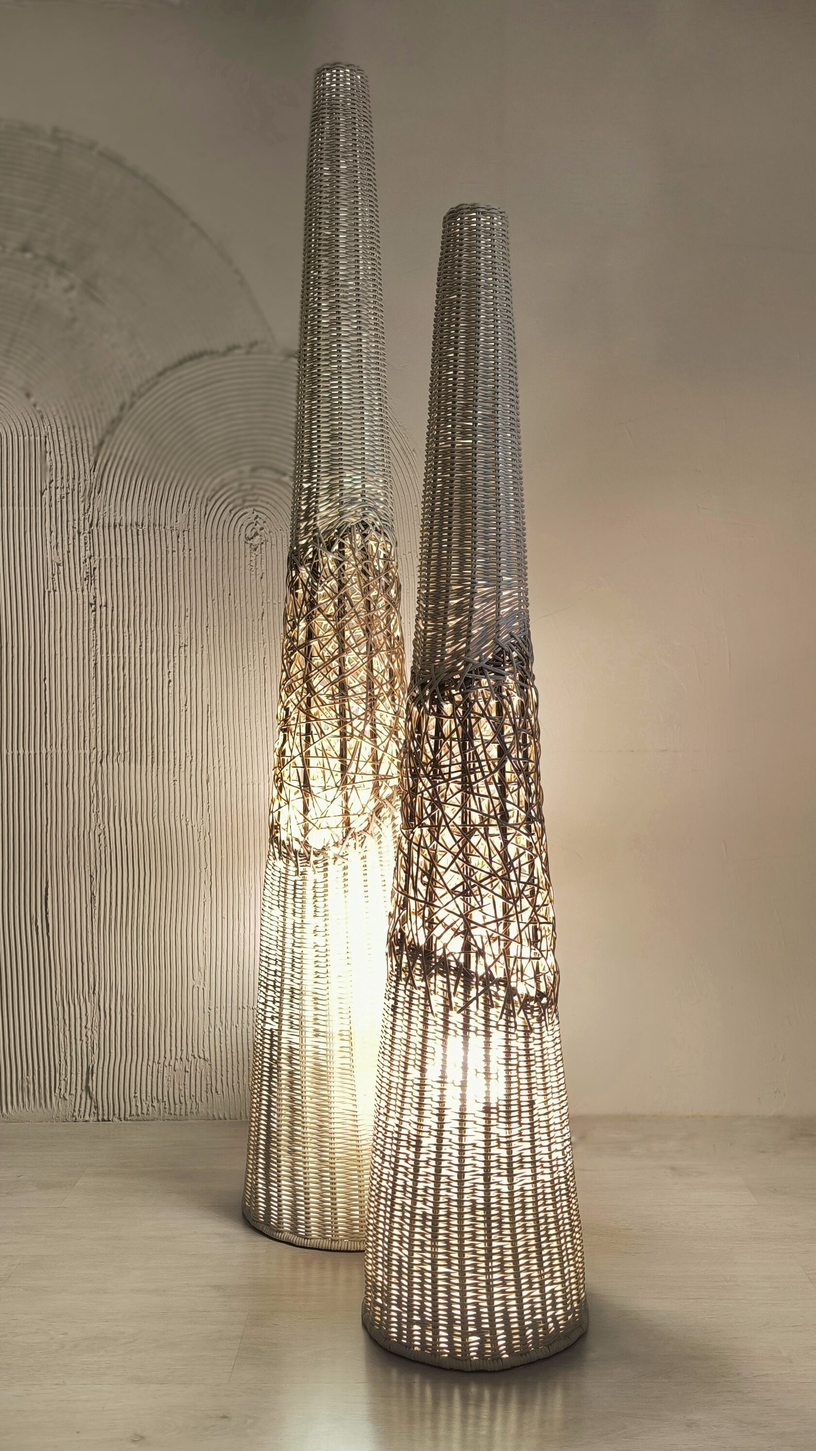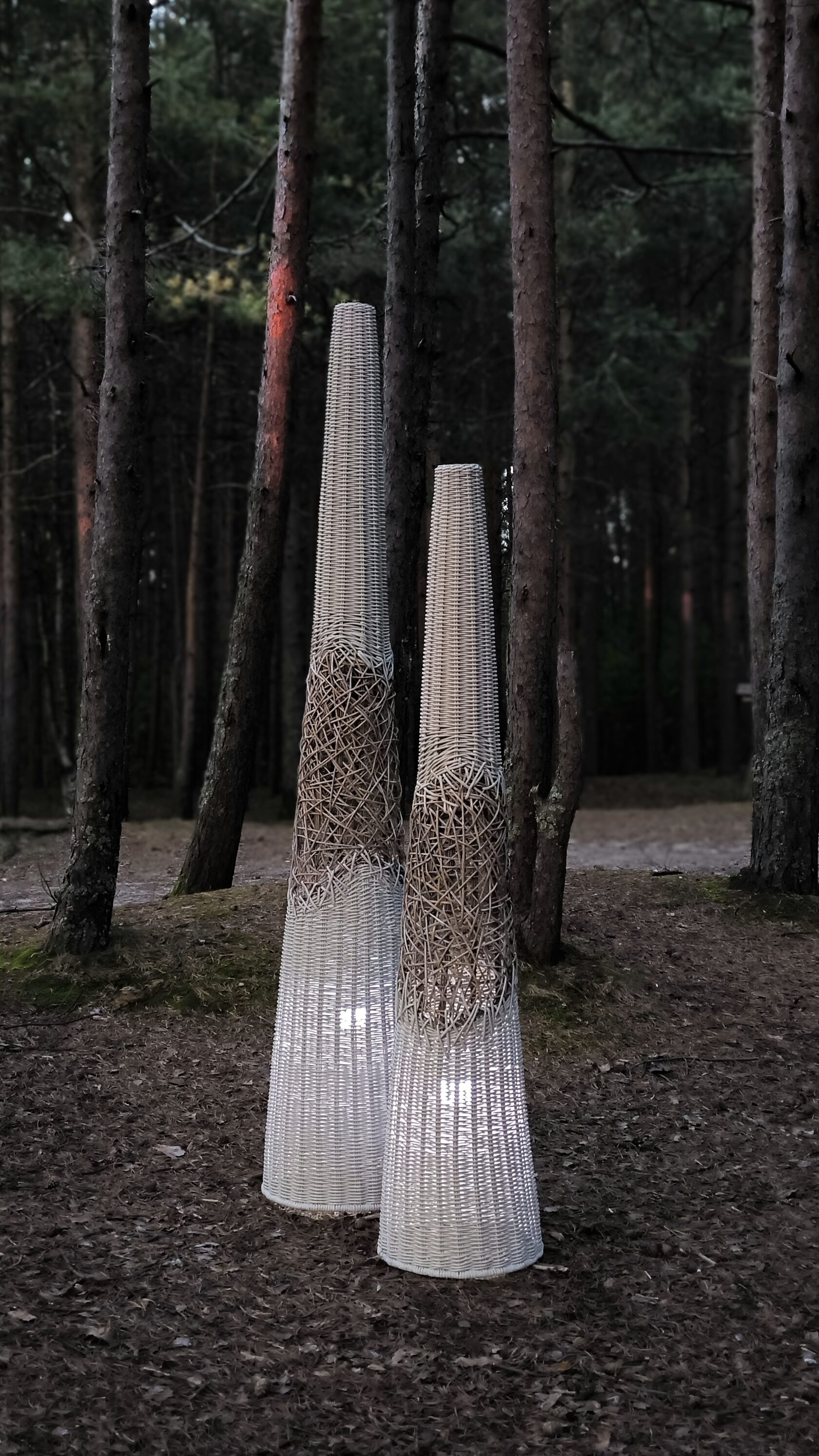 Итог: Торшеры «Ели» — это функциональные и эстетичные объекты высотой 203 и 164 см, выполненные из бумажной лозы, которые штабелируются для удобства хранения, создавая гармонию между светом, природой и дизайном.
