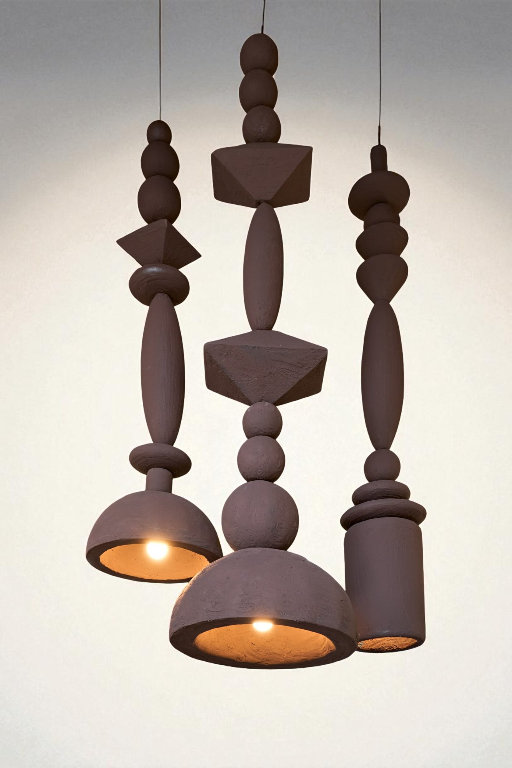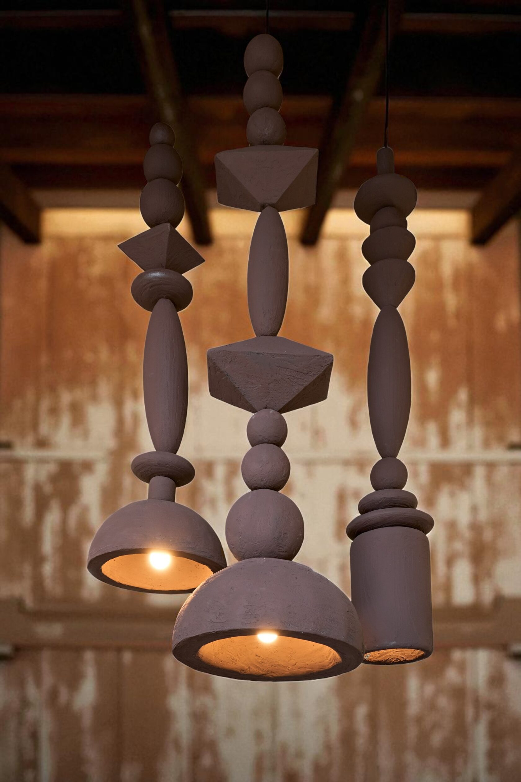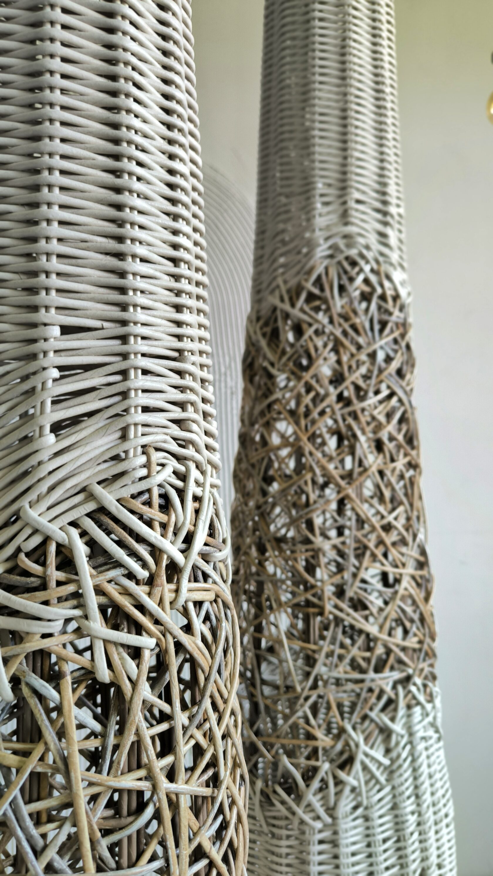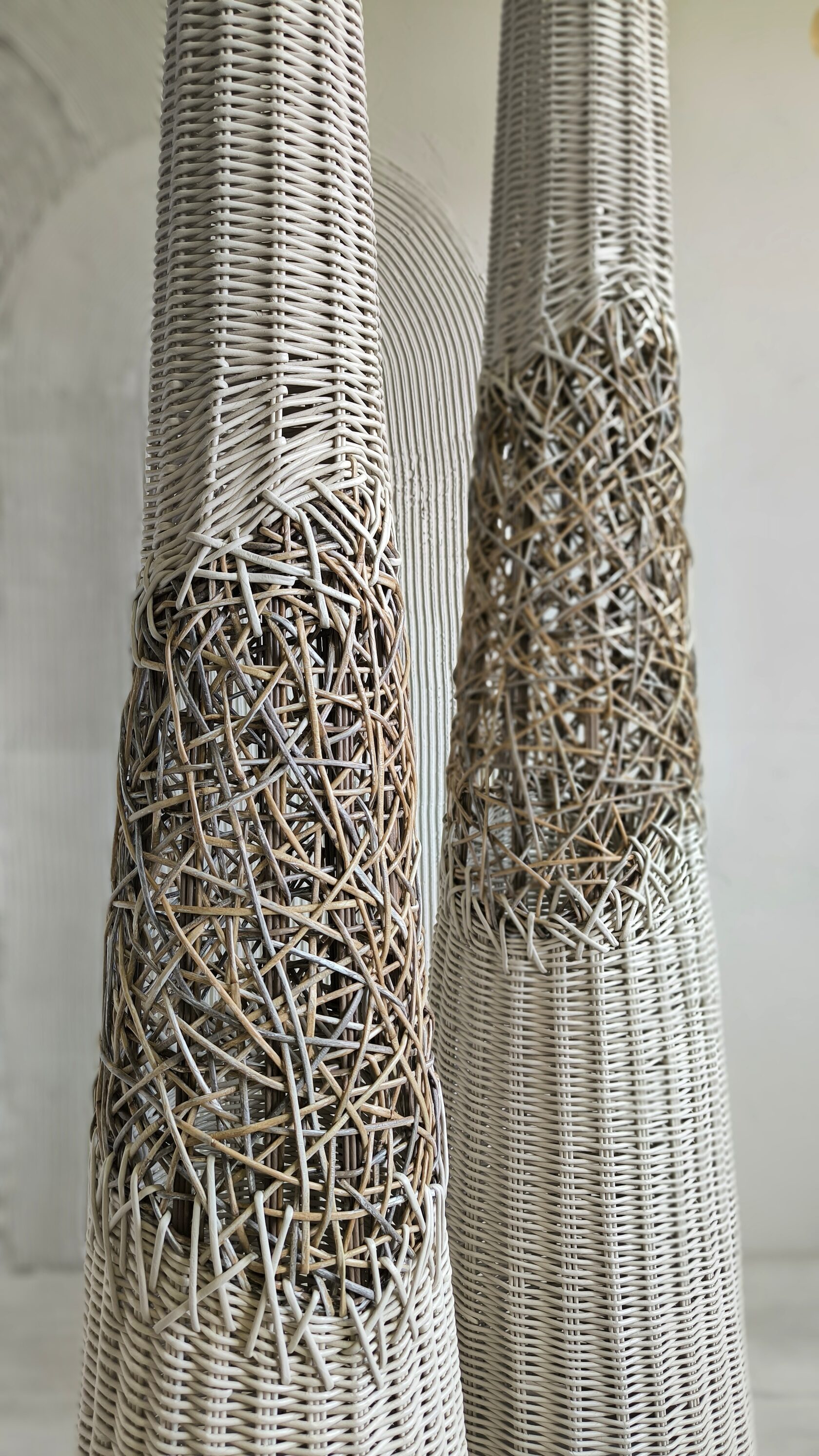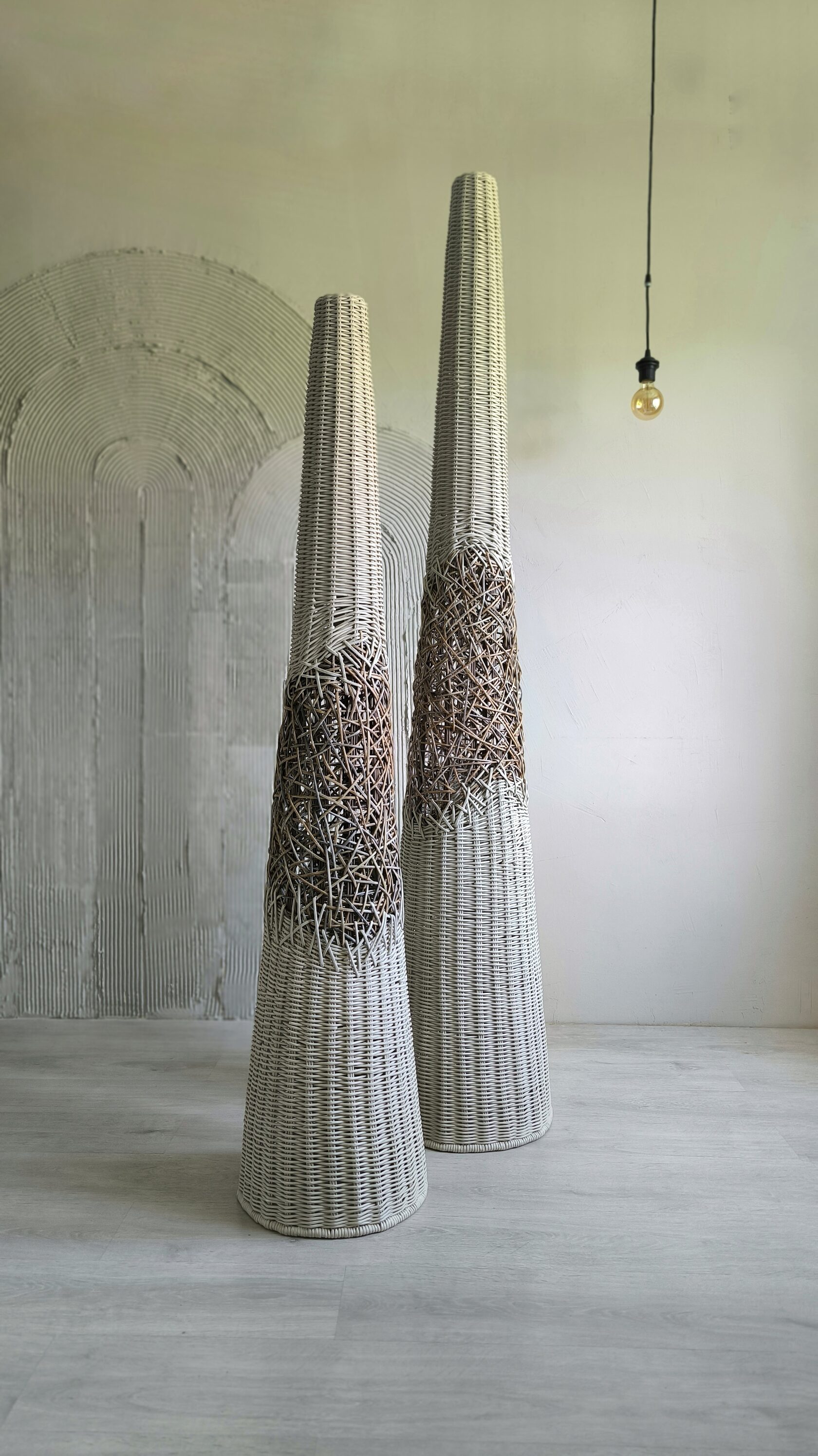 Итог: Торшеры «Ели» — это функциональные и эстетичные объекты высотой 203 и 164 см, выполненные из бумажной лозы, которые штабелируются для удобства хранения, создавая гармонию между светом, природой и дизайном.