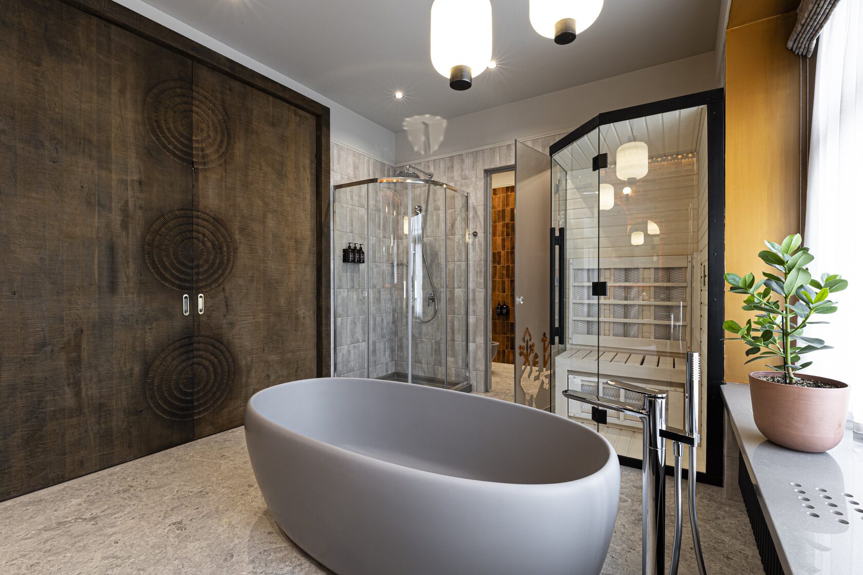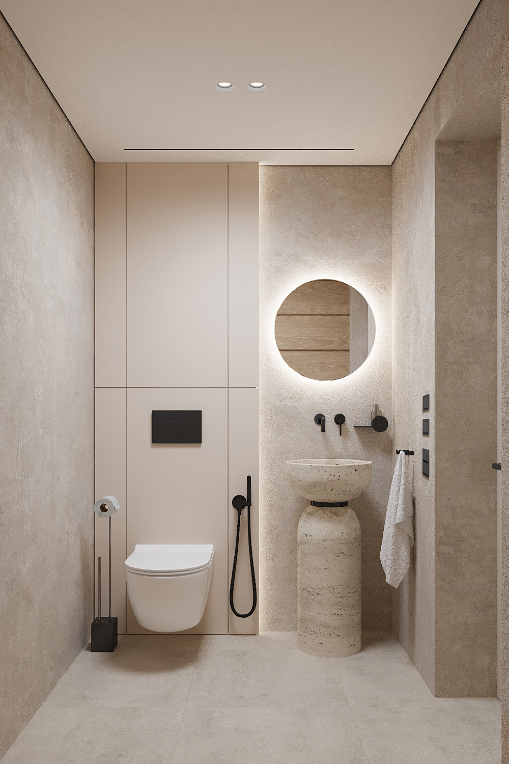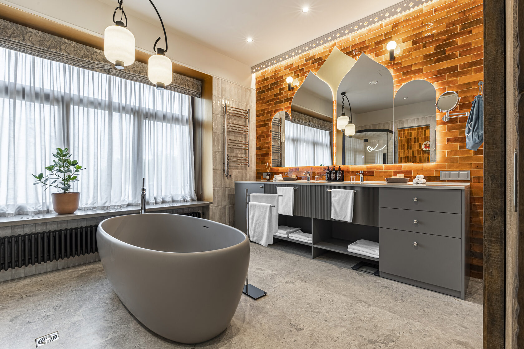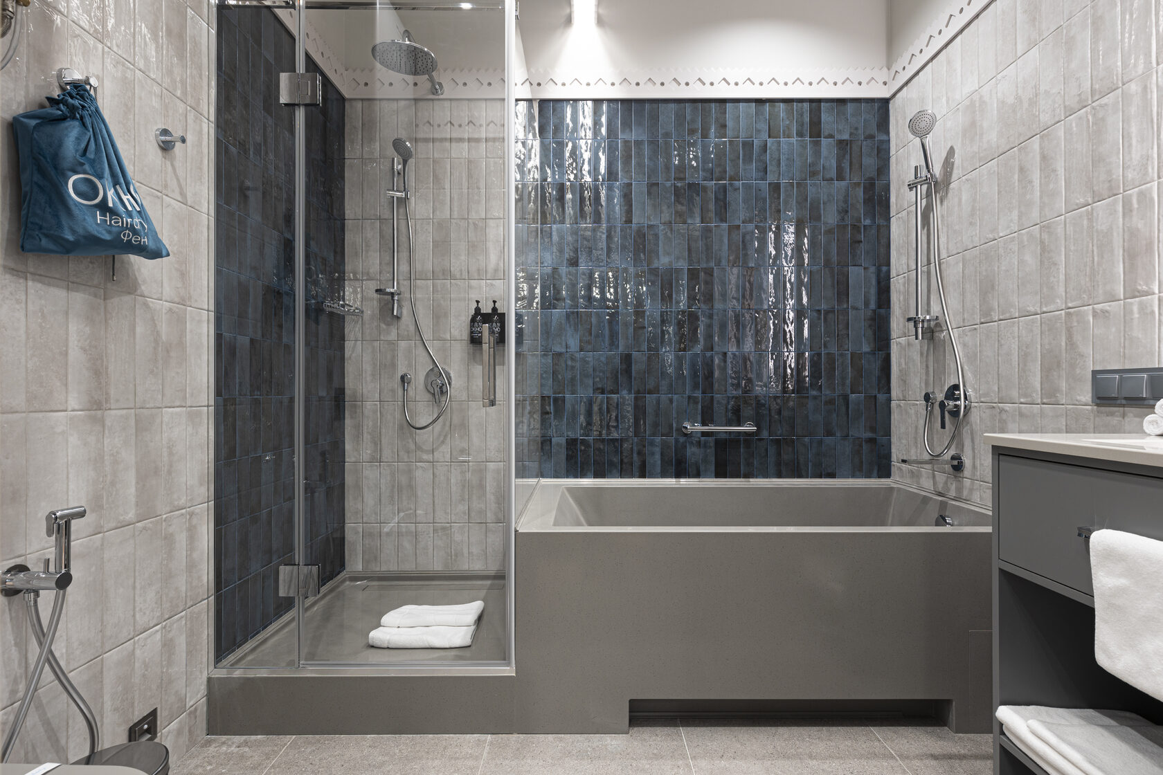 Технологическая новизна проекта заключается в применении материала Solid Surface и разработке модульной системы нового типа. Подобные решения почти не представлены в России, а интеграция формы отдельно стоящей ванны в модуль — была спроектирована впервые.
