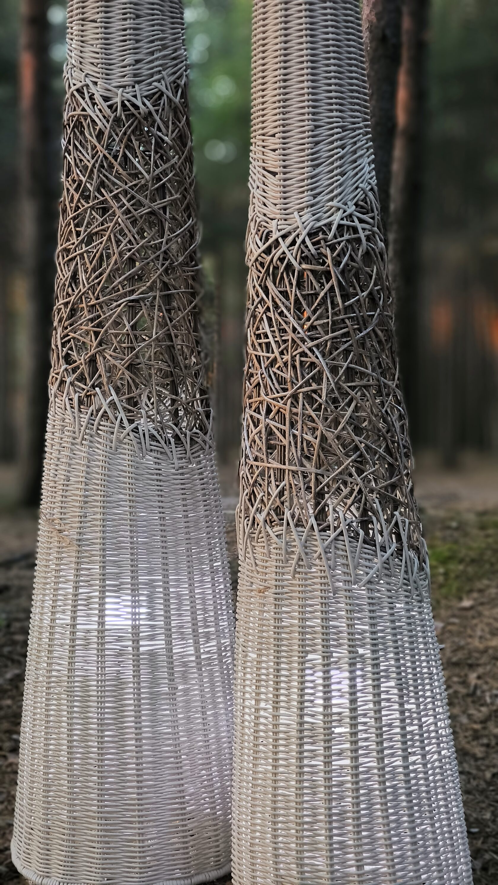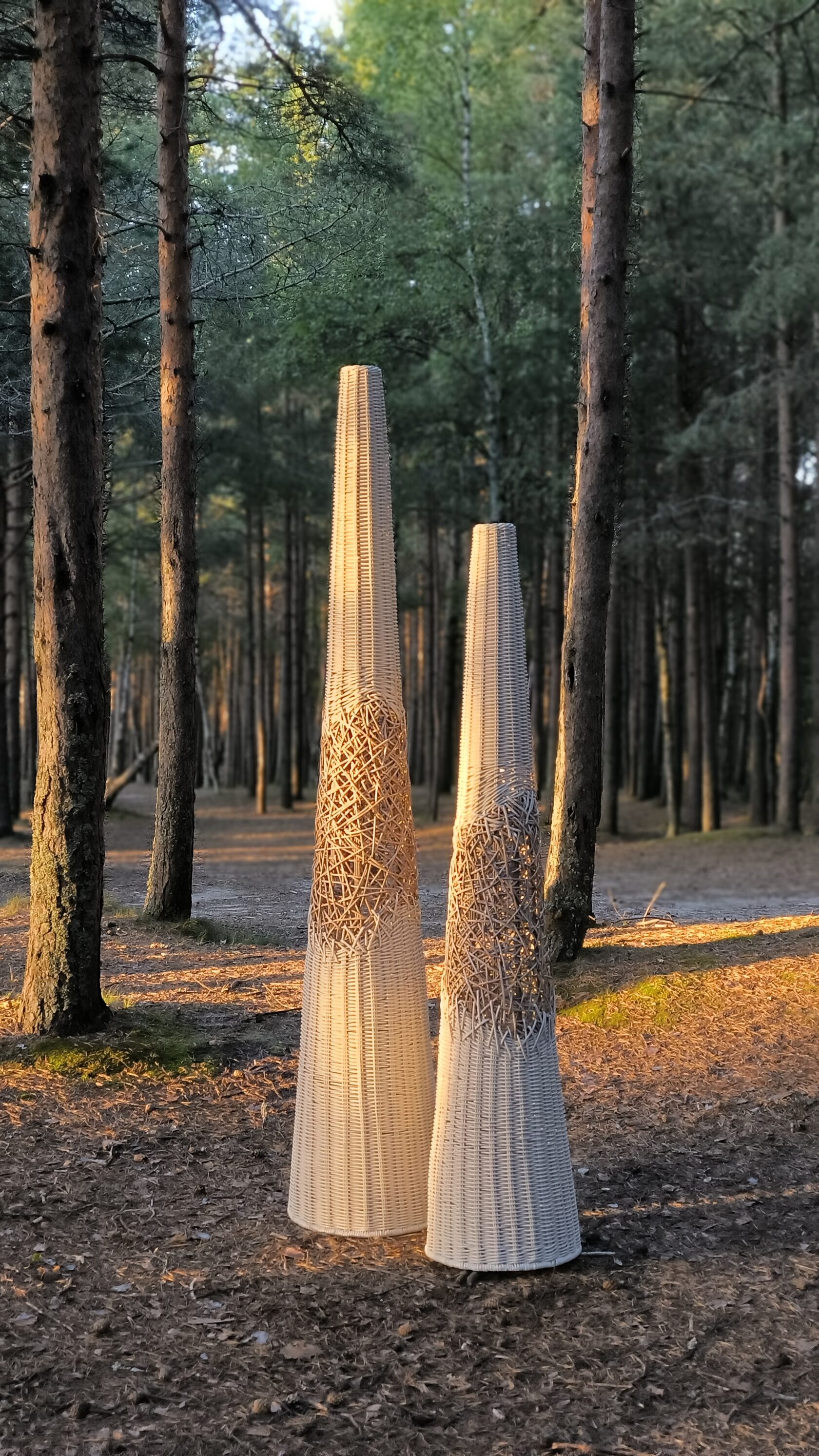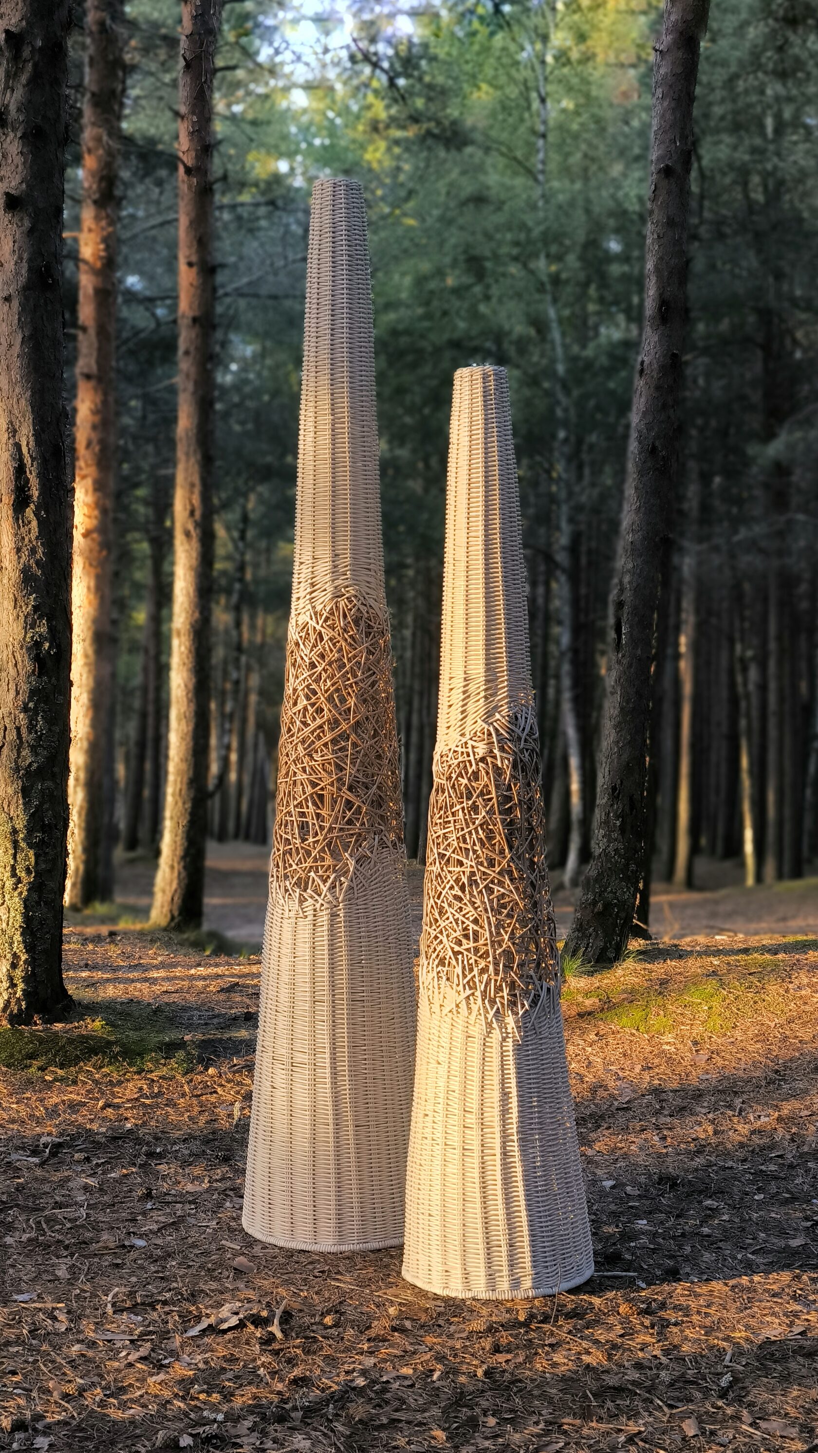 Торшеры «Ели» созданы авторами Валерией Корельской, Татьяной Захаровой и Татьяной Горбуновой специально для выставки Русский дом 2025. Конусообразная форма отсылает к силуэту ели, а структура плетения сочетает упорядоченность, созданную человеком, и хаотичность природы, отражая её живую непредсказуемость. Игра света через плетение создаёт эффект ожившей связи с природой.