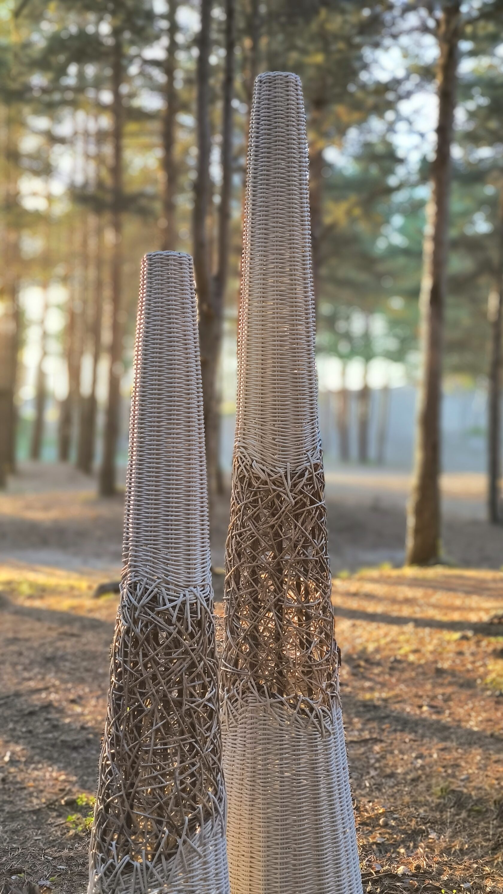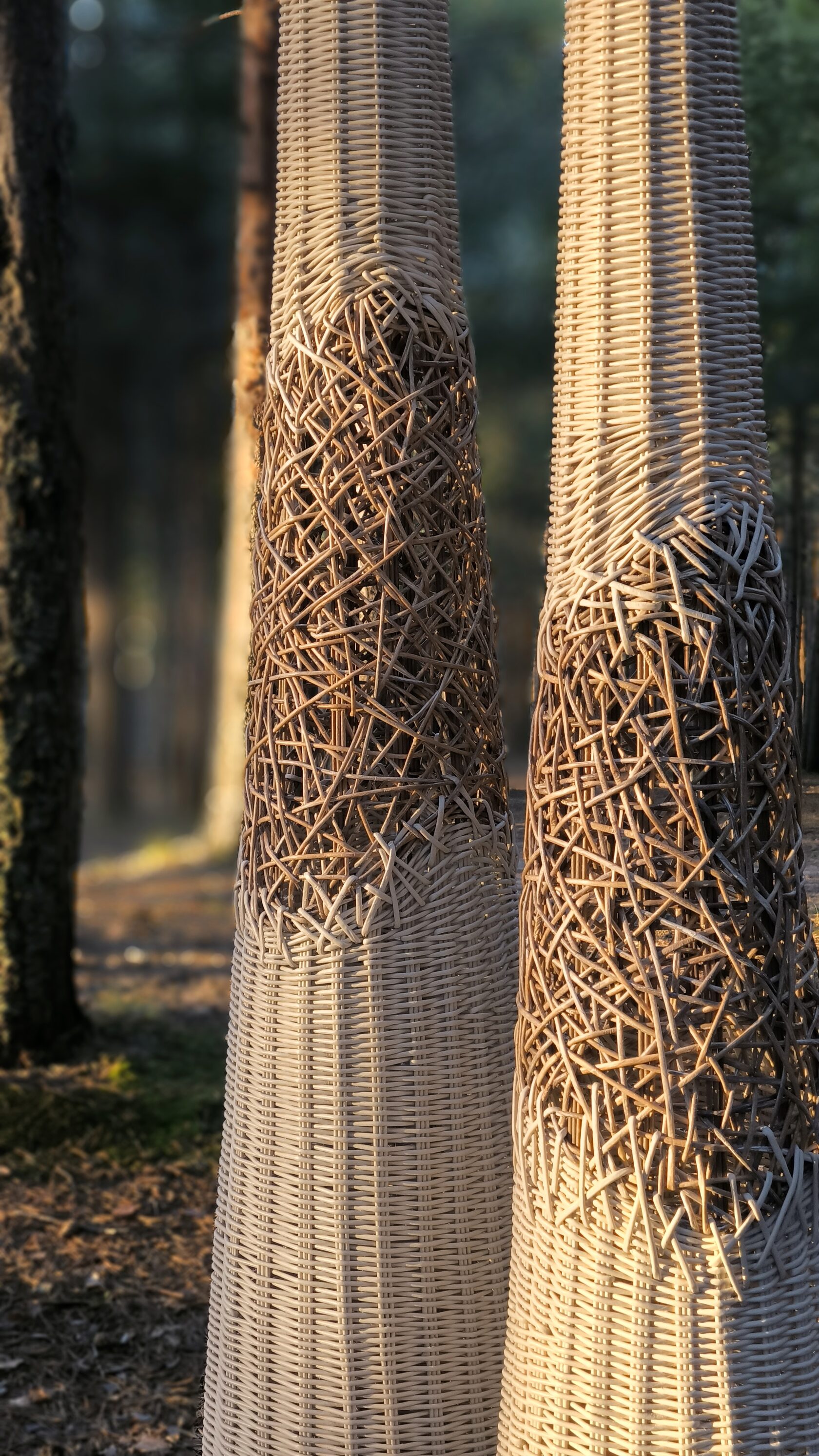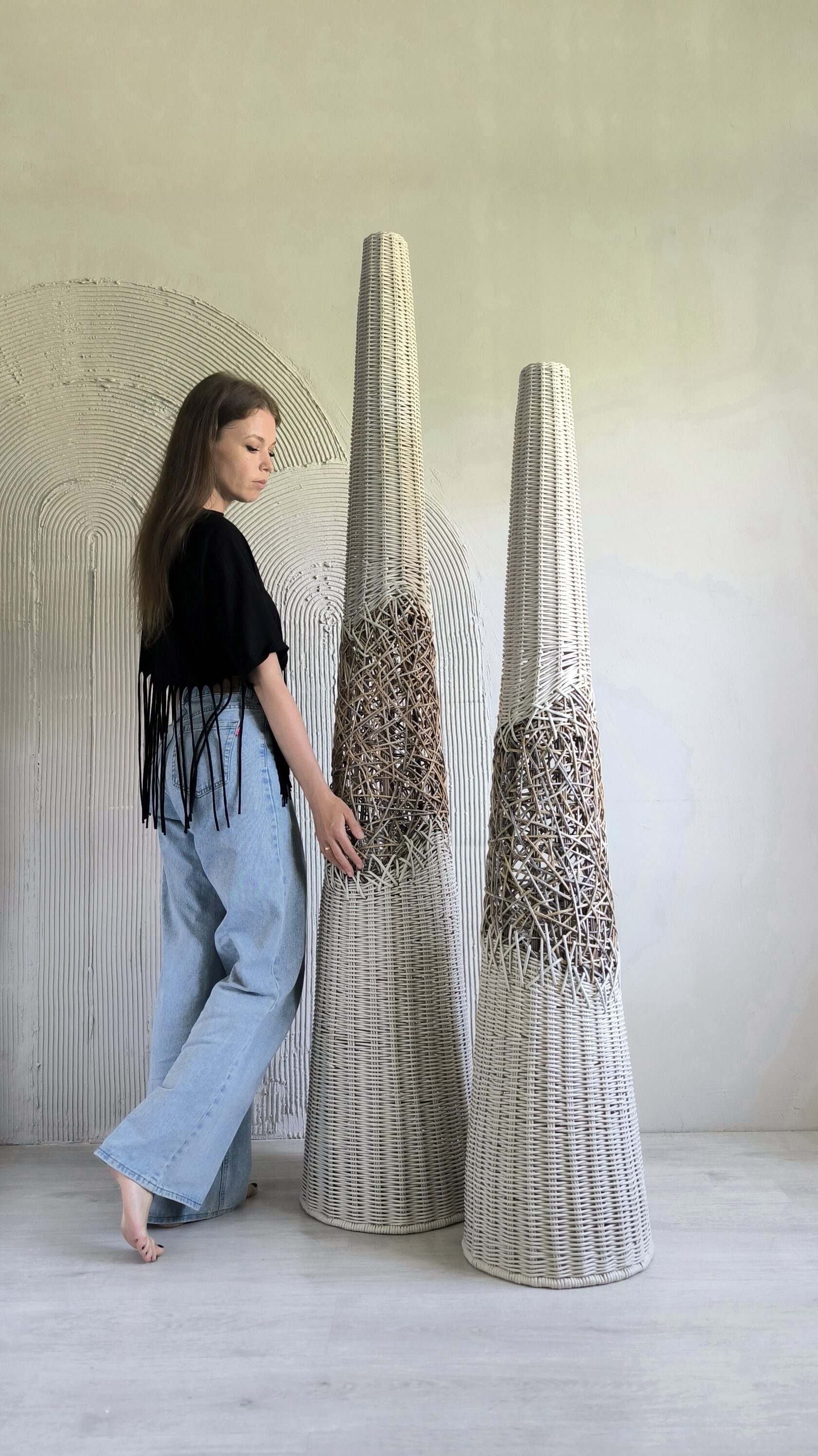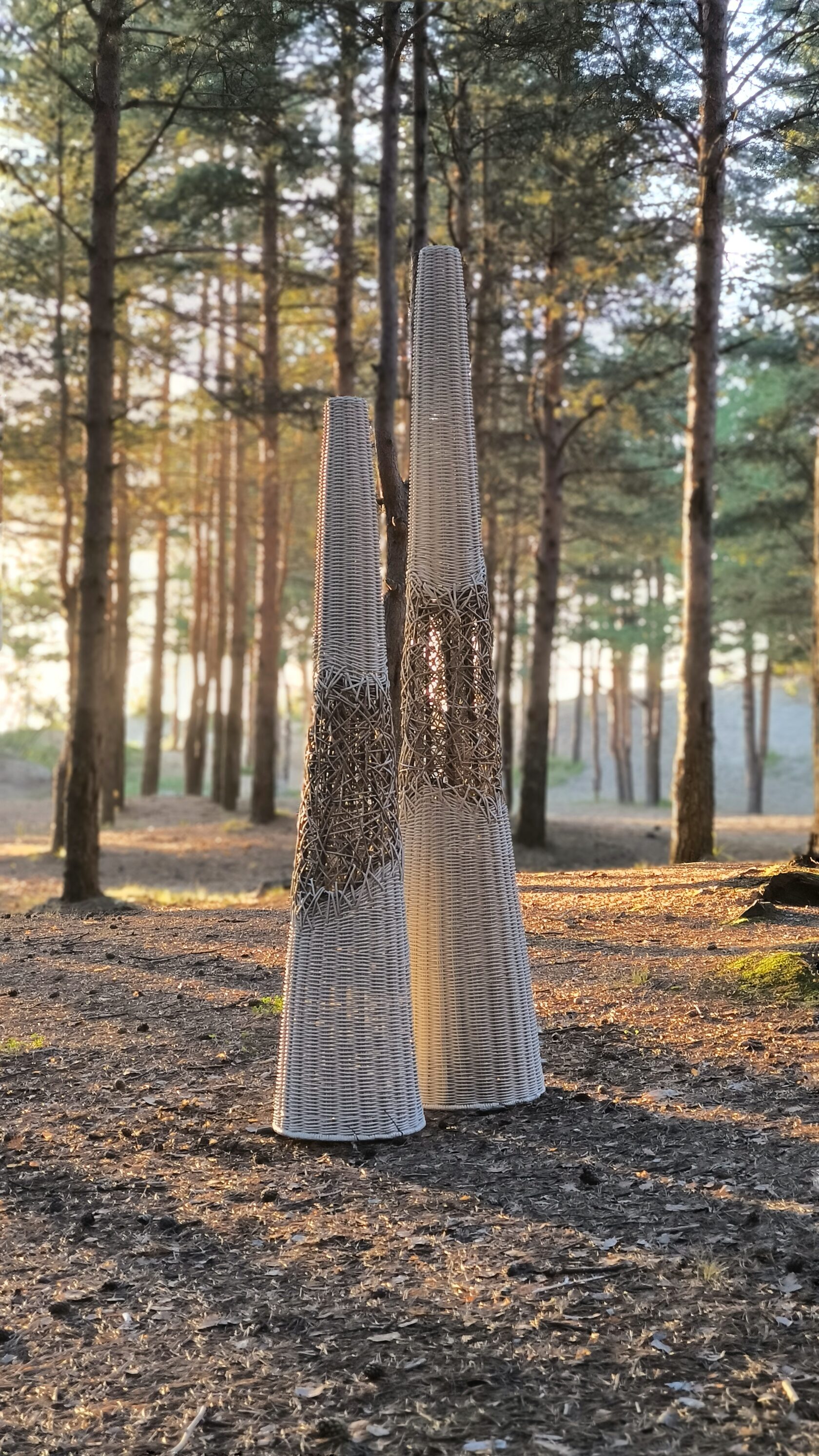 Торшеры «Ели» созданы авторами Валерией Корельской, Татьяной Захаровой и Татьяной Горбуновой специально для выставки Русский дом 2025. Конусообразная форма отсылает к силуэту ели, а структура плетения сочетает упорядоченность, созданную человеком, и хаотичность природы, отражая её живую непредсказуемость. Игра света через плетение создаёт эффект ожившей связи с природой.