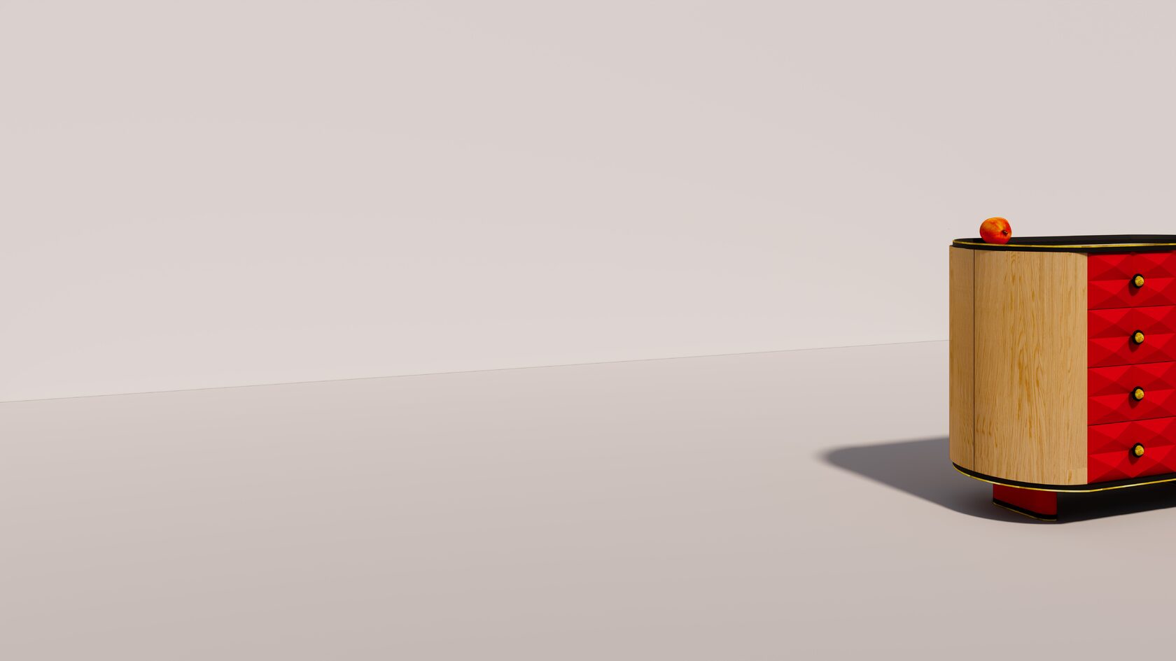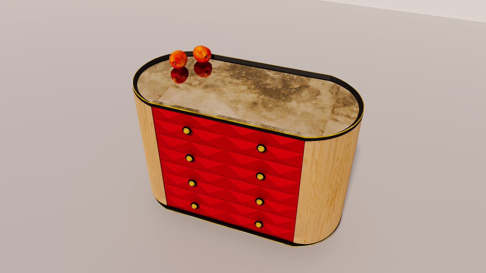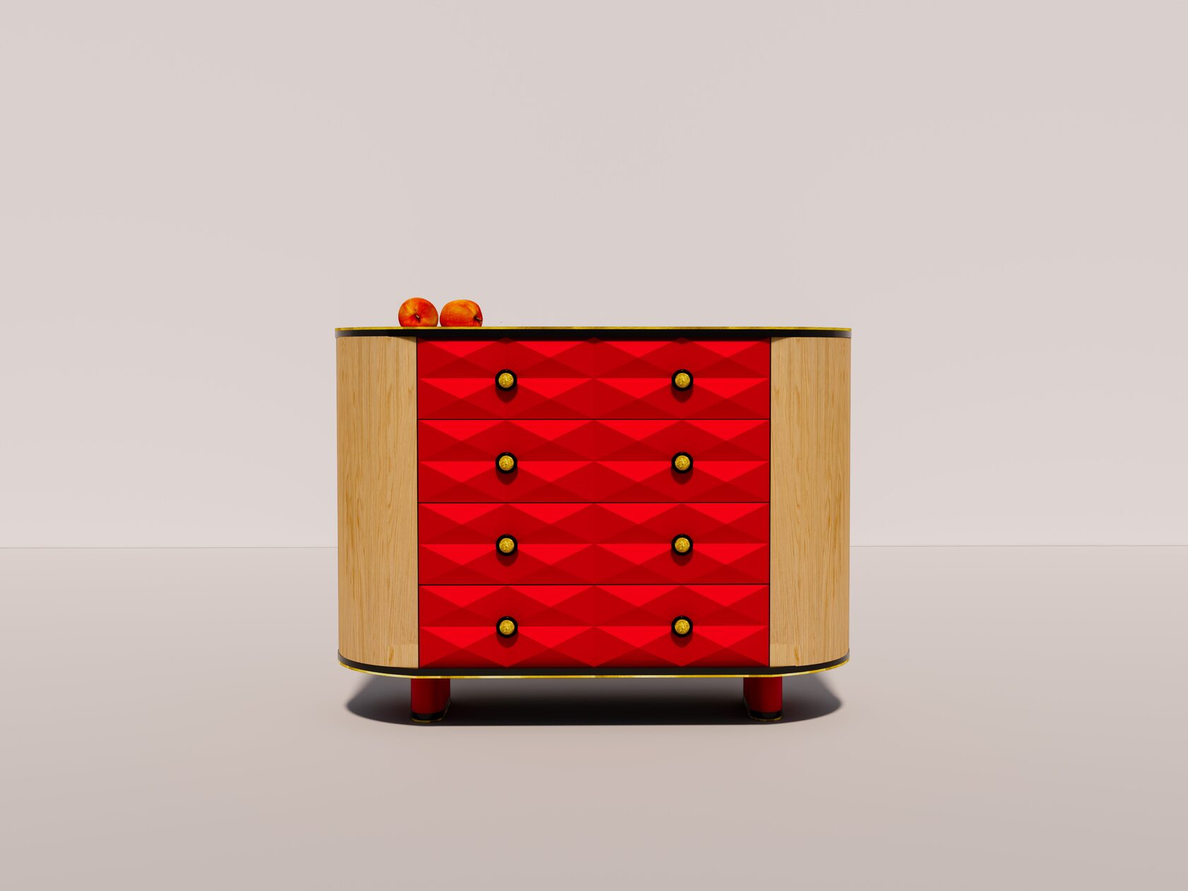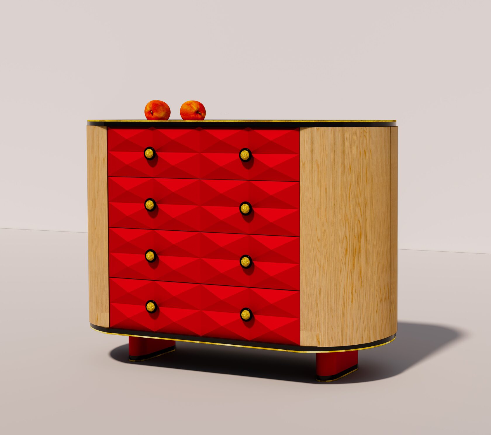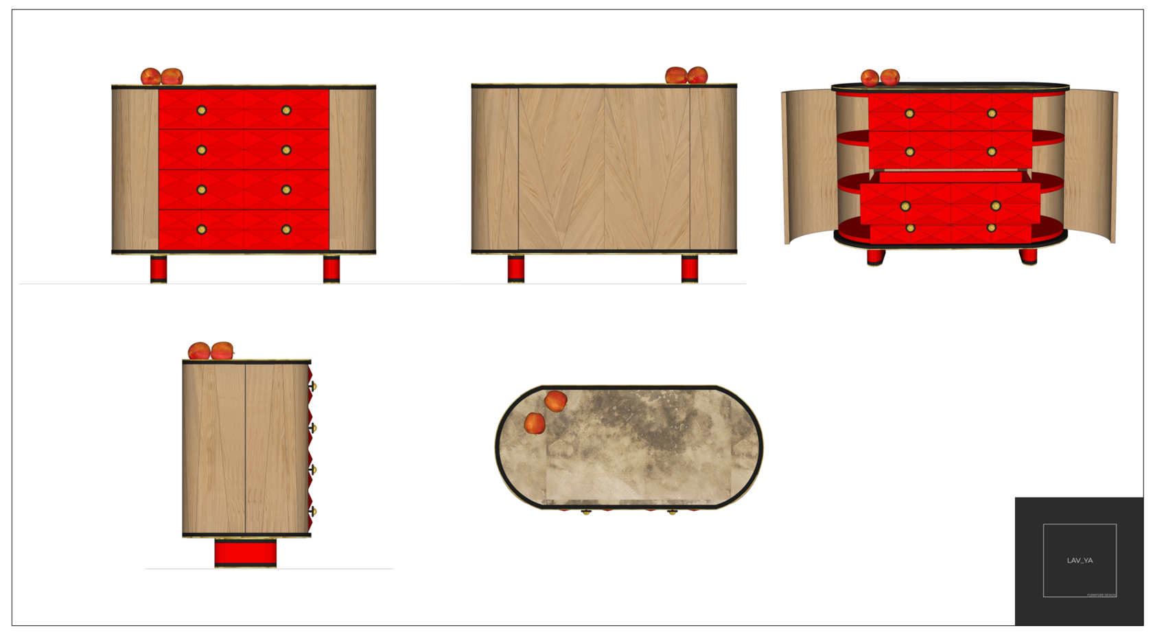 Концепция: Основная идея проекта — создание гармоничного синтеза русского фольклора и современного дизайна. Комод вдохновлен образом 'блюдечка с золотой каёмочкой', символизирующего щедрость и драгоценность преподношения. Элементы дизайна детально проработаны: столешница задумана как 'магическое зеркало', теплый деревянный корпус оберегает содержимое, подобно 'бережной ладони'. Алые фасады-ромбы напоминают 'самоцветы царского ларца', золотые ручки-яблочки приглашают к прикосновению, а ножки в полоску, отсылающие к нарядным русским сапогам, завершают этот уникальный сказочный образ, уверенно интегрируя его в современный интерьер. Проект воплощает историю о волшебстве, живущем в повседневных вещах, и традициях гостеприимства.