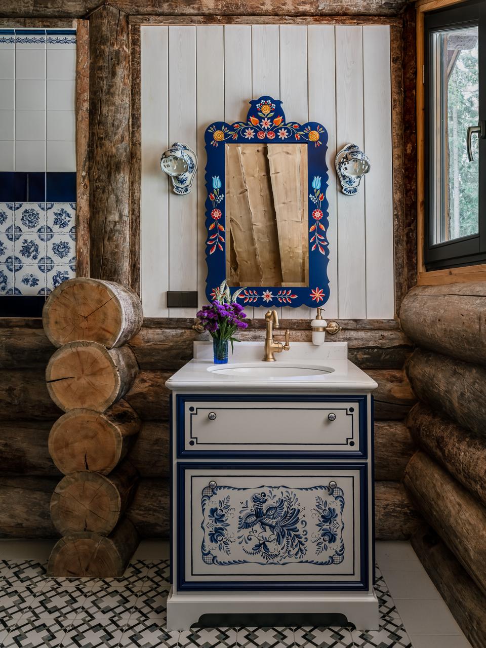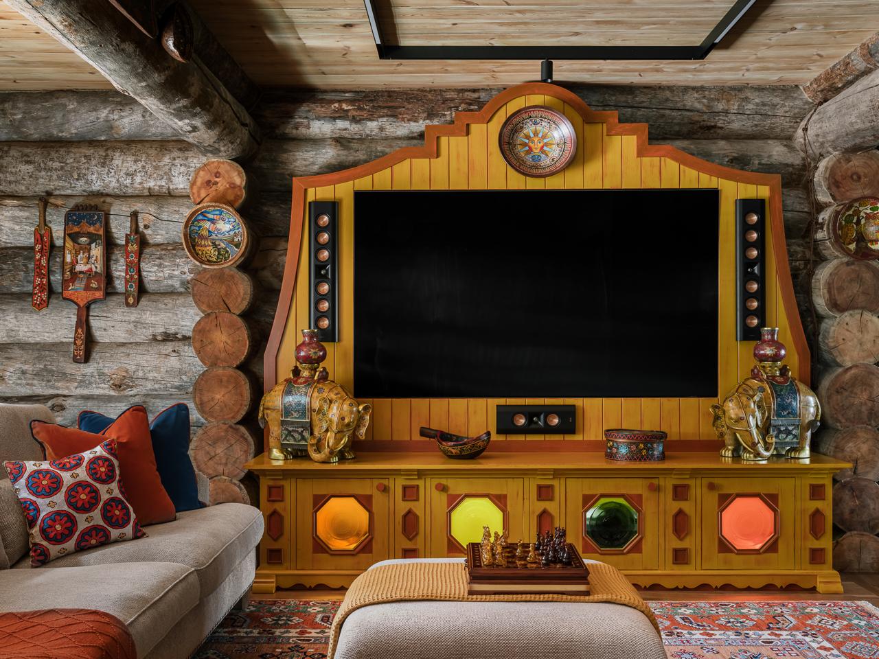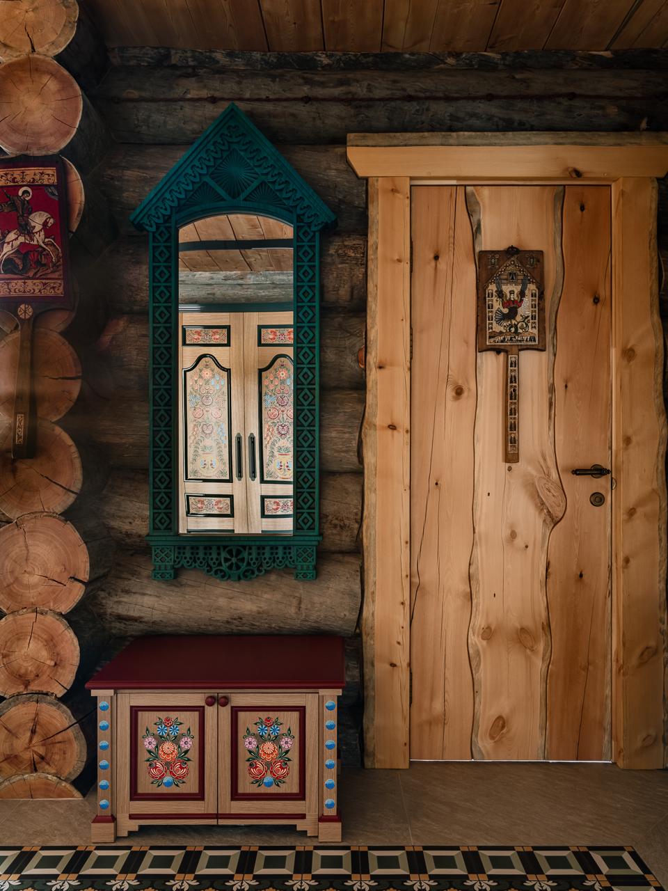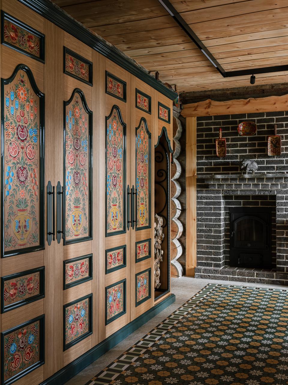 В проекте были задействованы исключительно индивидуальные разработки: вся мебель, столярные изделия, двери, плитка для санузлов и светильники с цветным стеклом выполнены по авторским эскизам. Особую роль сыграла ручная роспись мебели, которую выполнили художники из России. Обивки и текстильные панели для стен также созданы по индивидуальным макетам, что позволило наполнить дом атмосферой подлинности и традиционного русского духа.