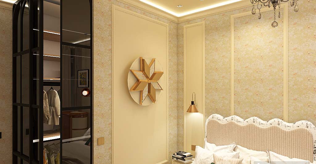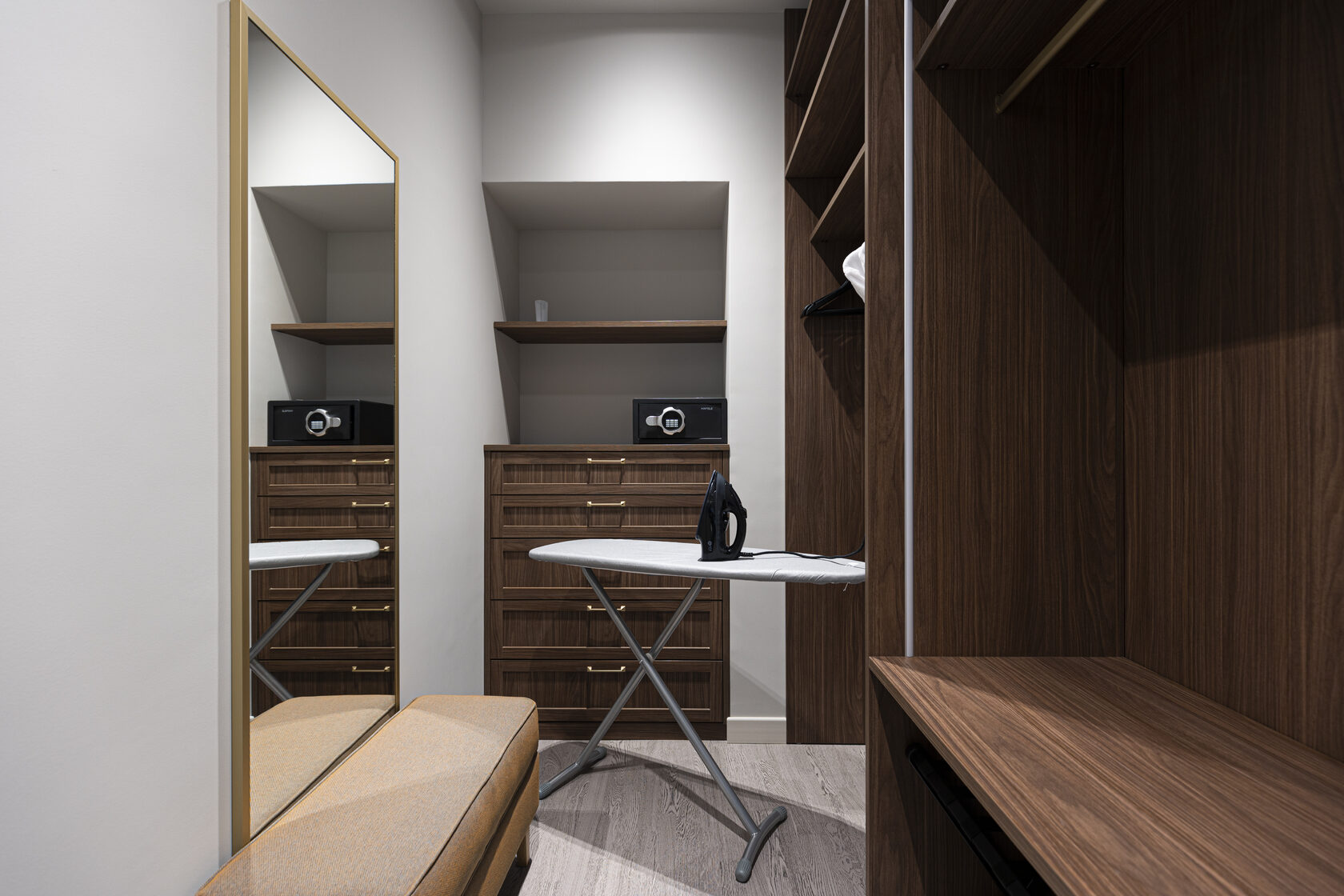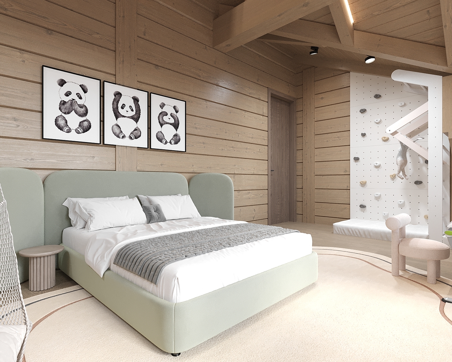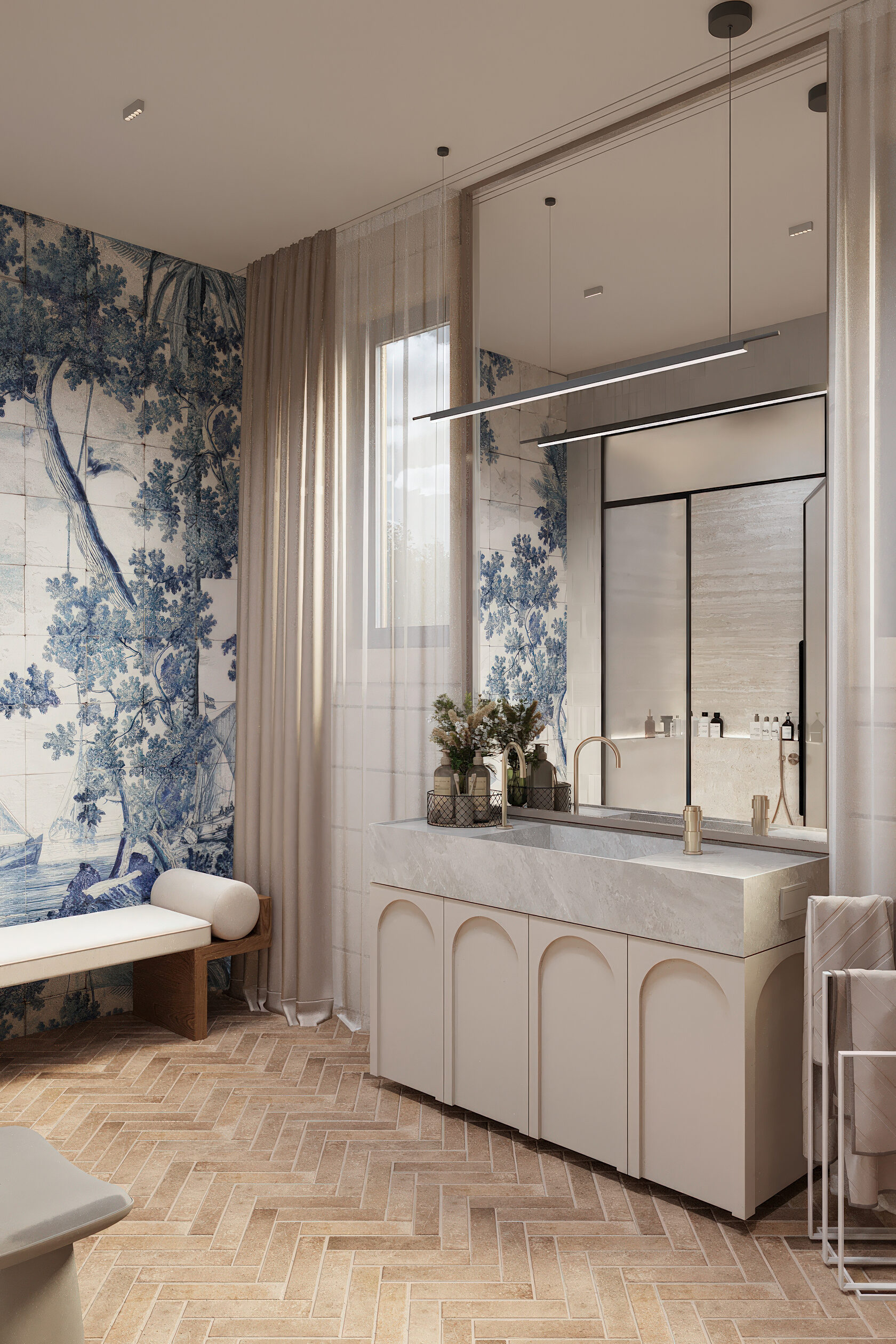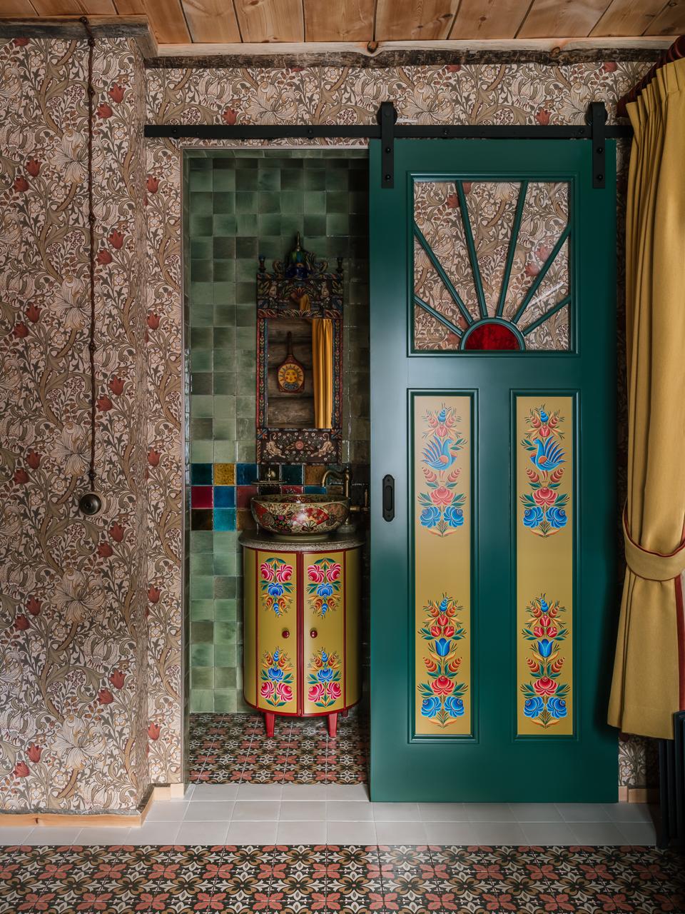 В проекте были задействованы исключительно индивидуальные разработки: вся мебель, столярные изделия, двери, плитка для санузлов и светильники с цветным стеклом выполнены по авторским эскизам. Особую роль сыграла ручная роспись мебели, которую выполнили художники из России. Обивки и текстильные панели для стен также созданы по индивидуальным макетам, что позволило наполнить дом атмосферой подлинности и традиционного русского духа.