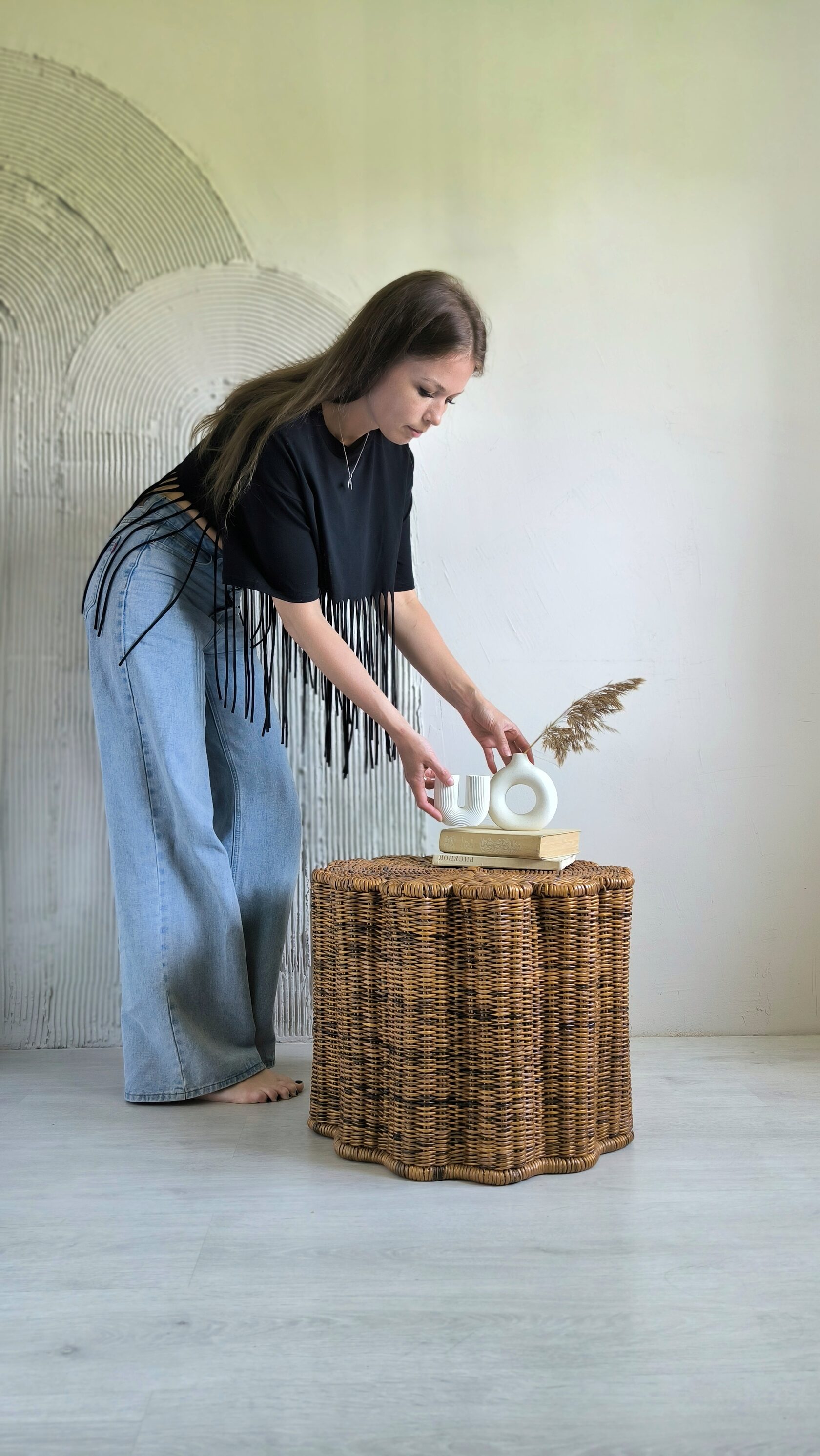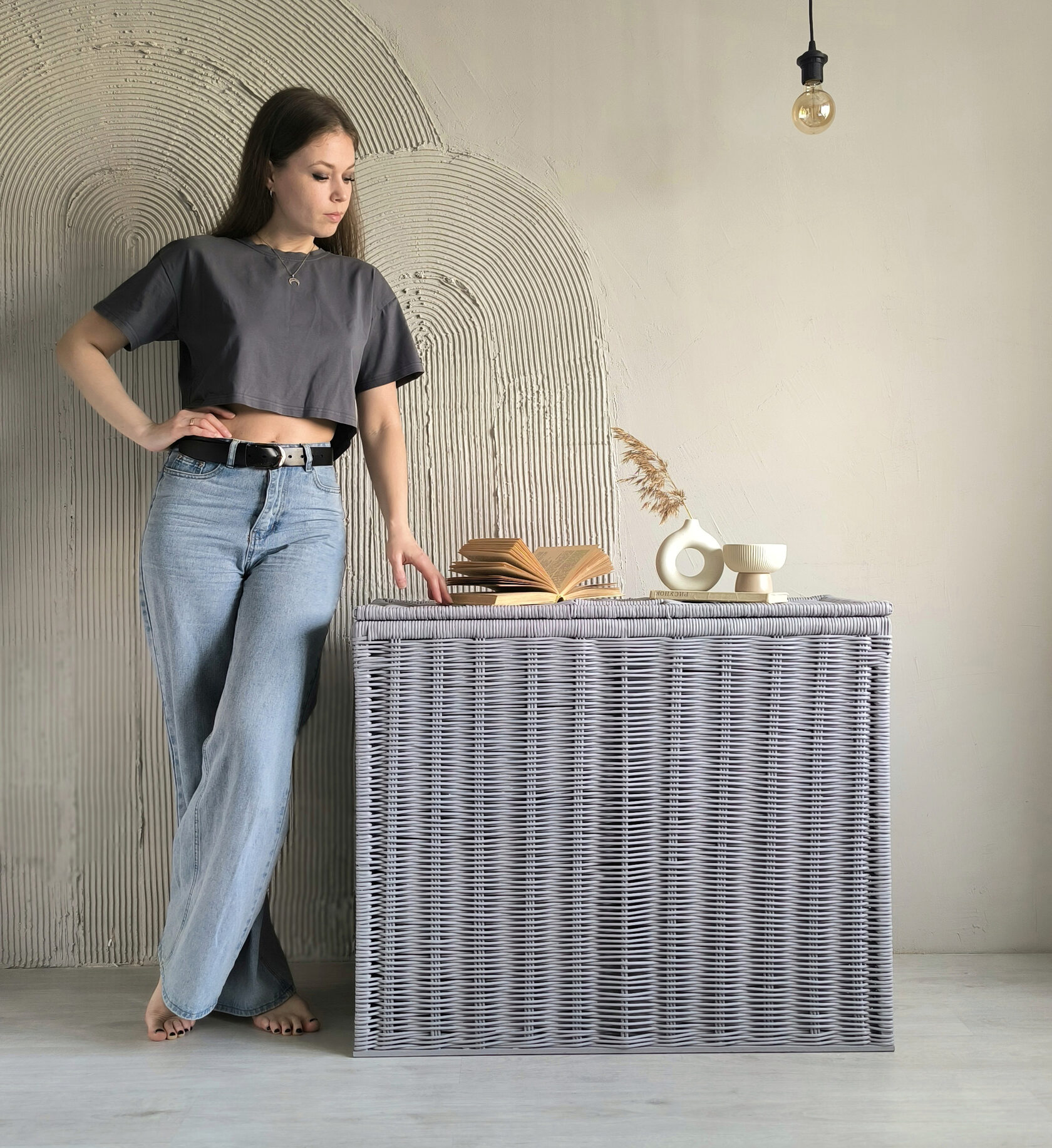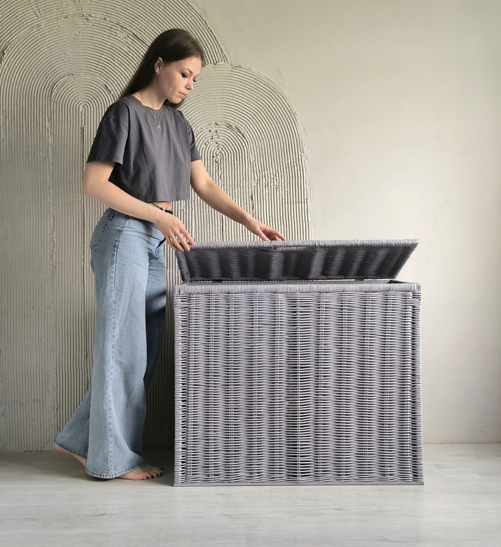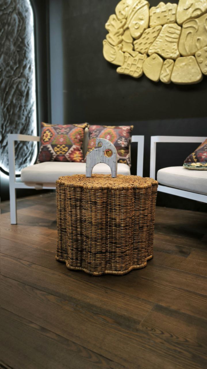 Автор трансформировал классический сундук, сохранив его суть, но адаптировав к современным интерьерам. Исчезла массивность — появились четкие линии и легкость. Плетеная фактура из бумажной лозы напоминает о традиционных техниках, придавая теплоту минималистичной форме.