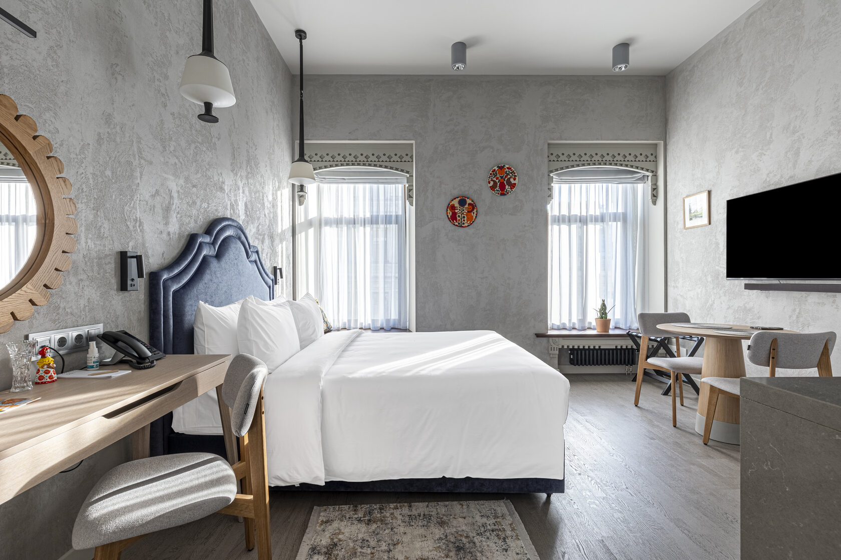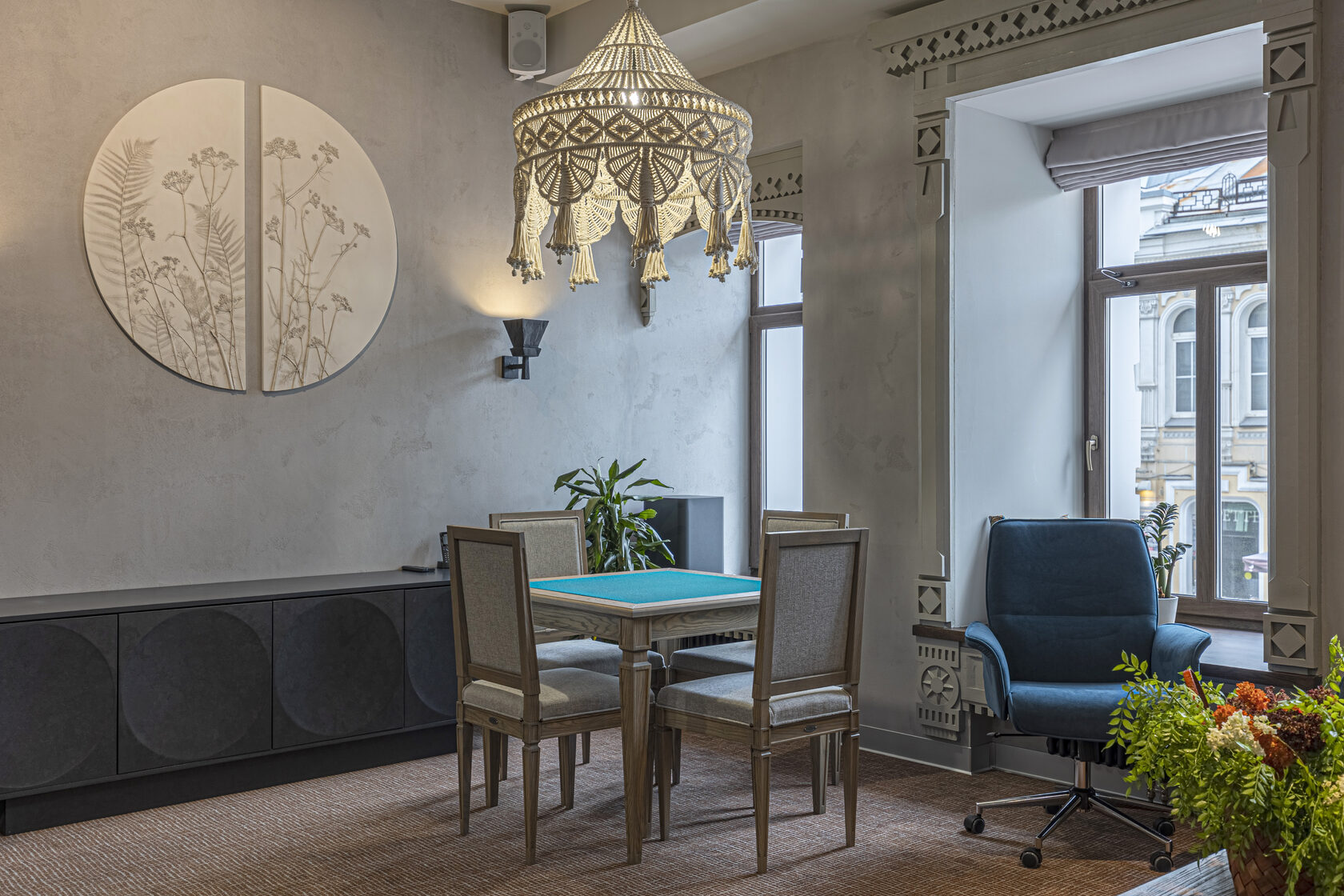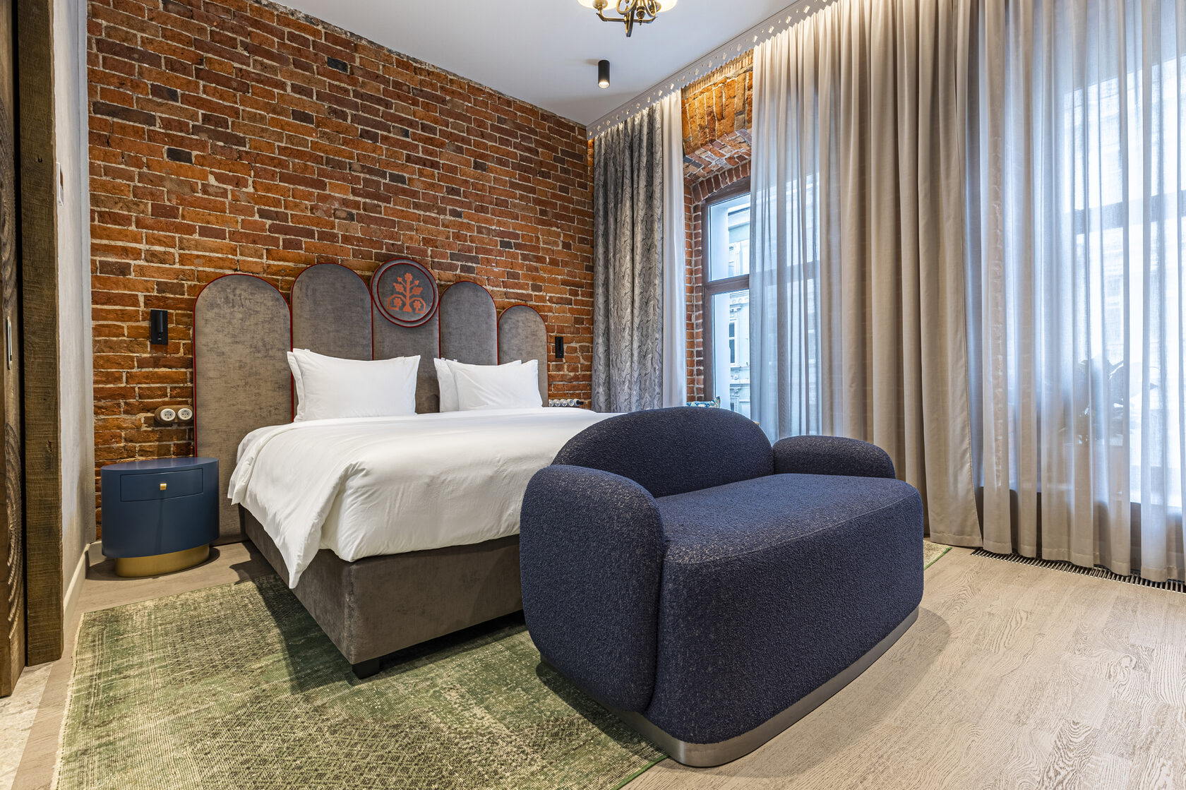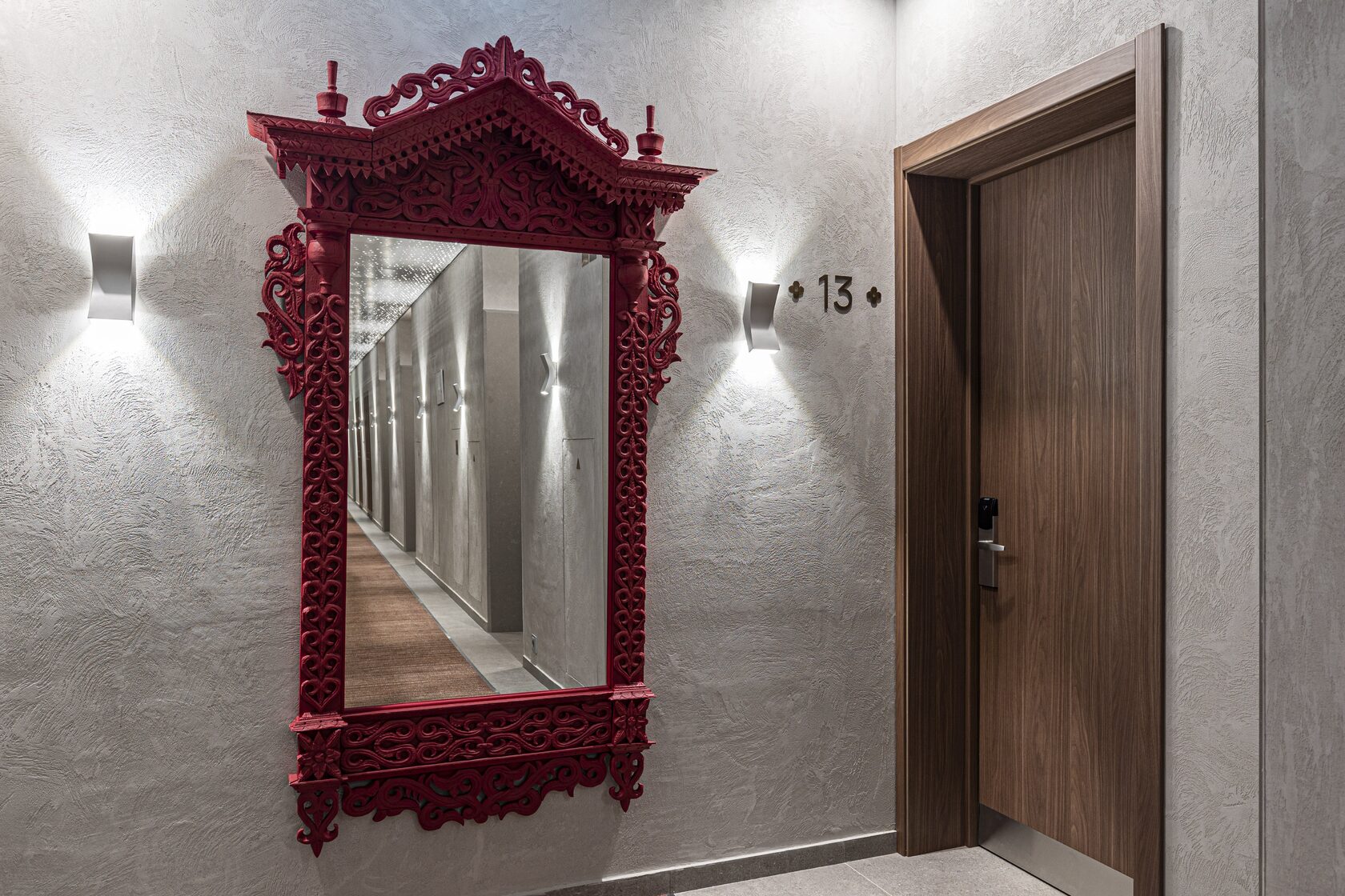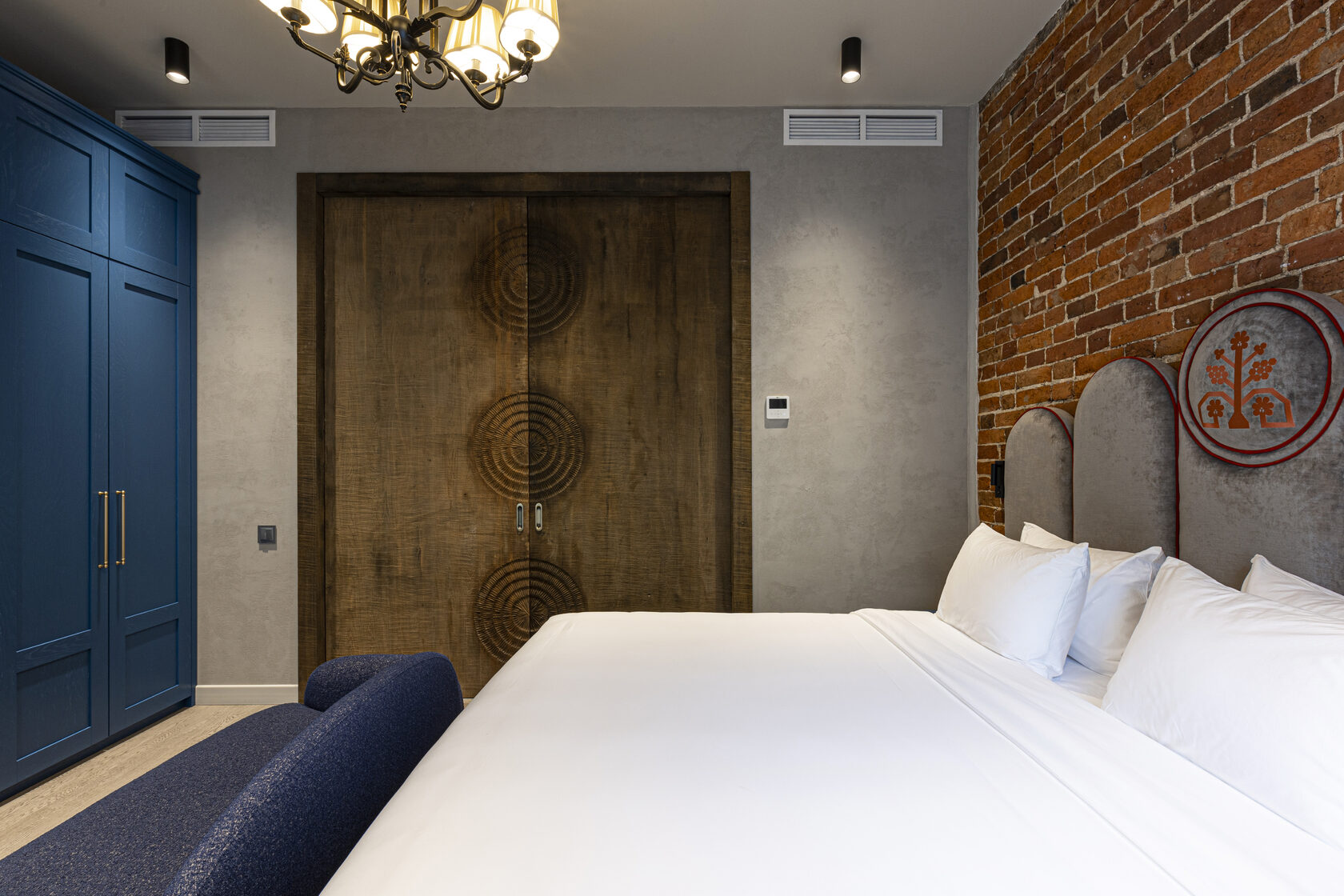 Концепция: Основная идея проекта заключается в создании 'окна в современную Россию' через гармоничное сочетание традиций и новаторства. Интерьеры отеля искусно вплетают культурный код страны во все аспекты дизайна: от отделки стен до тщательно подобранной мебели, светильников и текстиля. Каждый из двадцати одного номера, распределенного по восьми категориям, назван в честь знаменитых русских народных промыслов (Дымково, Касли, Жостово и др.), что подчеркивает уникальную идентичность и богатство русской культуры.