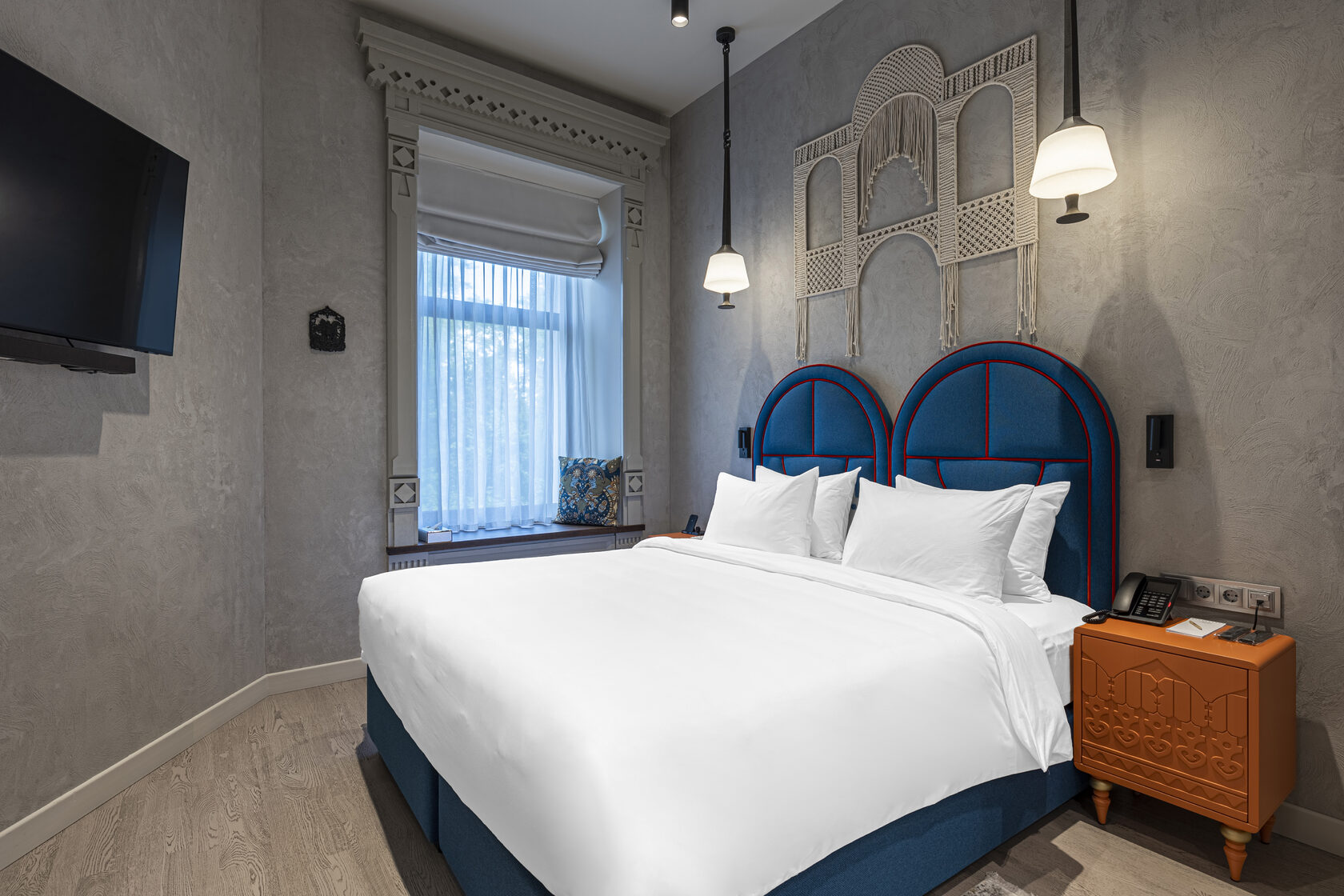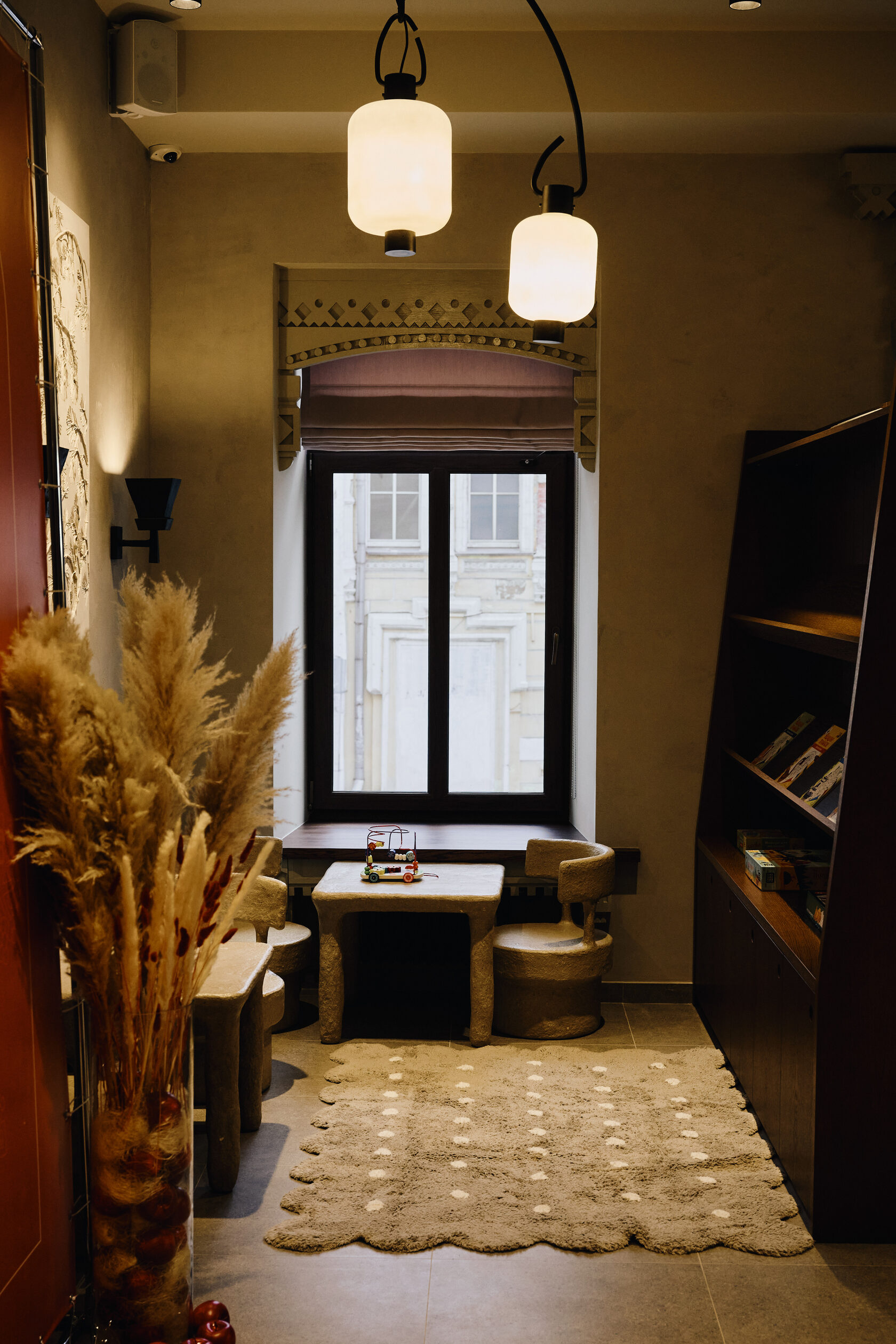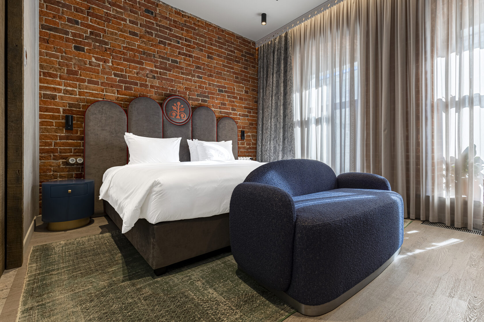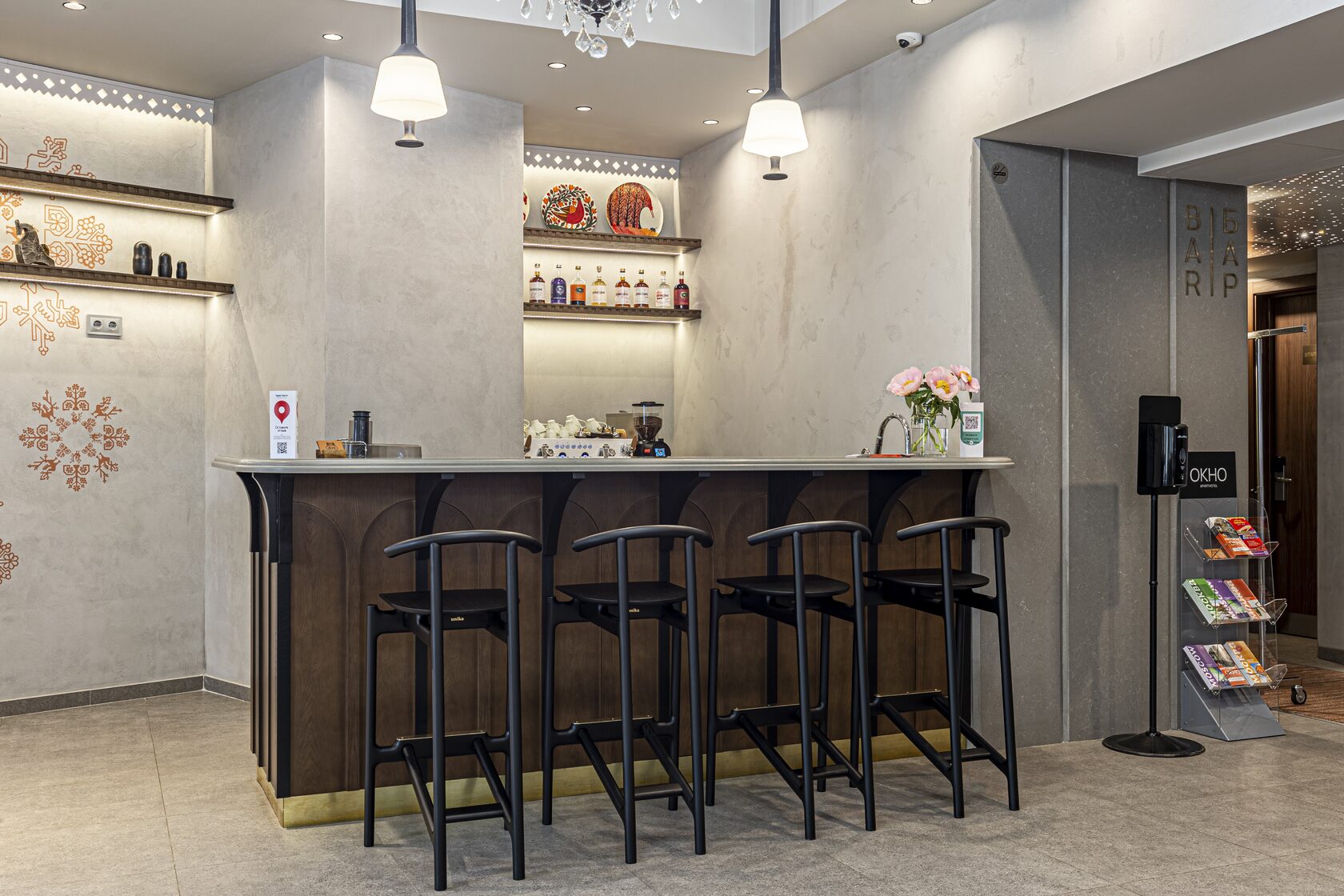 Концепция: Основная идея проекта заключается в создании 'окна в современную Россию' через гармоничное сочетание традиций и новаторства. Интерьеры отеля искусно вплетают культурный код страны во все аспекты дизайна: от отделки стен до тщательно подобранной мебели, светильников и текстиля. Каждый из двадцати одного номера, распределенного по восьми категориям, назван в честь знаменитых русских народных промыслов (Дымково, Касли, Жостово и др.), что подчеркивает уникальную идентичность и богатство русской культуры.