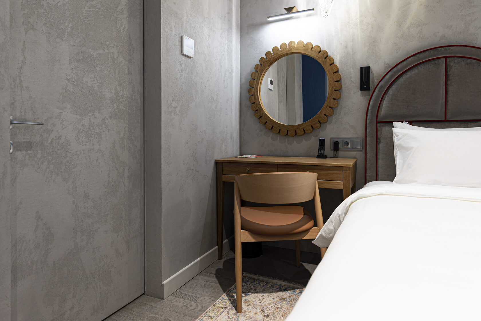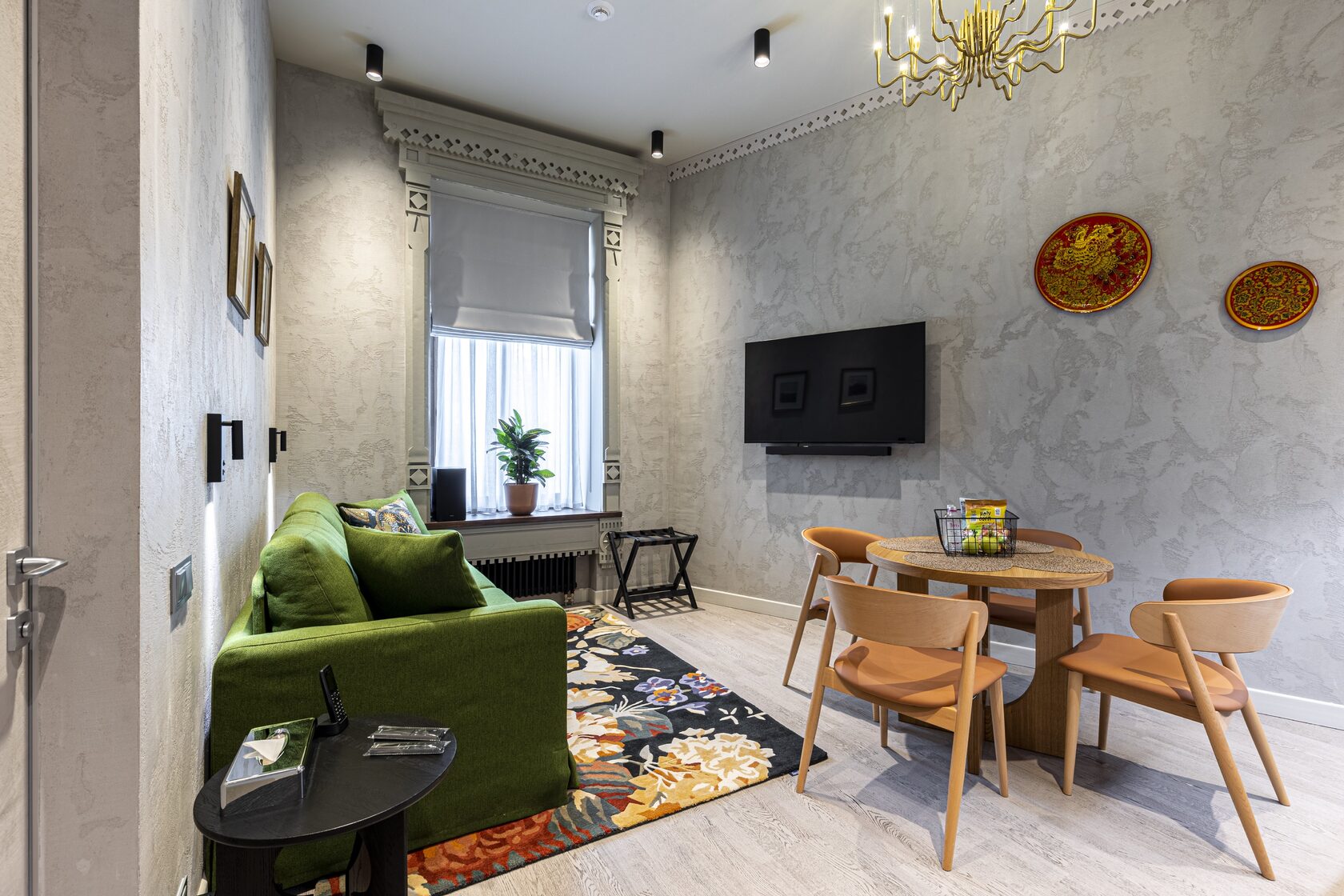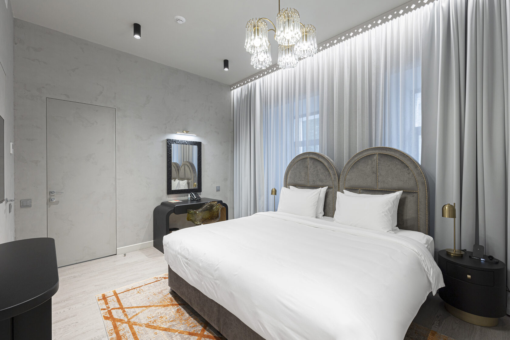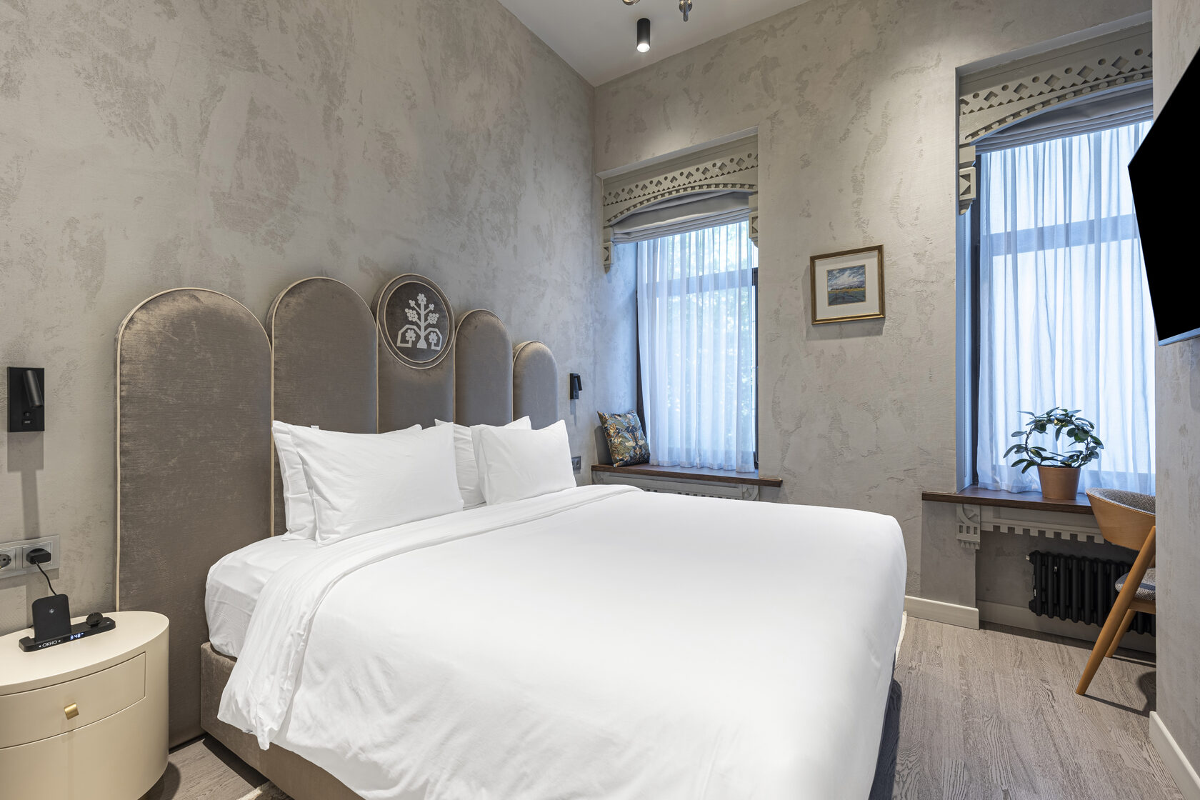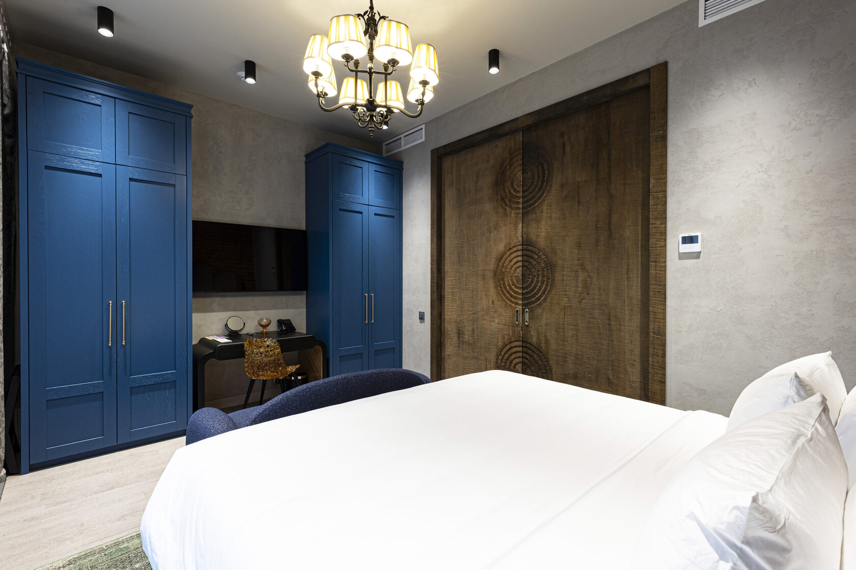 Концепция: Основная идея проекта заключается в создании 'окна в современную Россию' через гармоничное сочетание традиций и новаторства. Интерьеры отеля искусно вплетают культурный код страны во все аспекты дизайна: от отделки стен до тщательно подобранной мебели, светильников и текстиля. Каждый из двадцати одного номера, распределенного по восьми категориям, назван в честь знаменитых русских народных промыслов (Дымково, Касли, Жостово и др.), что подчеркивает уникальную идентичность и богатство русской культуры.