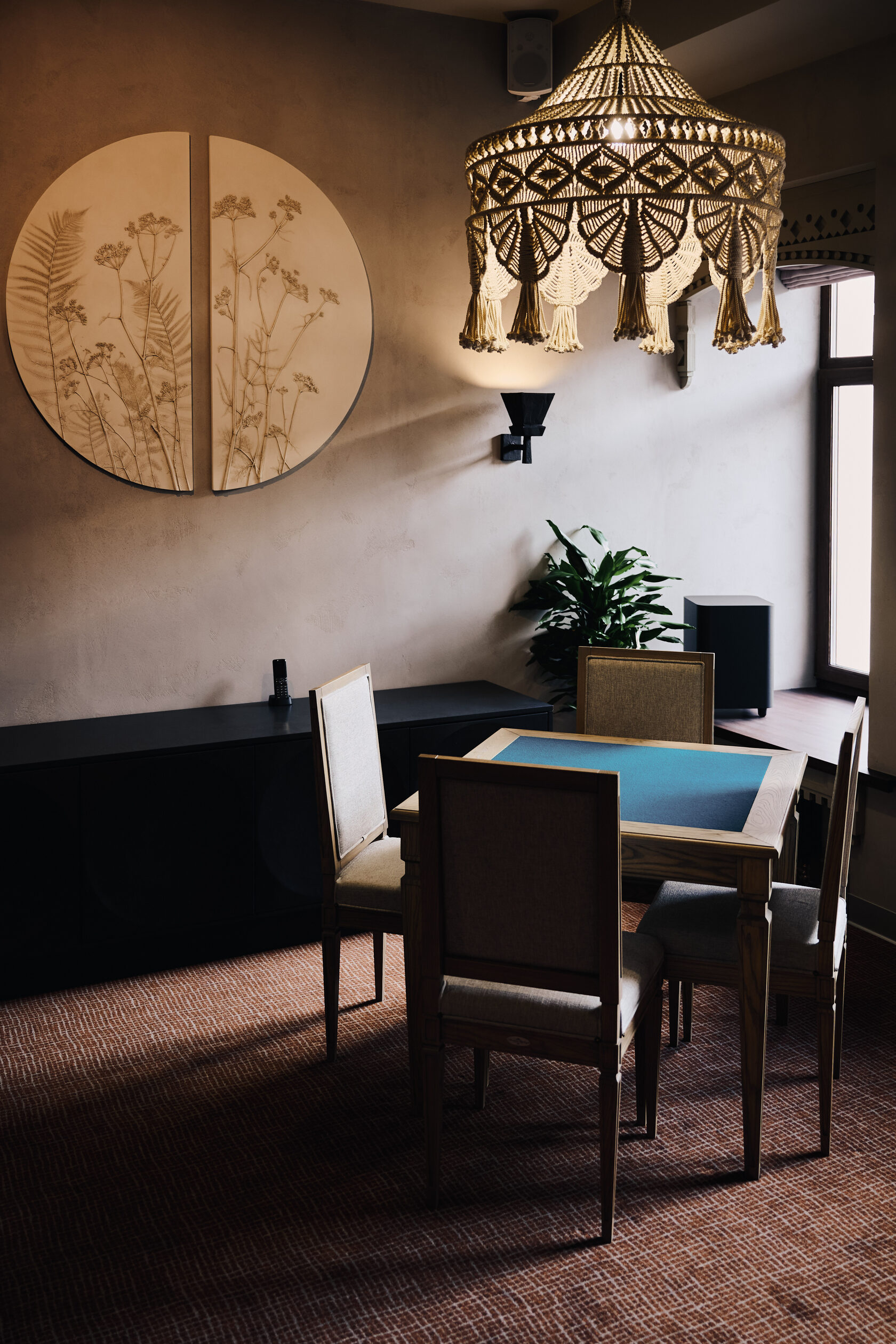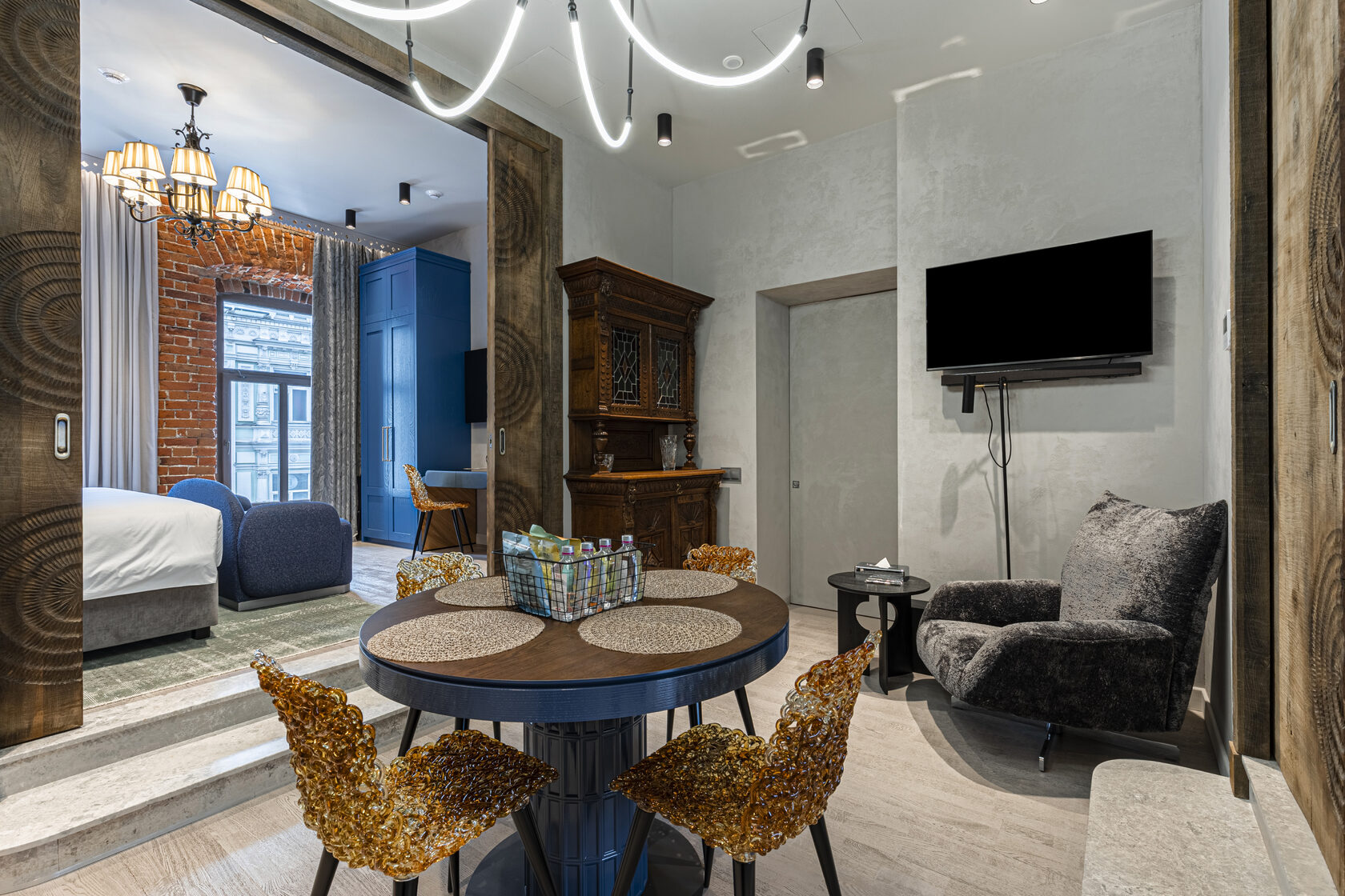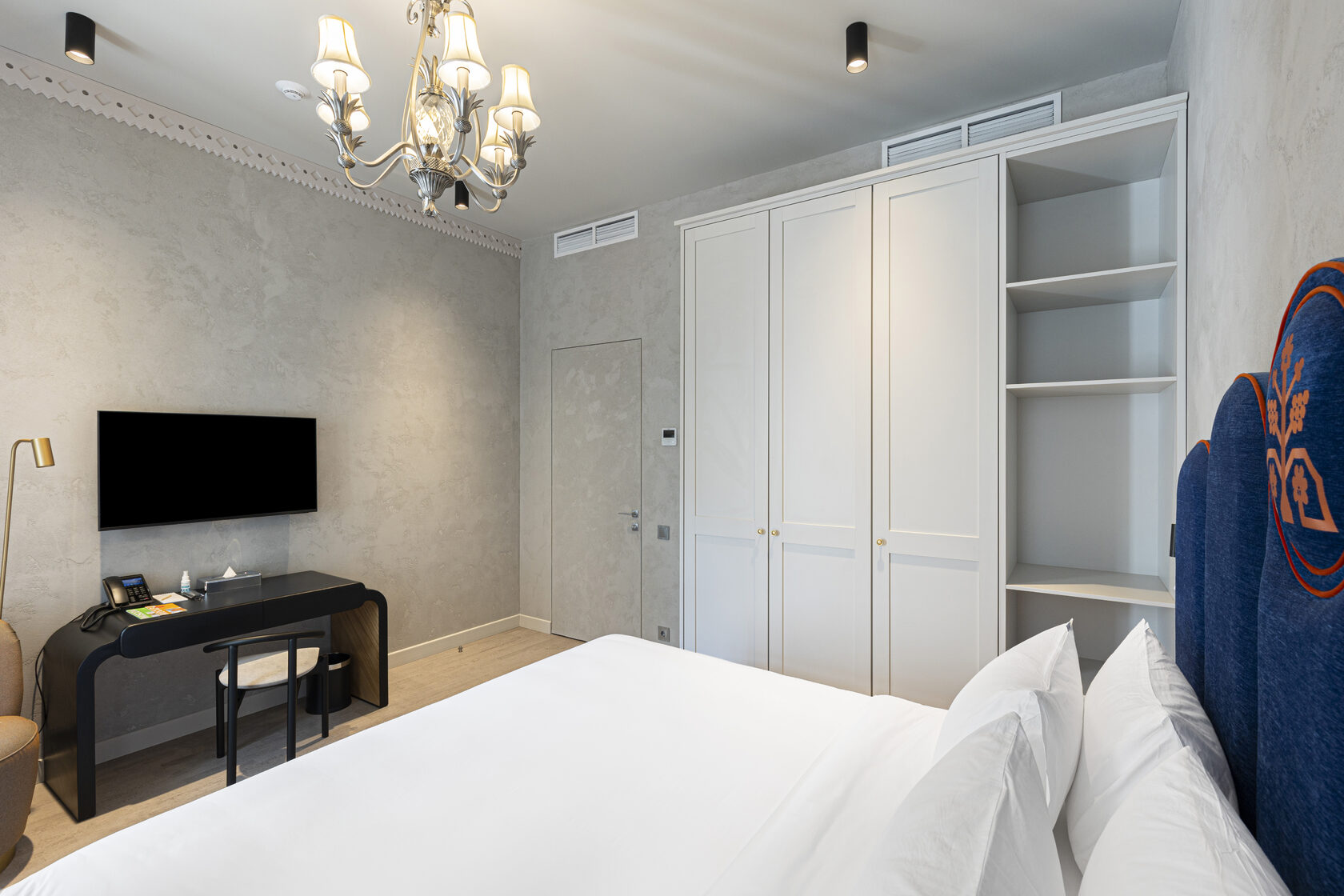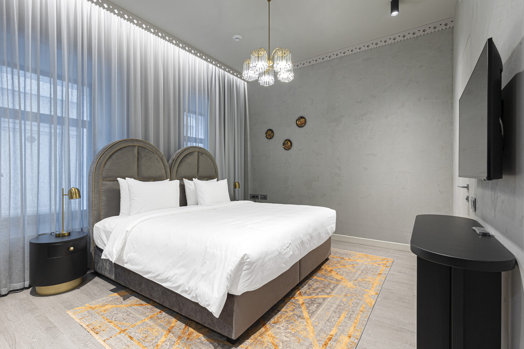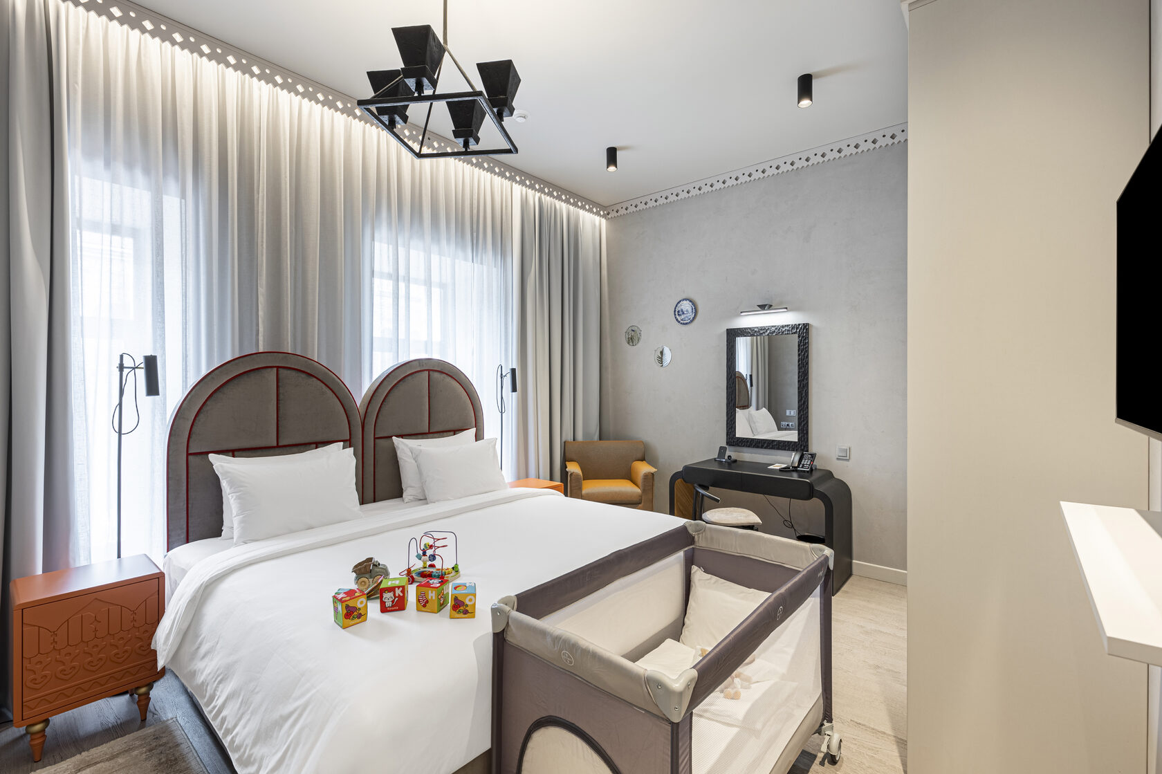 Концепция: Основная идея проекта заключается в создании 'окна в современную Россию' через гармоничное сочетание традиций и новаторства. Интерьеры отеля искусно вплетают культурный код страны во все аспекты дизайна: от отделки стен до тщательно подобранной мебели, светильников и текстиля. Каждый из двадцати одного номера, распределенного по восьми категориям, назван в честь знаменитых русских народных промыслов (Дымково, Касли, Жостово и др.), что подчеркивает уникальную идентичность и богатство русской культуры.