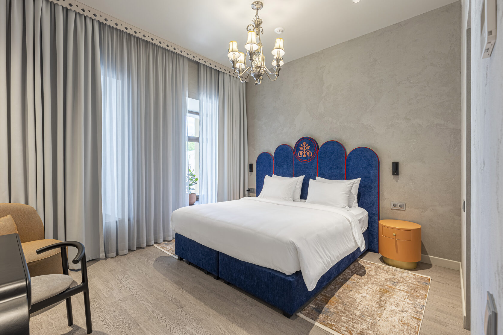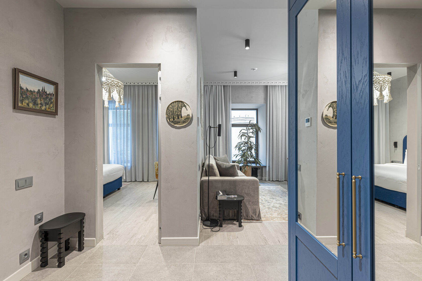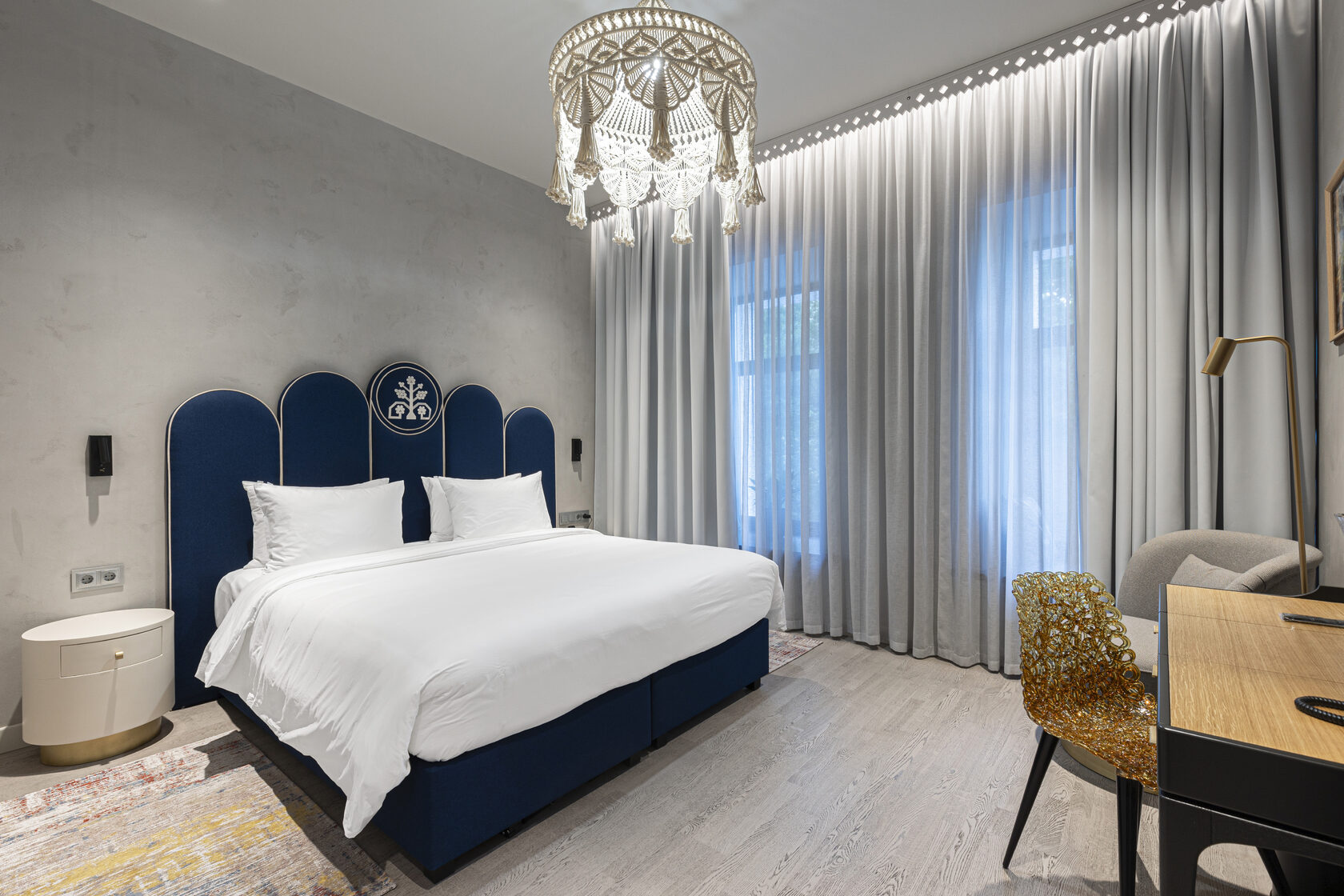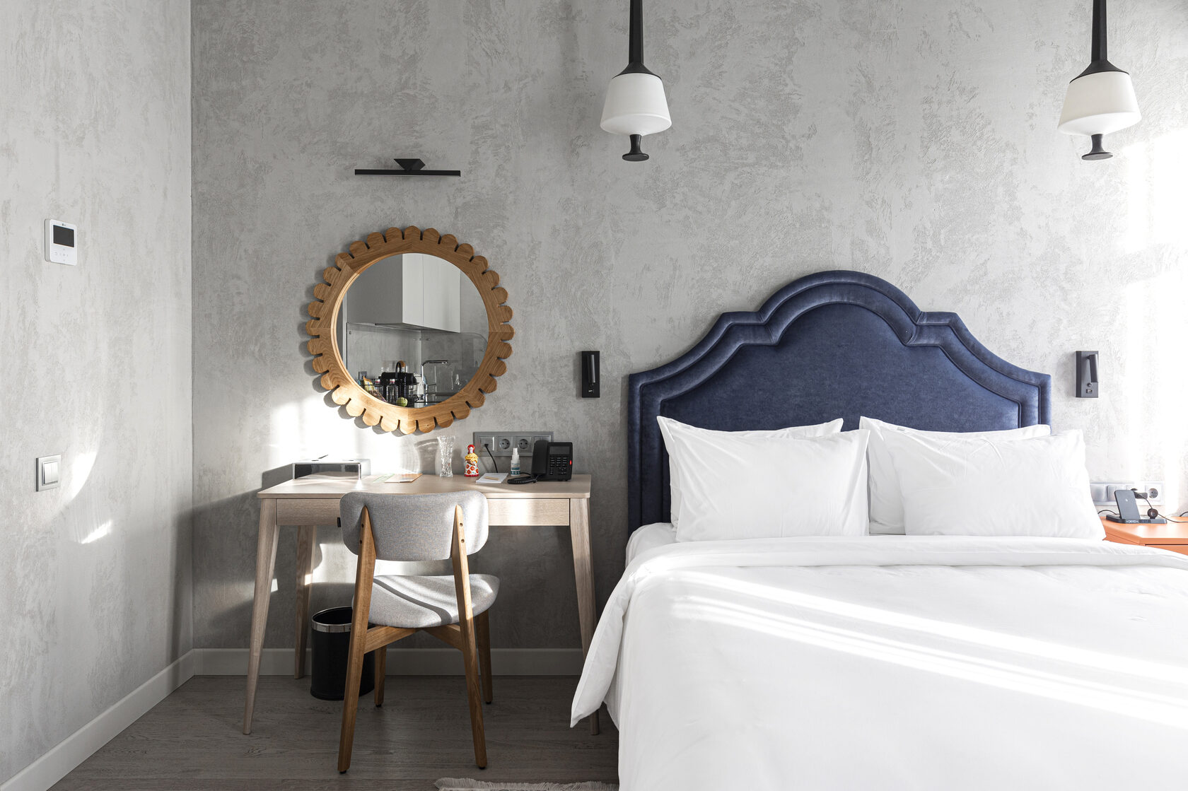 Концепция: Основная идея проекта заключается в создании 'окна в современную Россию' через гармоничное сочетание традиций и новаторства. Интерьеры отеля искусно вплетают культурный код страны во все аспекты дизайна: от отделки стен до тщательно подобранной мебели, светильников и текстиля. Каждый из двадцати одного номера, распределенного по восьми категориям, назван в честь знаменитых русских народных промыслов (Дымково, Касли, Жостово и др.), что подчеркивает уникальную идентичность и богатство русской культуры.
