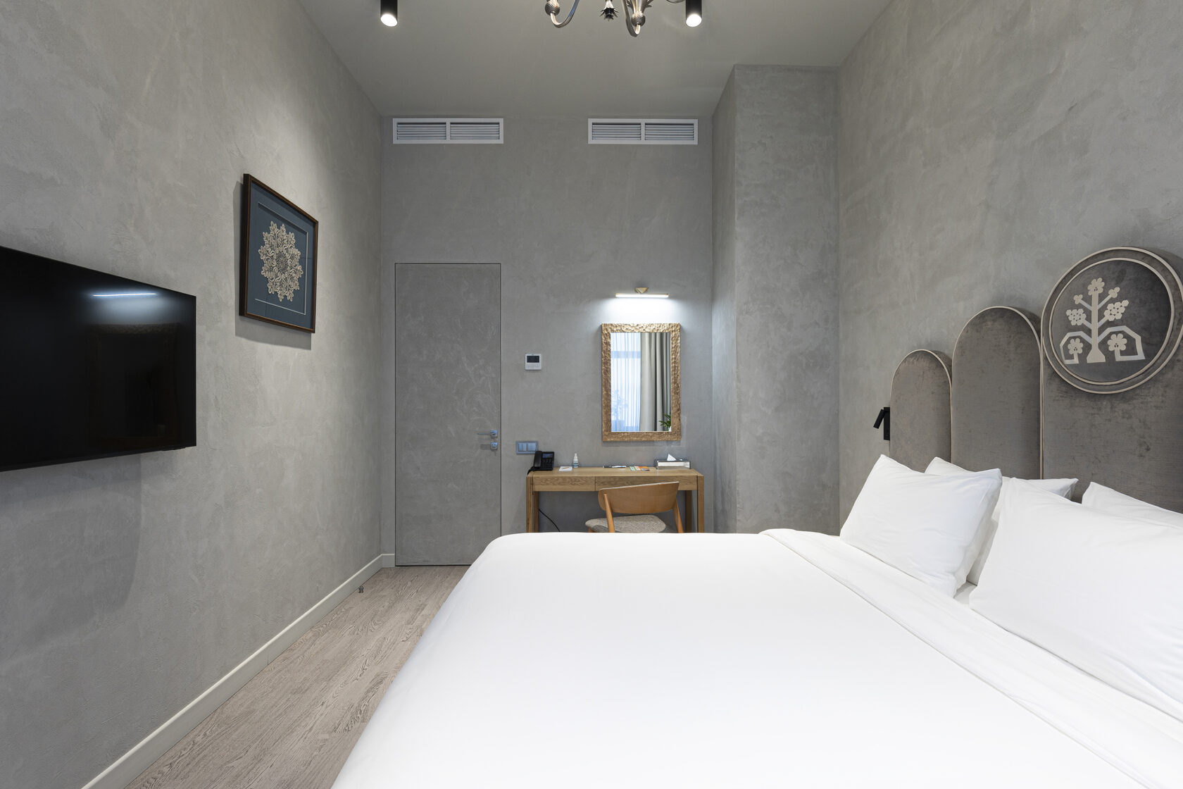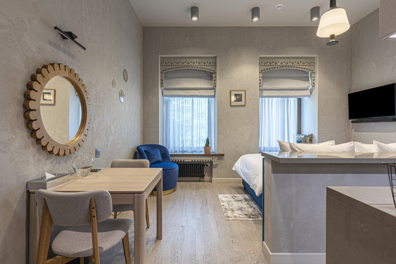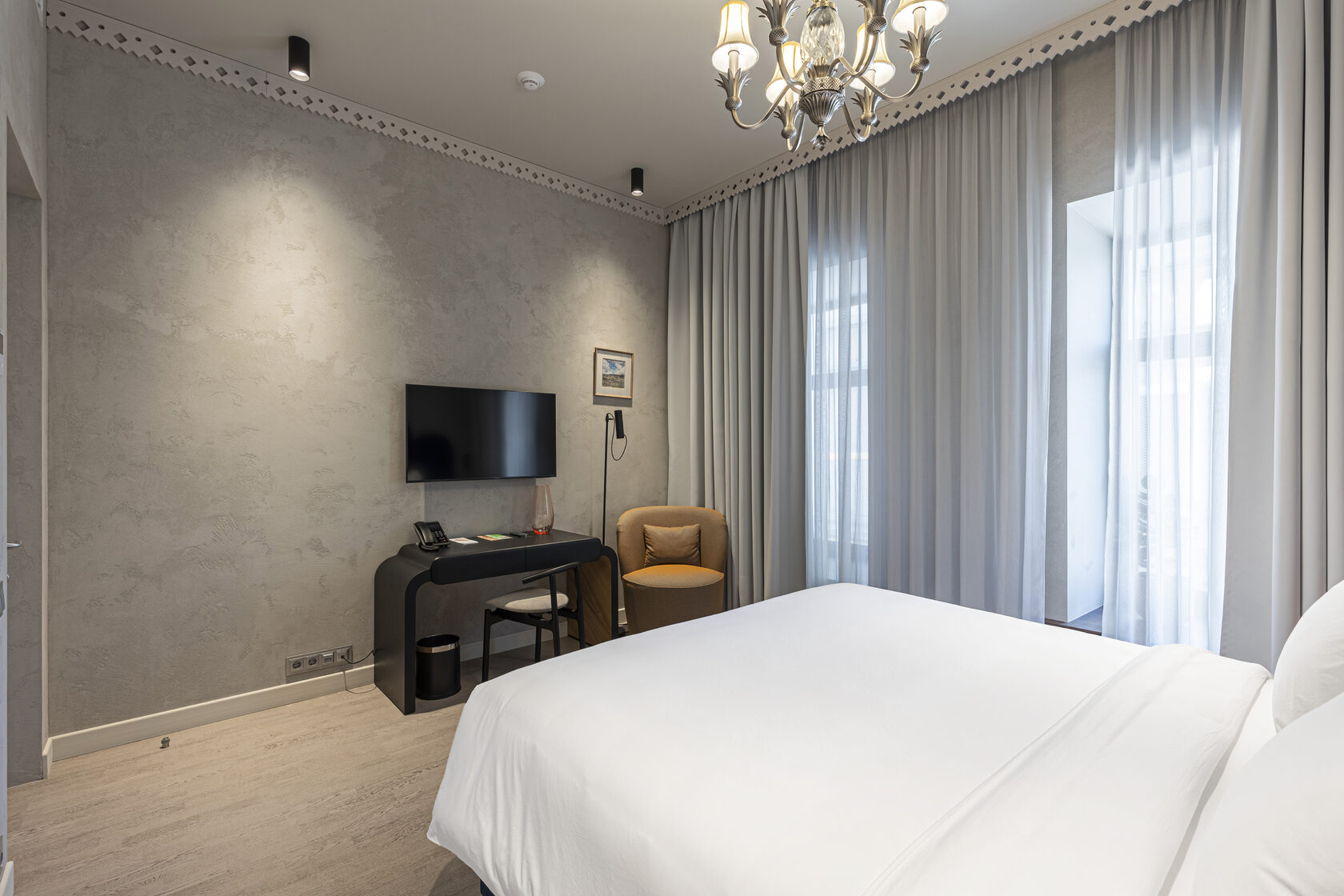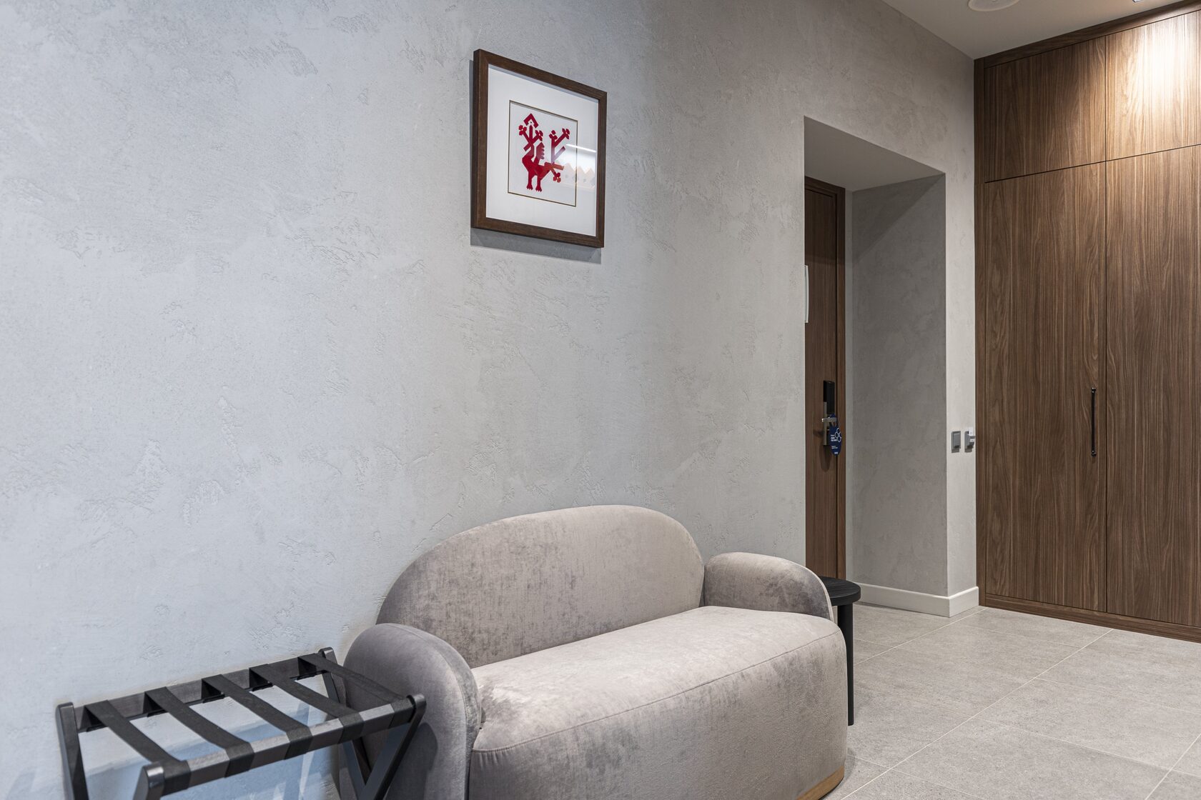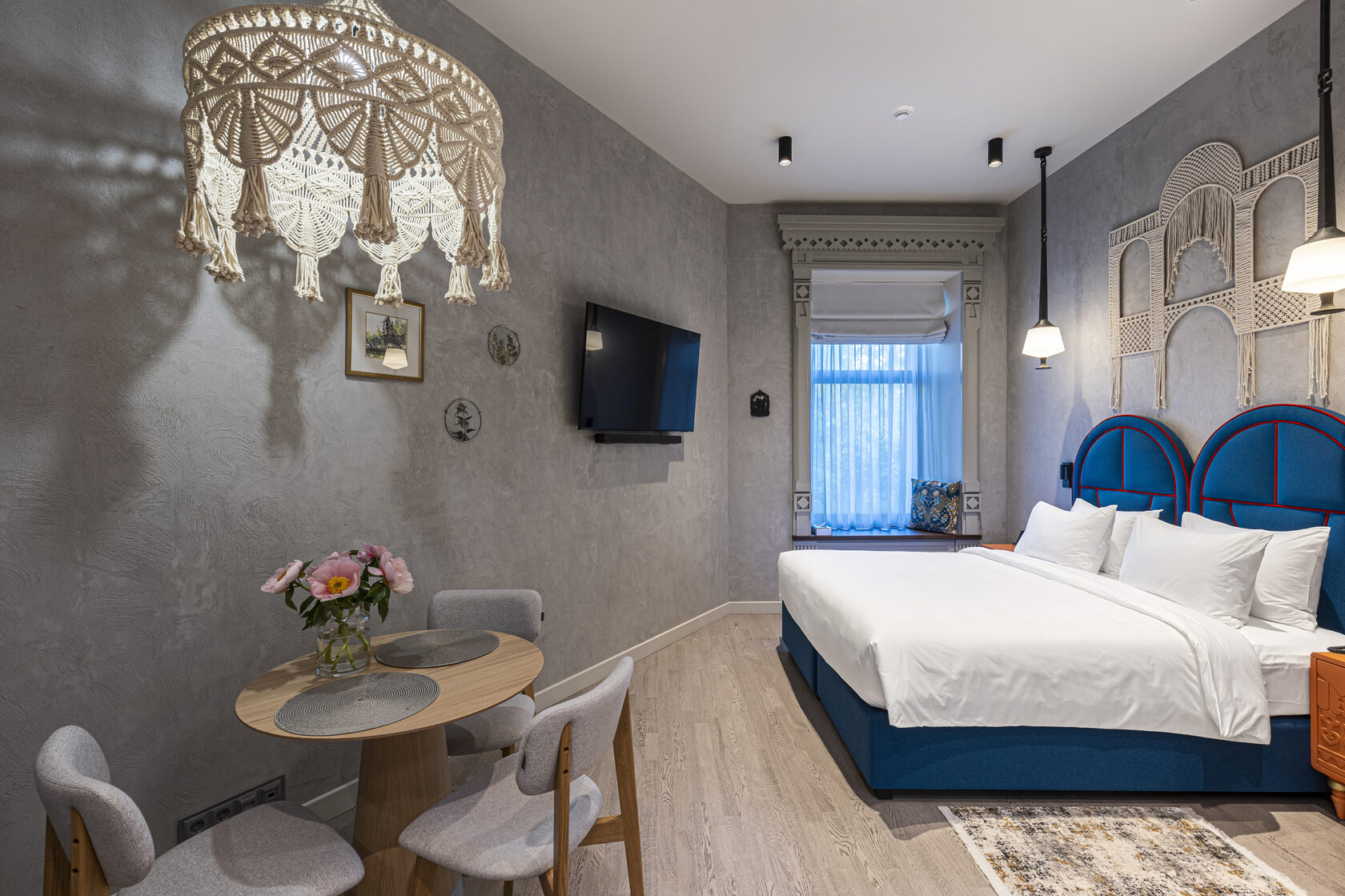 Концепция: Основная идея проекта заключается в создании 'окна в современную Россию' через гармоничное сочетание традиций и новаторства. Интерьеры отеля искусно вплетают культурный код страны во все аспекты дизайна: от отделки стен до тщательно подобранной мебели, светильников и текстиля. Каждый из двадцати одного номера, распределенного по восьми категориям, назван в честь знаменитых русских народных промыслов (Дымково, Касли, Жостово и др.), что подчеркивает уникальную идентичность и богатство русской культуры.