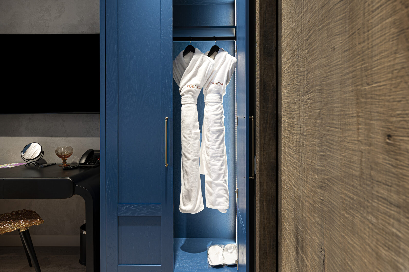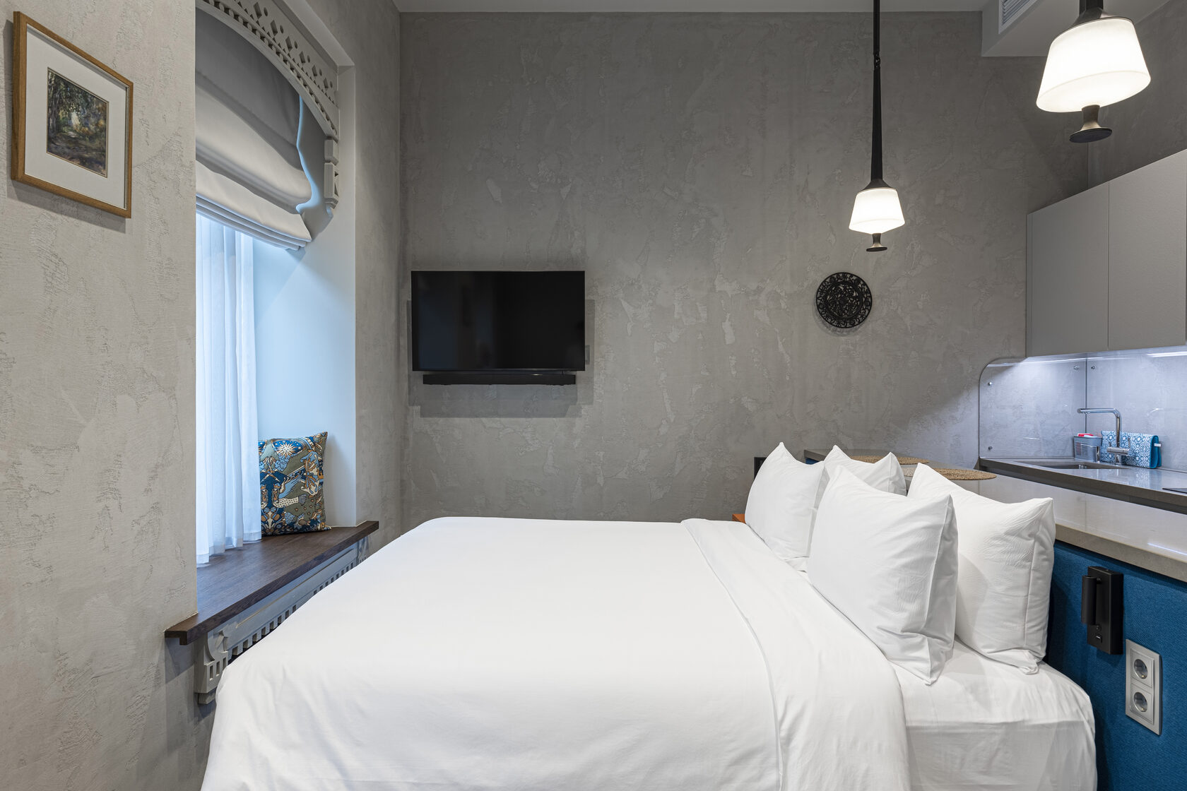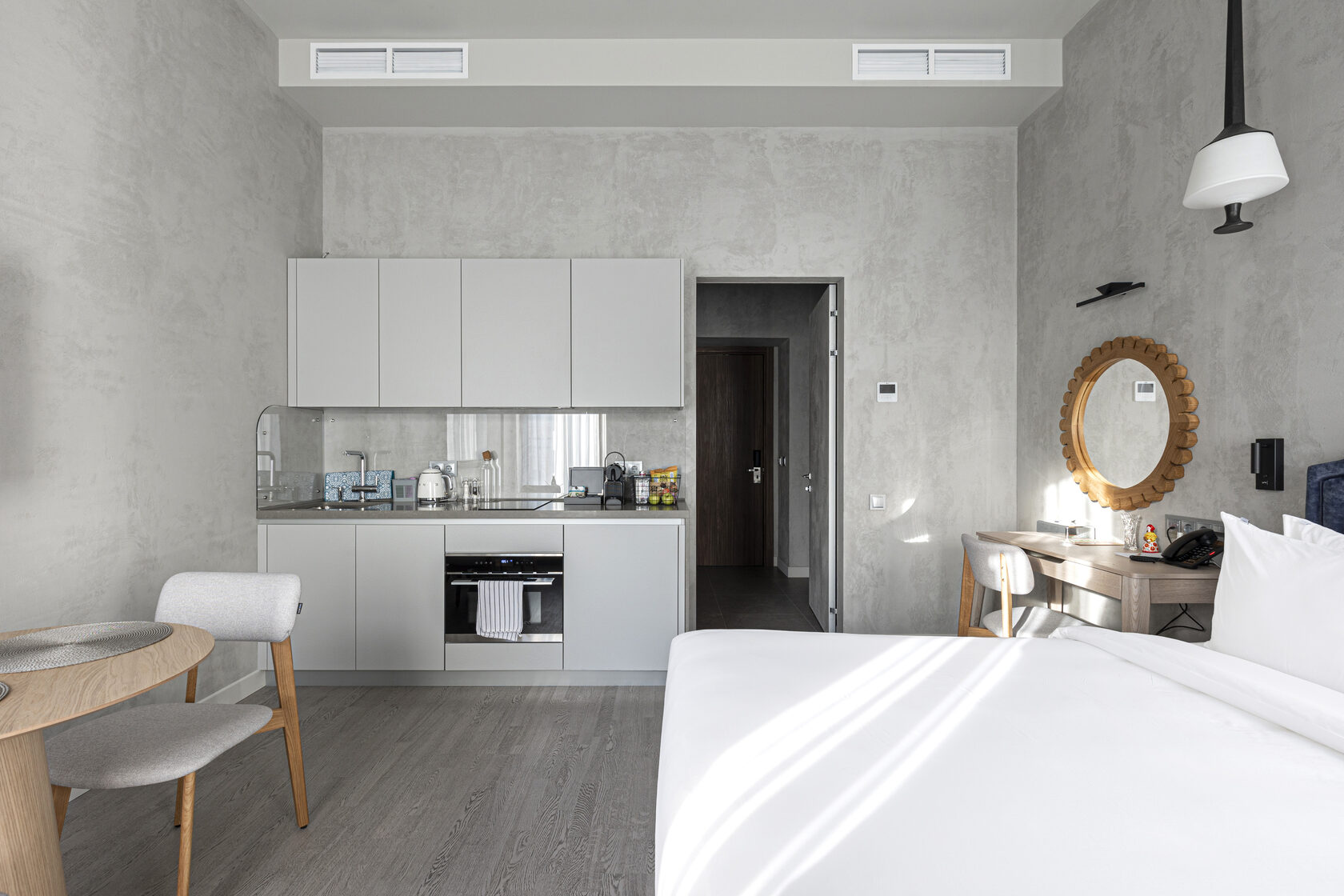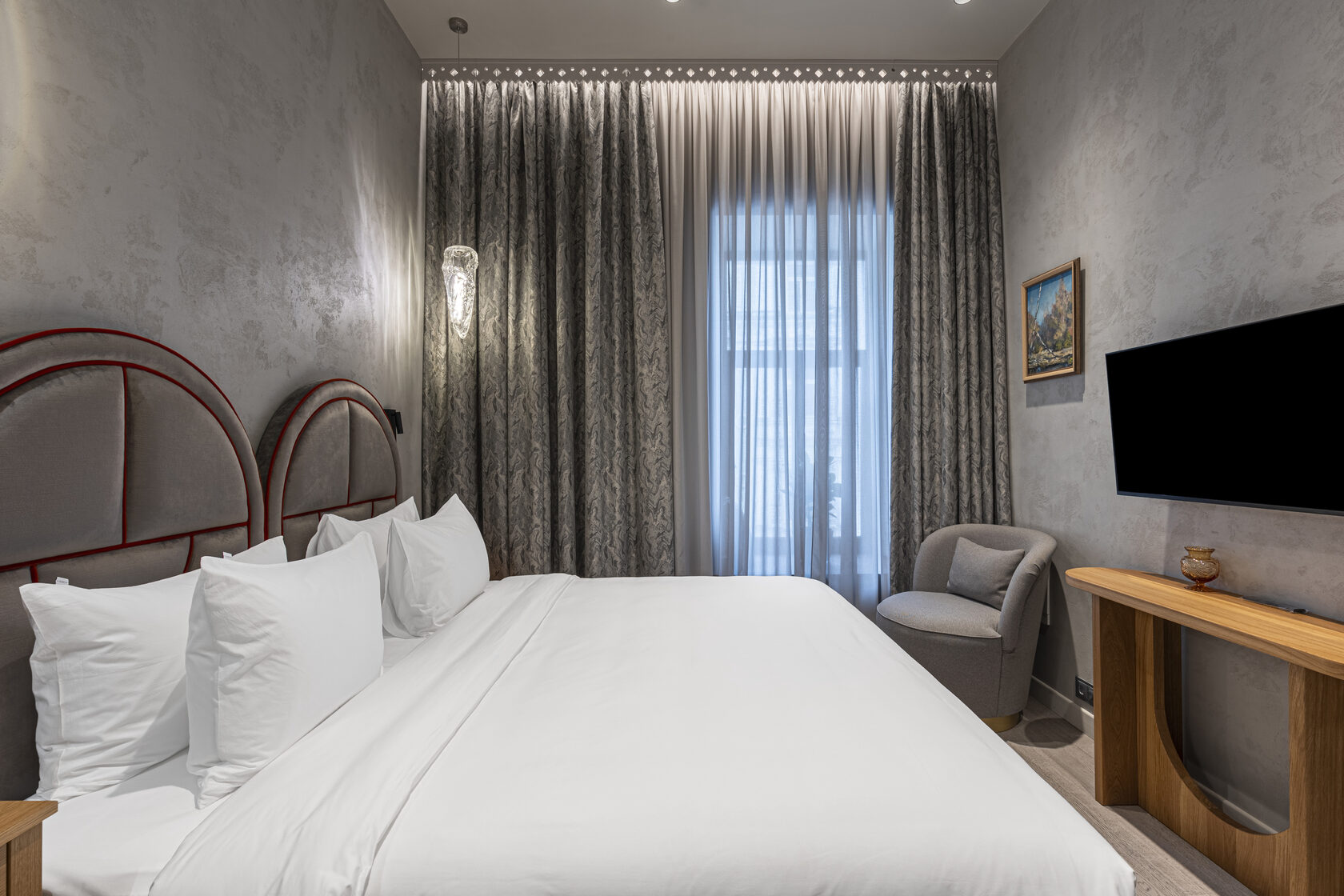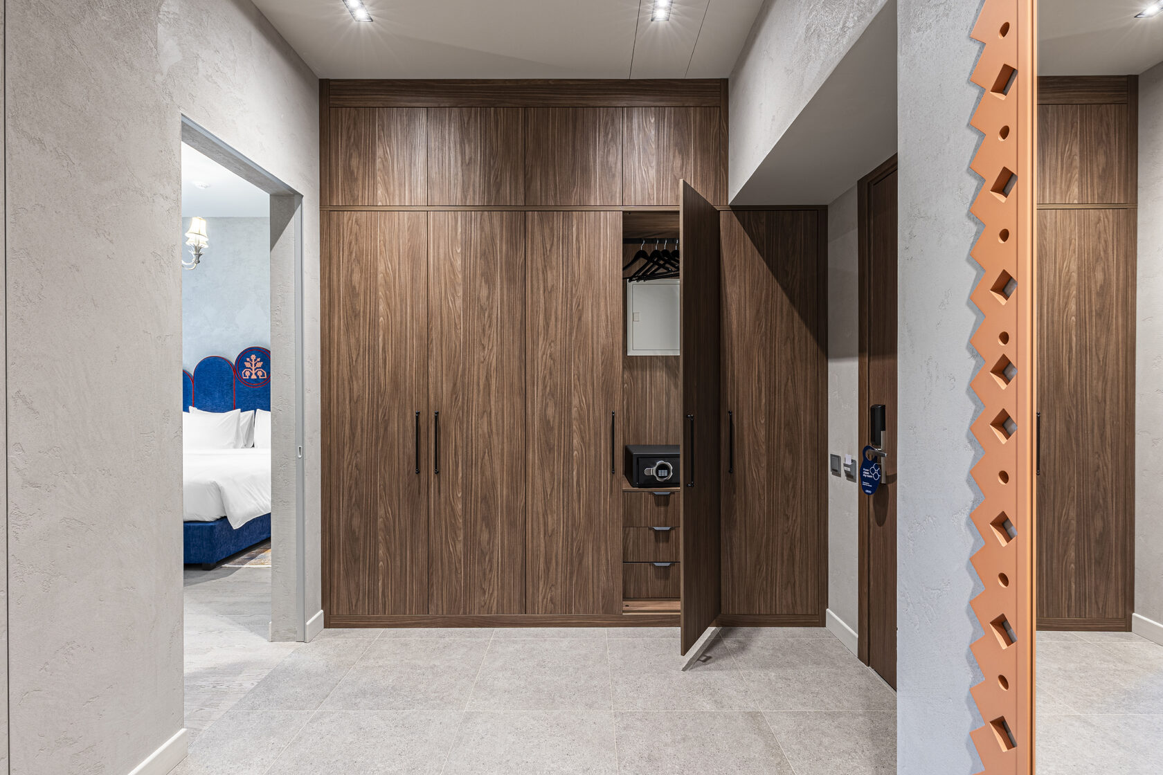 Концепция: Основная идея проекта заключается в создании 'окна в современную Россию' через гармоничное сочетание традиций и новаторства. Интерьеры отеля искусно вплетают культурный код страны во все аспекты дизайна: от отделки стен до тщательно подобранной мебели, светильников и текстиля. Каждый из двадцати одного номера, распределенного по восьми категориям, назван в честь знаменитых русских народных промыслов (Дымково, Касли, Жостово и др.), что подчеркивает уникальную идентичность и богатство русской культуры.