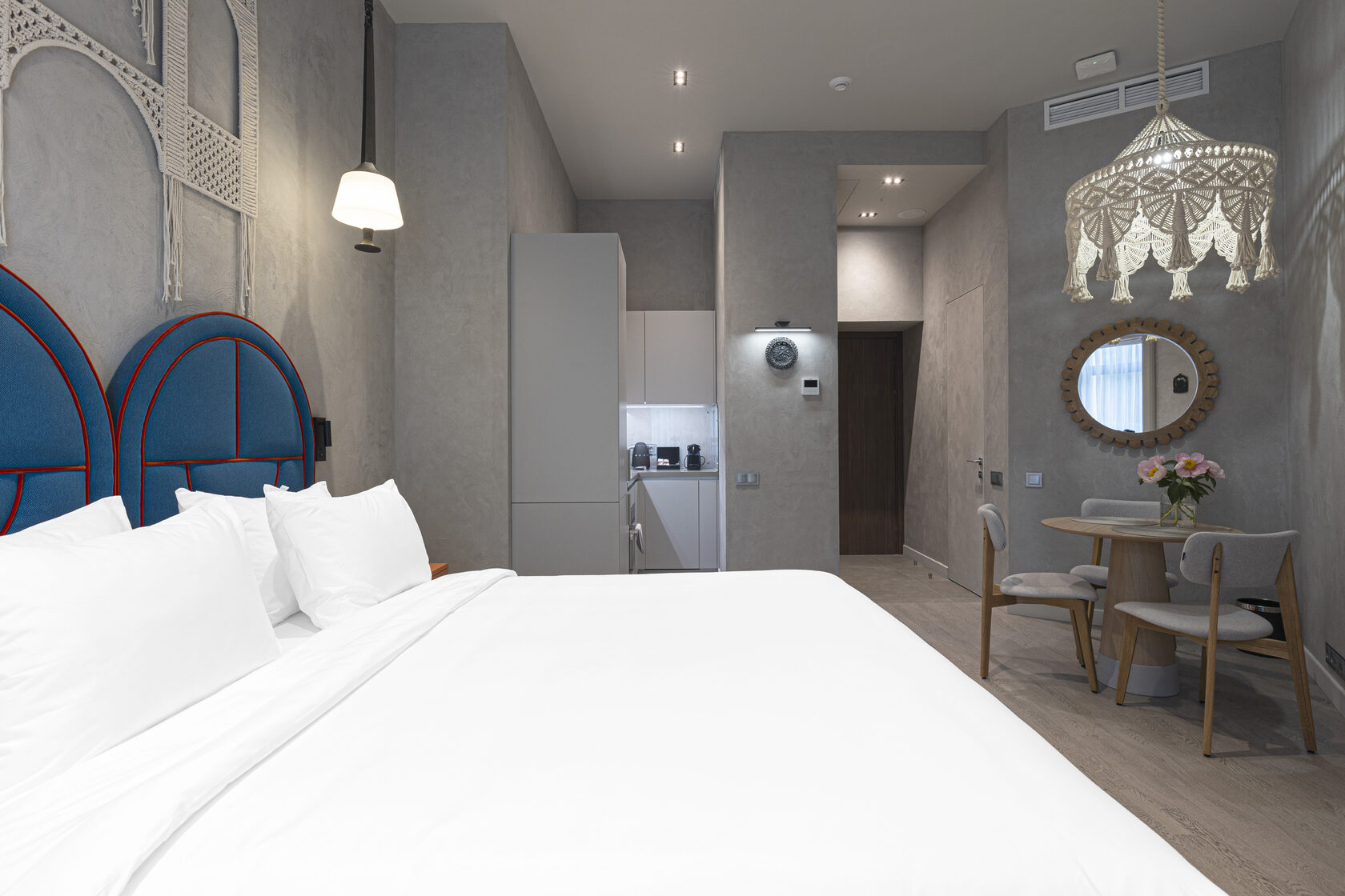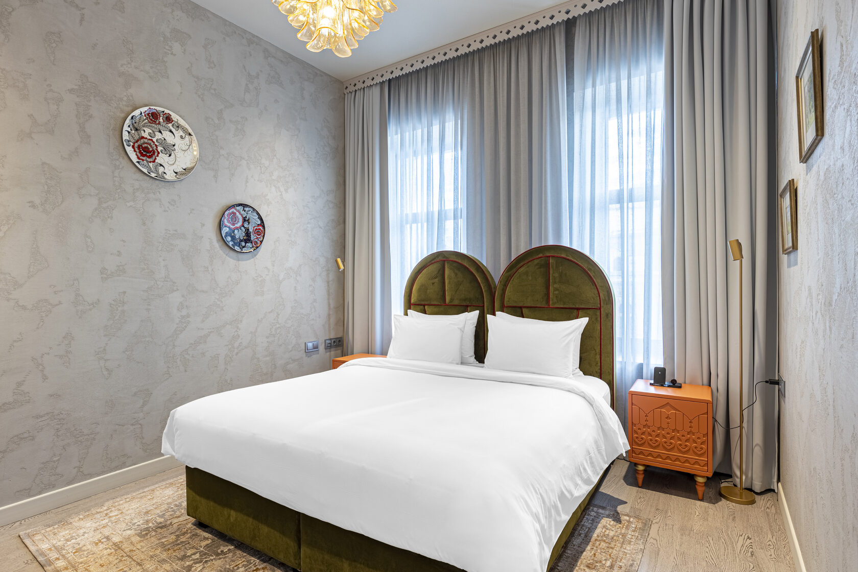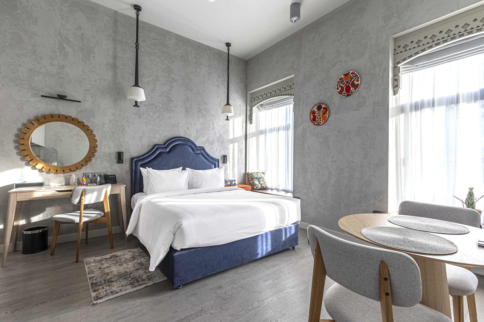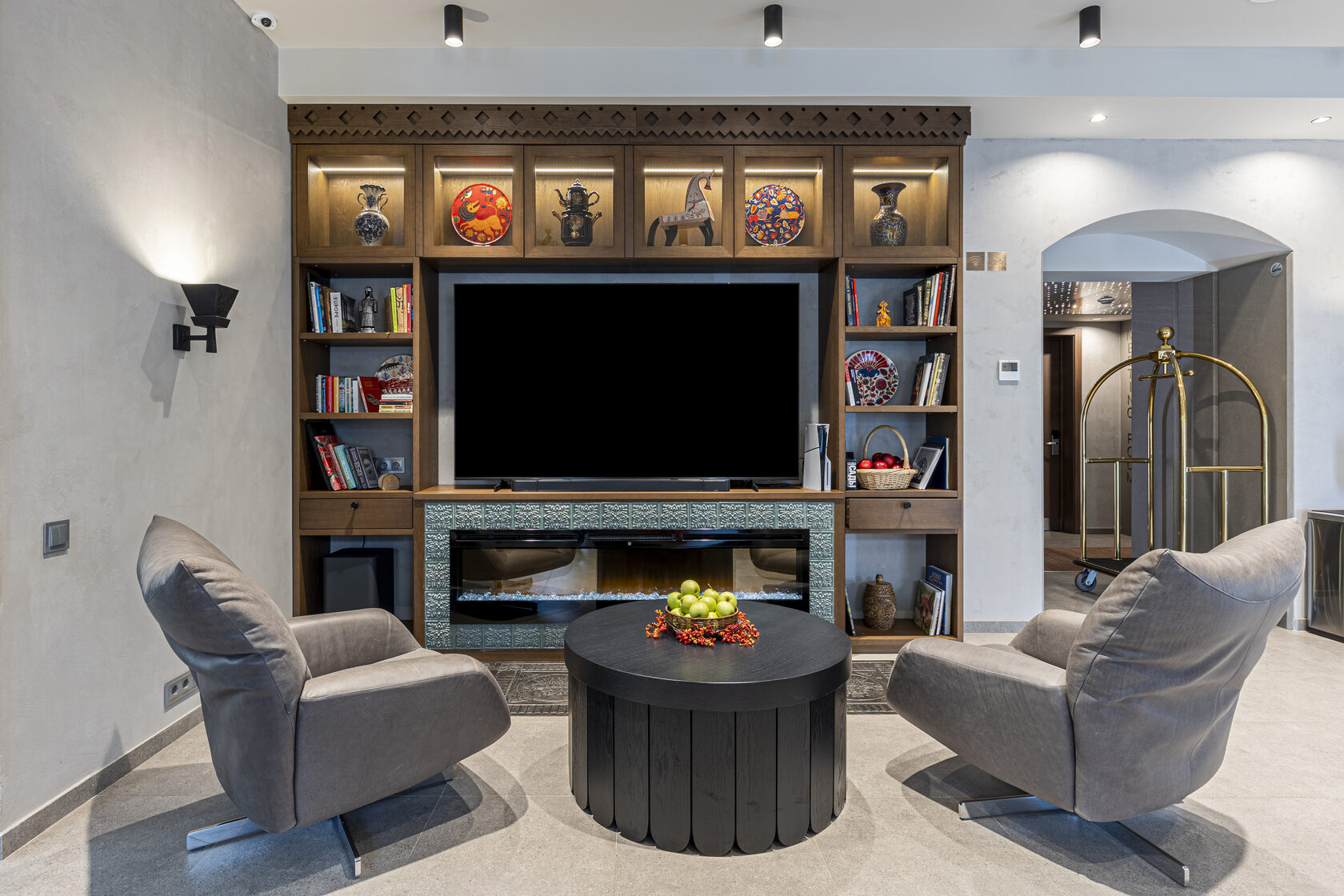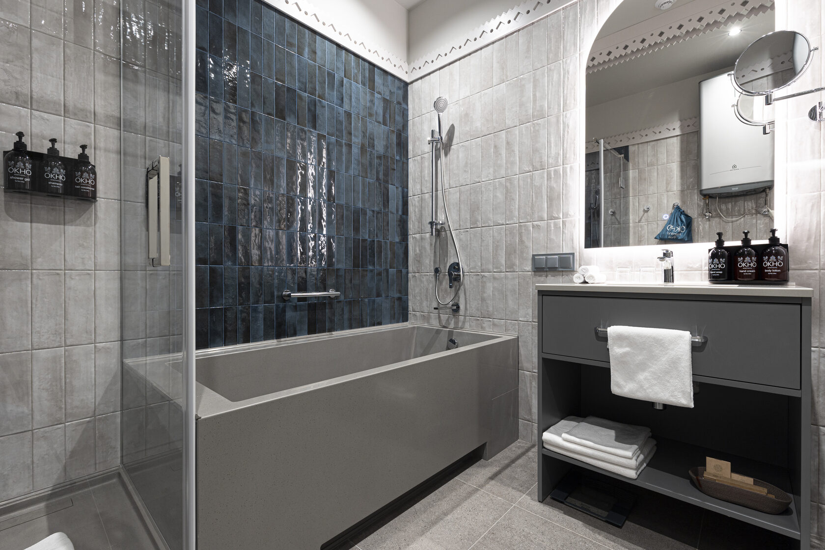 Концепция: Основная идея проекта заключается в создании 'окна в современную Россию' через гармоничное сочетание традиций и новаторства. Интерьеры отеля искусно вплетают культурный код страны во все аспекты дизайна: от отделки стен до тщательно подобранной мебели, светильников и текстиля. Каждый из двадцати одного номера, распределенного по восьми категориям, назван в честь знаменитых русских народных промыслов (Дымково, Касли, Жостово и др.), что подчеркивает уникальную идентичность и богатство русской культуры.