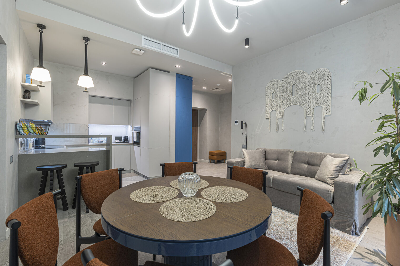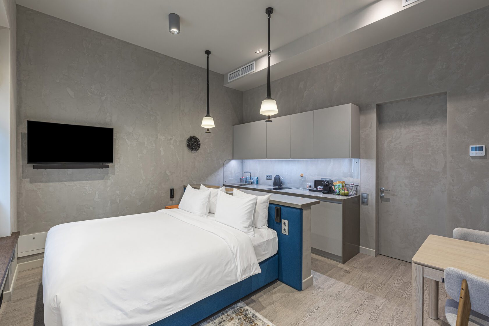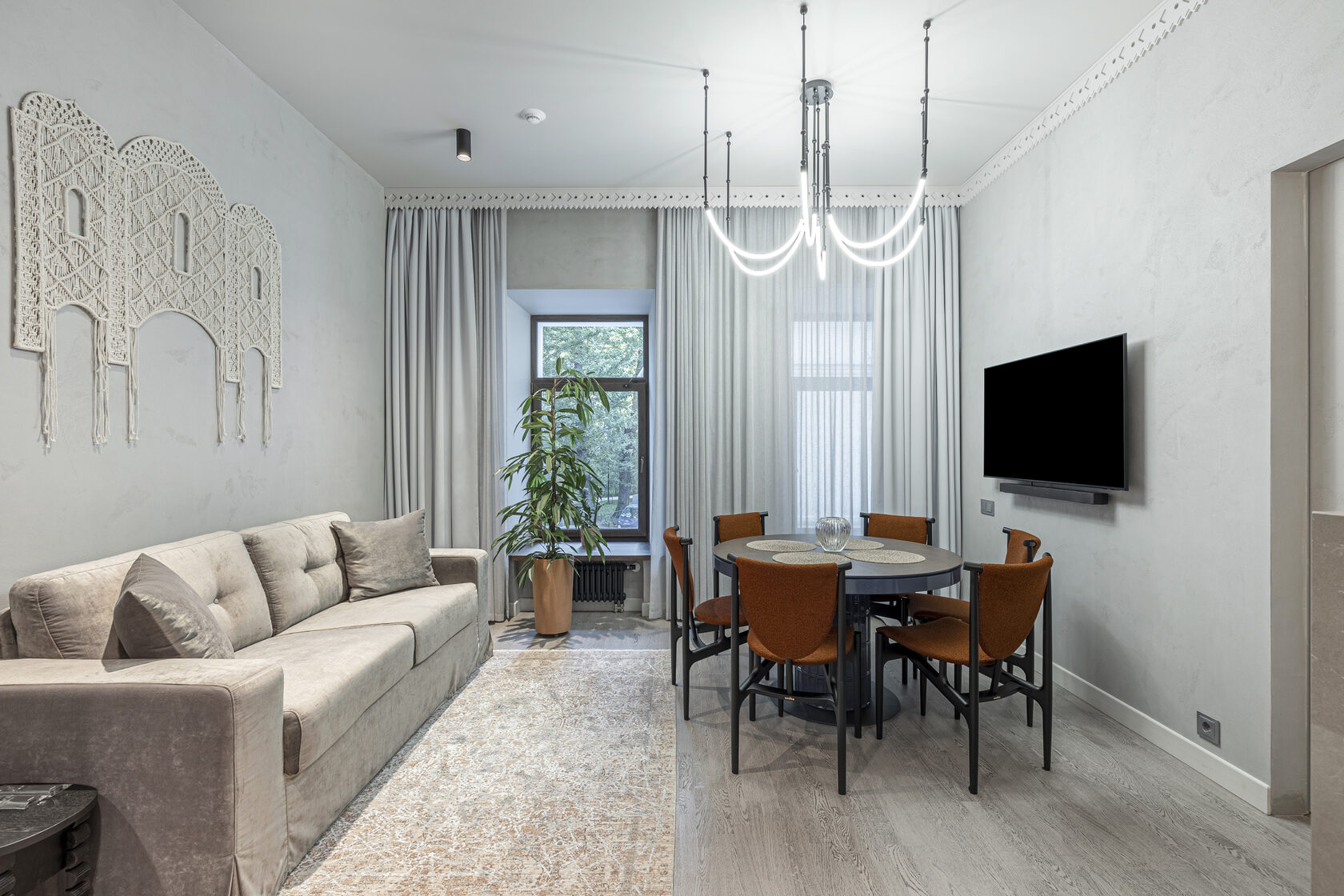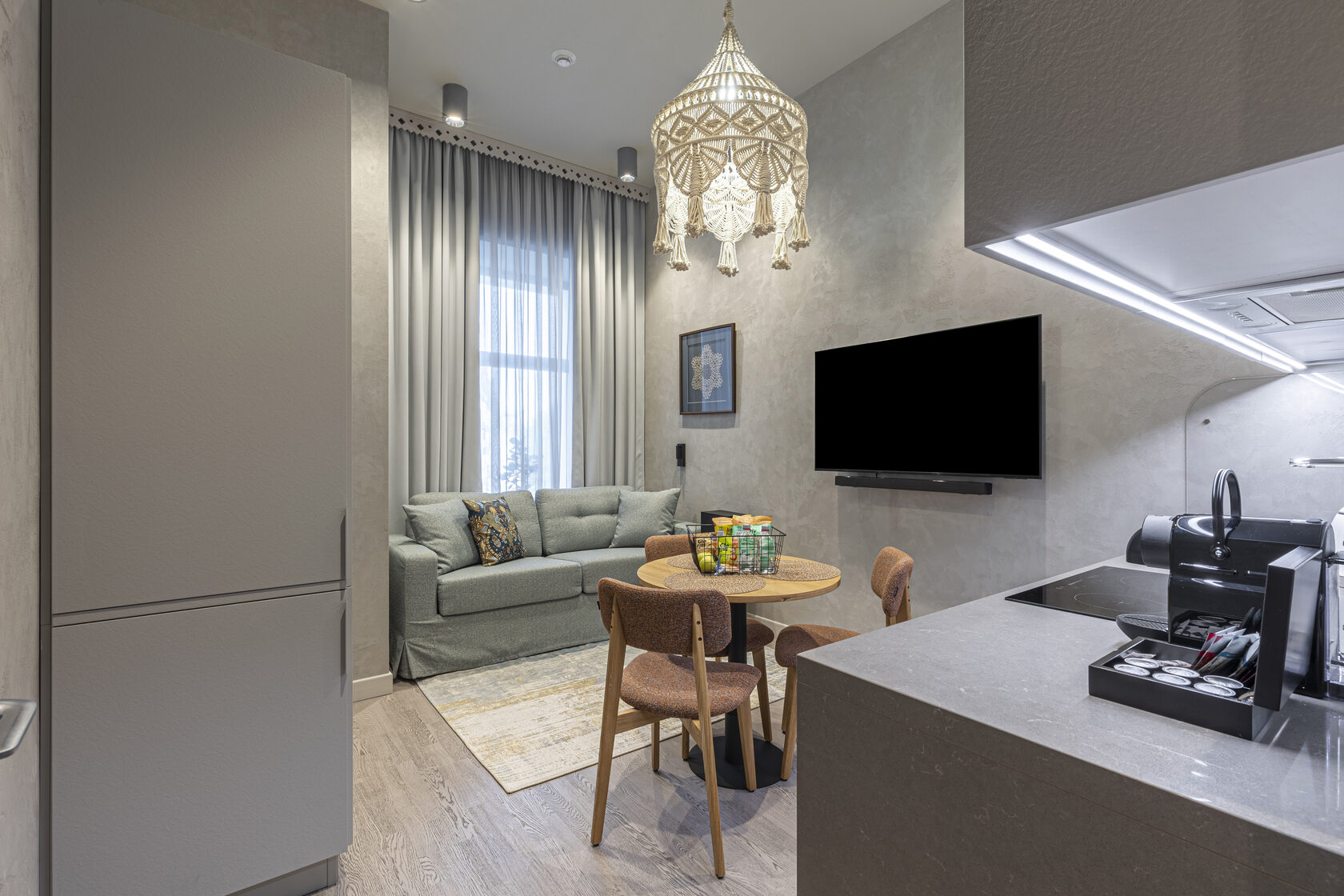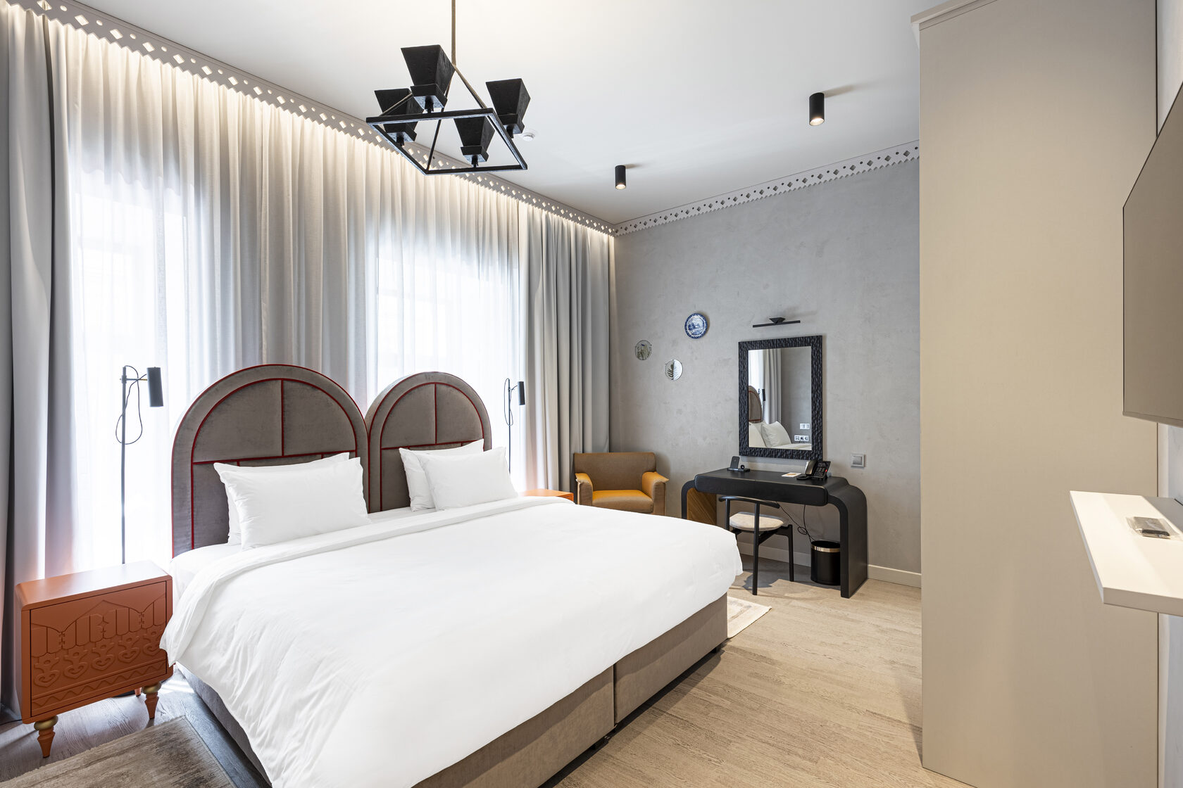 Концепция: Основная идея проекта заключается в создании 'окна в современную Россию' через гармоничное сочетание традиций и новаторства. Интерьеры отеля искусно вплетают культурный код страны во все аспекты дизайна: от отделки стен до тщательно подобранной мебели, светильников и текстиля. Каждый из двадцати одного номера, распределенного по восьми категориям, назван в честь знаменитых русских народных промыслов (Дымково, Касли, Жостово и др.), что подчеркивает уникальную идентичность и богатство русской культуры.