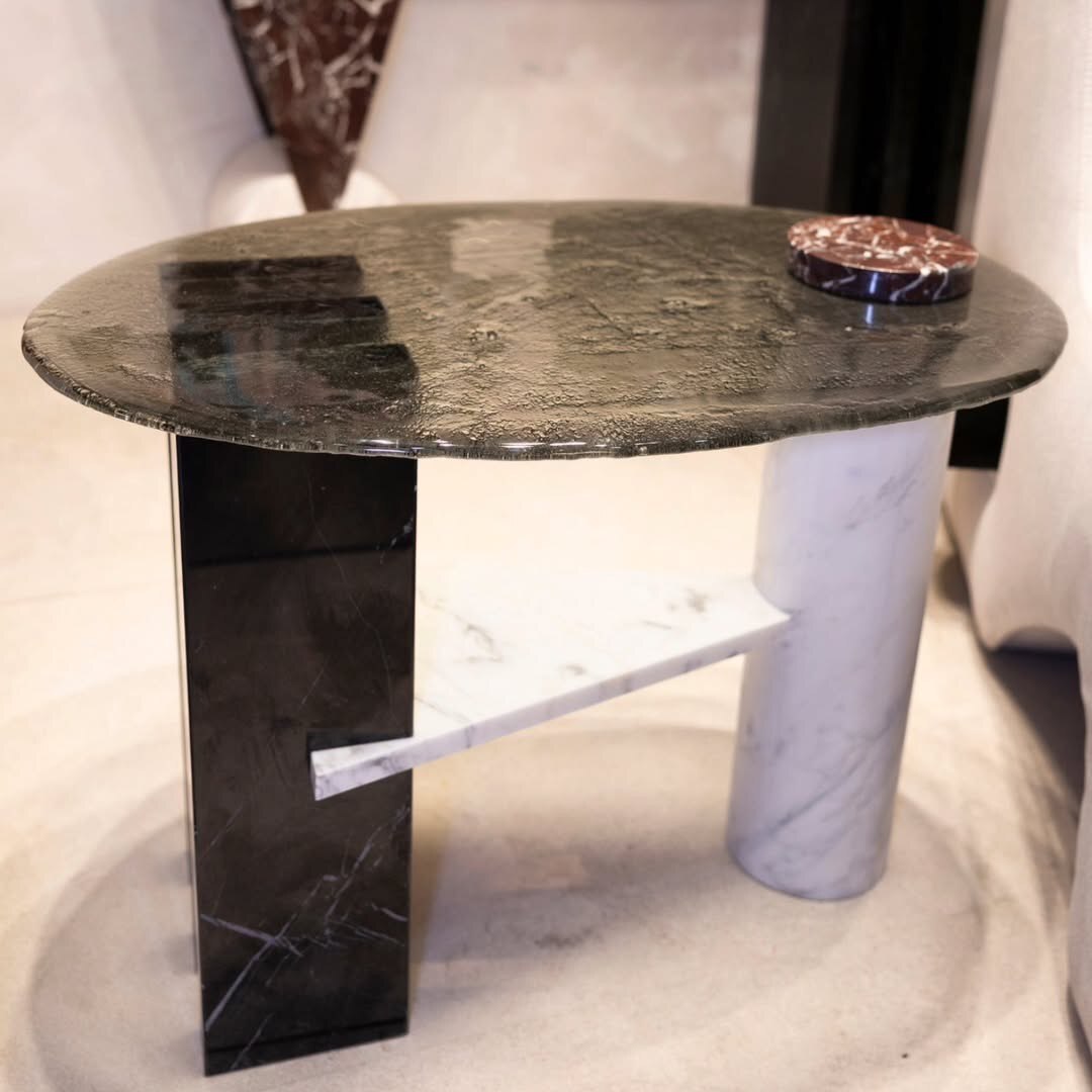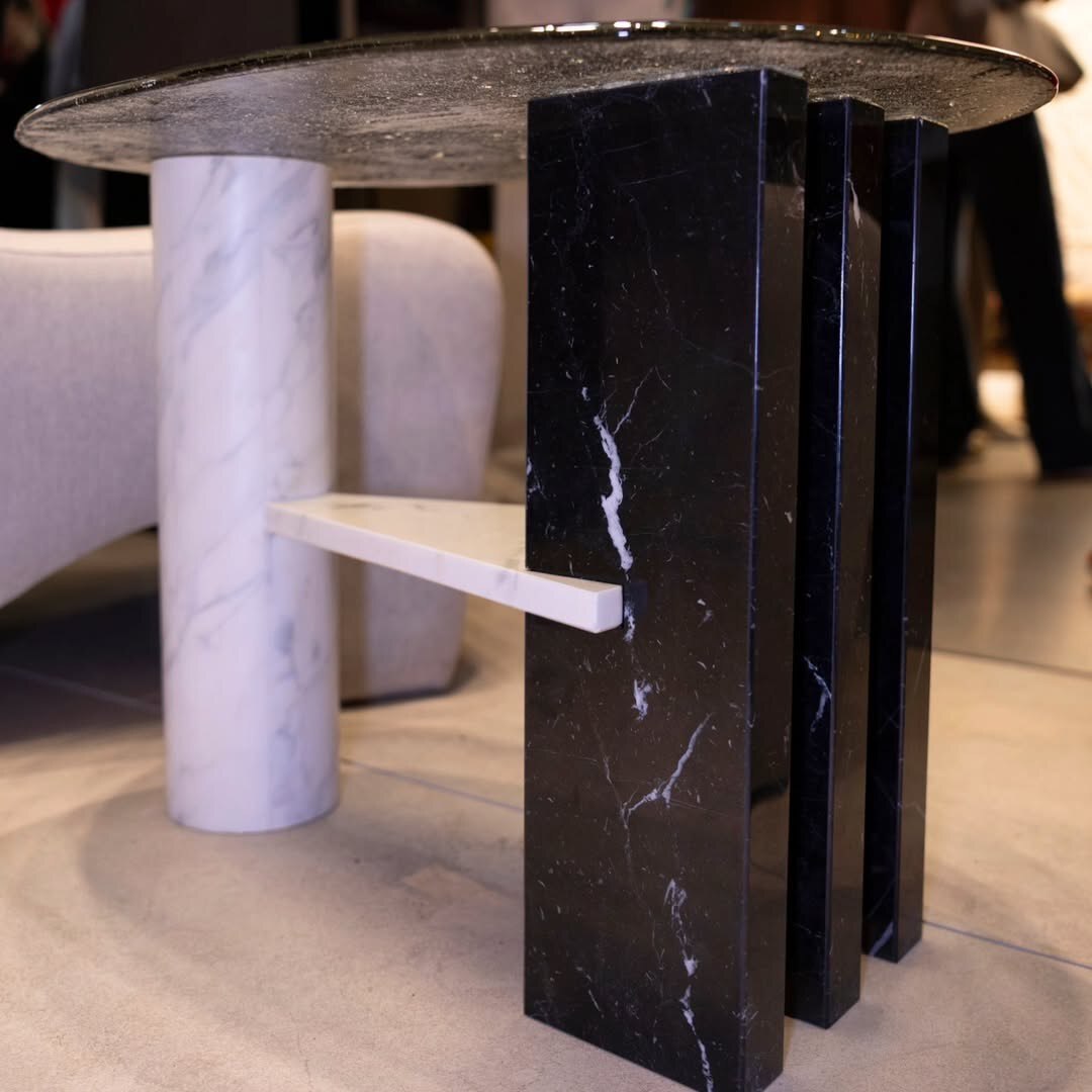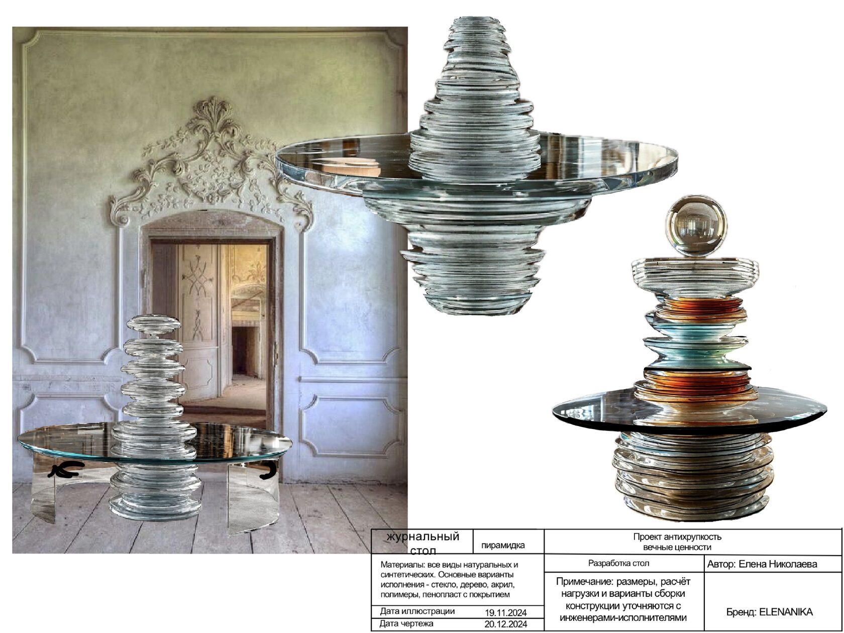 Идея: Геометрия и динамика: Форма столика, это сочетание геометрических форм объединенных в пространстве. Столешница, напоминающая эллипс, и асимметричное расположение опор создают ощущение движения и динамики. Контраст материалов: Использование полированного черного и белого мрамора для опор, красного мрамора для декоративного элемента и тонированного стекла для столешницы создает смелый визуальный контраст. Это подчеркивает объем и текстуру каждого материала. Функциональность и эстетика: Столик не только является предметом искусства, но и выполняет свою прямую функцию. Минималистичный дизайн обеспечивает его универсальность и способность вписаться в различные интерьеры. Символизм: Цвета и формы могут интерпретироваться как отражение утопических идей Лисицкого о новом мире, где функциональность и эстетика сливаются воедино.