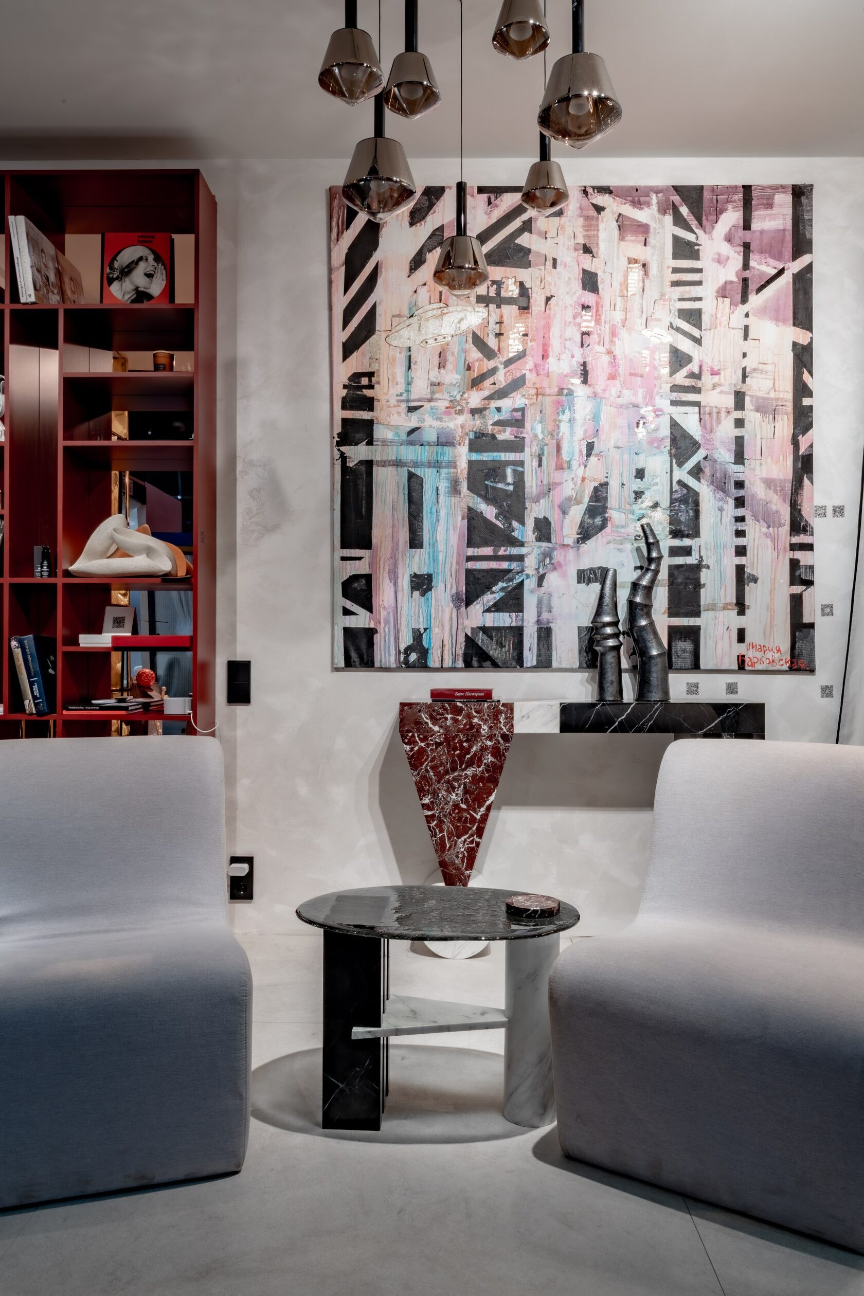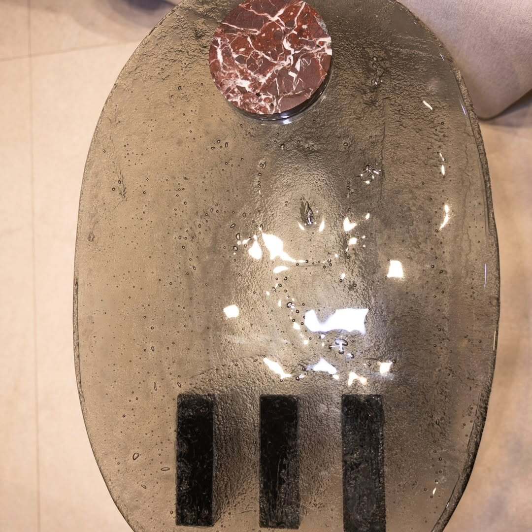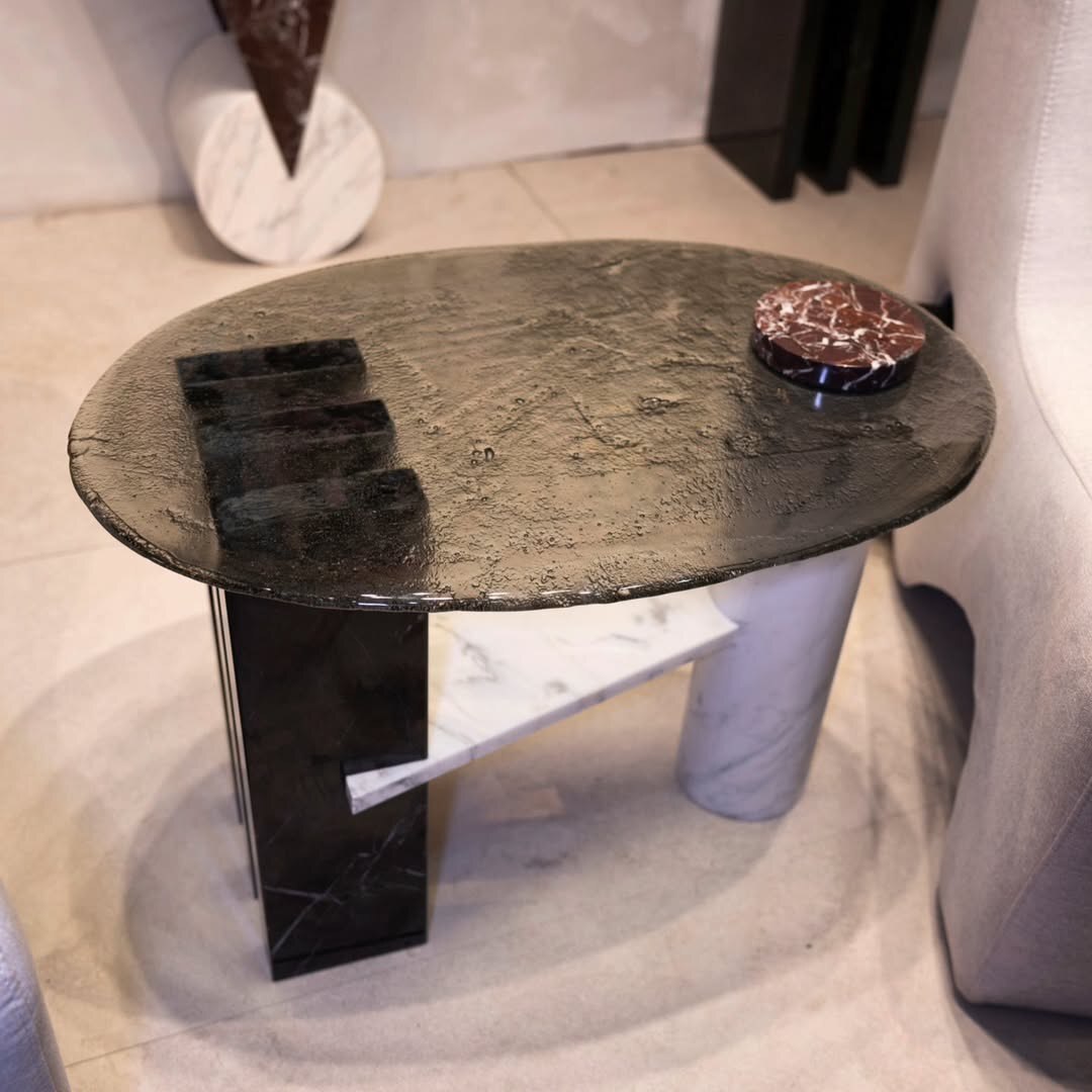 Идея: Геометрия и динамика: Форма столика, это сочетание геометрических форм объединенных в пространстве. Столешница, напоминающая эллипс, и асимметричное расположение опор создают ощущение движения и динамики. Контраст материалов: Использование полированного черного и белого мрамора для опор, красного мрамора для декоративного элемента и тонированного стекла для столешницы создает смелый визуальный контраст. Это подчеркивает объем и текстуру каждого материала. Функциональность и эстетика: Столик не только является предметом искусства, но и выполняет свою прямую функцию. Минималистичный дизайн обеспечивает его универсальность и способность вписаться в различные интерьеры. Символизм: Цвета и формы могут интерпретироваться как отражение утопических идей Лисицкого о новом мире, где функциональность и эстетика сливаются воедино.