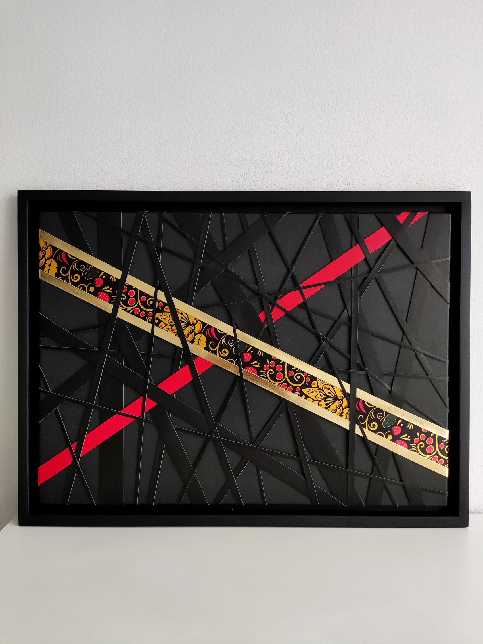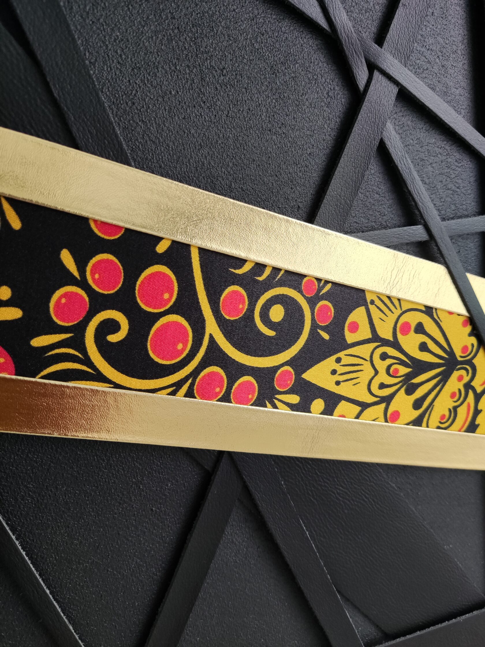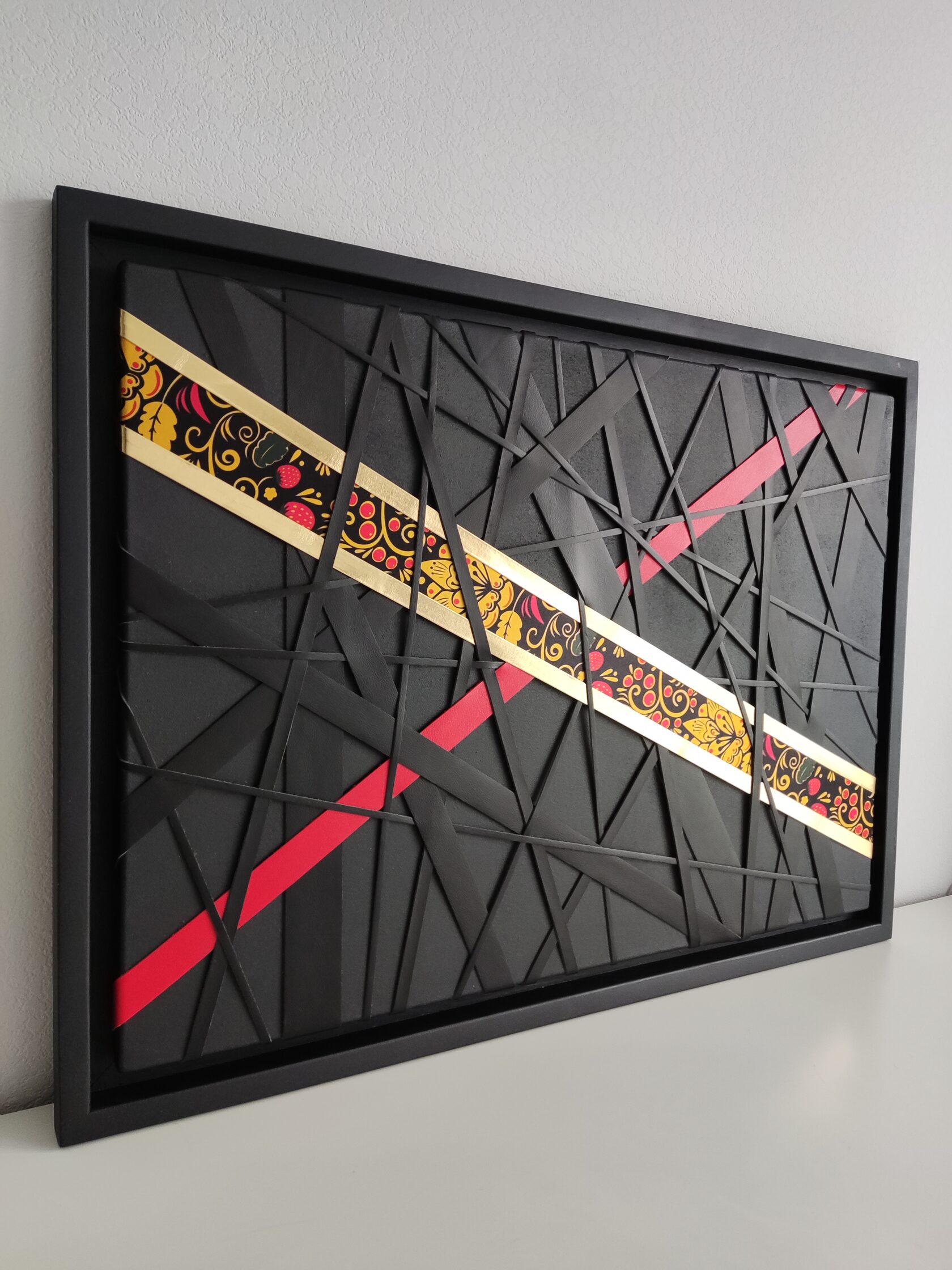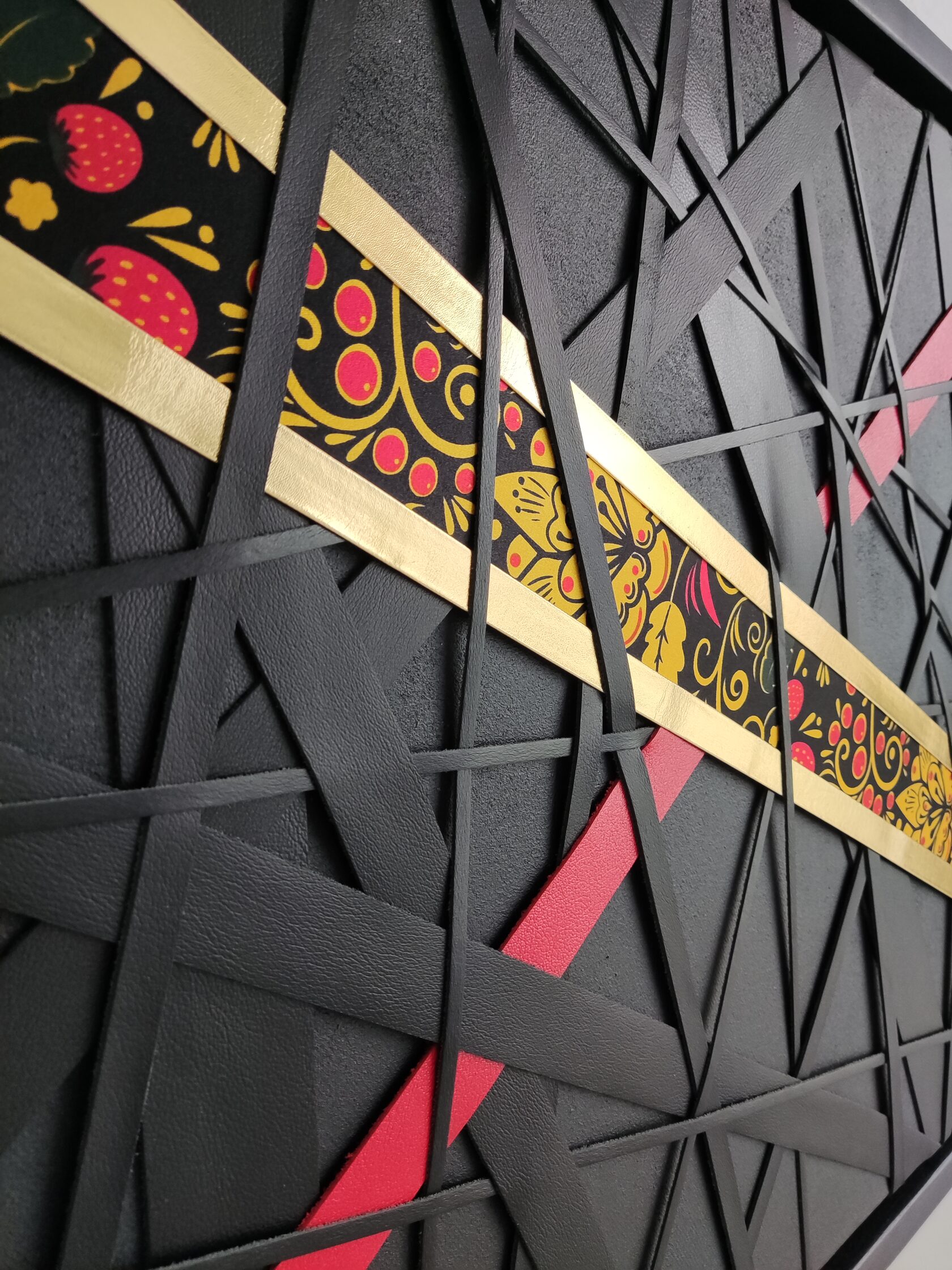 Арт- панно выполнено в трех основных цветах Хохломской росписи: чёрный, красный, золотой. Чёрные линии кожи олицетворяют в работе другие народные художественные росписи и промыслы, которые пересекались с хохломской. Красная линия - это жизнь, возрождение - как символ оживления Хохоломы в современном мире. Золотая линия - свет и энергия легендарной росписи! На панно выделена основная линия Хохломы с её характерным орнаментом как символ уникальности росписи, которая является одной из самых ярких и узнаваемых среди других !