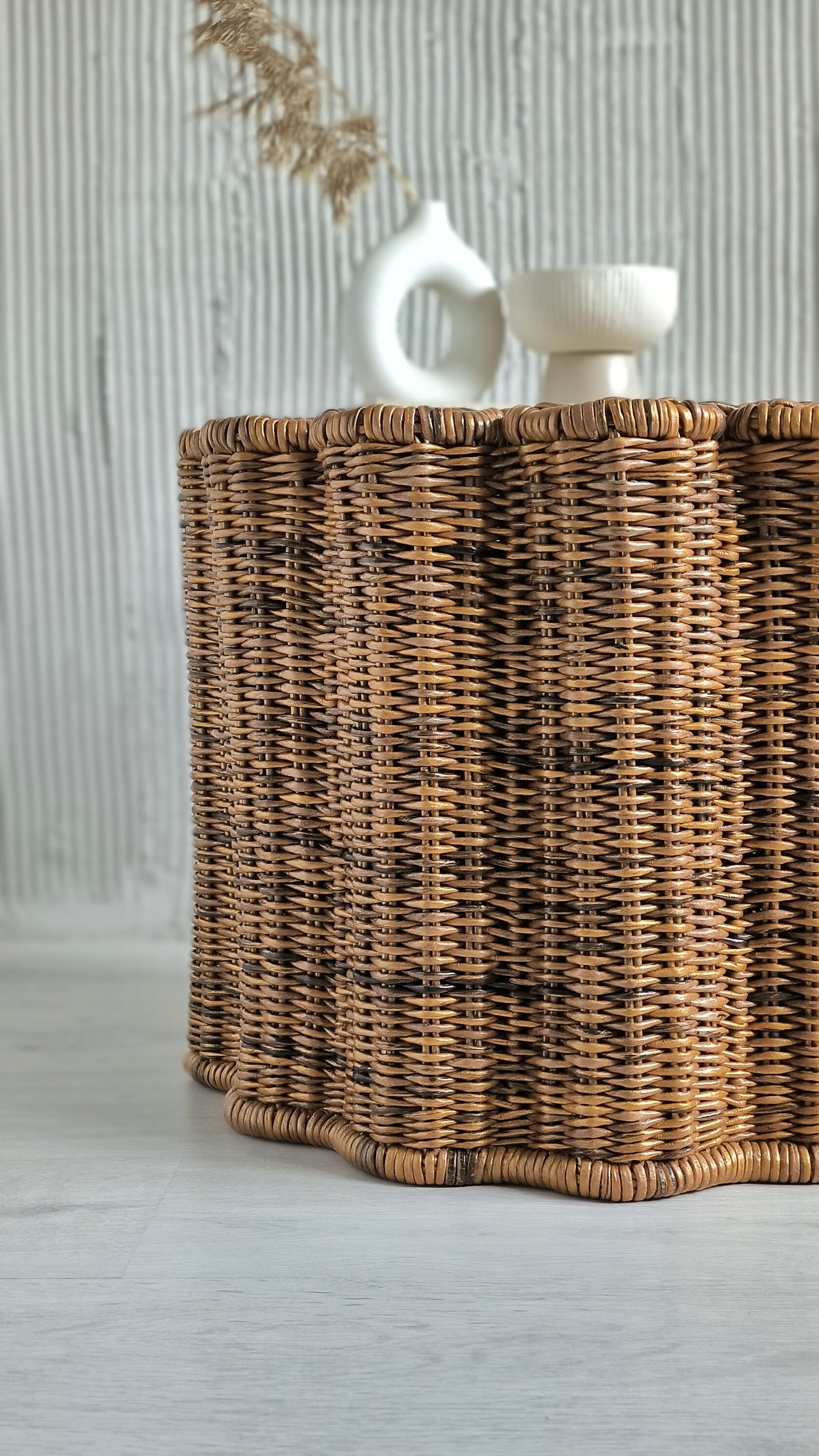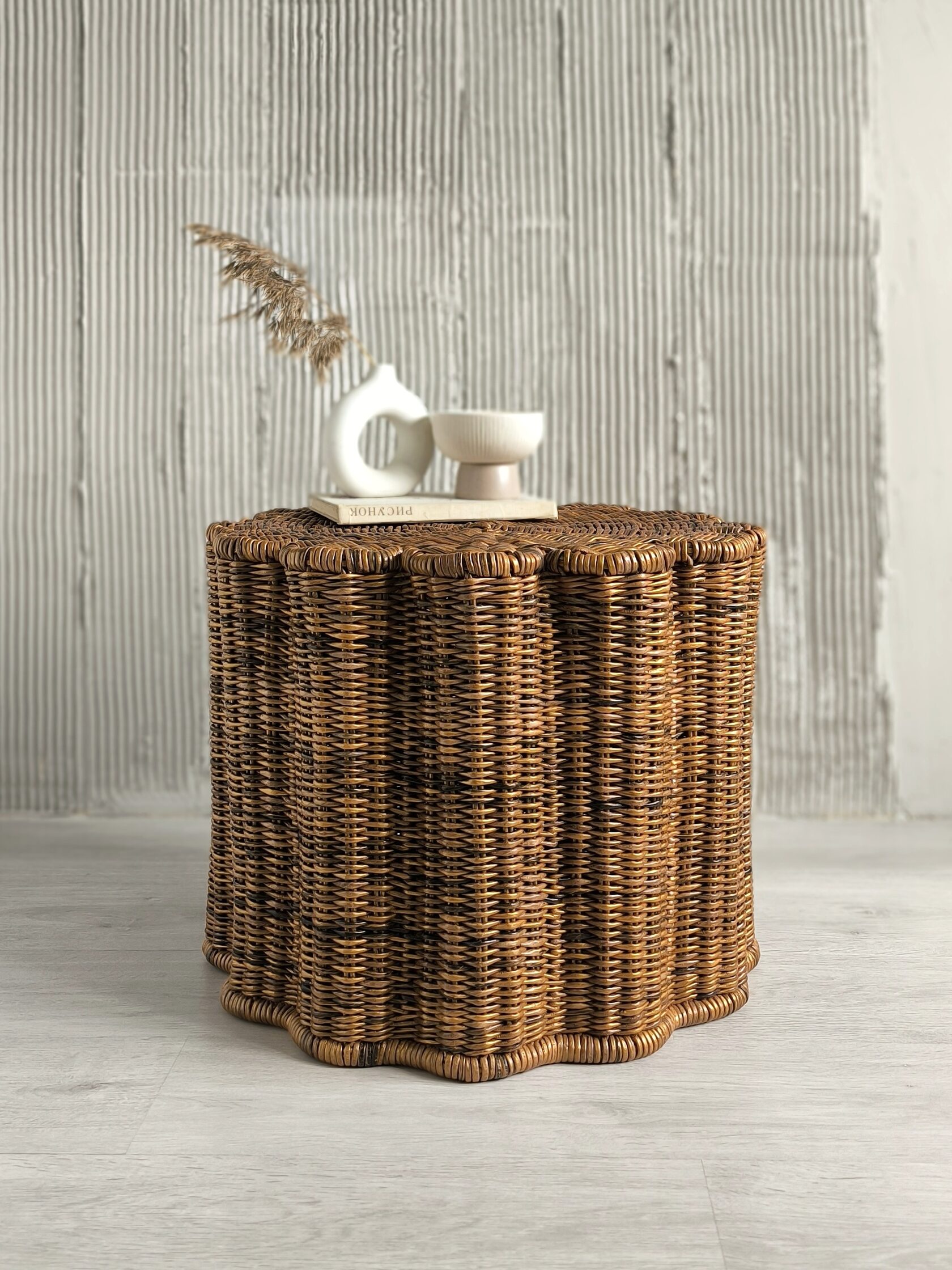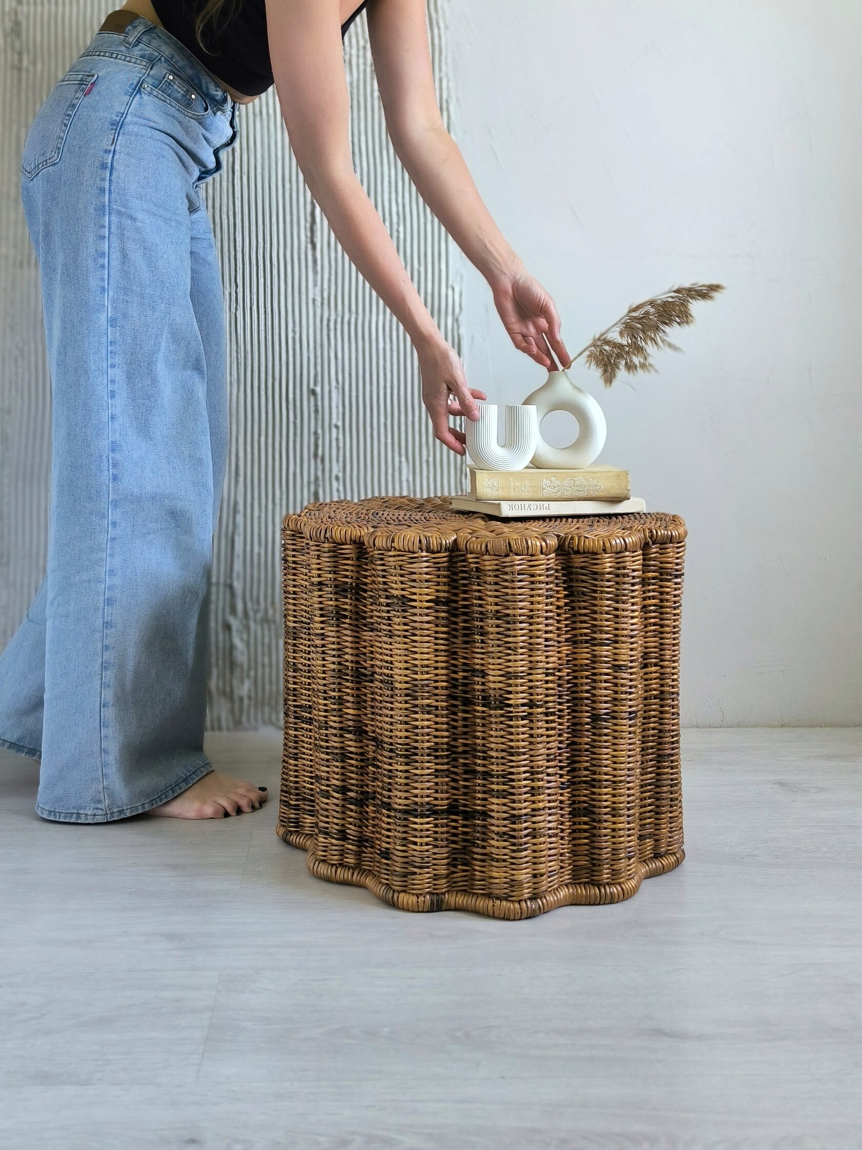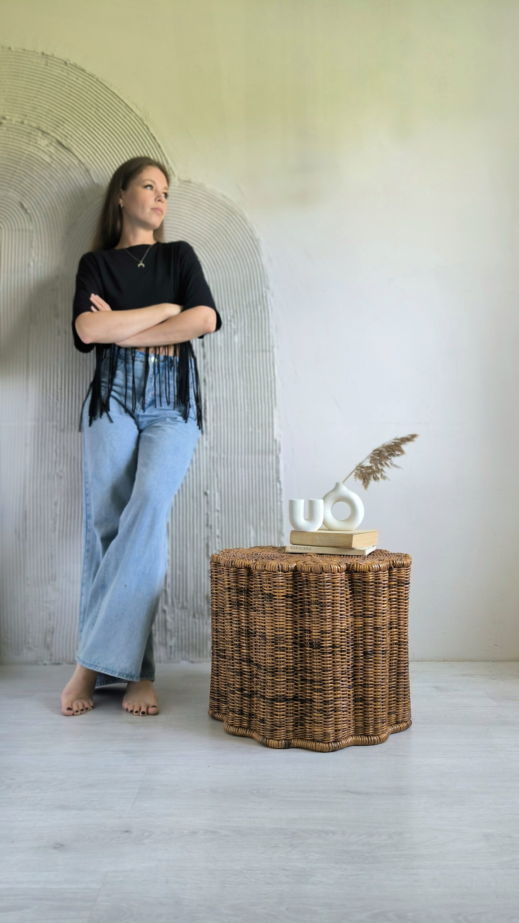 Эксклюзивный плетёный стол, созданный Валерией Корельской для капсульной коллекции Кристины Вытновой и Юлии Толстовой, представленной на выставке «Русский дом 2025». Этот объект, не имеющий жёстких геометрических линий, воплощает плавную, текучую форму, вдохновлённую живой природой. Изготовленный из металлического каркаса с влагостойкой имитацией лозы, стол (диаметр 53 см, высота 41 см) создаёт постоянно меняющуюся игру света и тени, делая его динамичным элементом в интерьере.