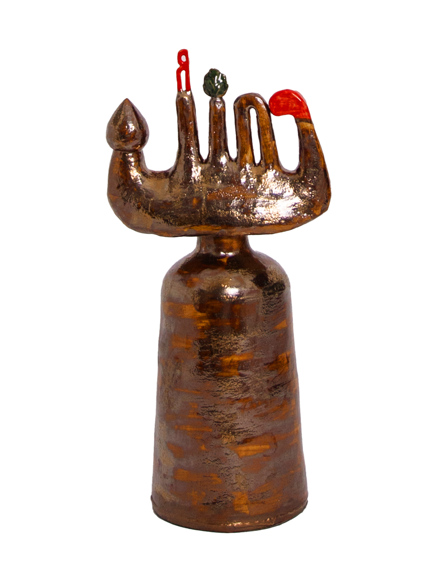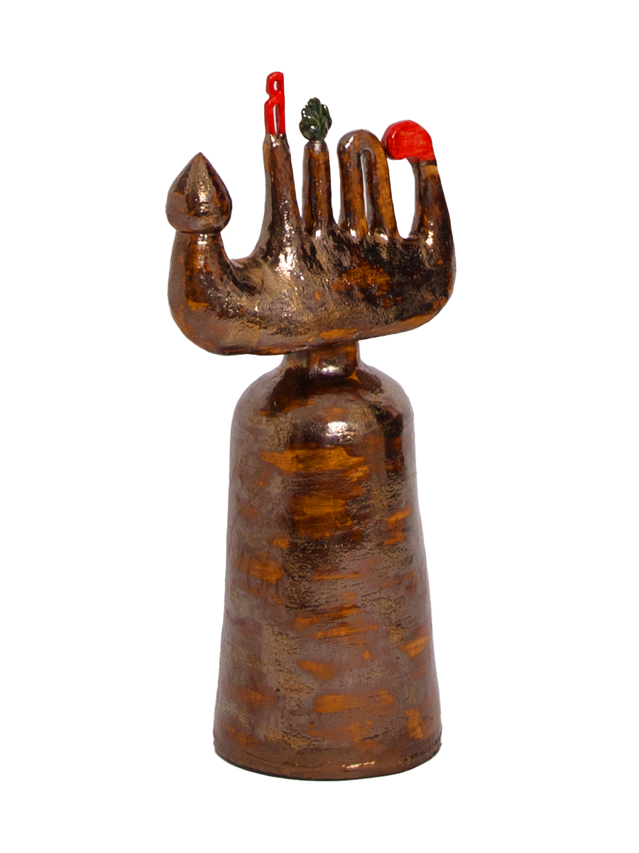 Концепция: В основе концепции лежит глубокое переосмысление национальных архетипов. Религиозный код воплощен в пальце-башенке, отсылающем к православной архитектуре; лингвистическое богатство русского языка выражено пальцем в форме запятой; а современный национальный идентификатор — красной буквой 'R', гармонично интегрированной в пластическую форму. Проект открывает новое направление в русском дизайне, предлагая не прямое цитирование, а концептуальное осмысление, что позволяет русскому культурному коду оставаться релевантным для будущих поколений. Выбор керамики, материала с богатыми народными корнями, подчеркивает эту связь и гарантирует высокое качество художественного исполнения.