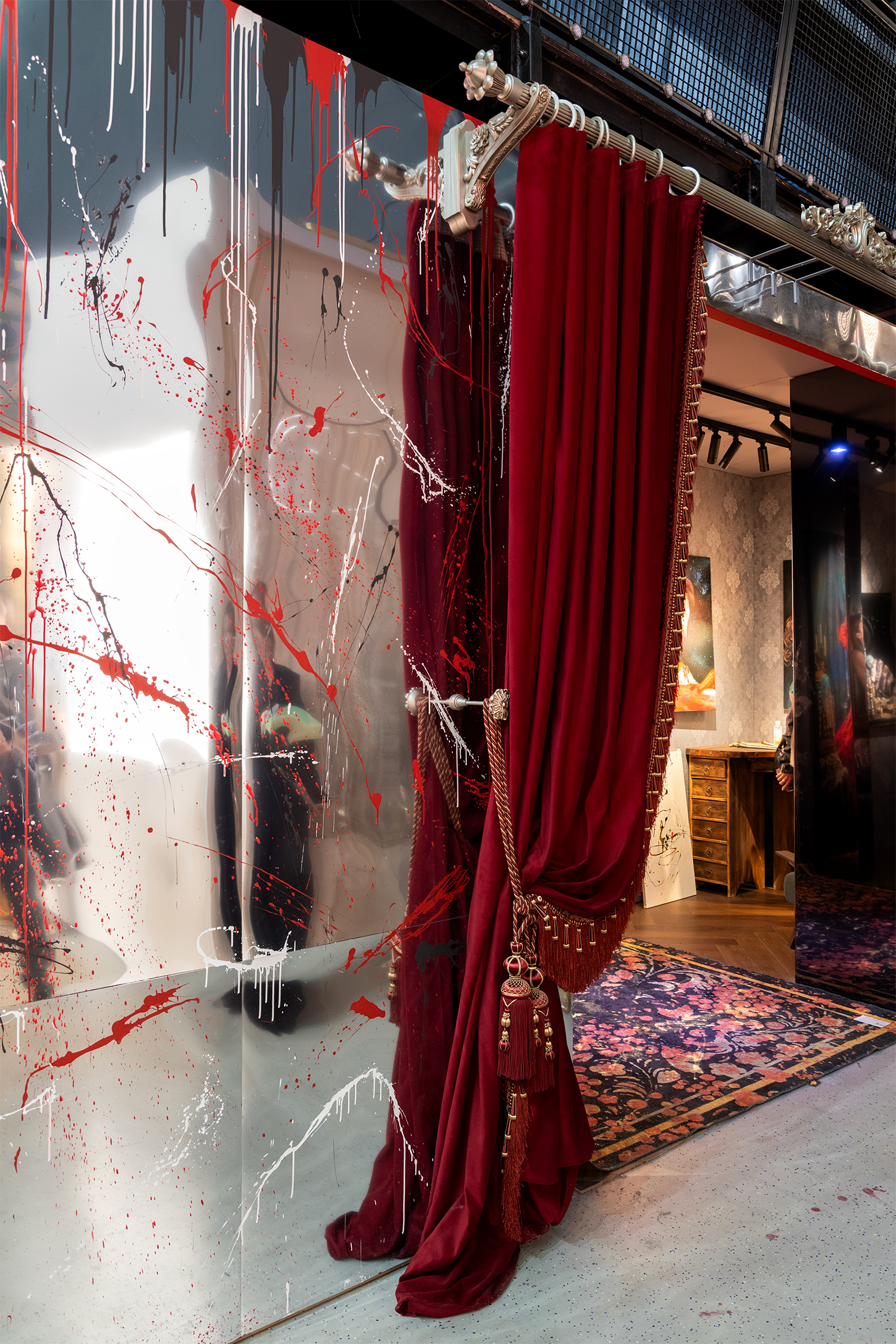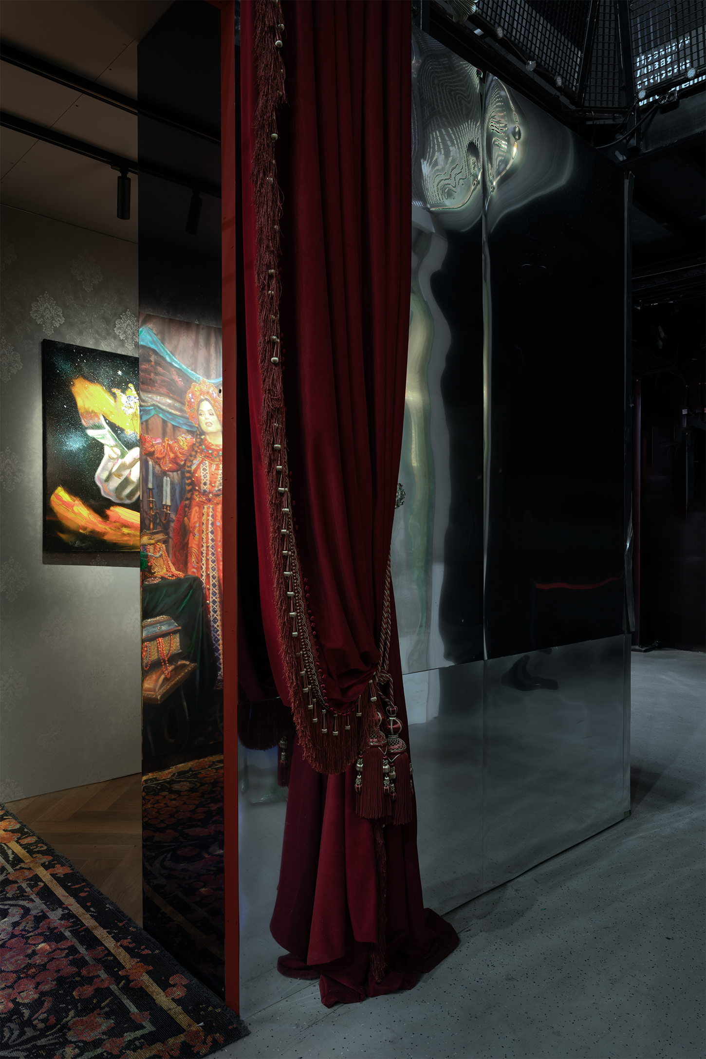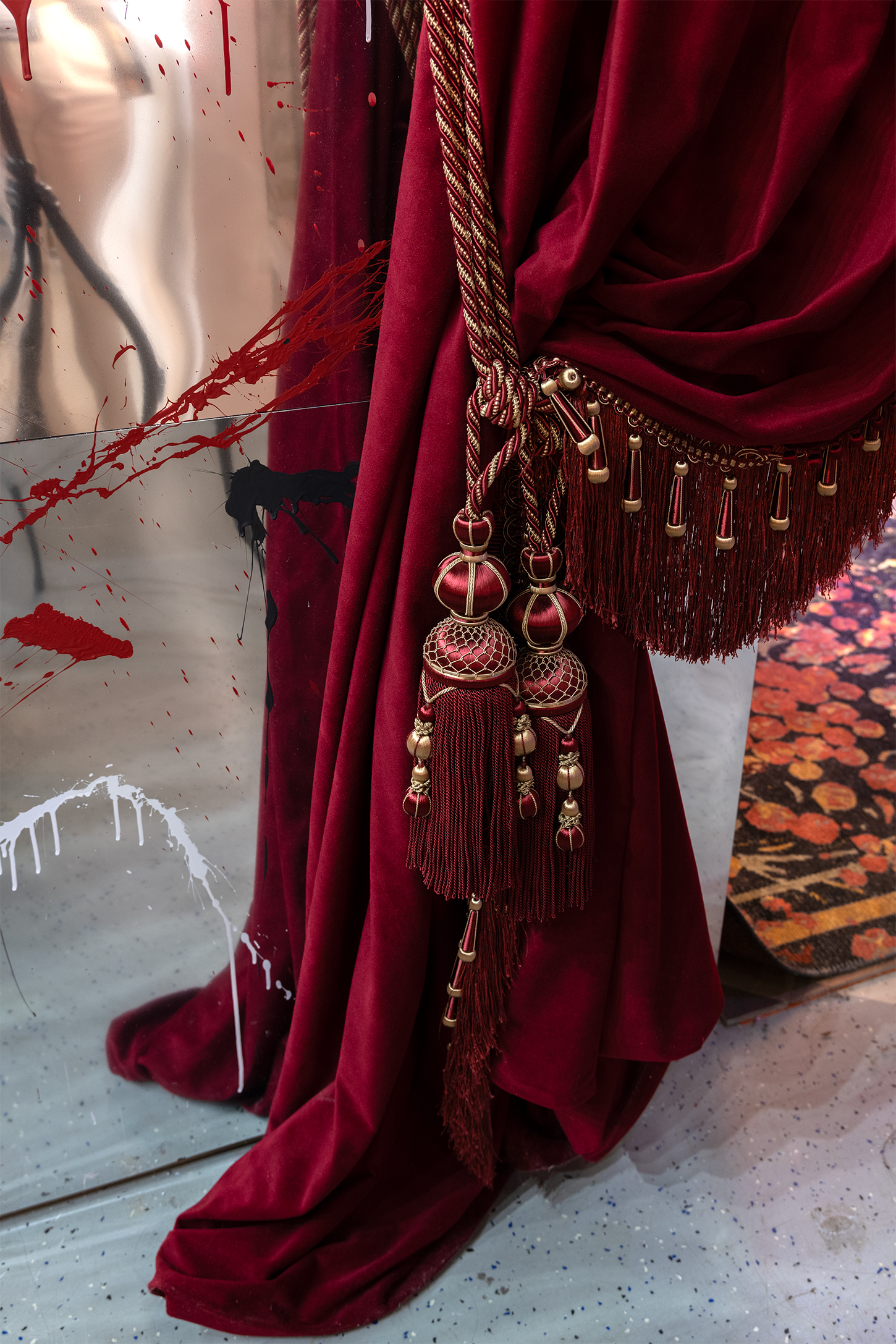 Эти роскошные портьеры были разработаны для создания уникального входа в выставочное пространство и мастерскую художника. Их плотный бархат, богатый декор и выраженная театральность мгновенно погружают зрителя в атмосферу предвкушения чуда, символизируя границу между реальностью и миром искусства.