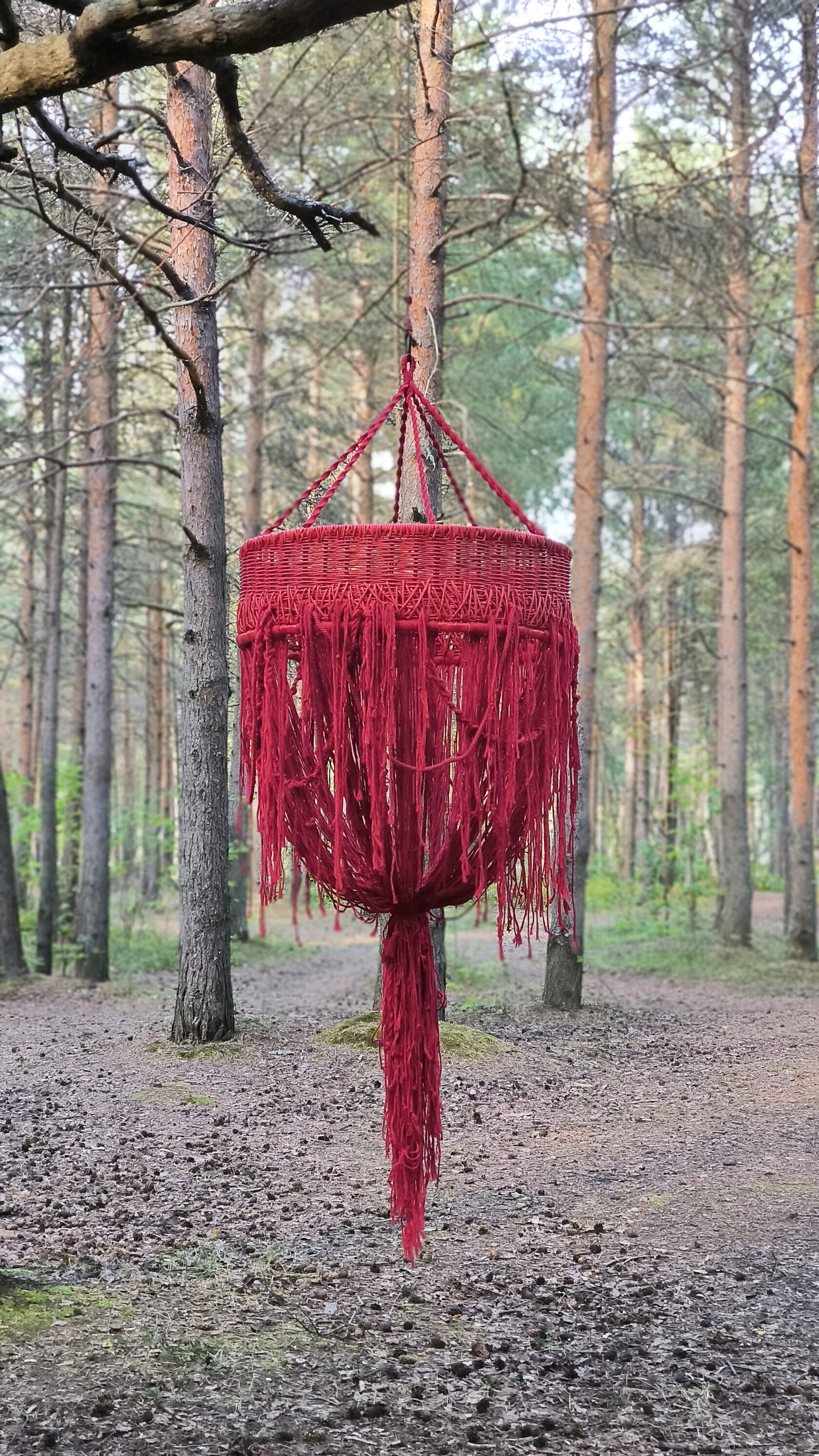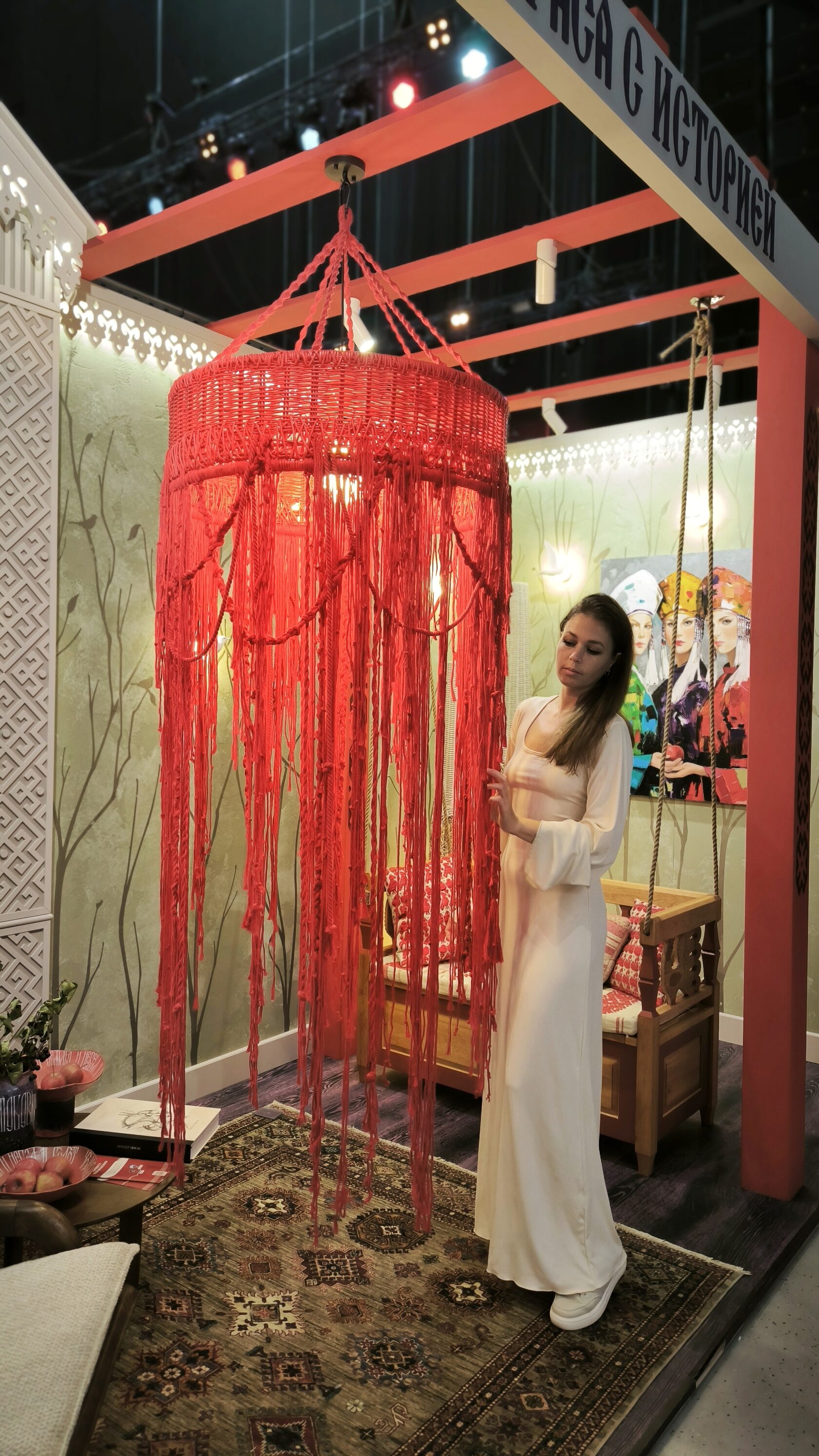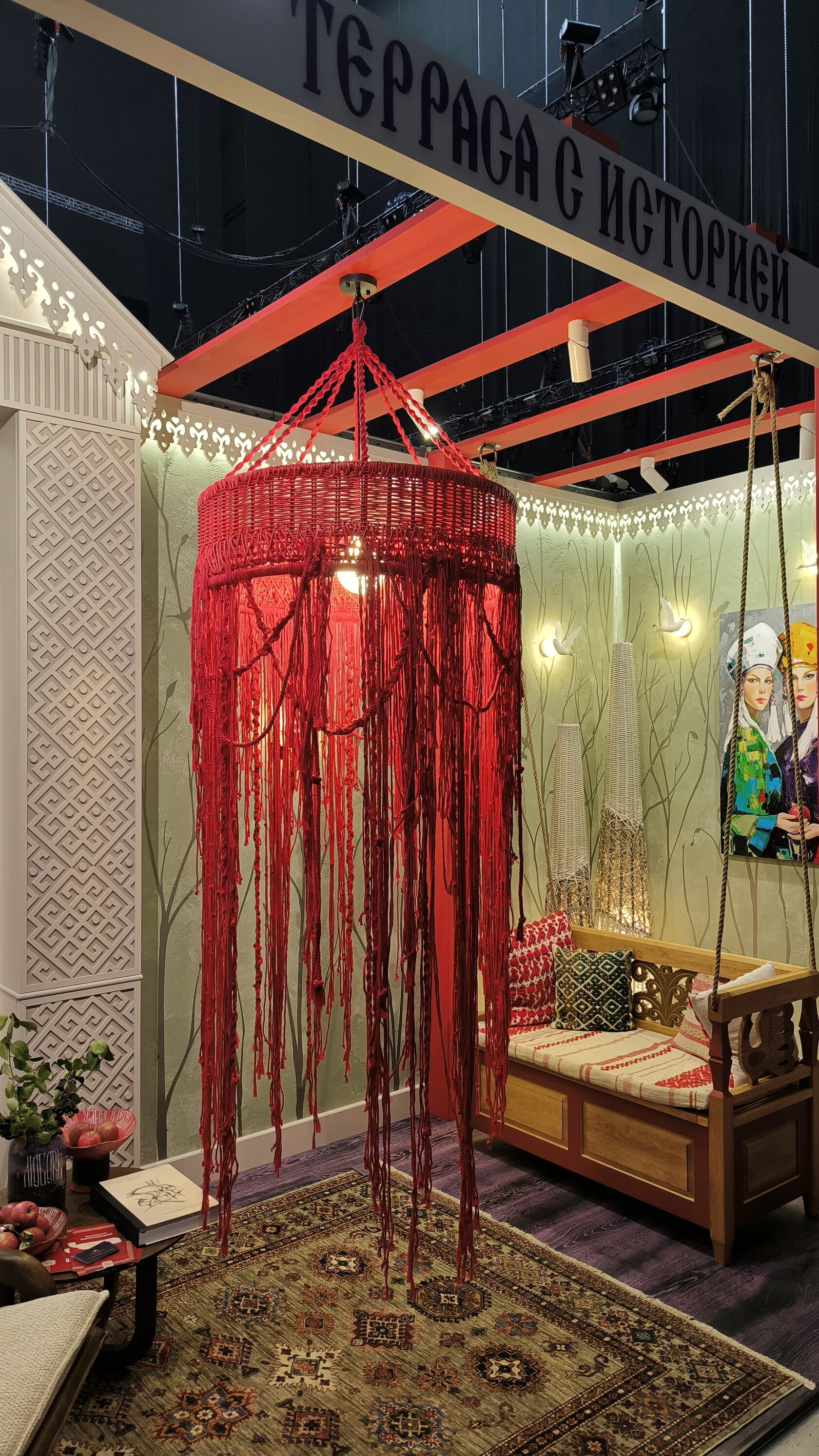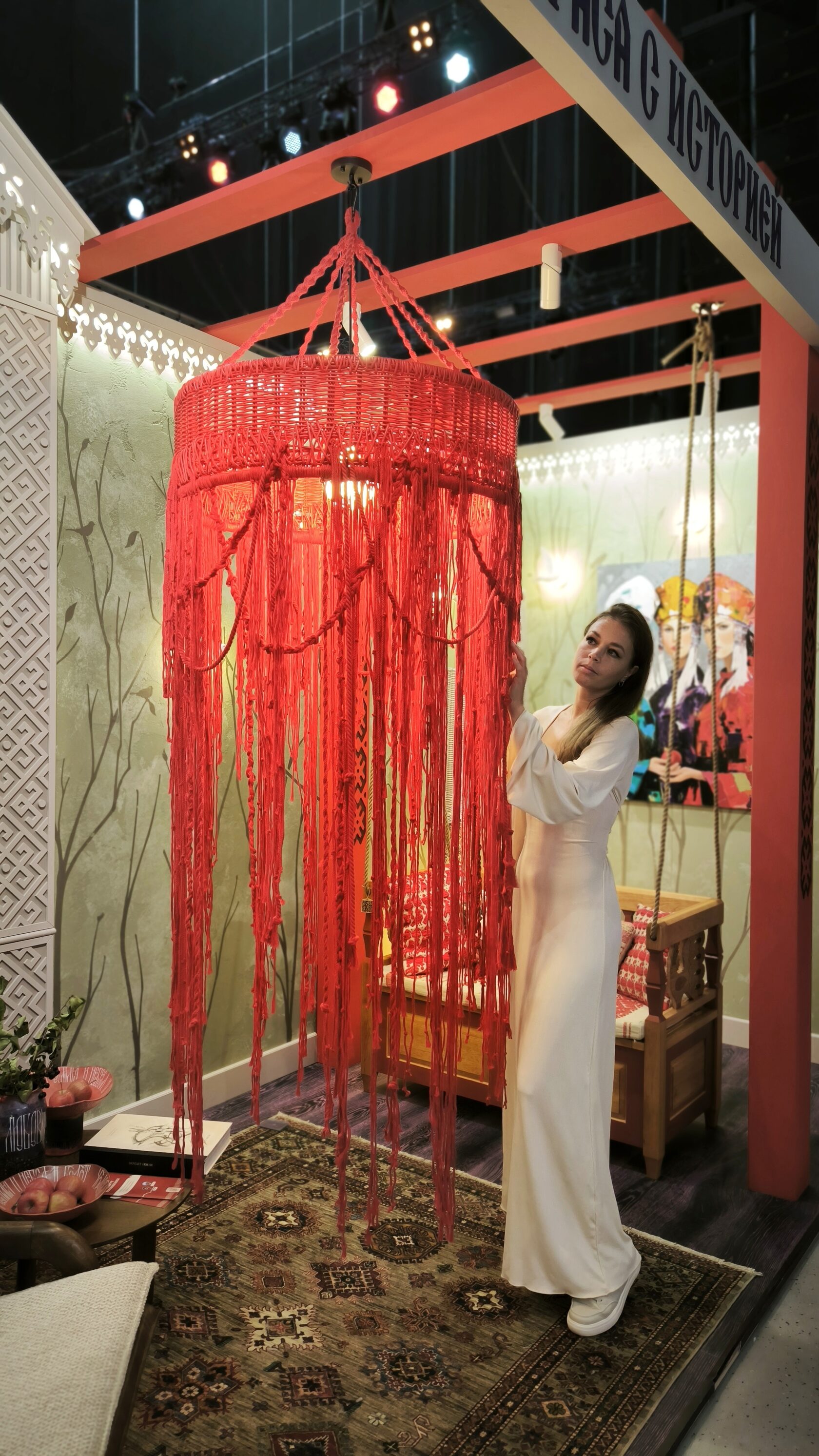 Абажур «Очаг» создан специально для выставки Русский дом 2025 авторским коллективом: Валерия Корельская, Татьяна Захарова и Татьяна Горбунова. Его красный цвет символизирует живой огонь очага, а небрежное плетение подчёркивает рукотворный характер изделия. Абажур становится центром притяжения в доме, бережно сохраняя связь с культурными традициями.