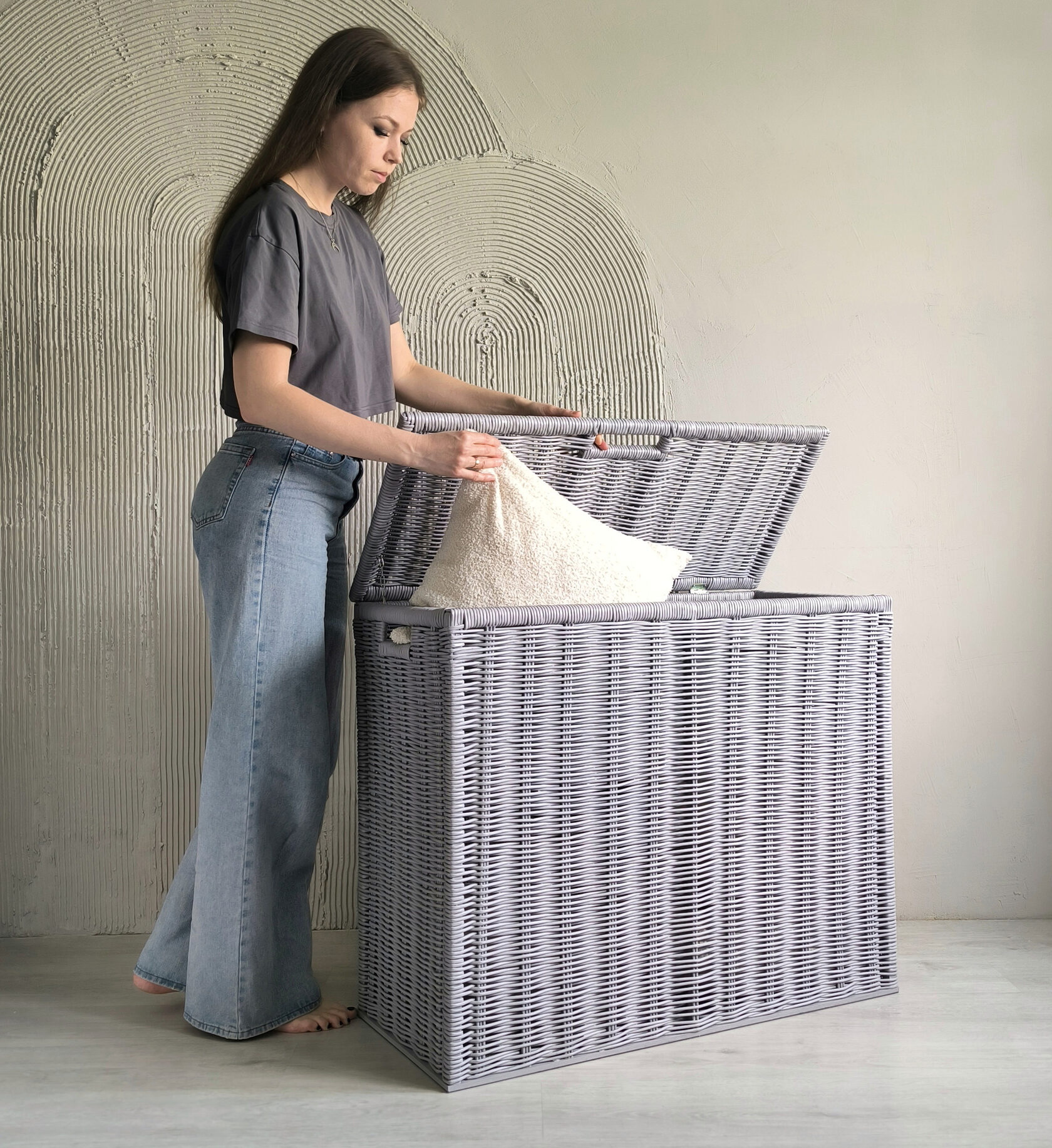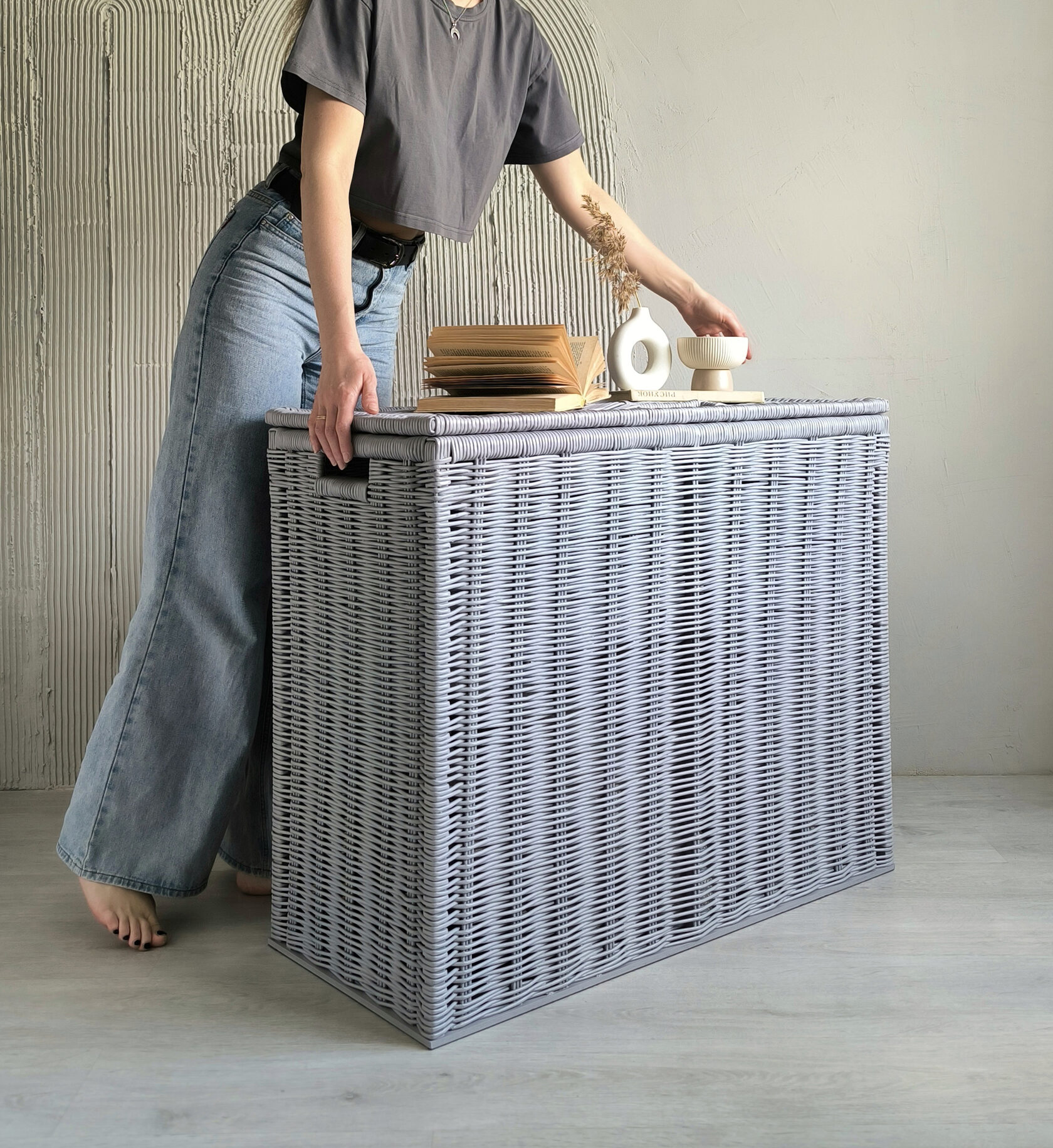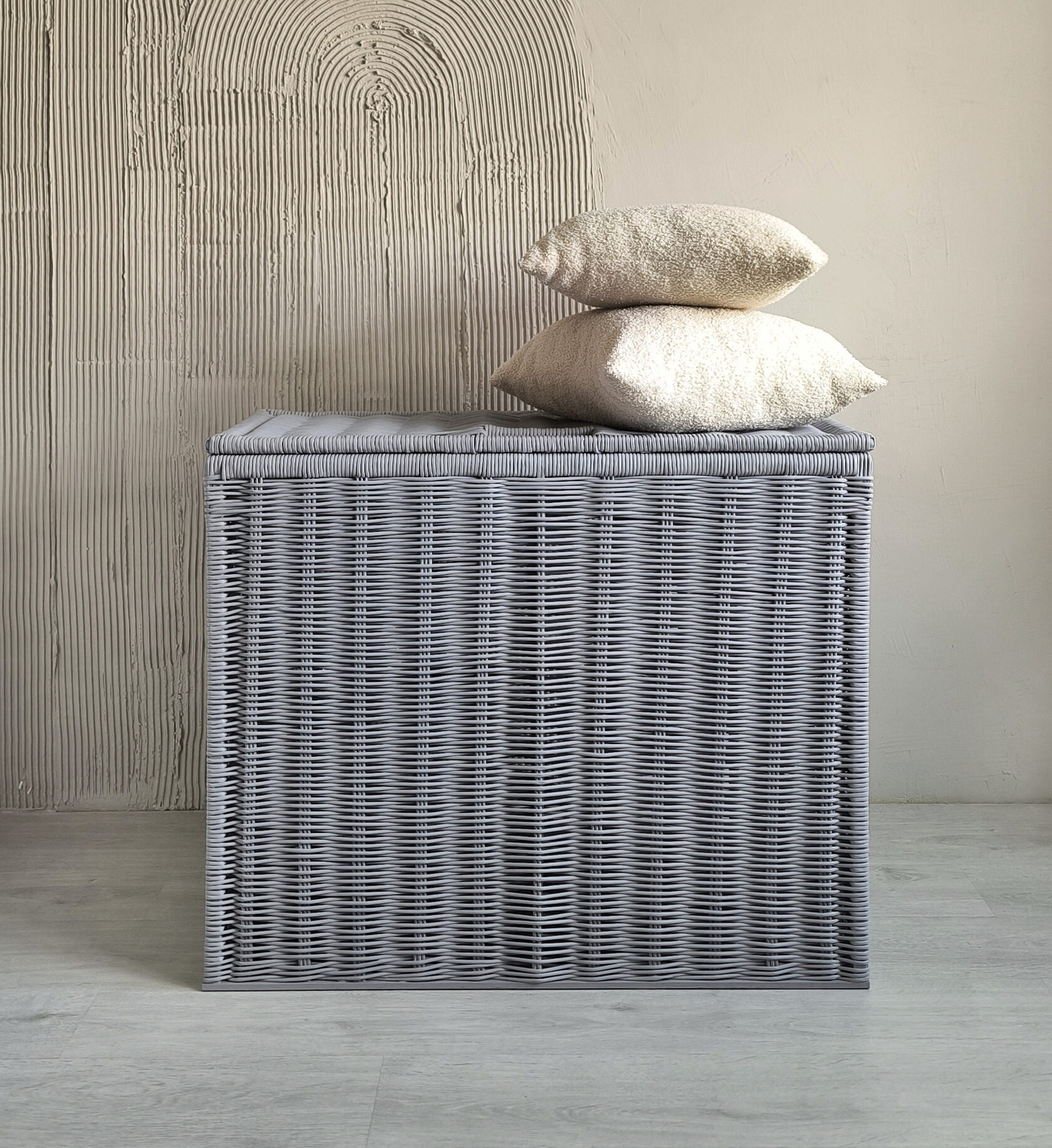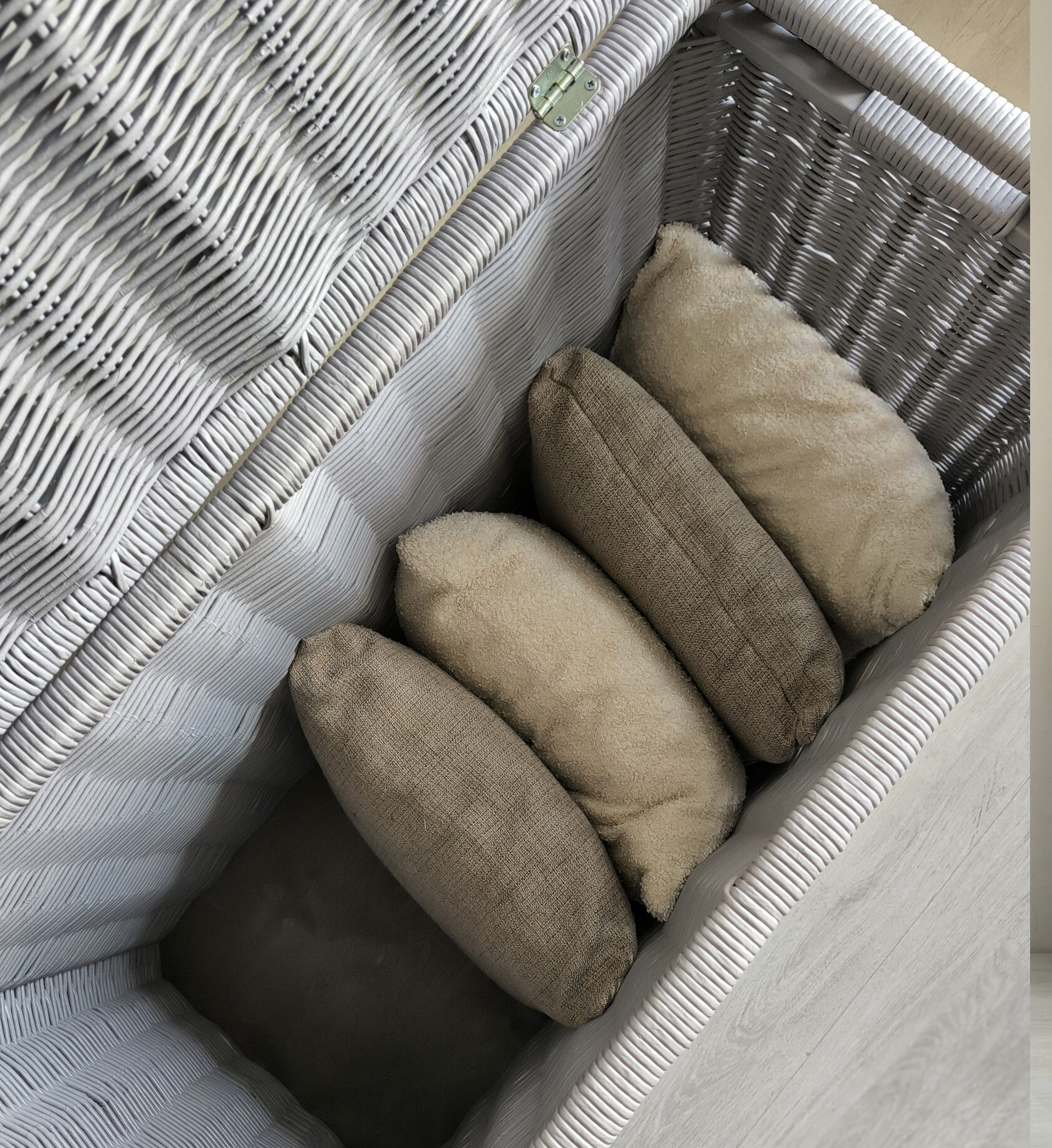 Белый цвет и воздушная структура плетения делают сундук лёгким, а кожаные детали добавляют ему характера.