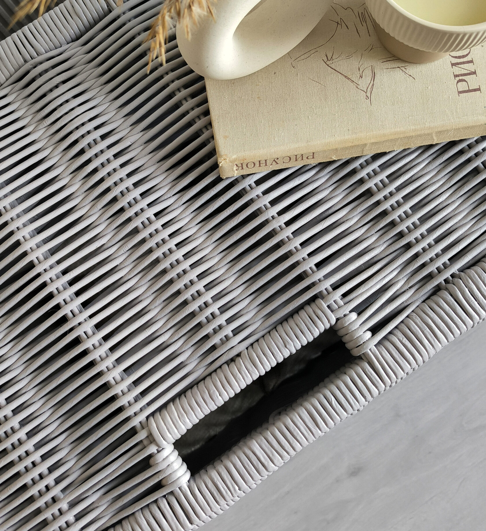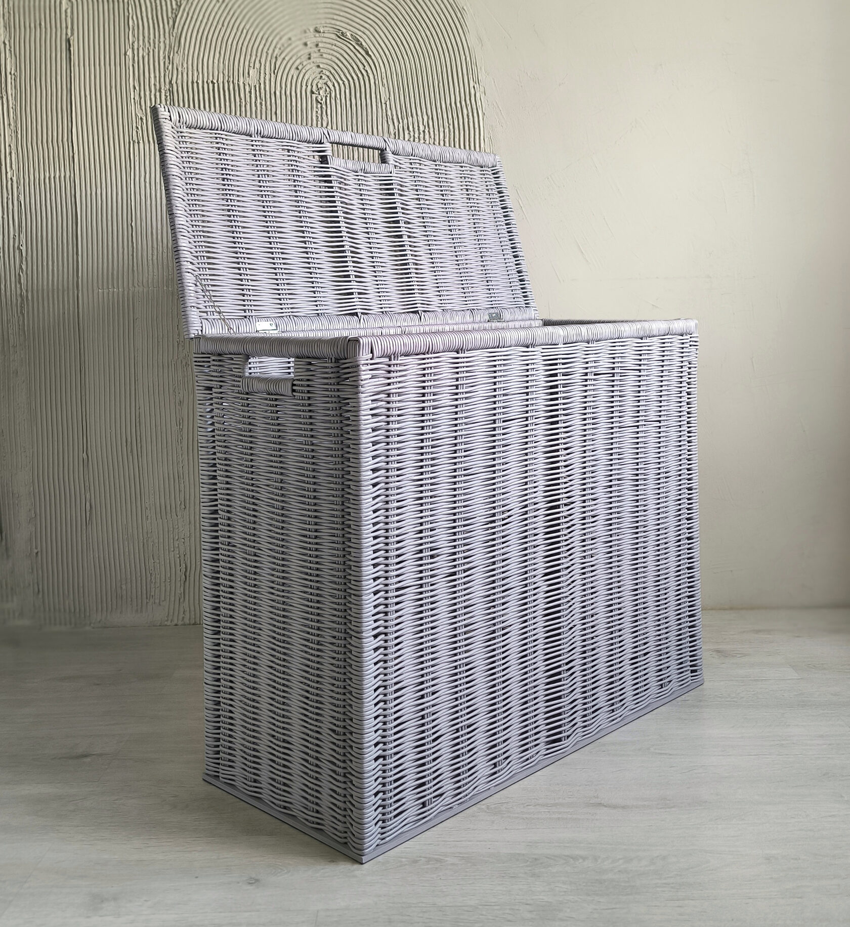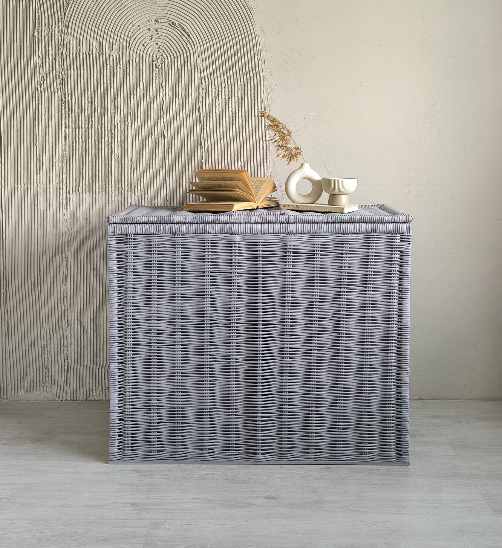Белый цвет и воздушная структура плетения делают сундук лёгким, а кожаные детали добавляют ему характера.