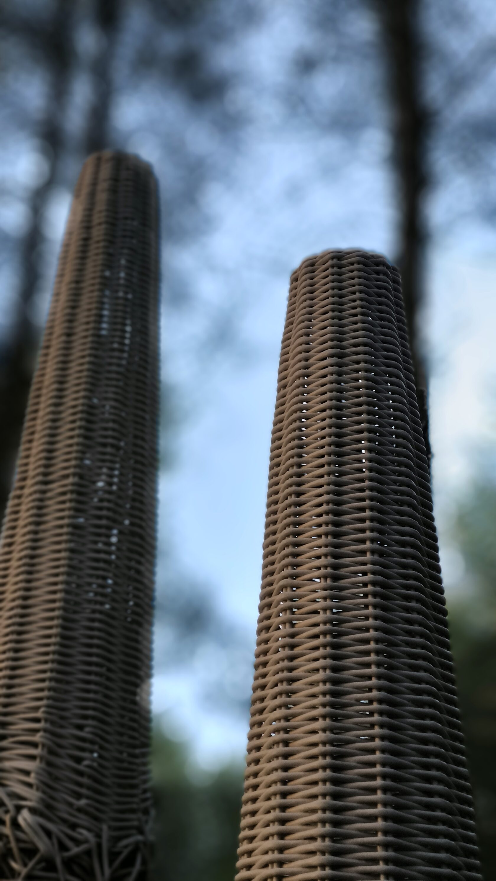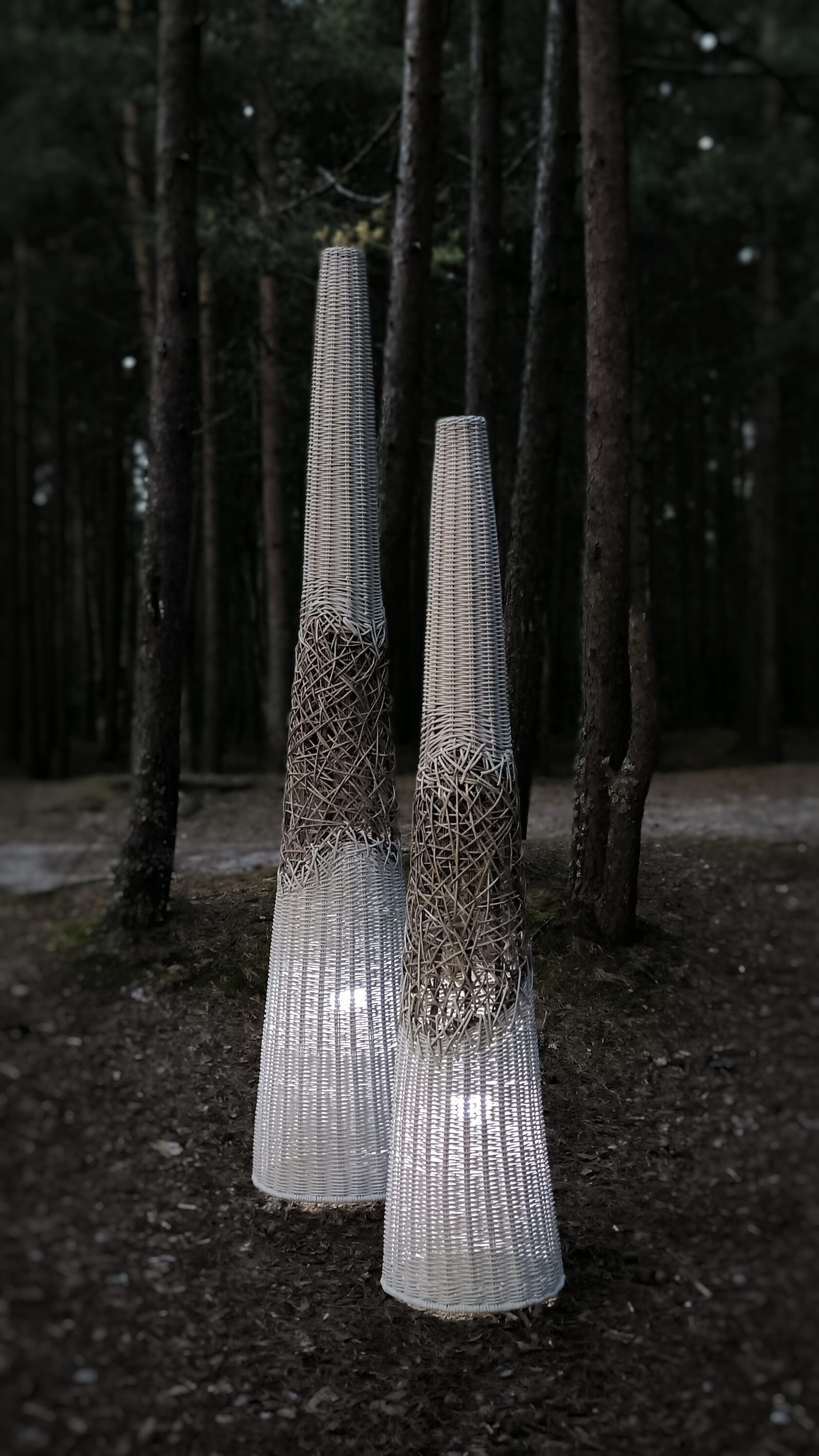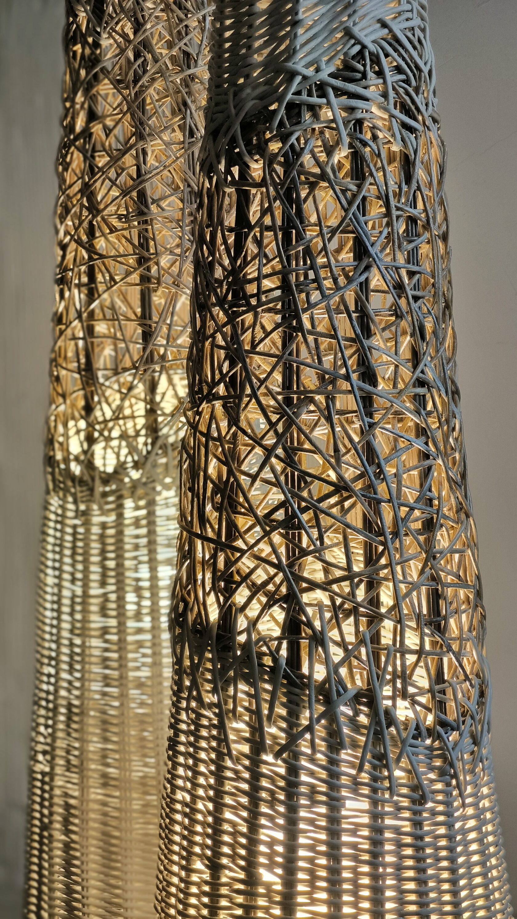 Концепция: Проект отражает идею восстановления утраченной связи человека с природой. Верхняя и нижняя части плетения символизируют архитектуру и технологии, а центральная часть, имитирующая корни, — естественный хаос природы. Торшеры становятся не только источником света, но и художественным объектом, объединяющим природу и человека.